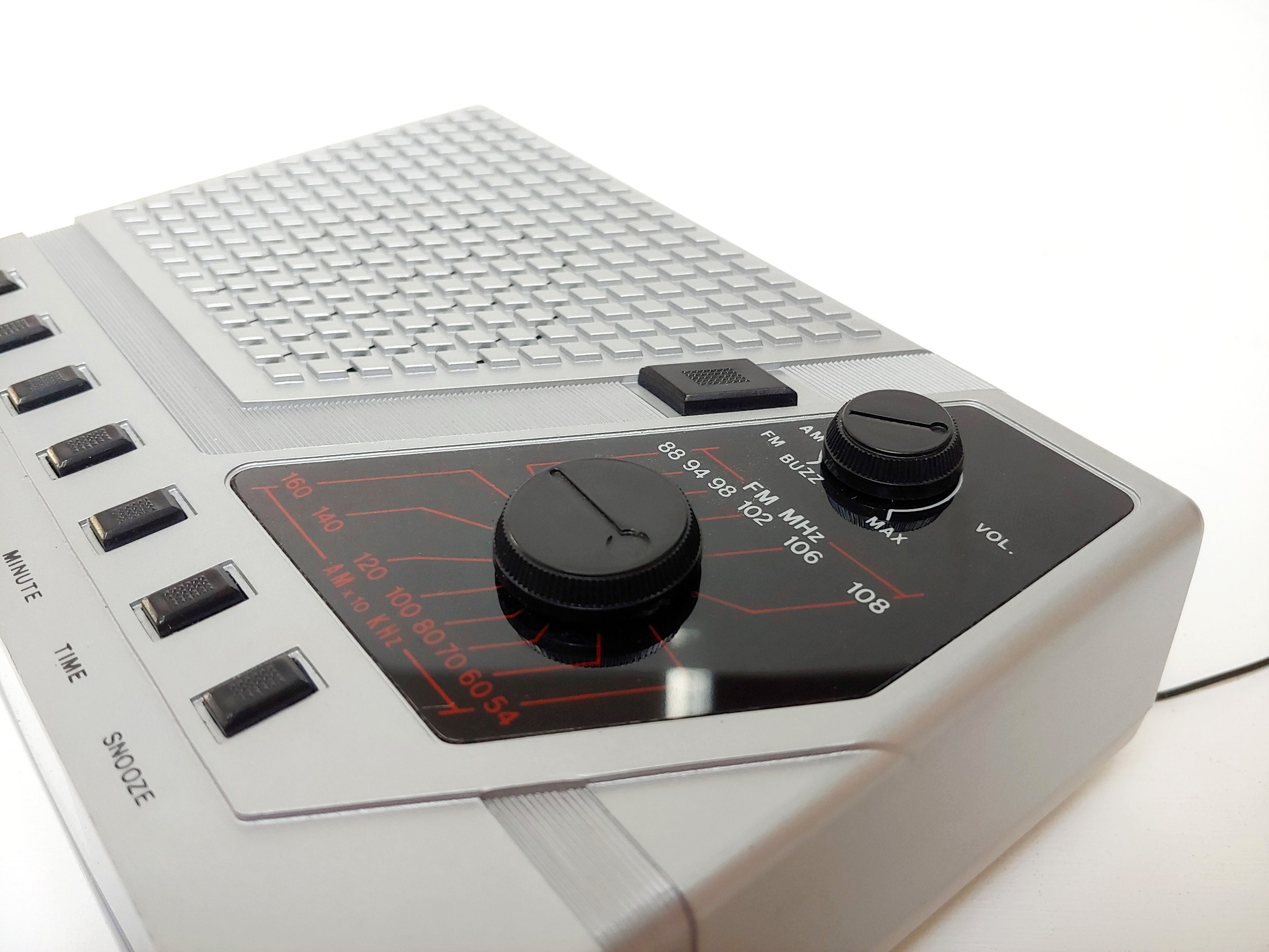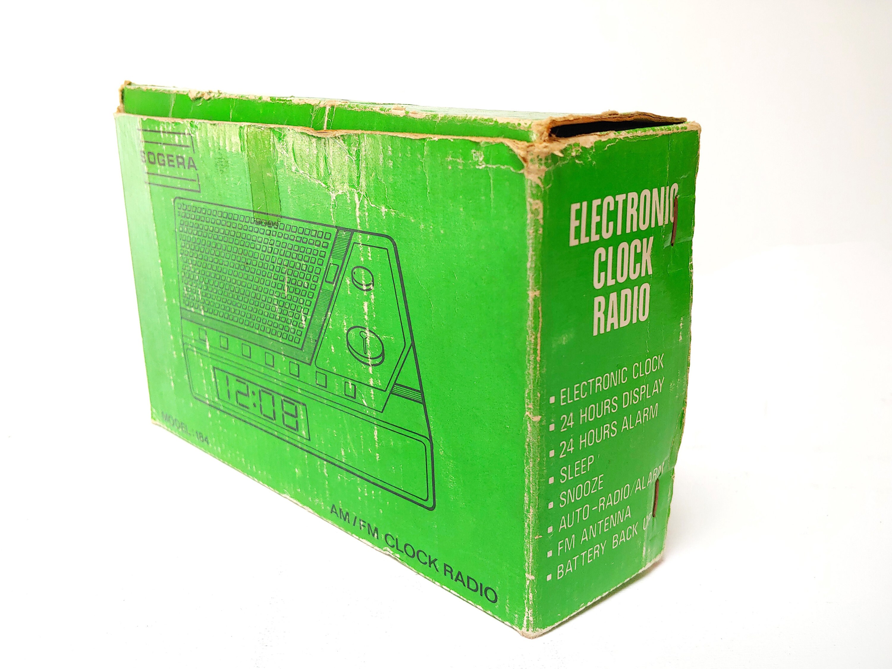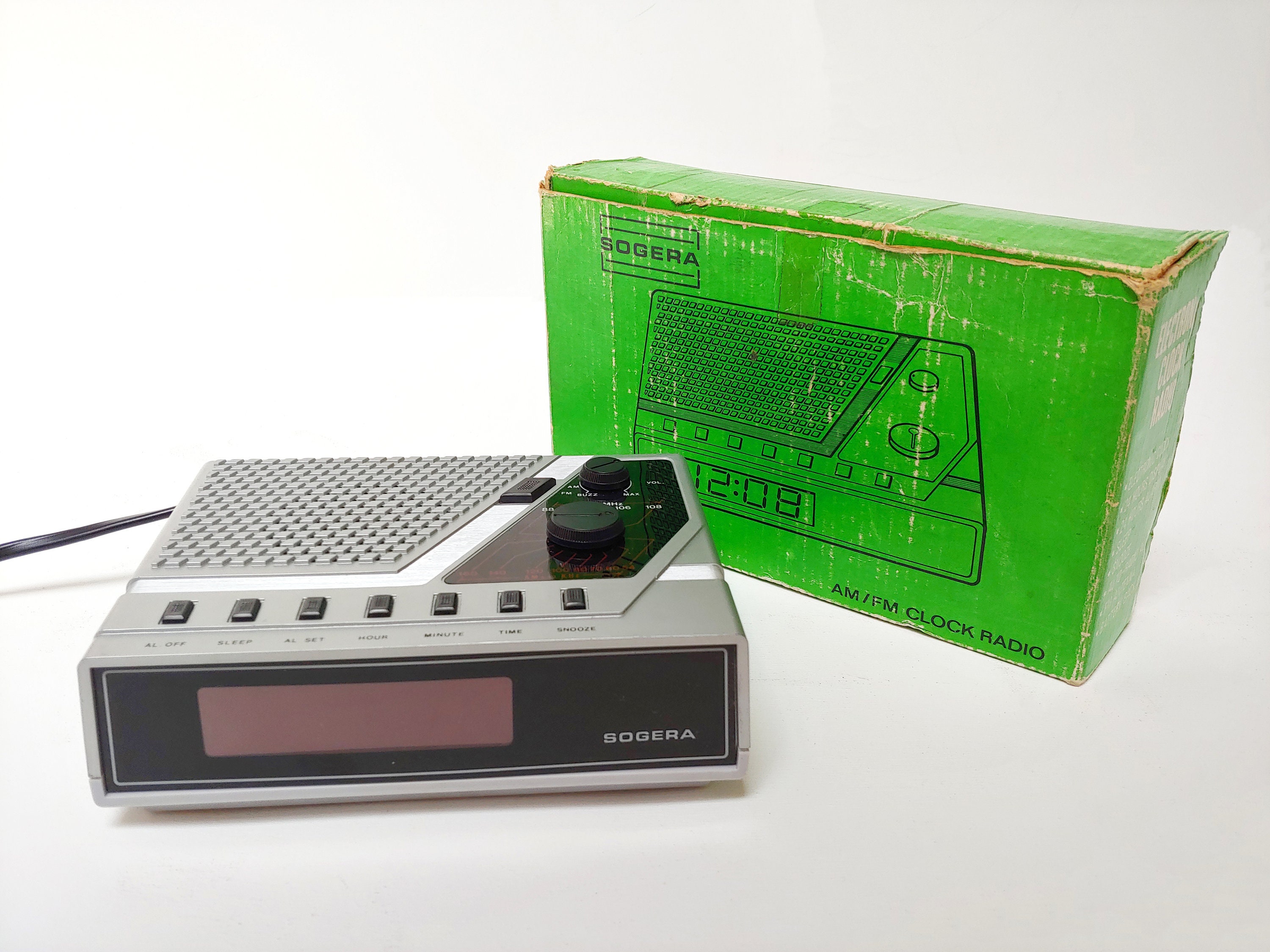 Rare vintage 1980s Sogera 184 AM/FM Clock Radio and alarm clock in new condition with original box and manual. Made in Italy.