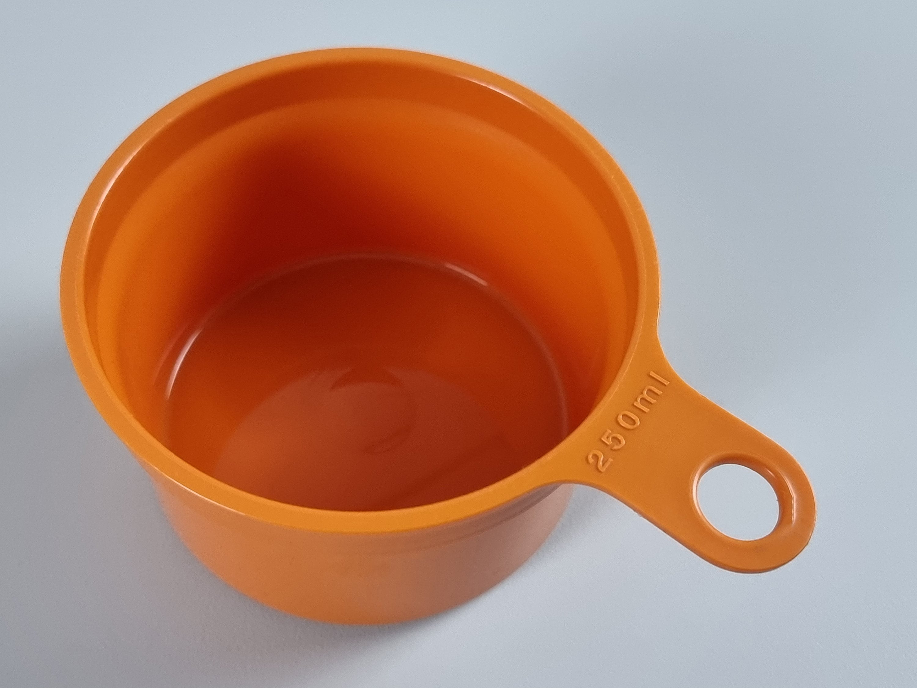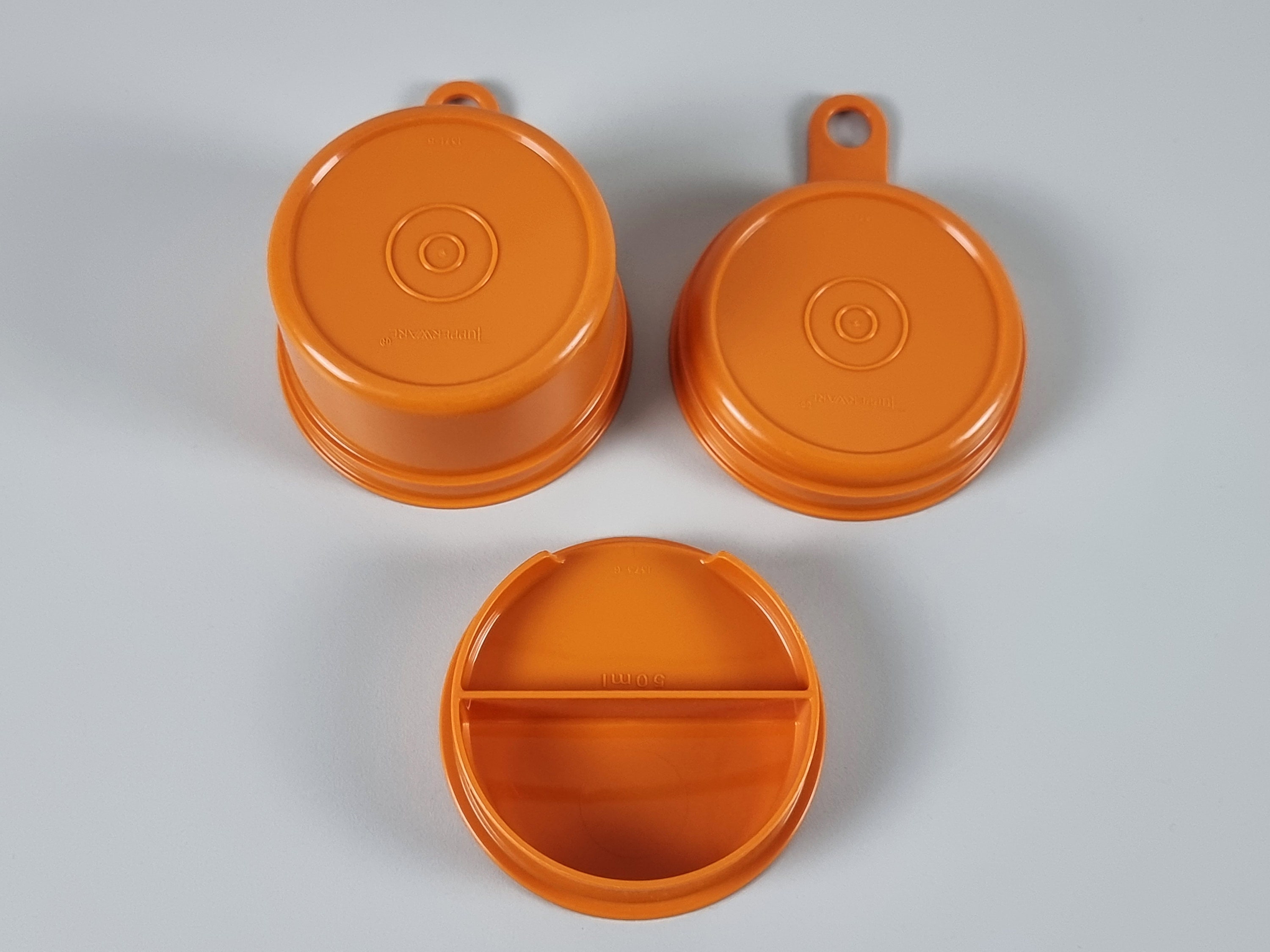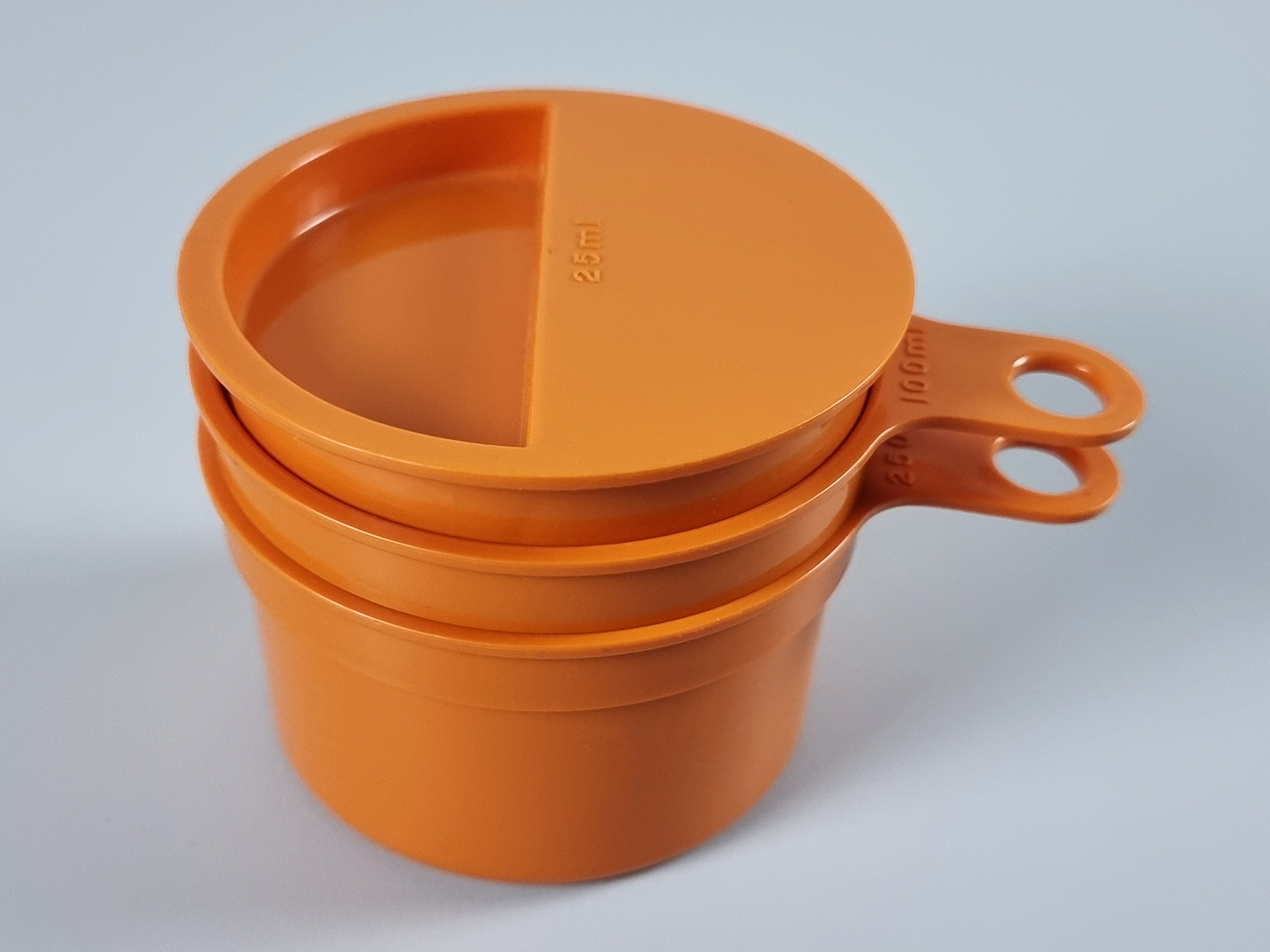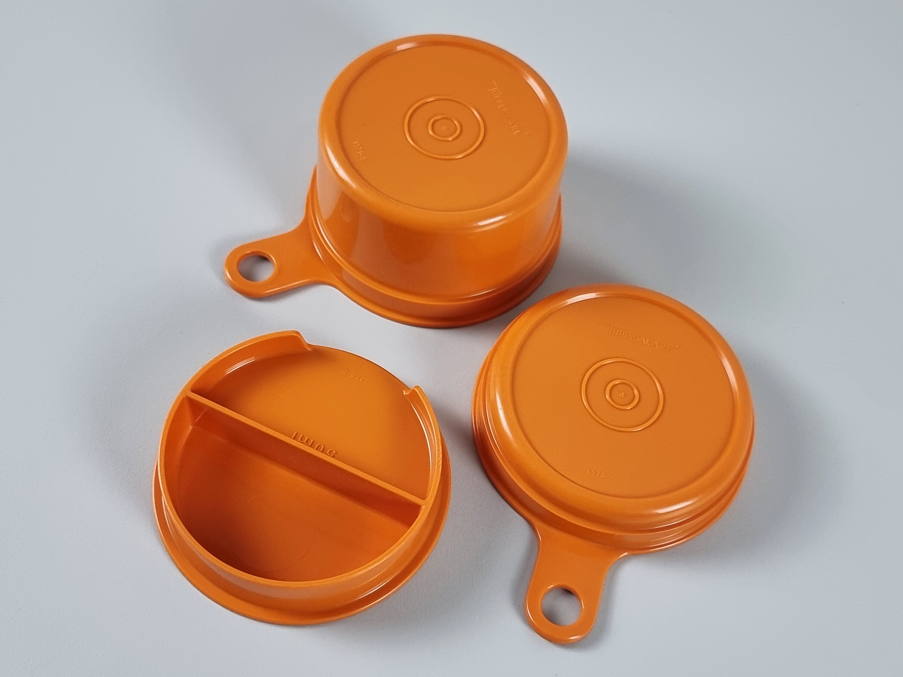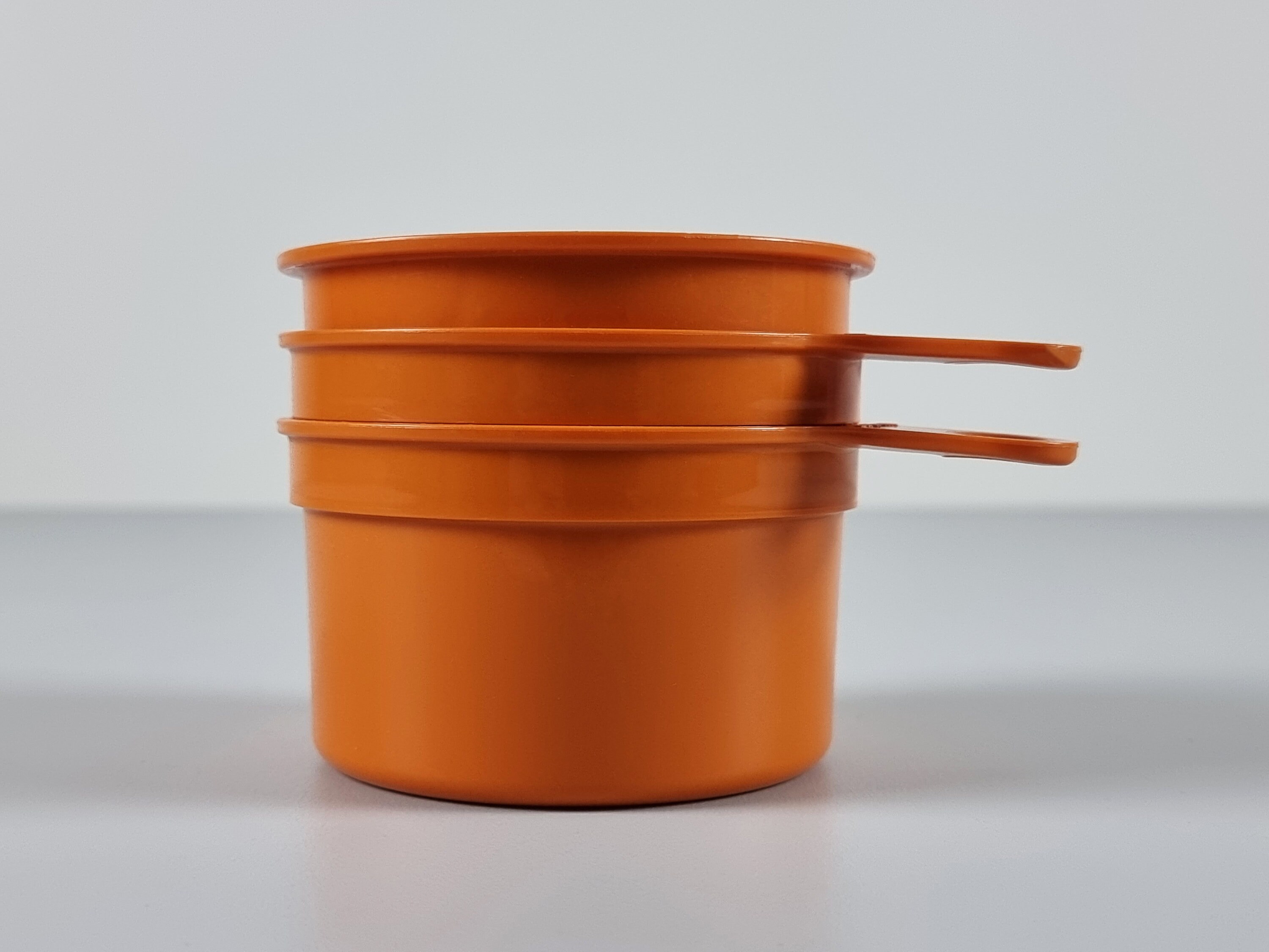 Vintage set of 3 orange plastic measuring cups and spoons #1371 from the 1970s by Tupperware—despite their age, they remain in excellent condition.