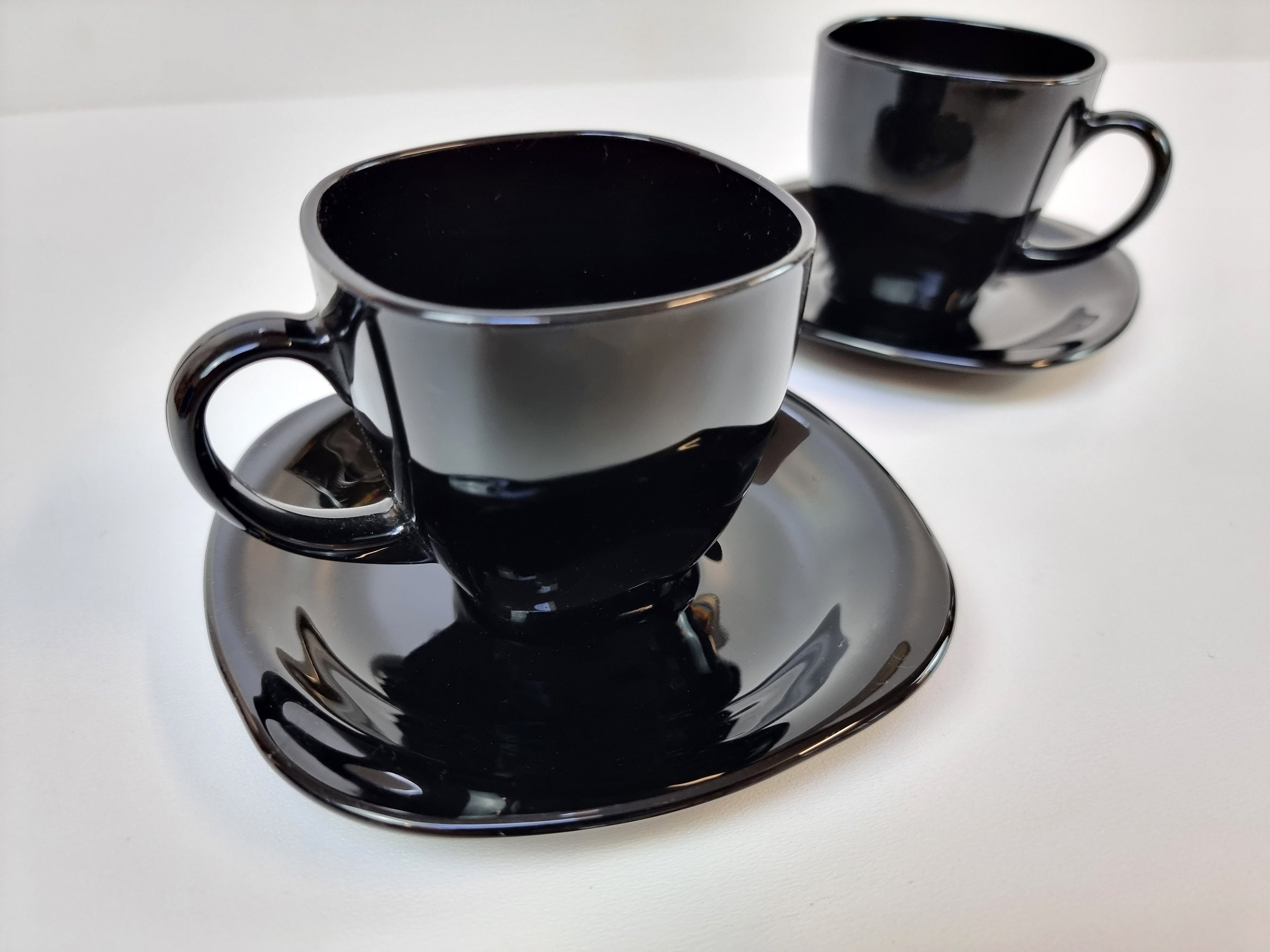 Set of 2 vintage black ceramic espresso cups and saucers set from the 1970s by Arcoroc, France.