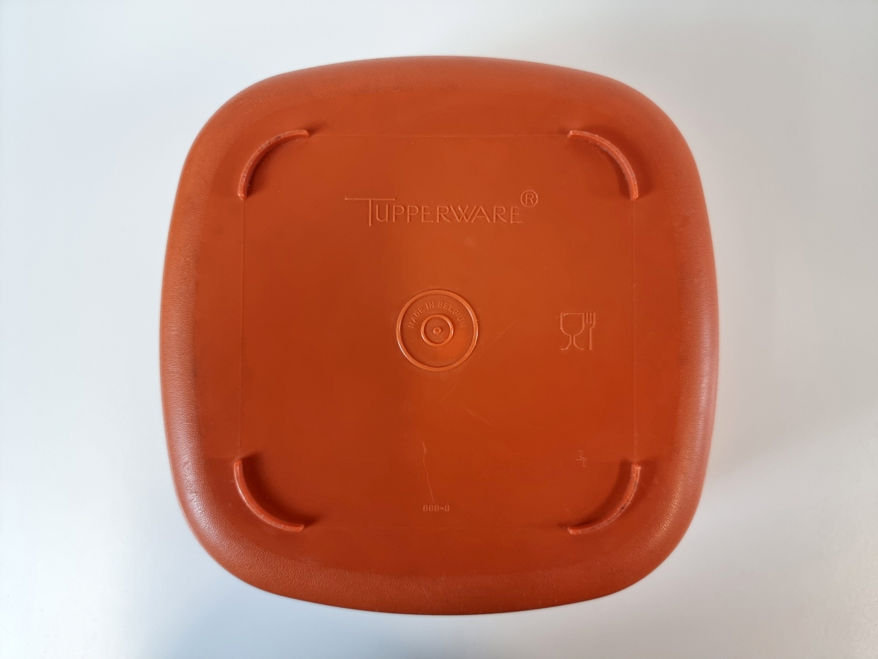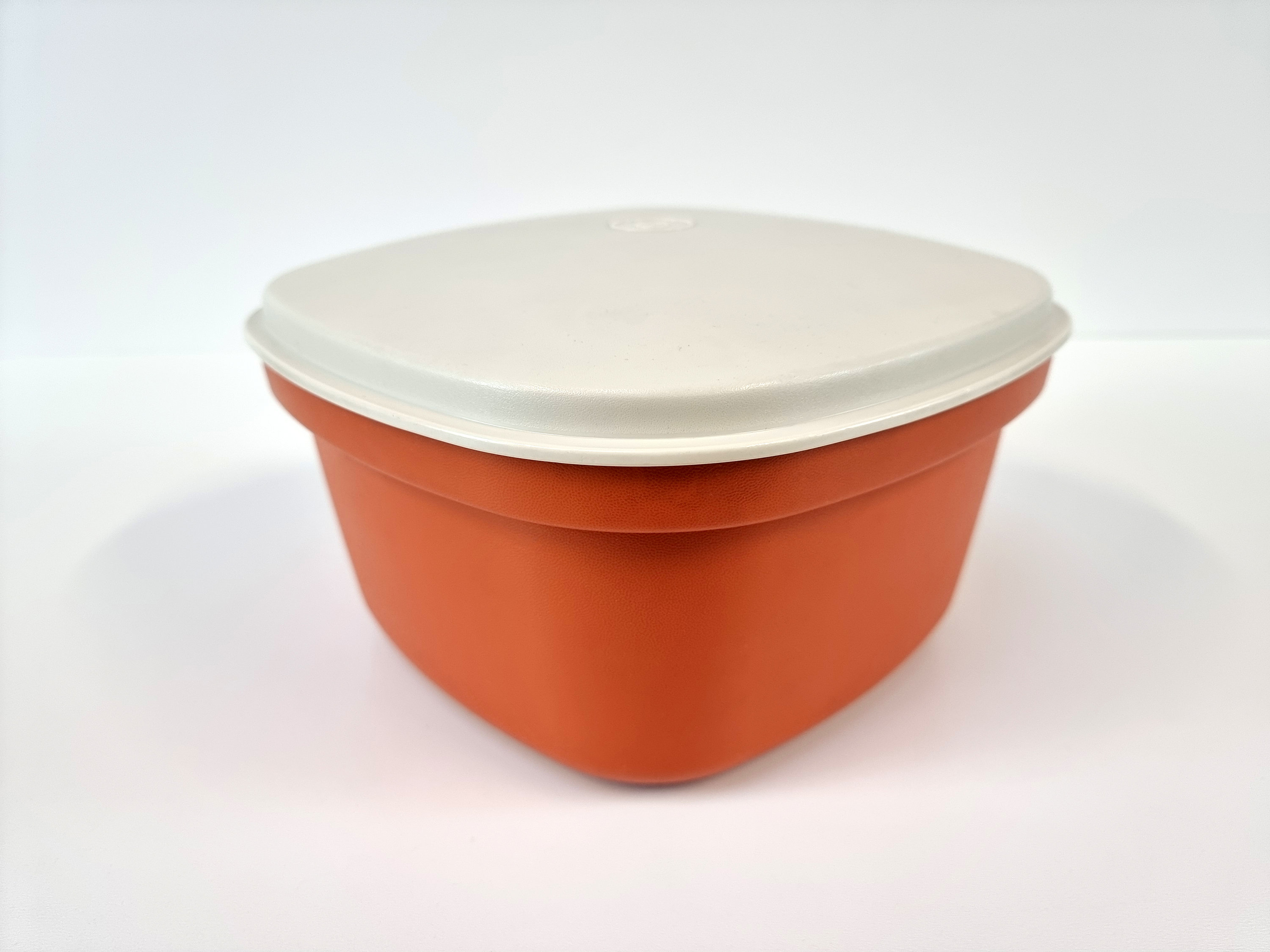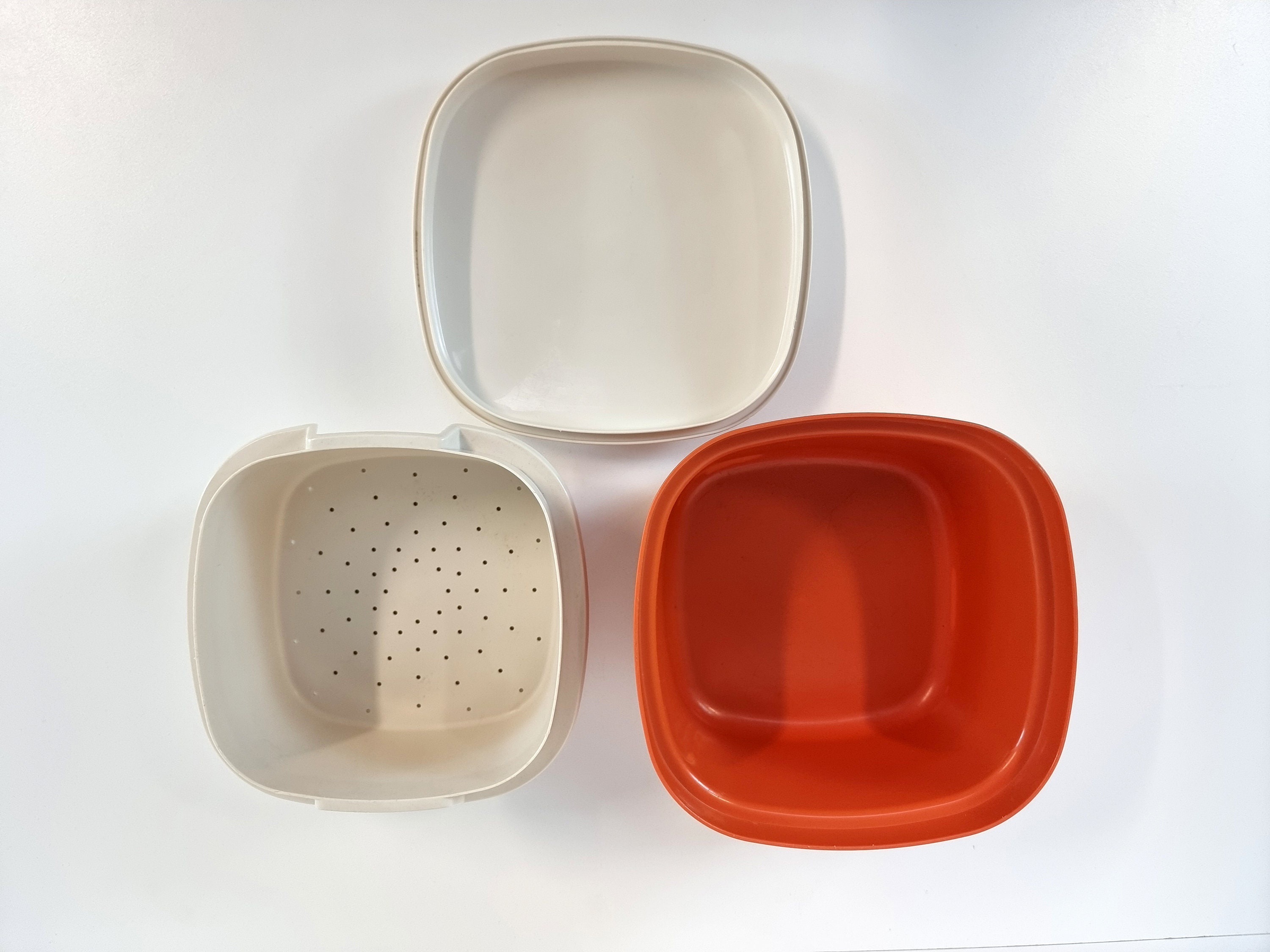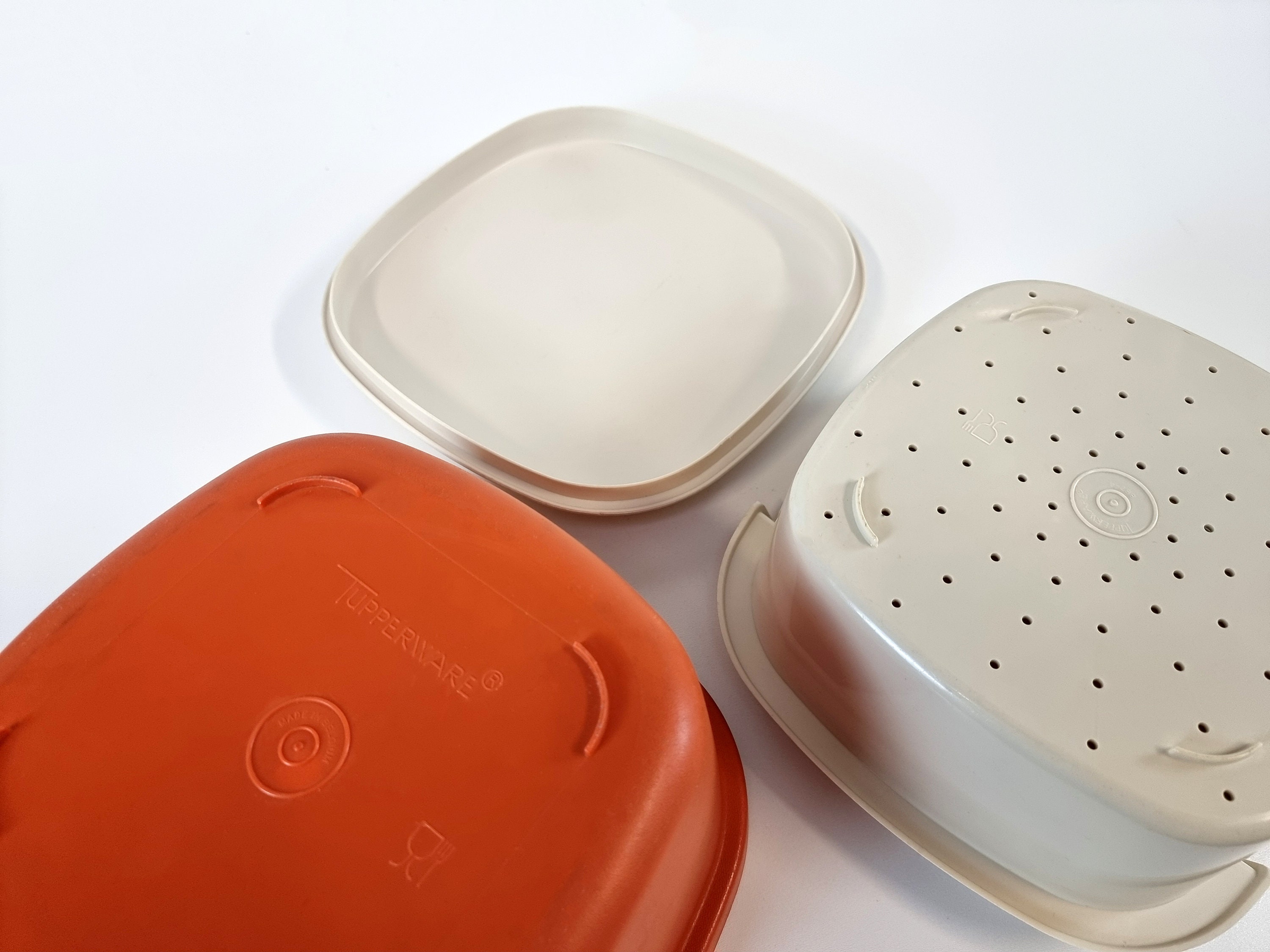 Vintage harvest-orange & almond Tupperware 888-8, 889-8 & 887-4 server container with lid, microwave rice and veggie cooker from the 1970s.