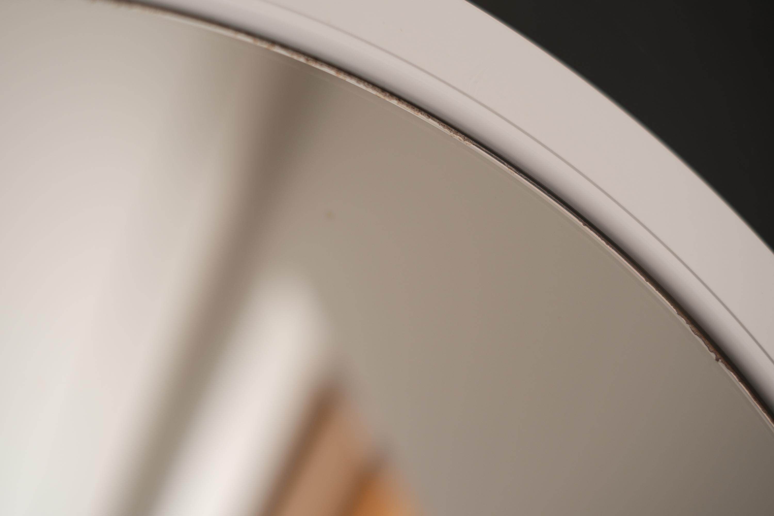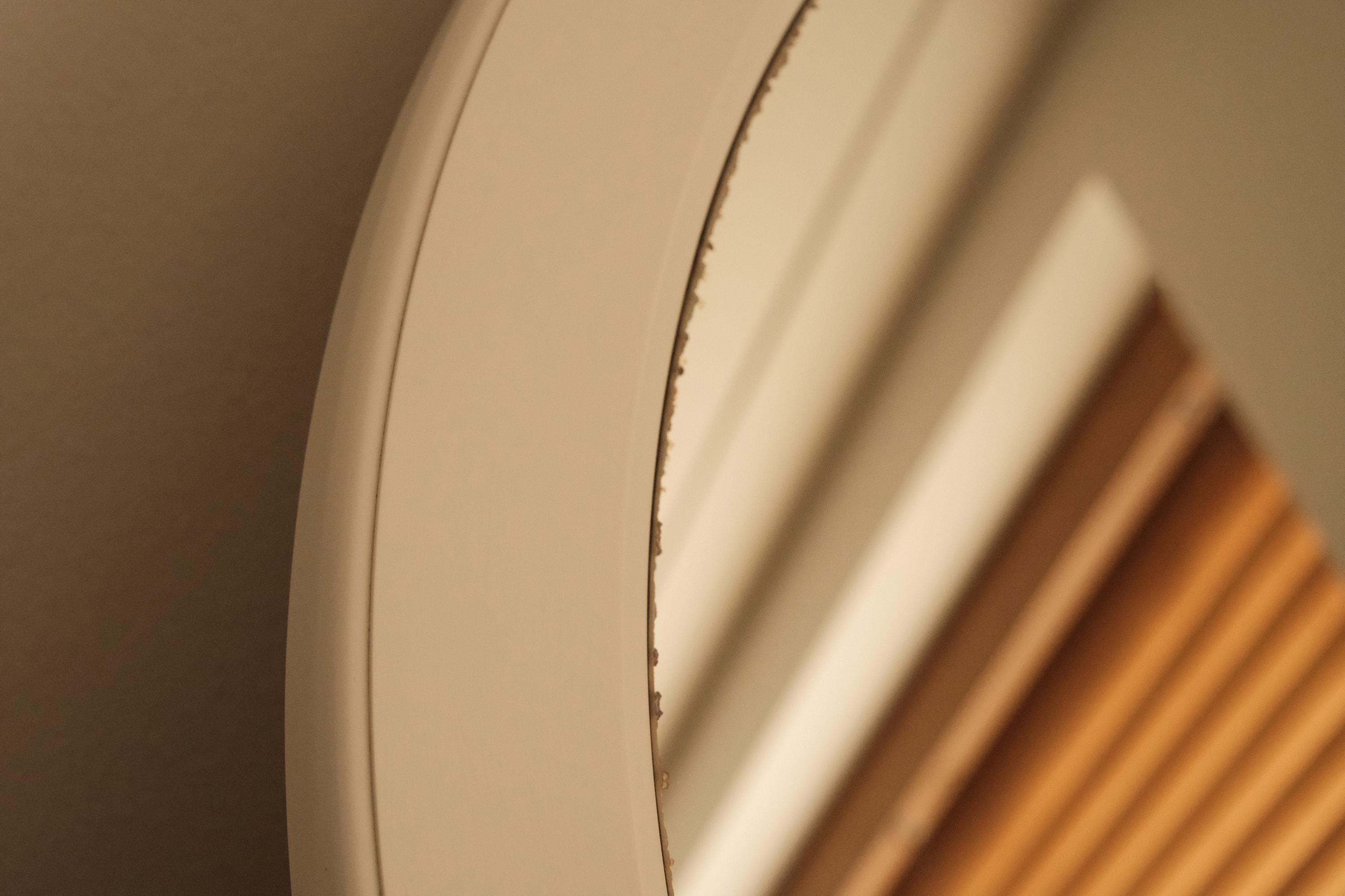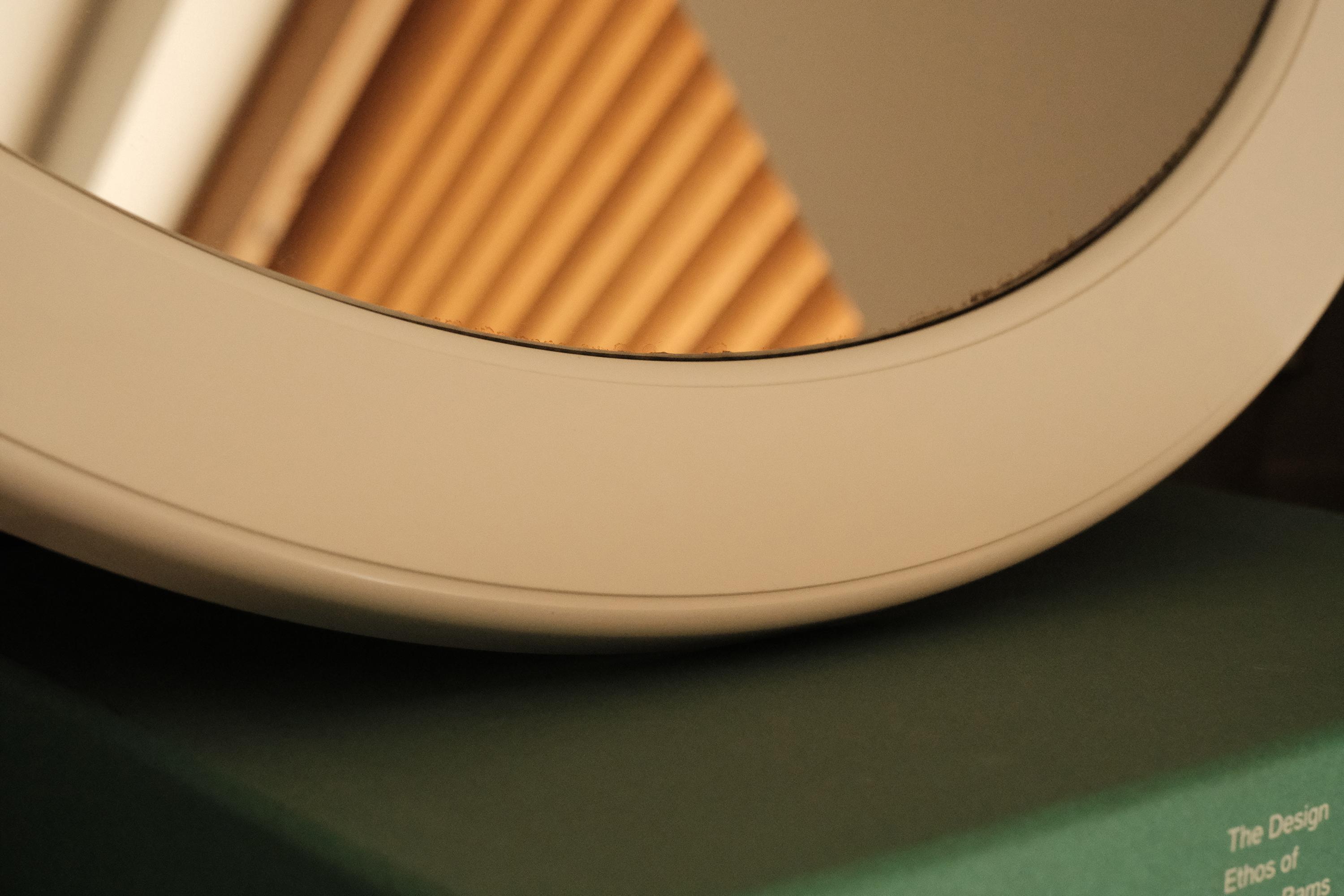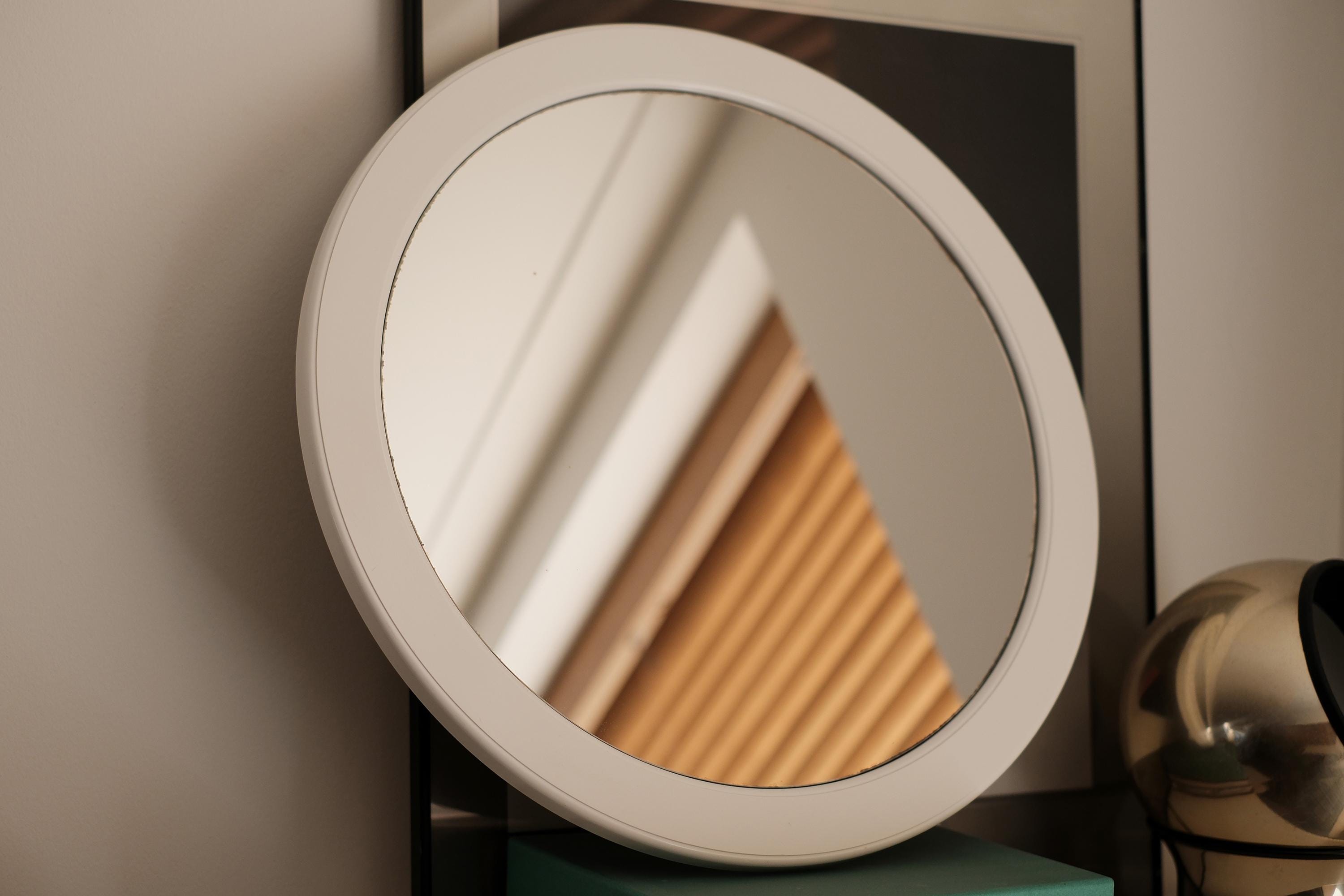 Vintage 1970s round wall mirror featuring a white plastic frame.