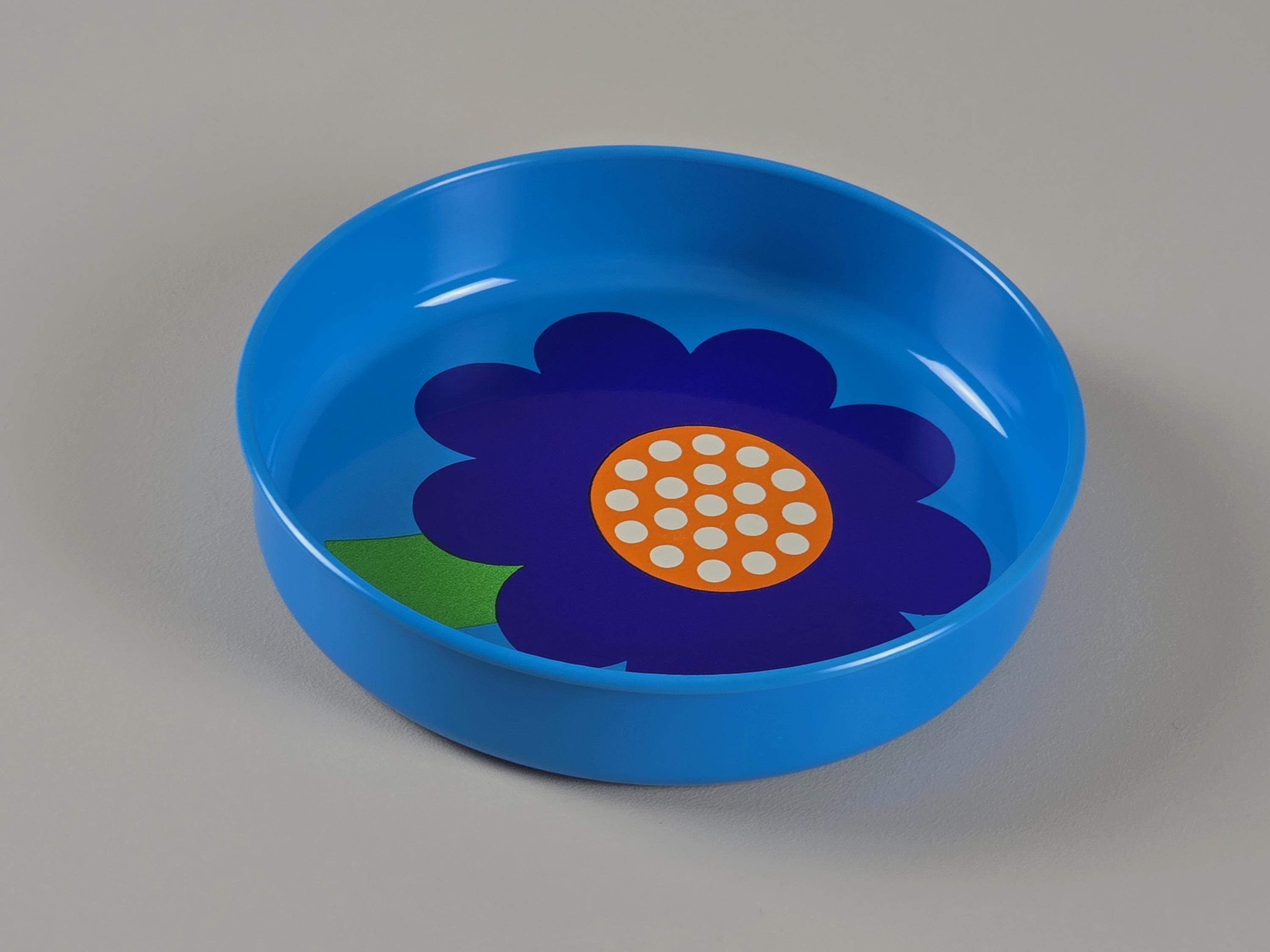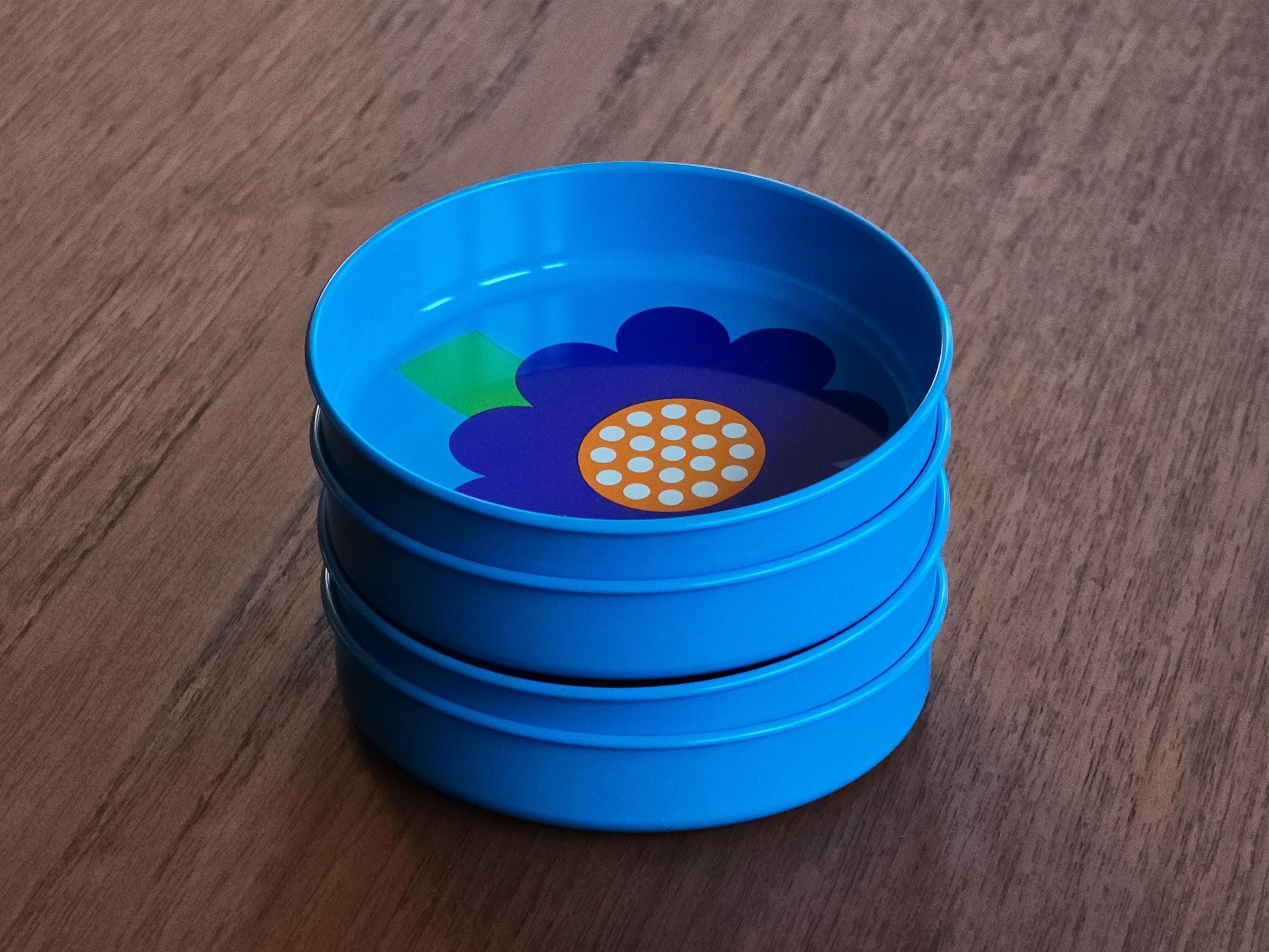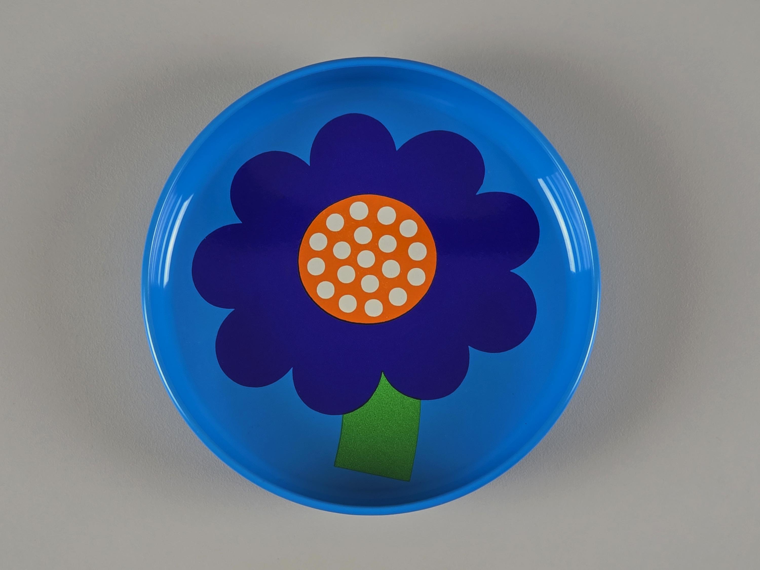 Set Of four 1970s pop-art tin trays from the legendary Danish brand Laurids Lønborg. Designed by Al and Lena Eklund, this piece features a vibrant blue background centered with a stylized, oversized cobalt-blue flower and a bright orange-and-white patterned center.