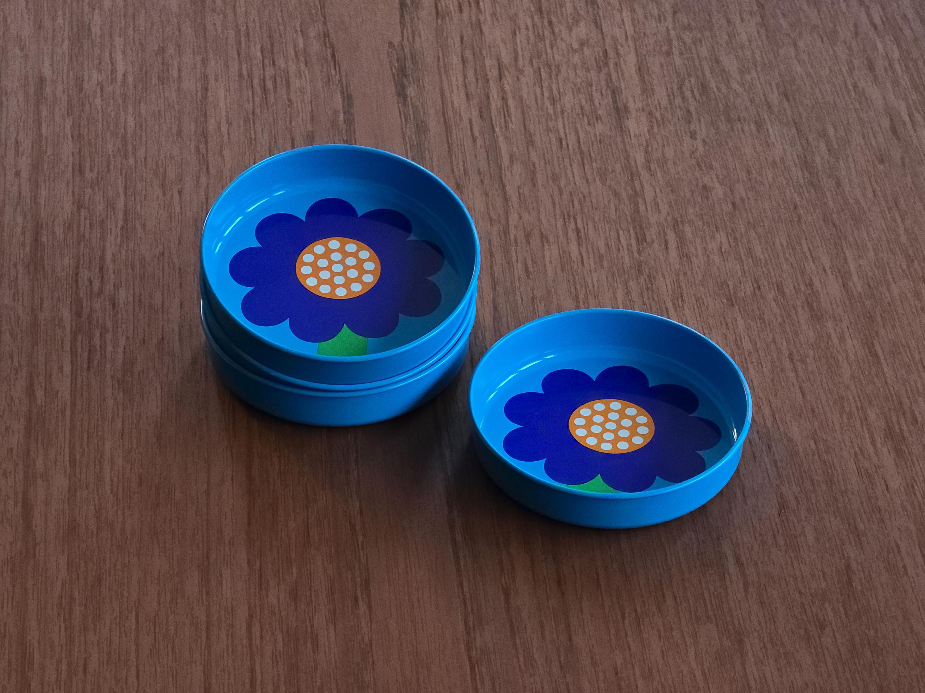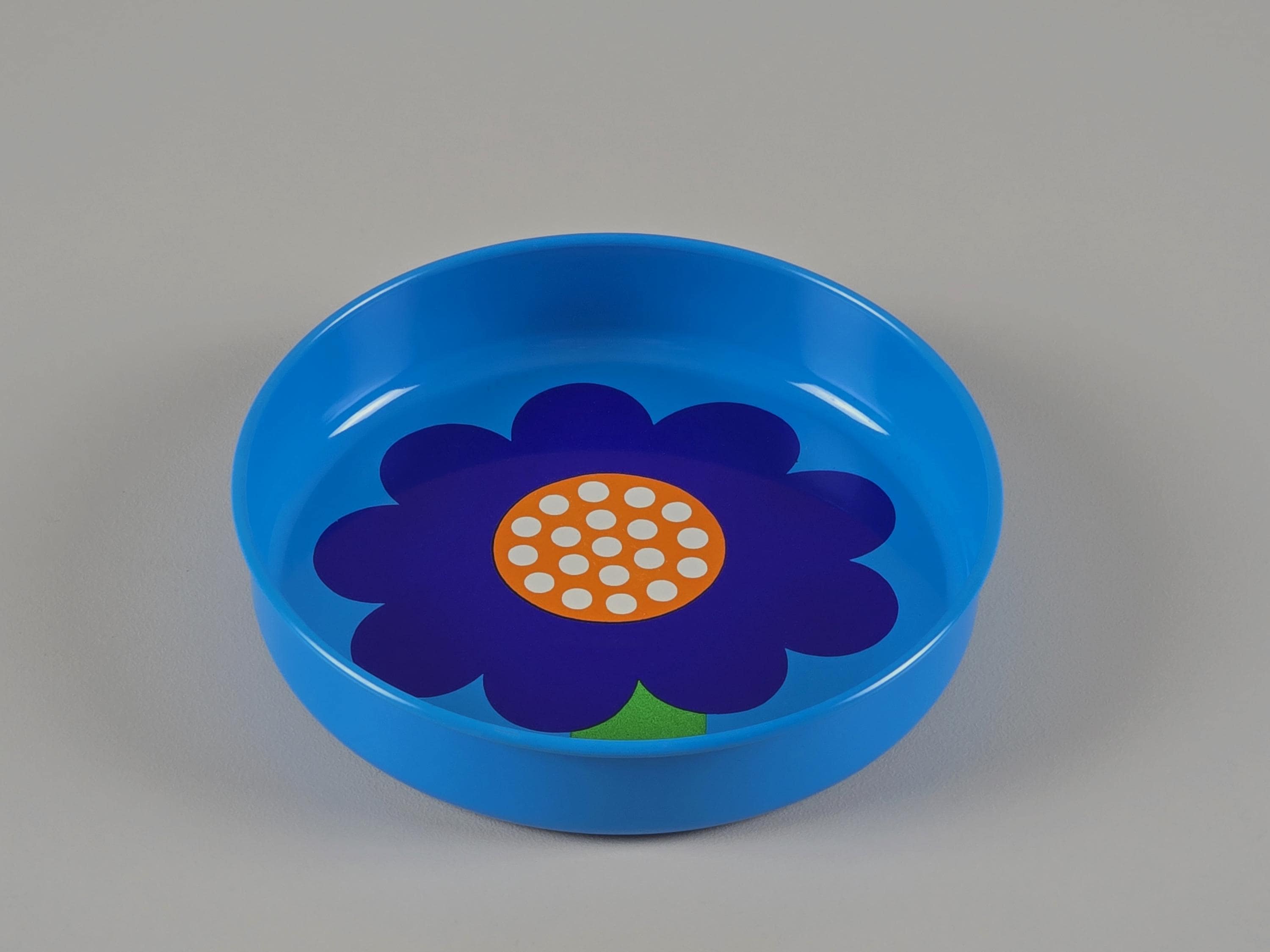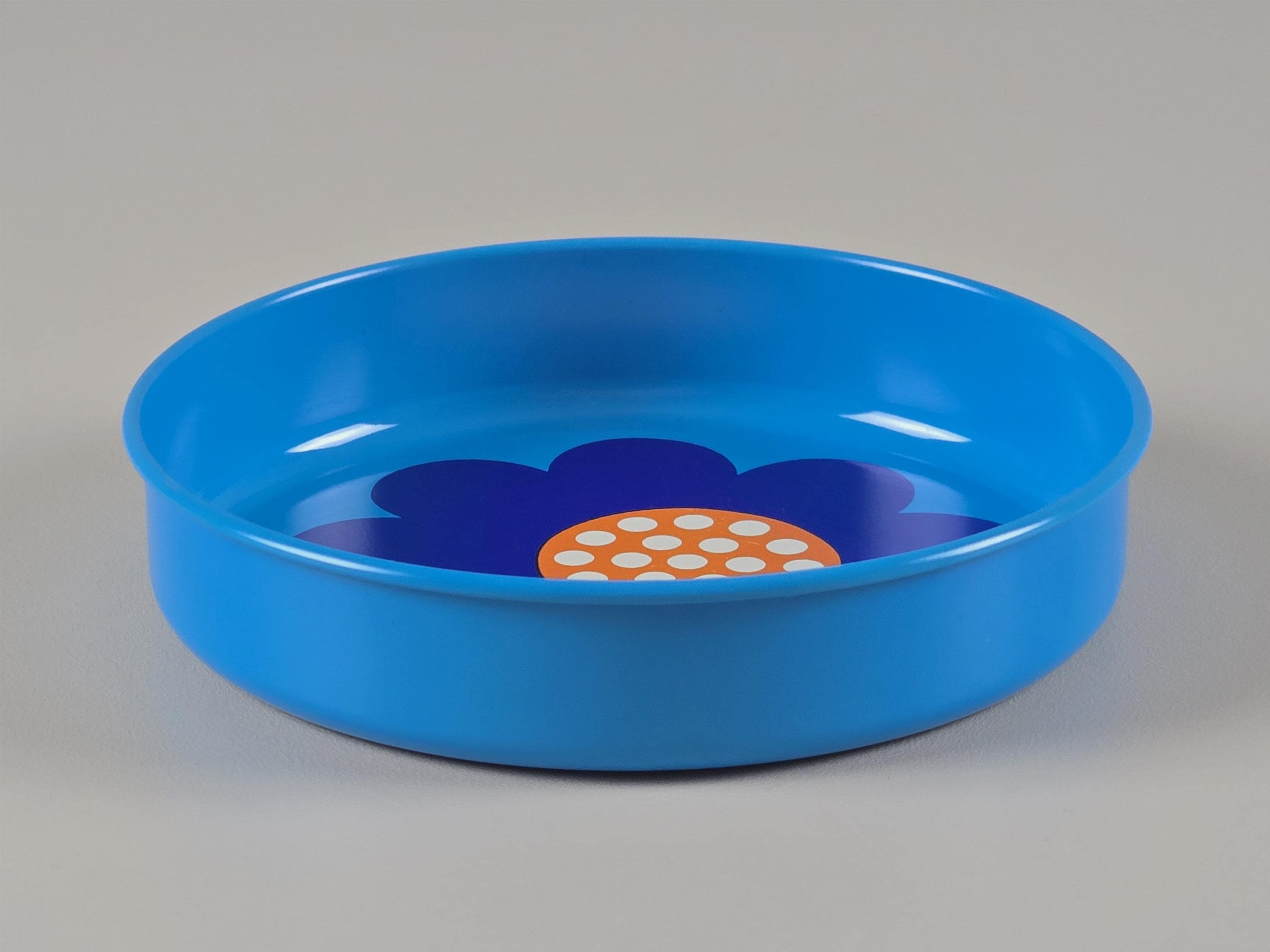 Set Of four 1970s pop-art tin trays from the legendary Danish brand Laurids Lønborg. Designed by Al and Lena Eklund, this piece features a vibrant blue background centered with a stylized, oversized cobalt-blue flower and a bright orange-and-white patterned center.