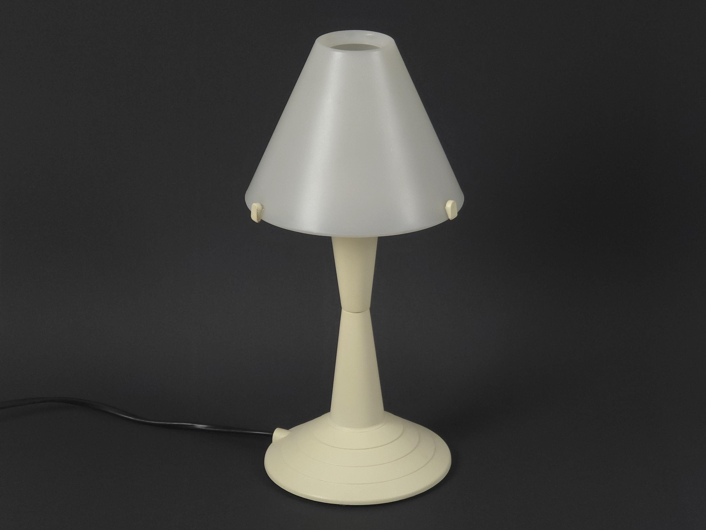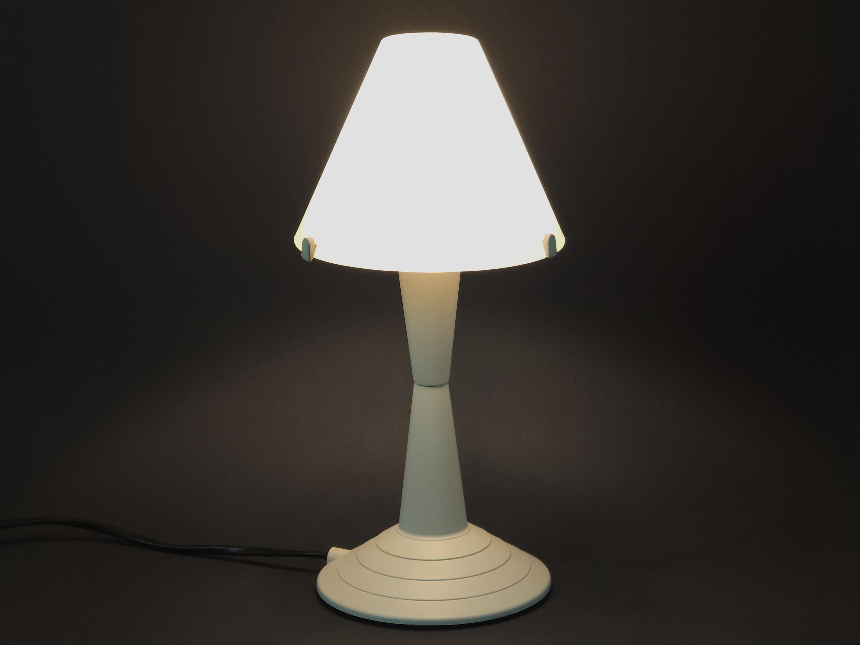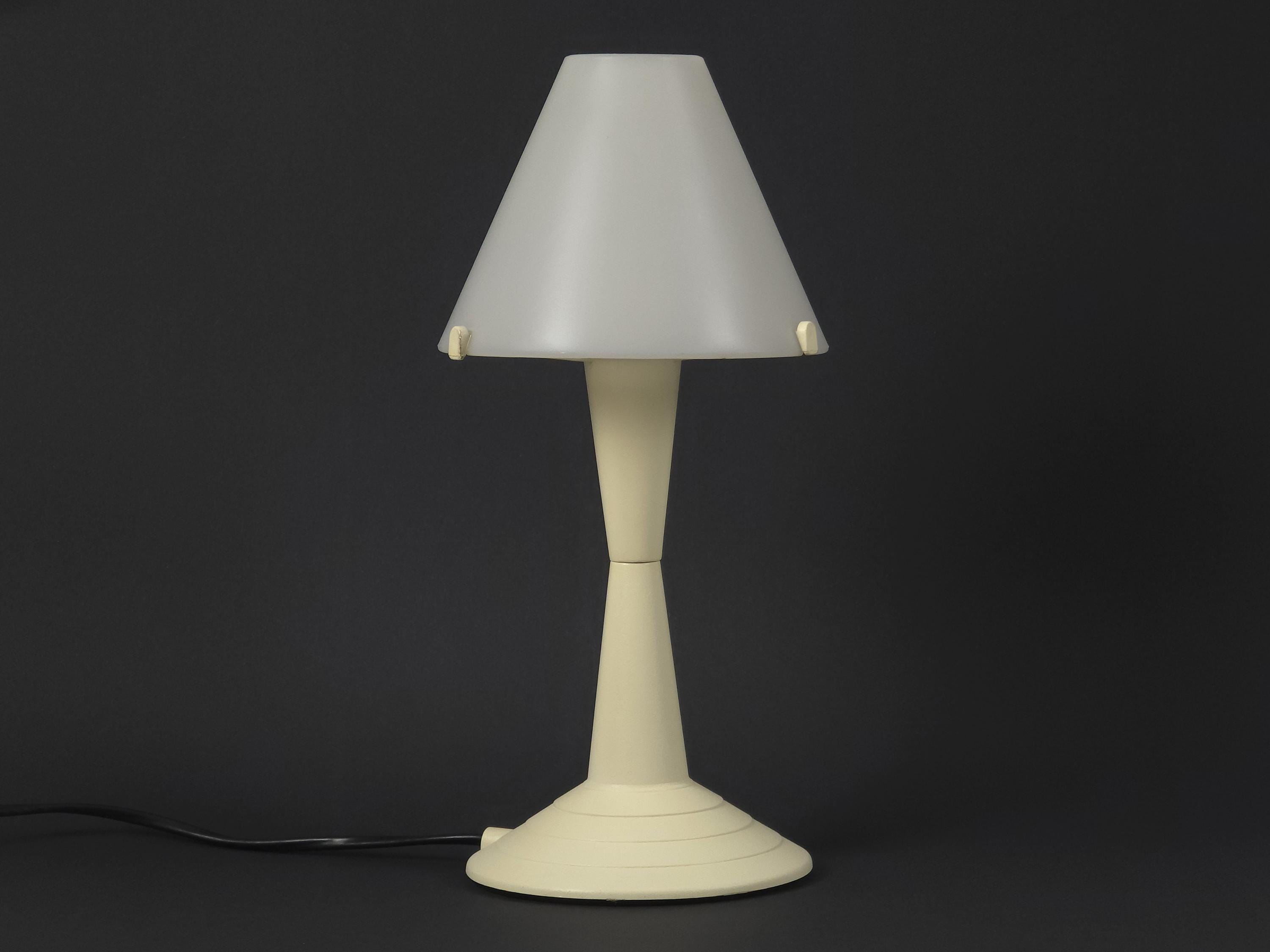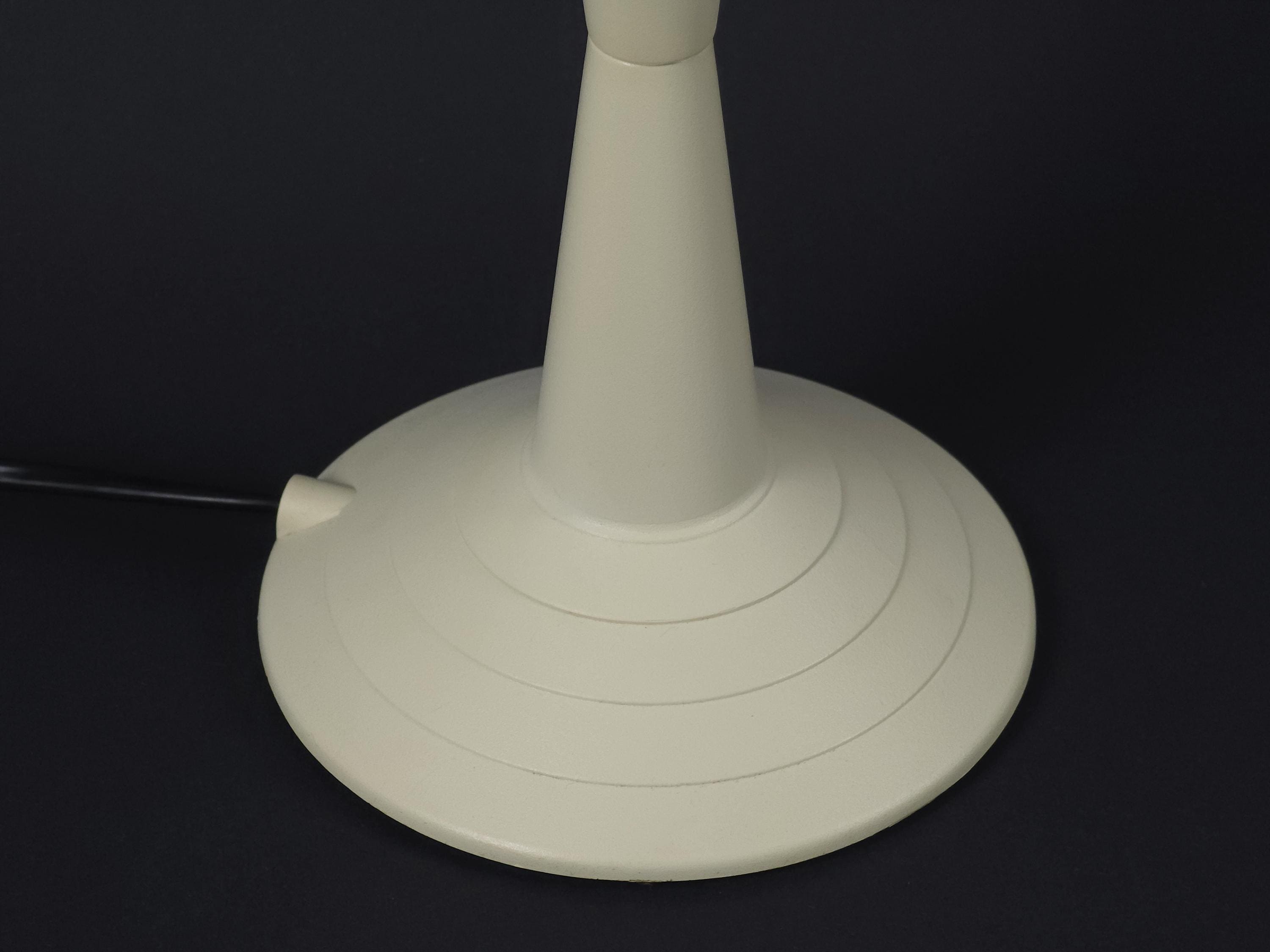 Vintage 1980s postmodern table lamp 'Lulu' by Veneta Lumi. The lamp features a sculptural, geometric profile with a conical base and flared shade, embodying a minimalist retro and Memphis-inspired style.