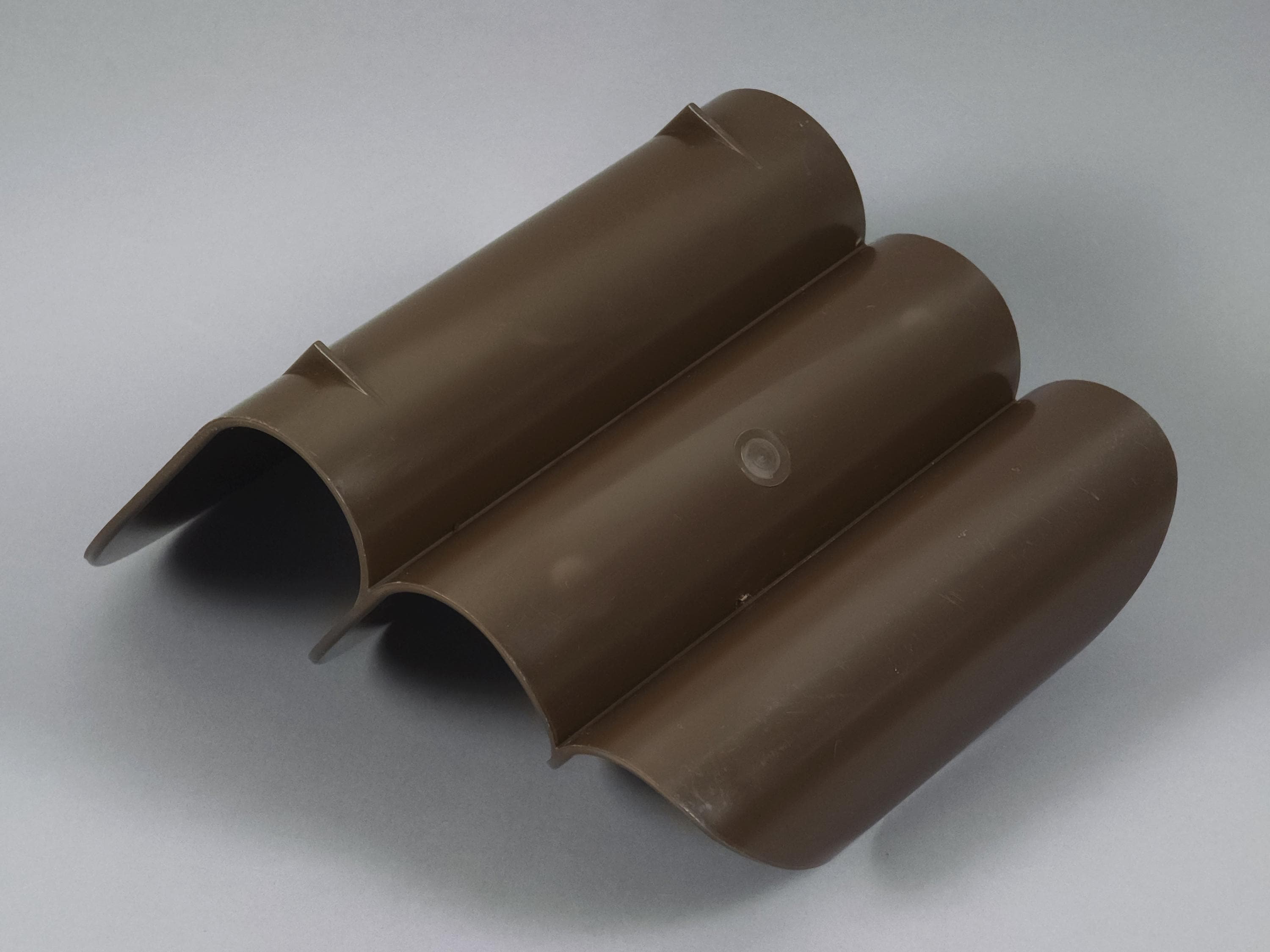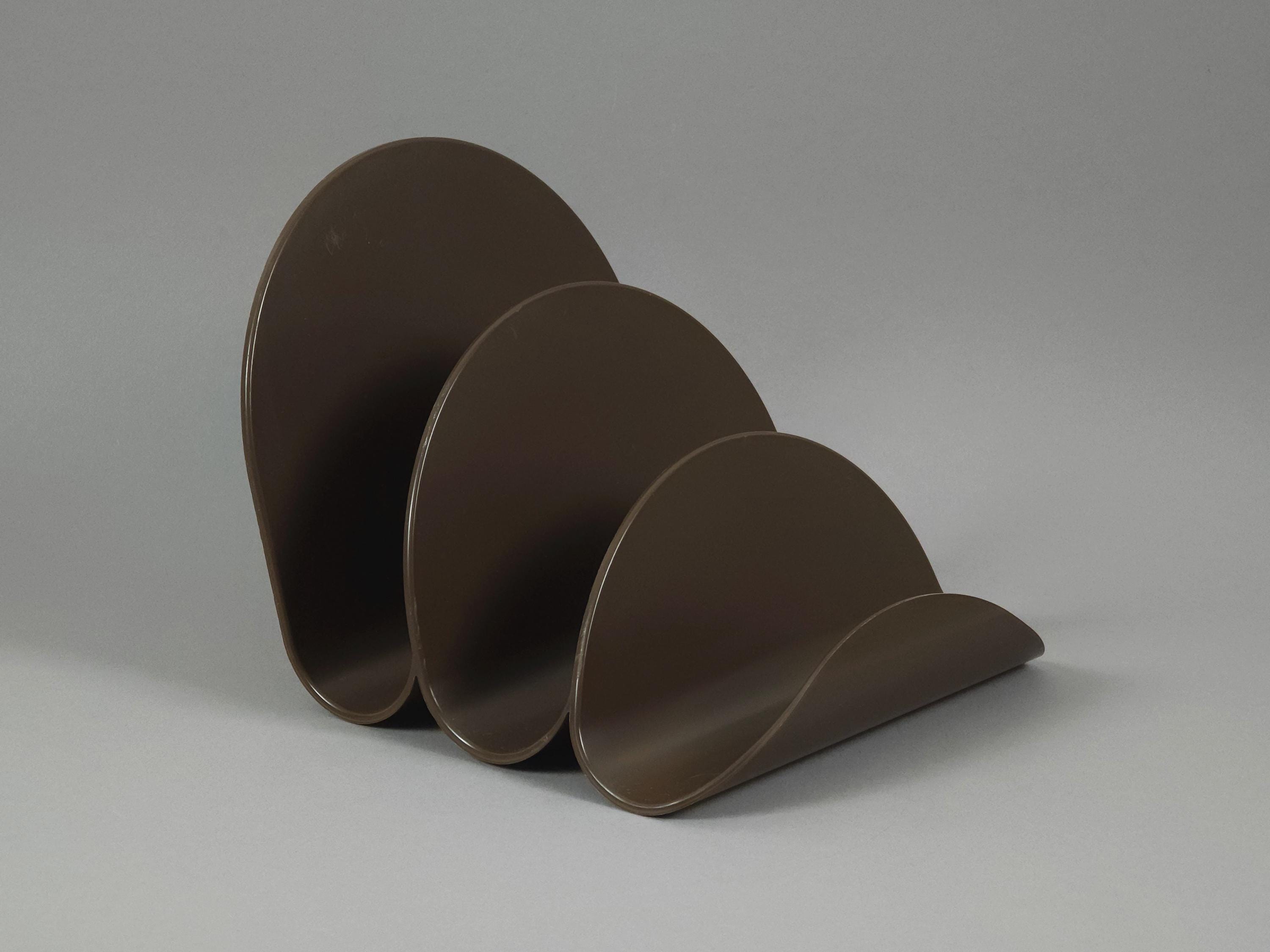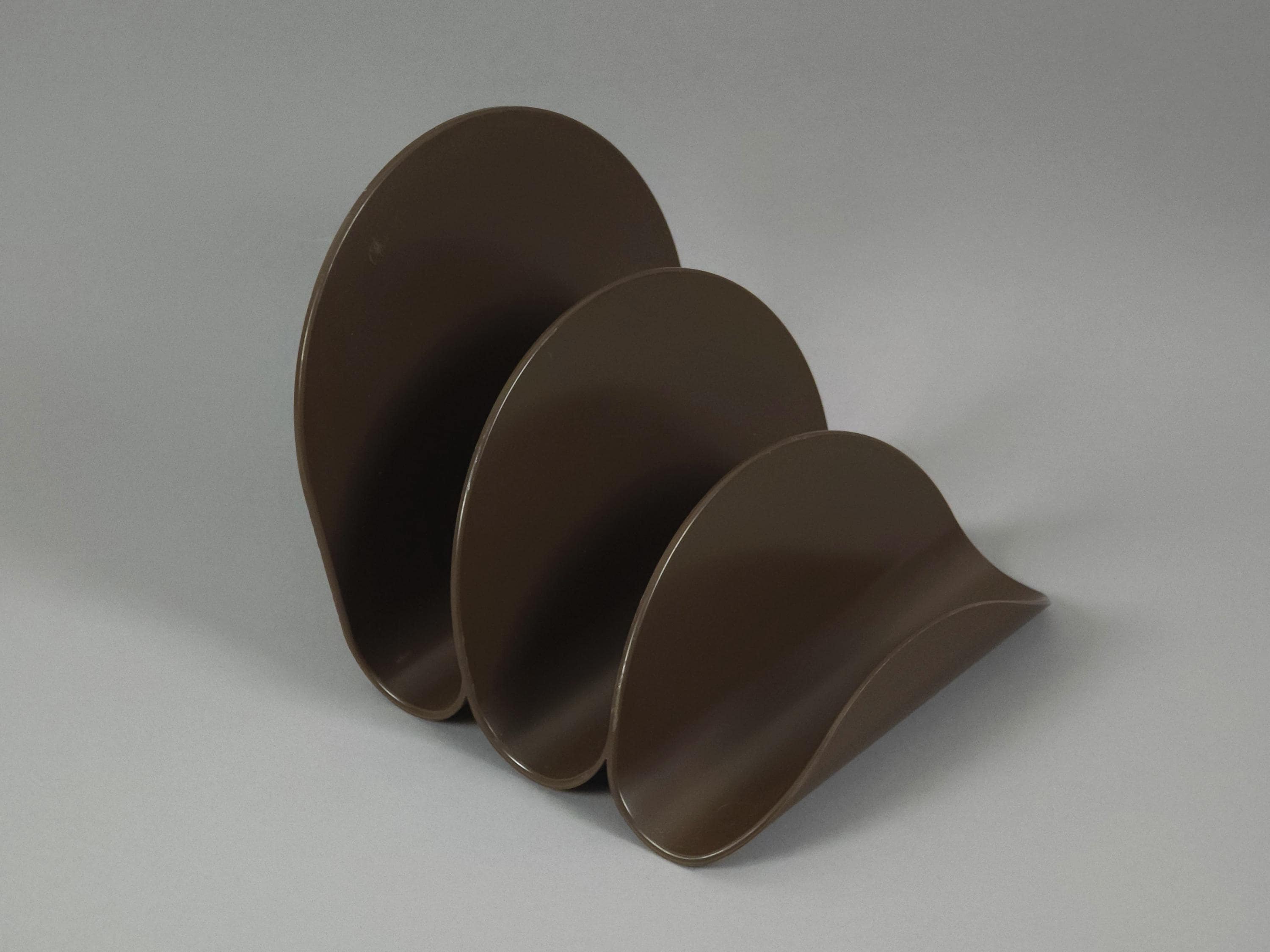 Rare vintage 1970s brown plastic letter holder & magazine holder rack. It's sculptural form features three slots of increasing heights, making it a versatile object for storage and organization, as well as a statement display item.