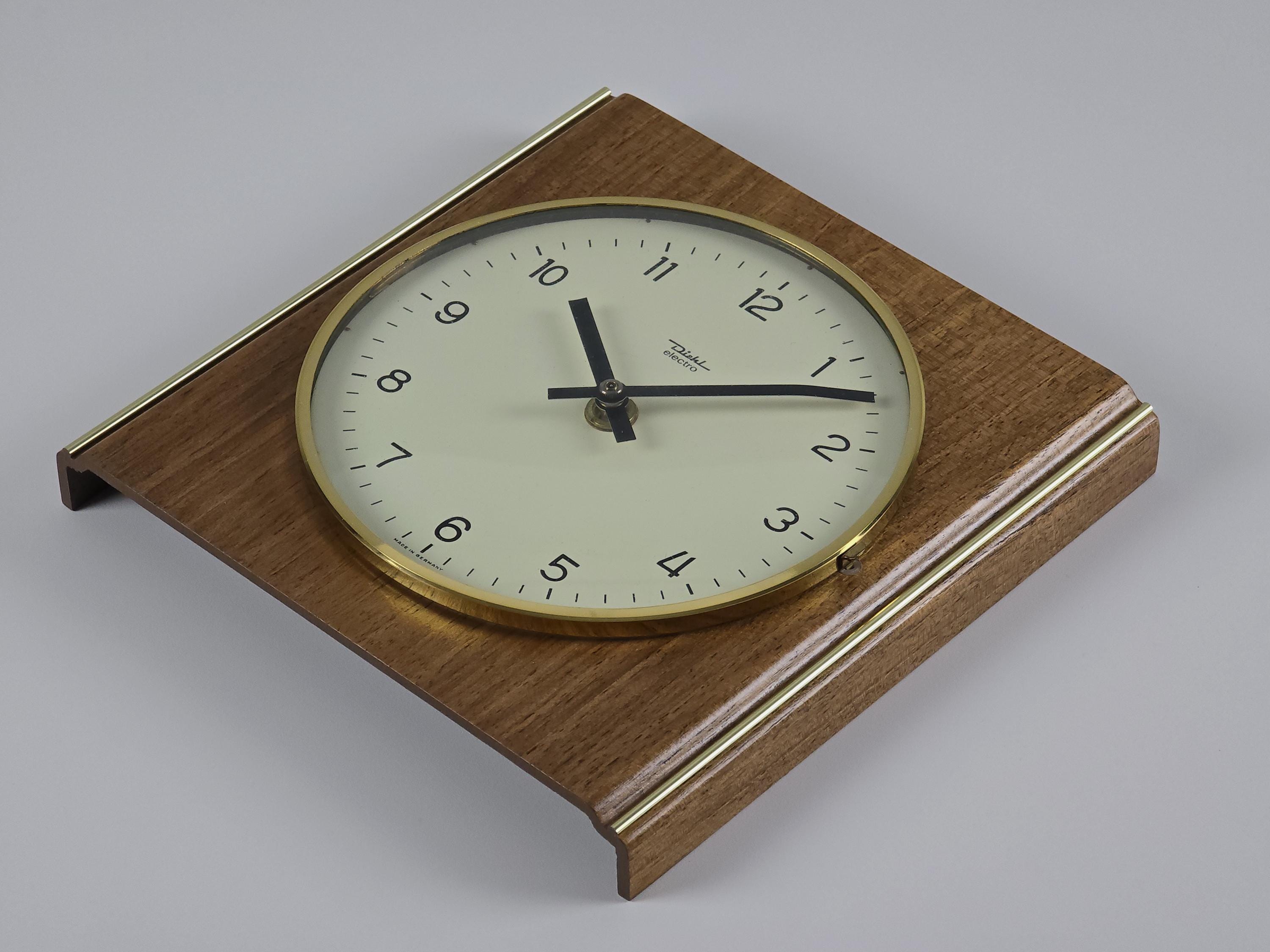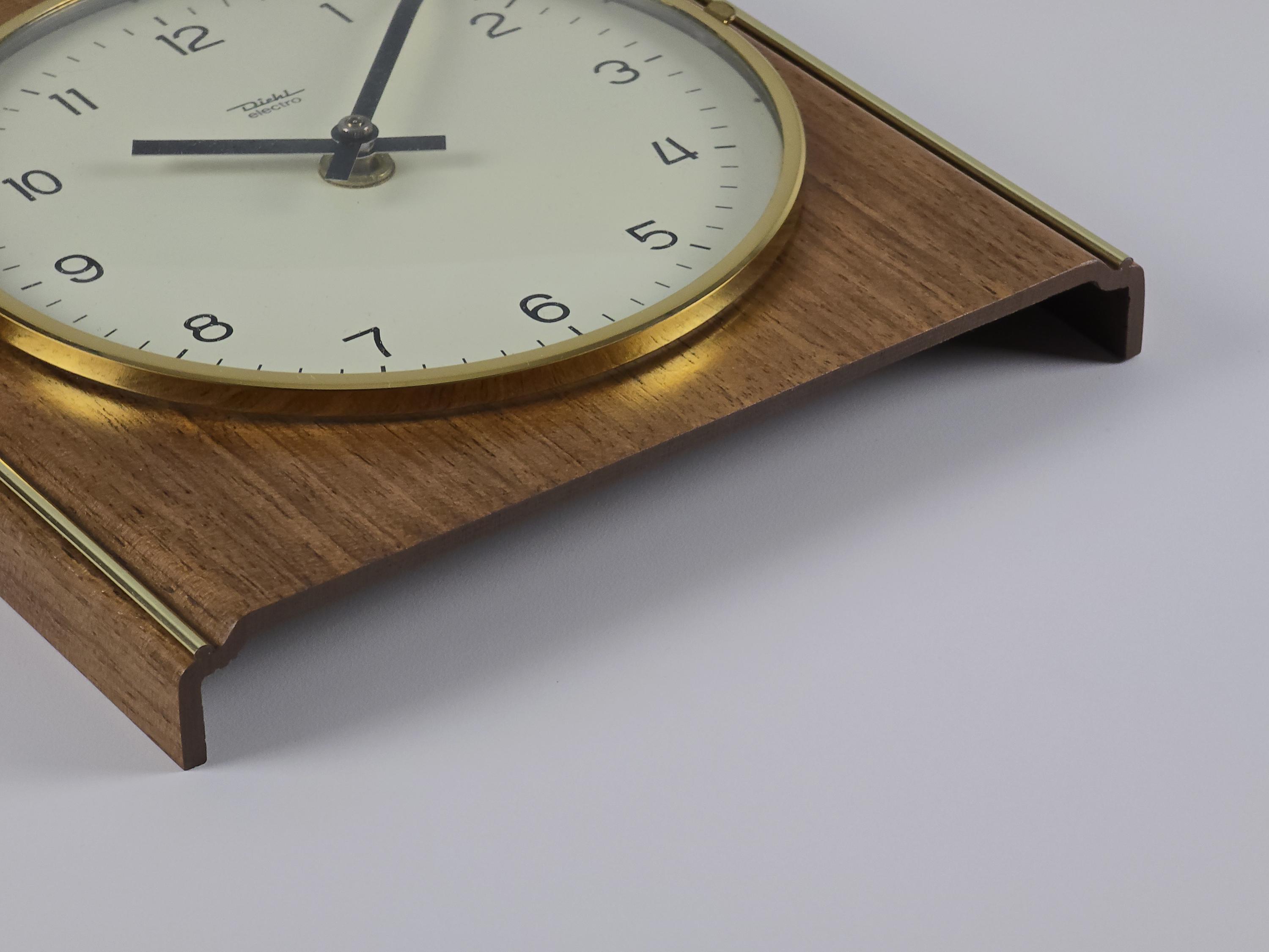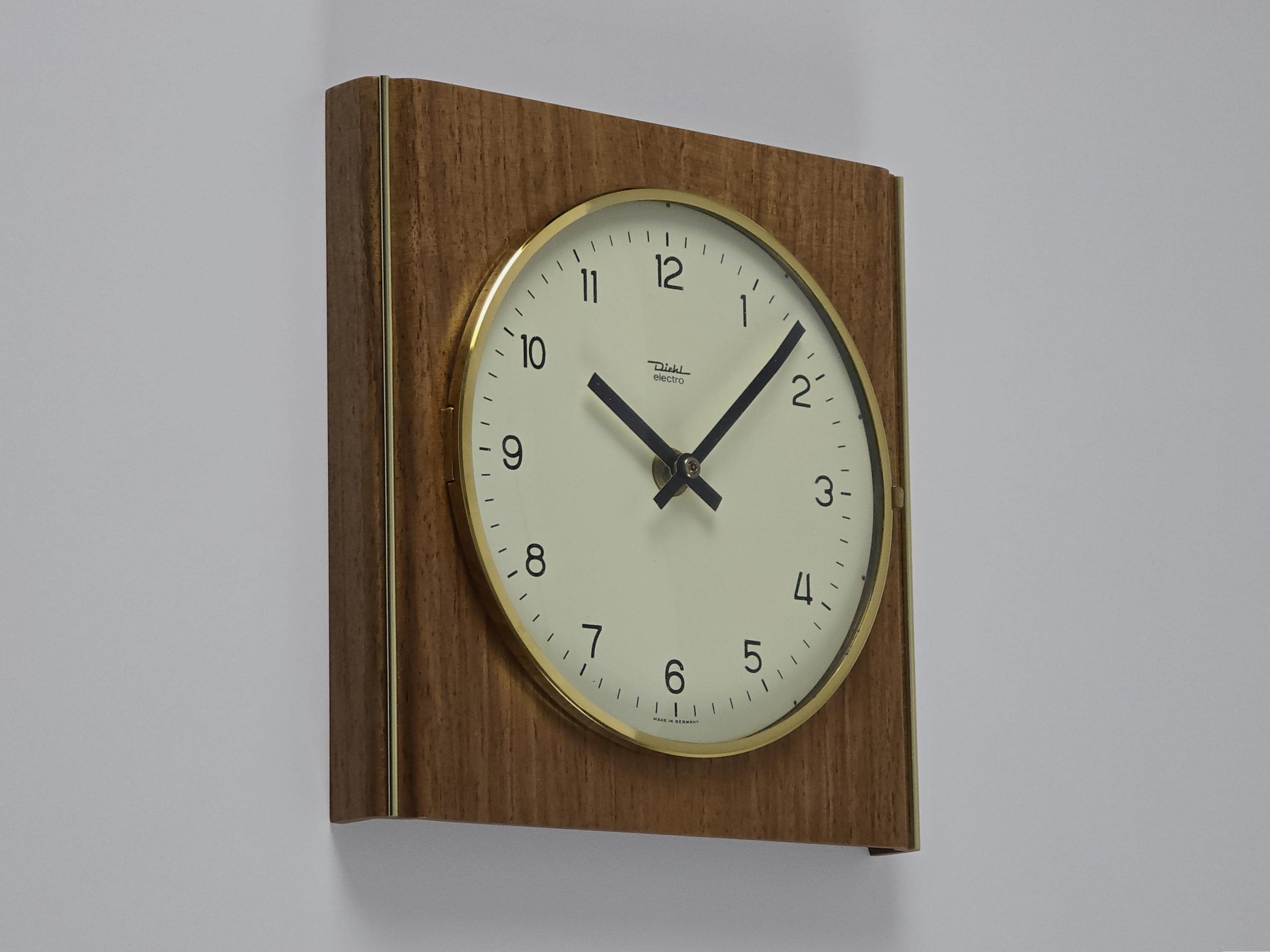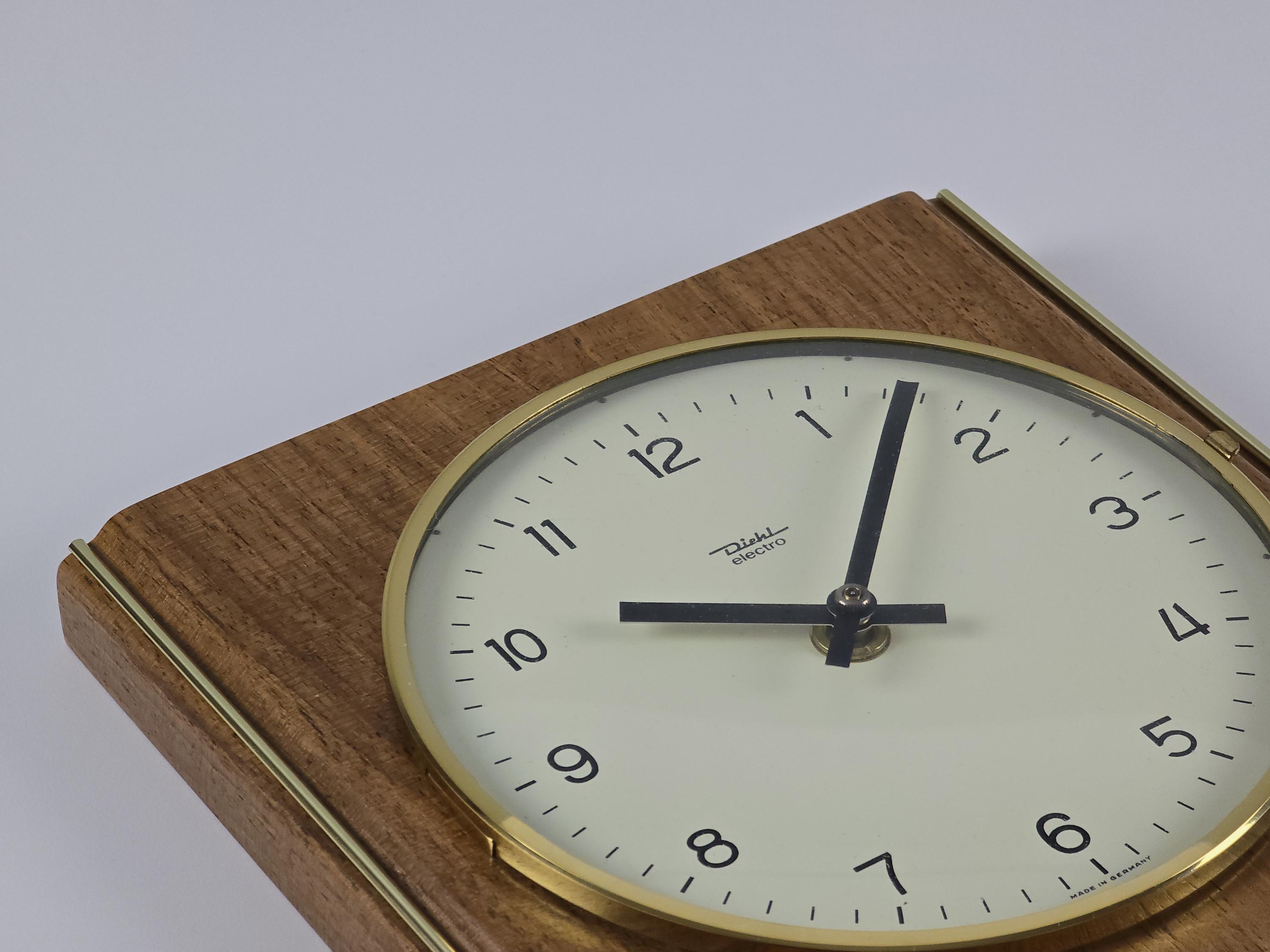Uncirculated DIEHL electro wall clock, new old stock with original box. Made in West Germany, likely late 1960s. Wood veneer case with vertical brass inlays, clean white dial under convex acrylic glass, and a gold bezel that frames it all in classic mid-century form.