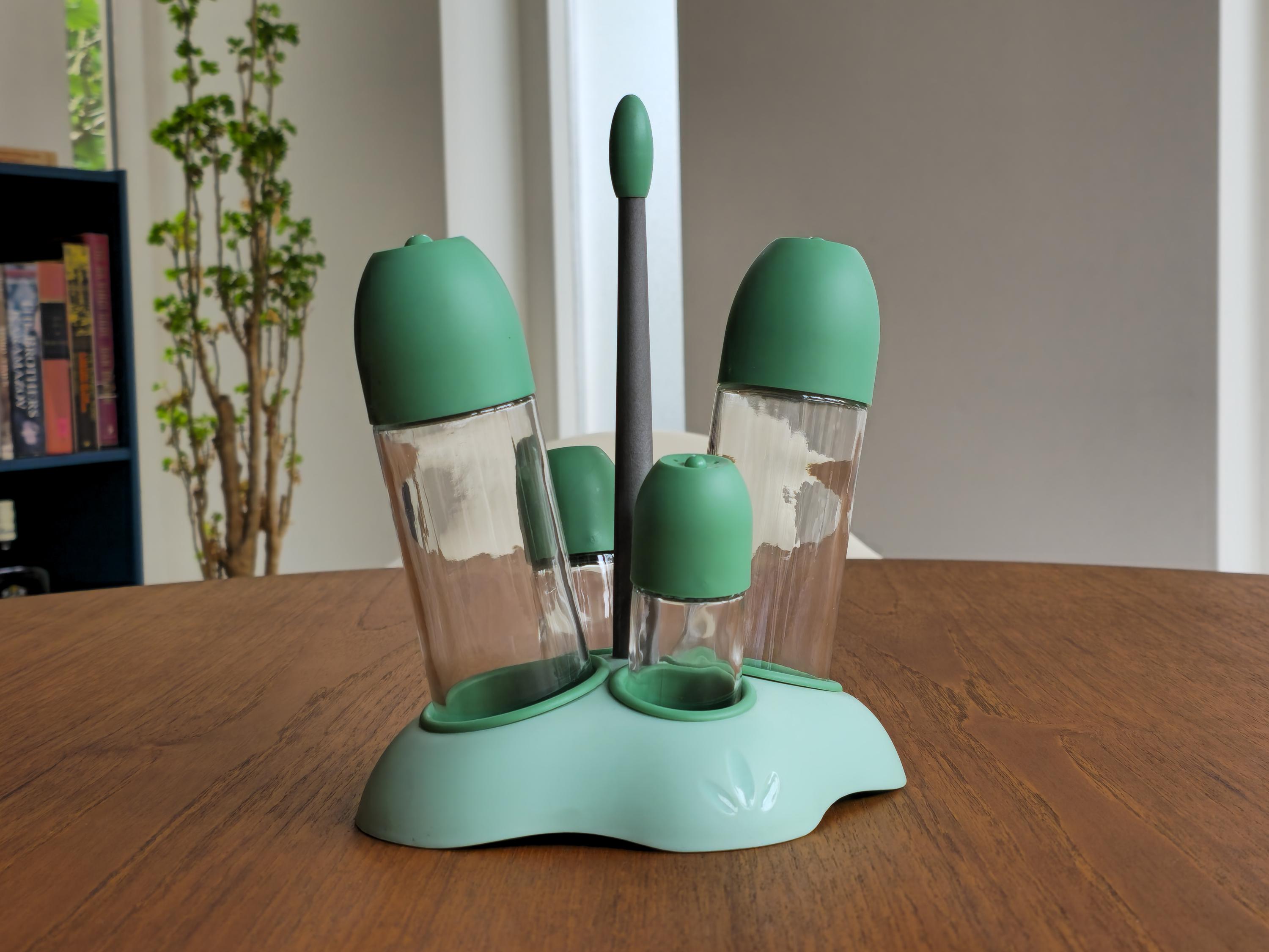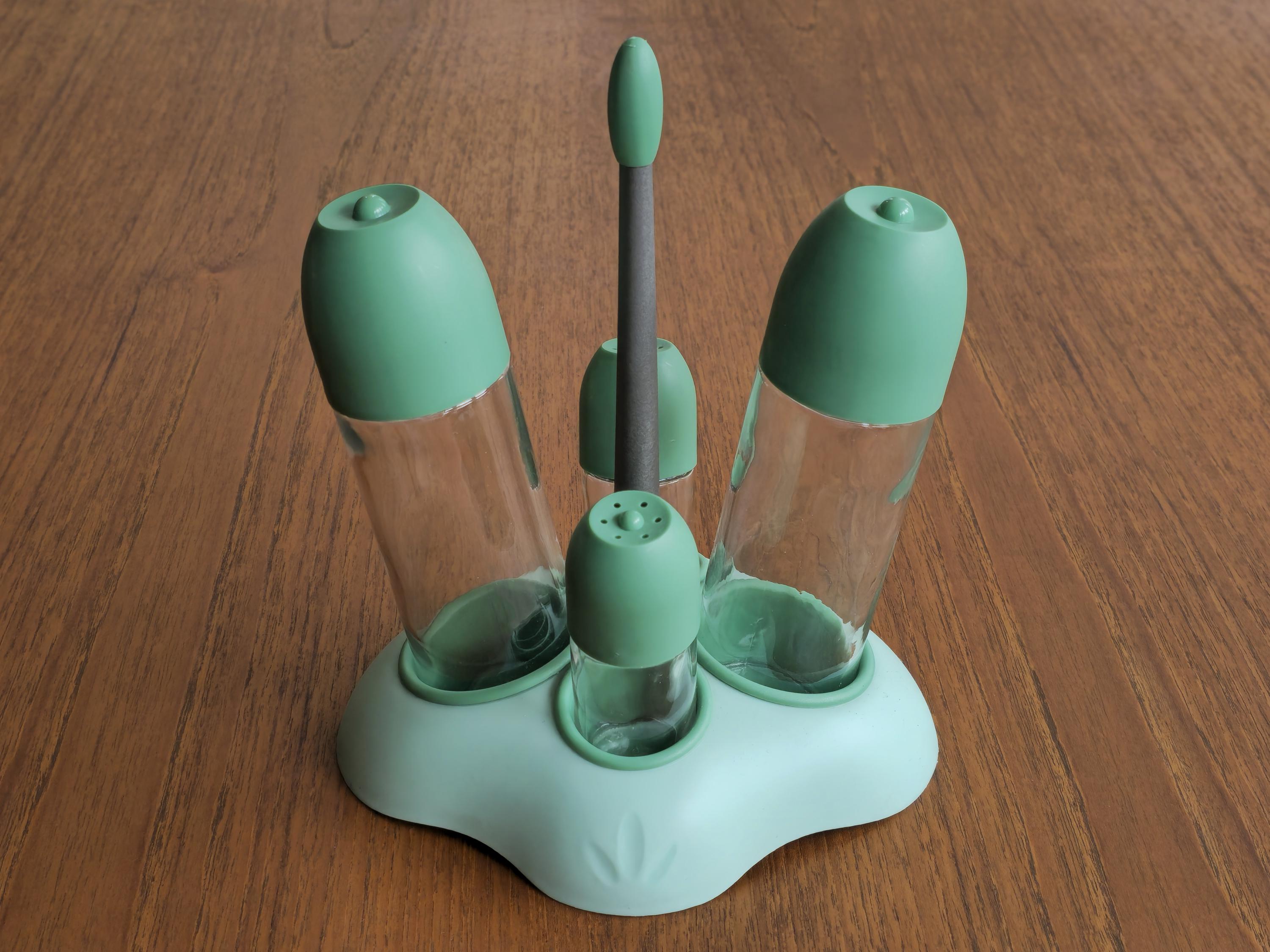 • "Oliera Casa" cruet set, condiment set used for oil, vinegar, salt, and pepper.