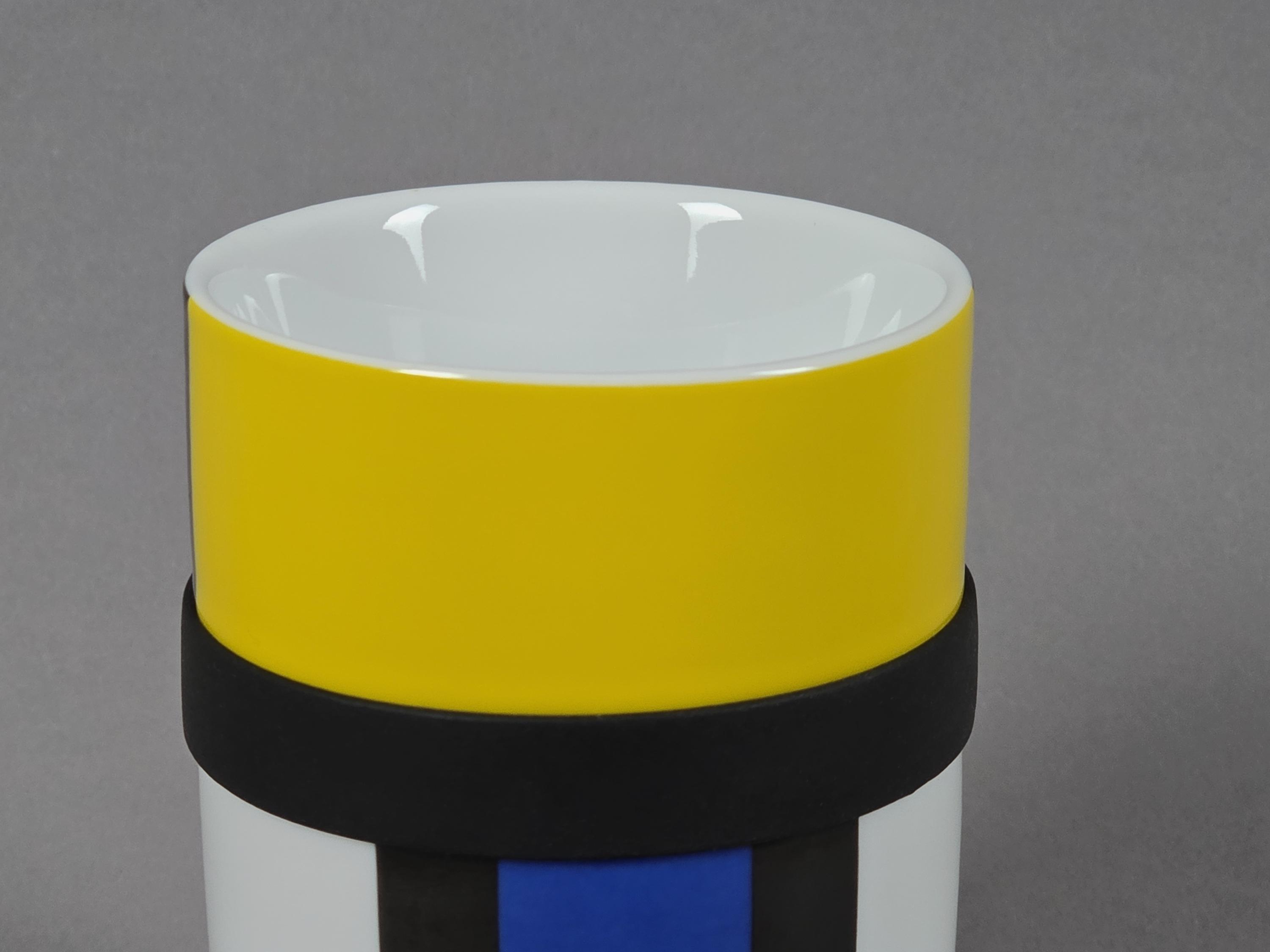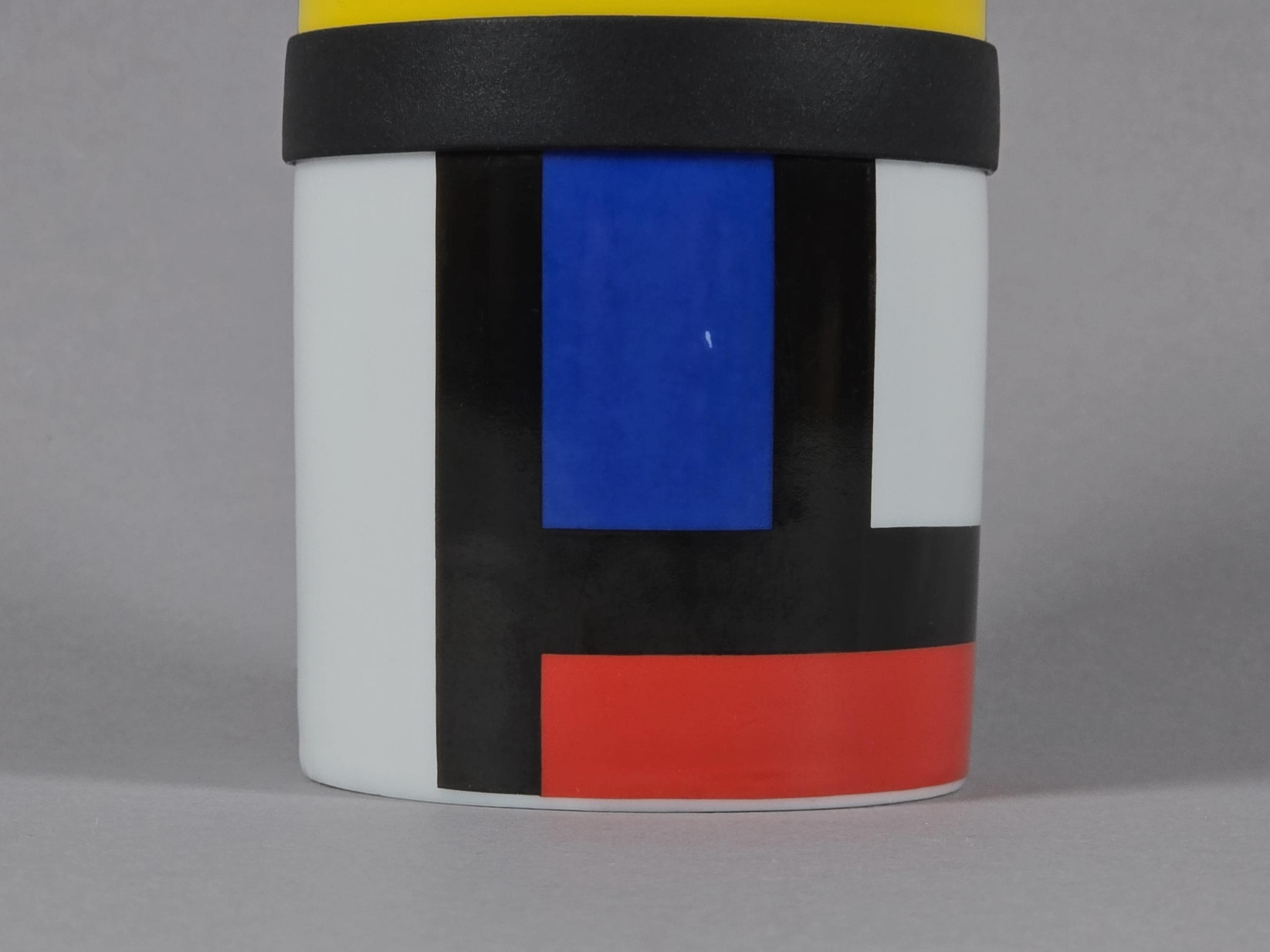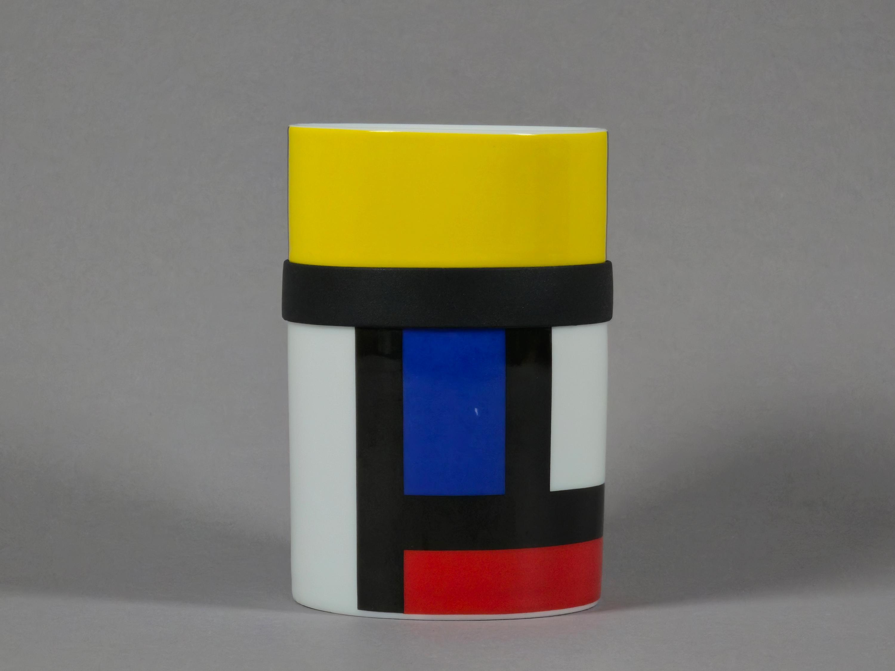Retro 'De Stijl' ceramic vase with a rubber ring 'Ring Mondri' by Frank Kerdil for Danish brand PO. The vase is inspired by Piet Mondrian and Dutch De Stijl art movement.