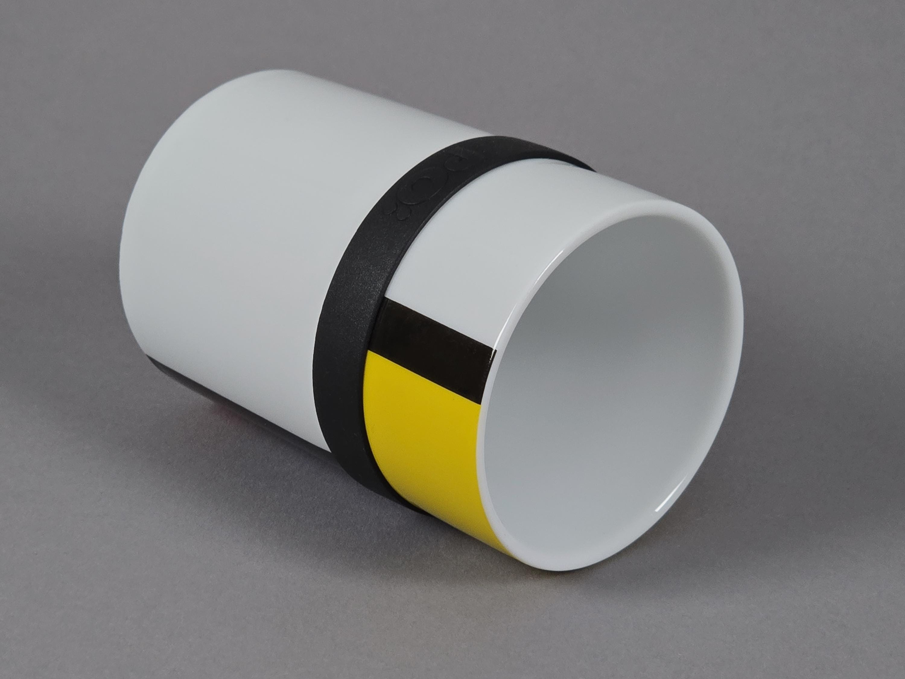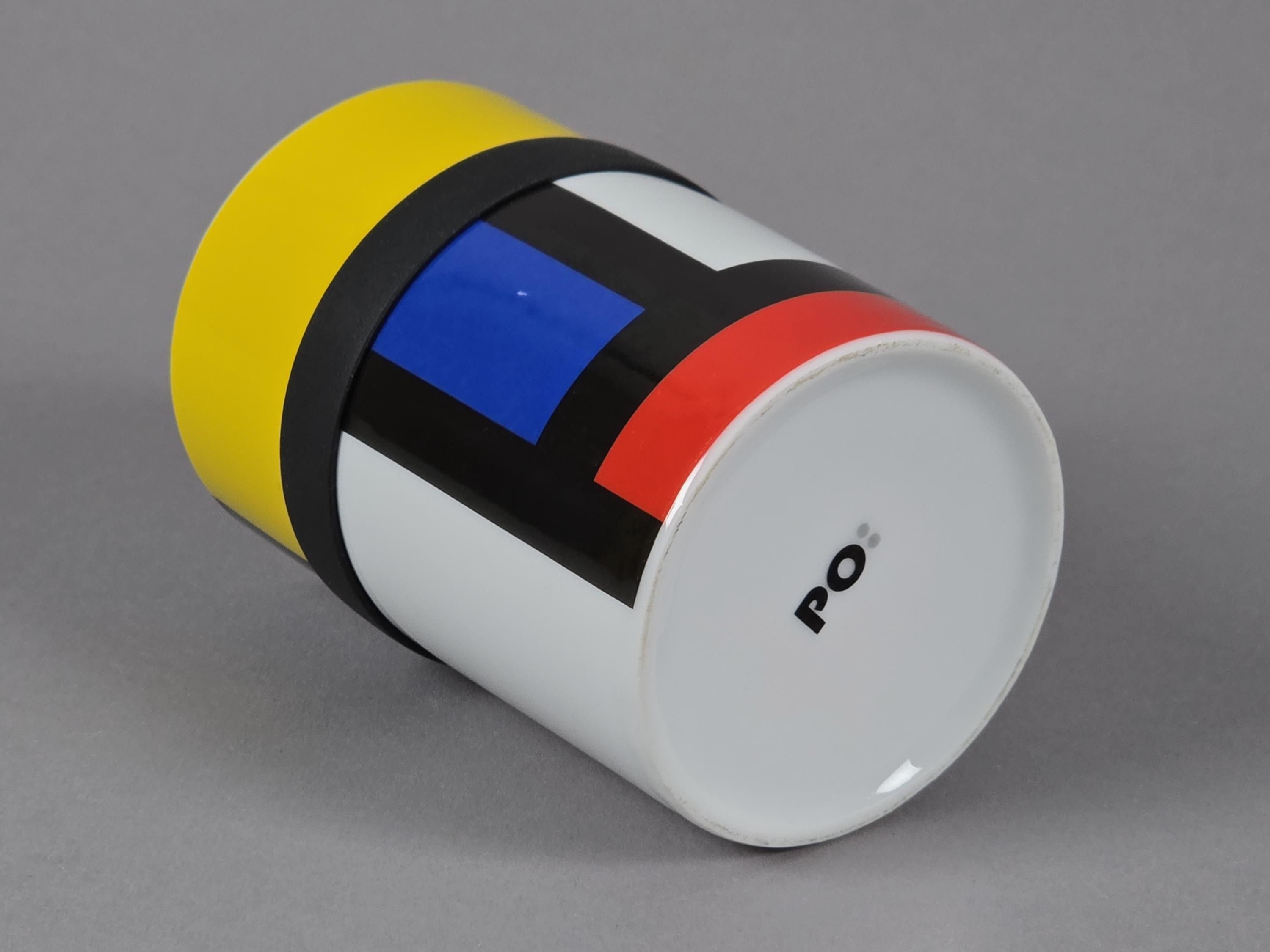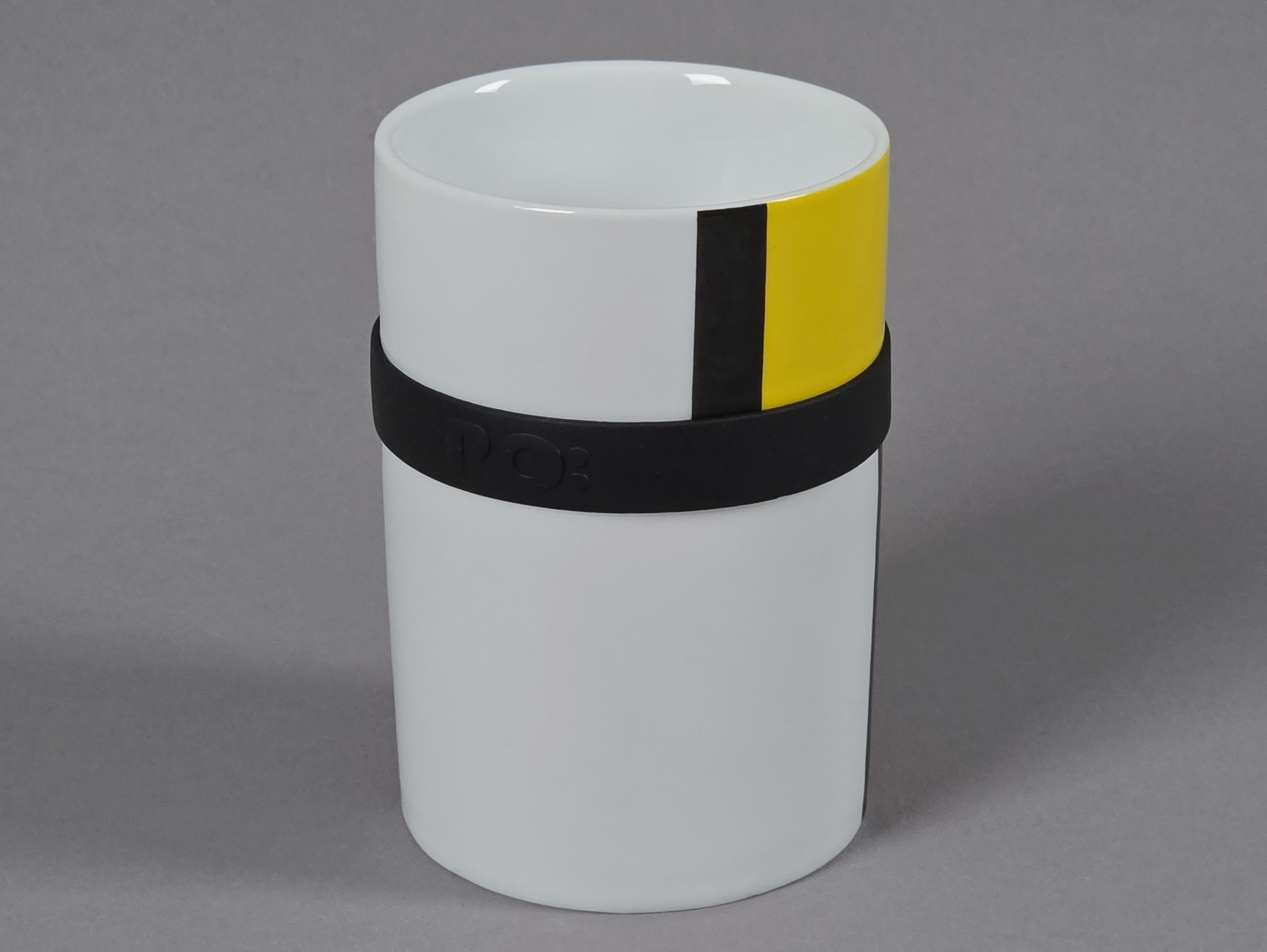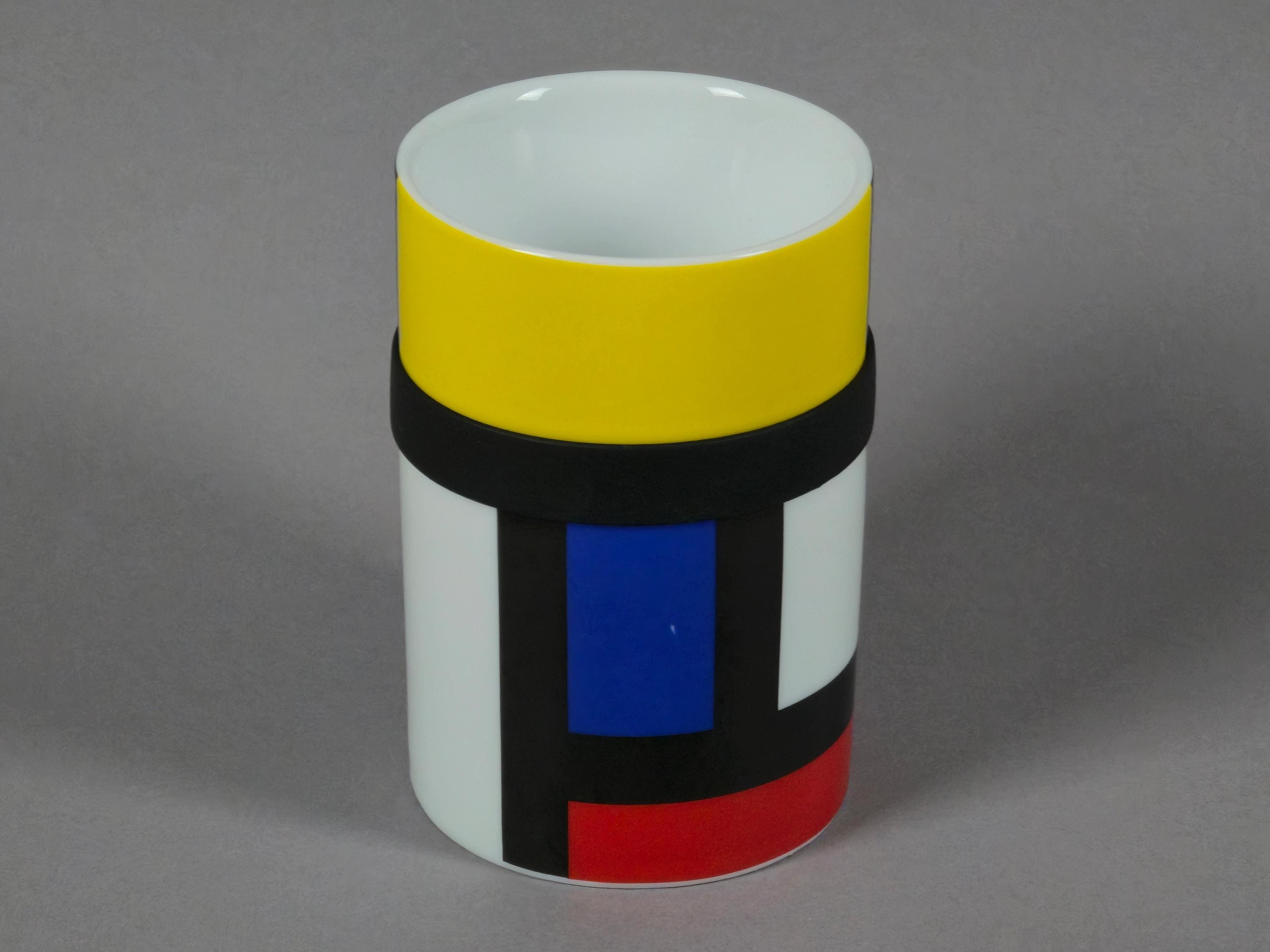 Retro 'De Stijl' ceramic vase with a rubber ring 'Ring Mondri' by Frank Kerdil for Danish brand PO. The vase is inspired by Piet Mondrian and Dutch De Stijl art movement.