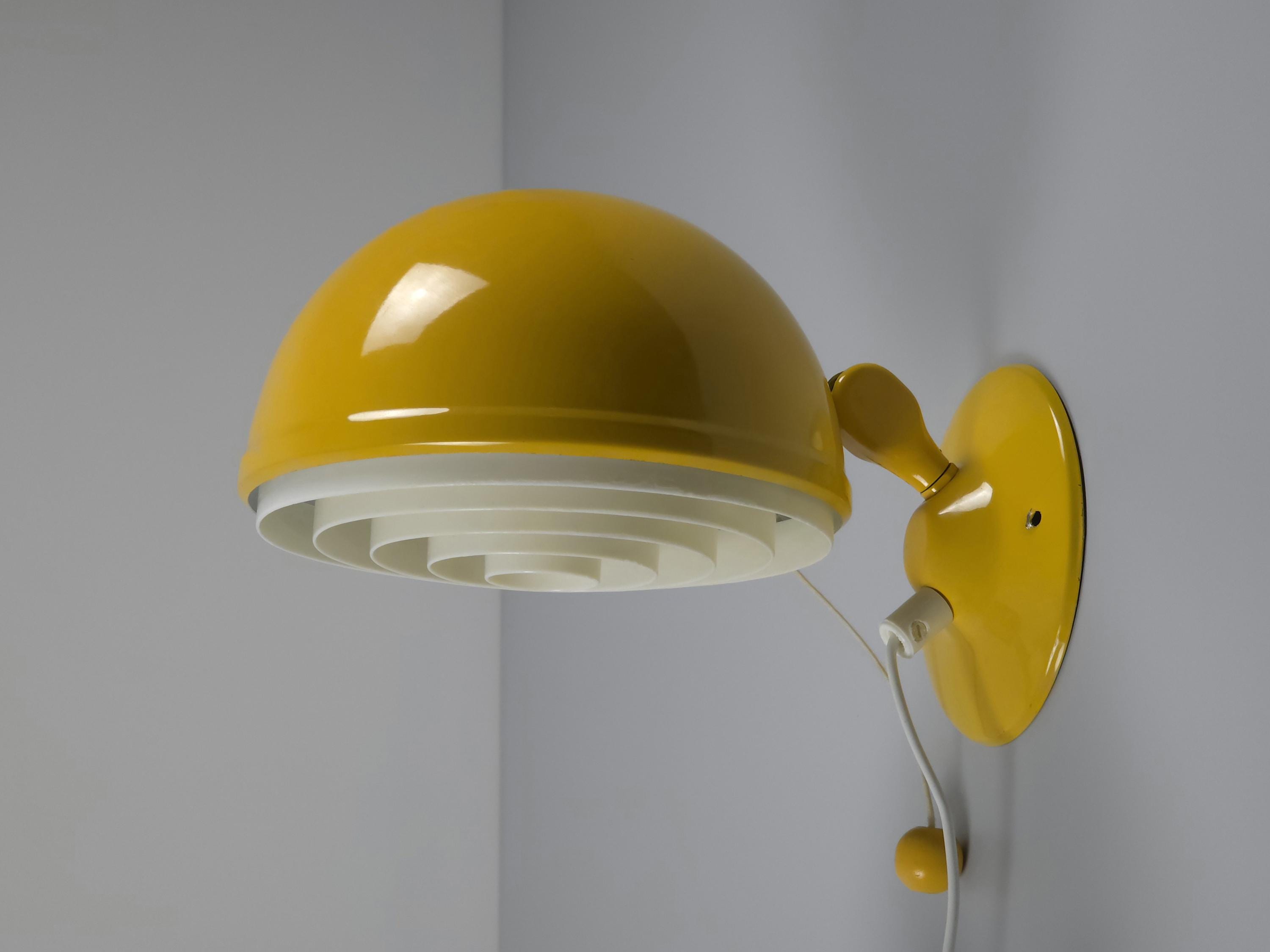 Vintage 1960s Danish-modern wall lamp by Knud Christensen for Elit. This model features a vibrant yellow lacquered metal dome shade and a matching semi-circular wall base.