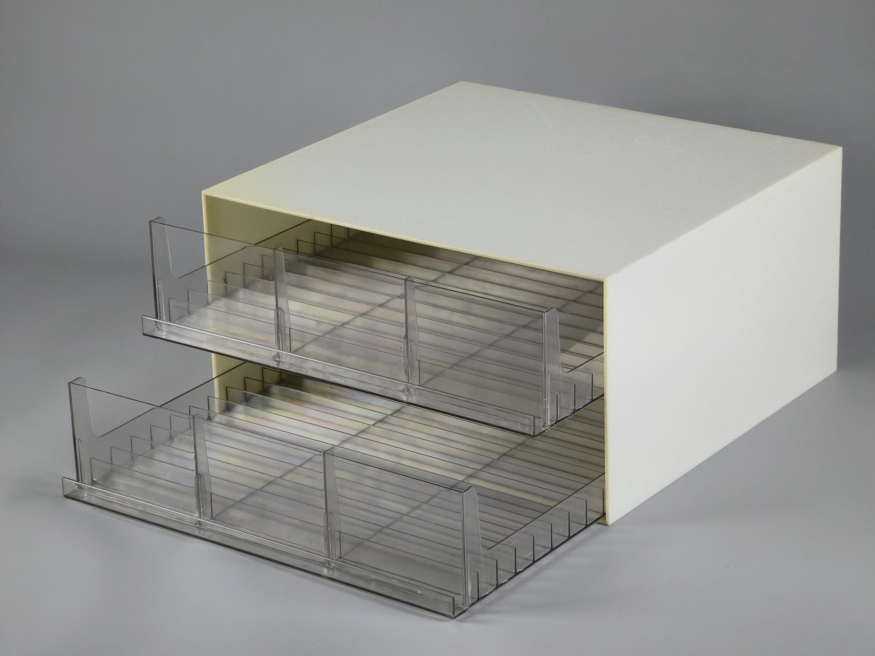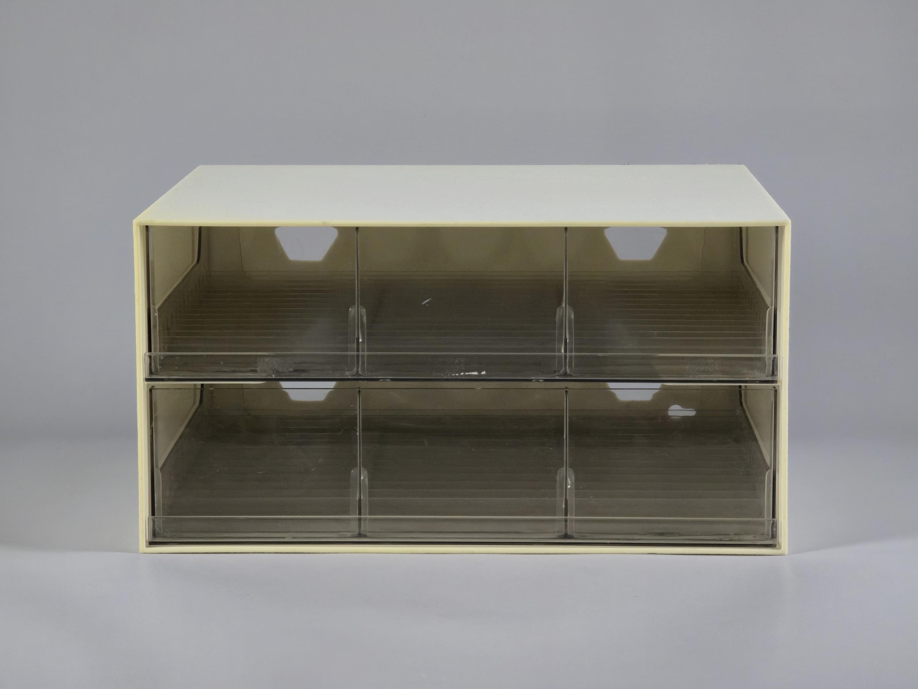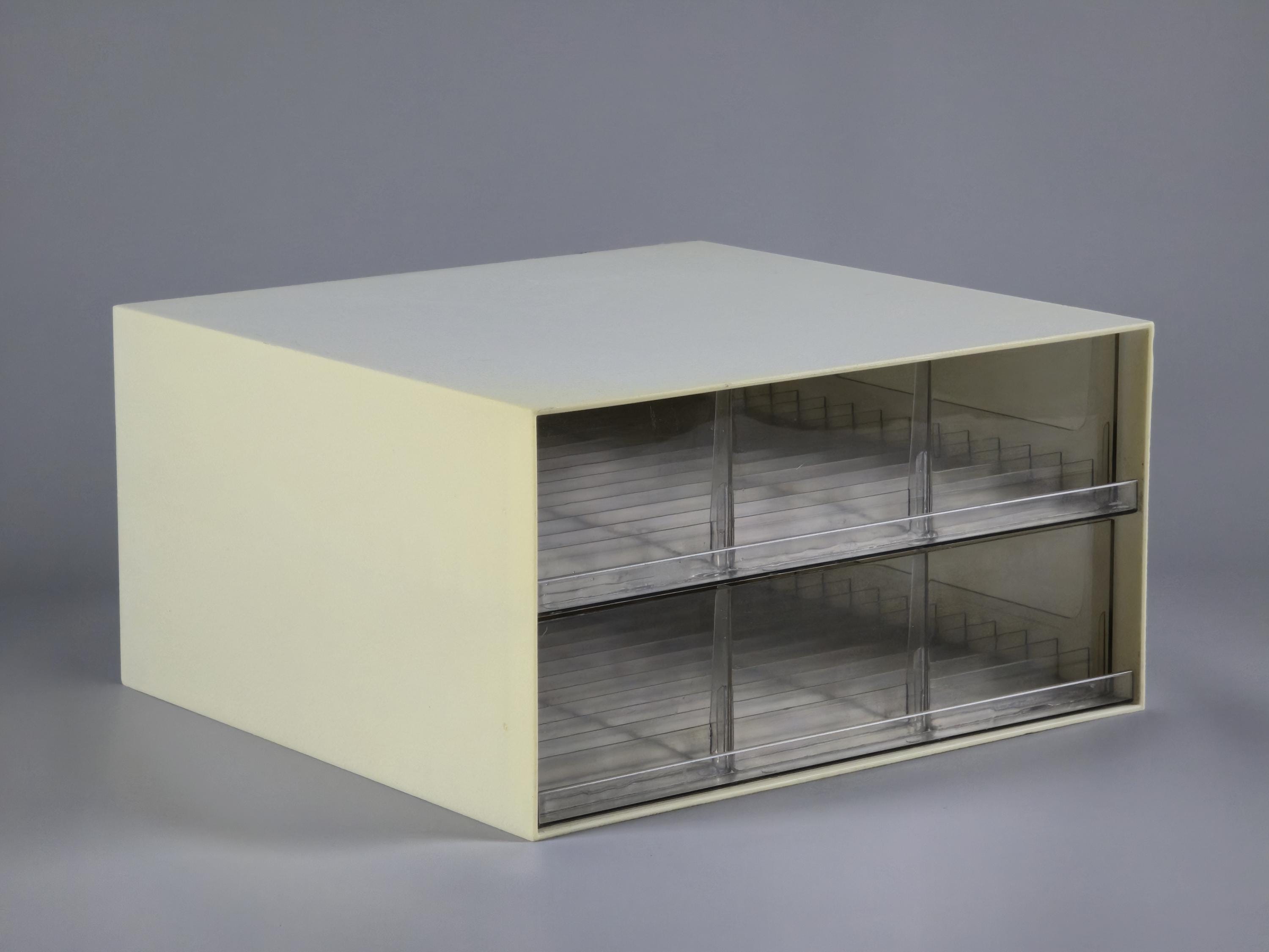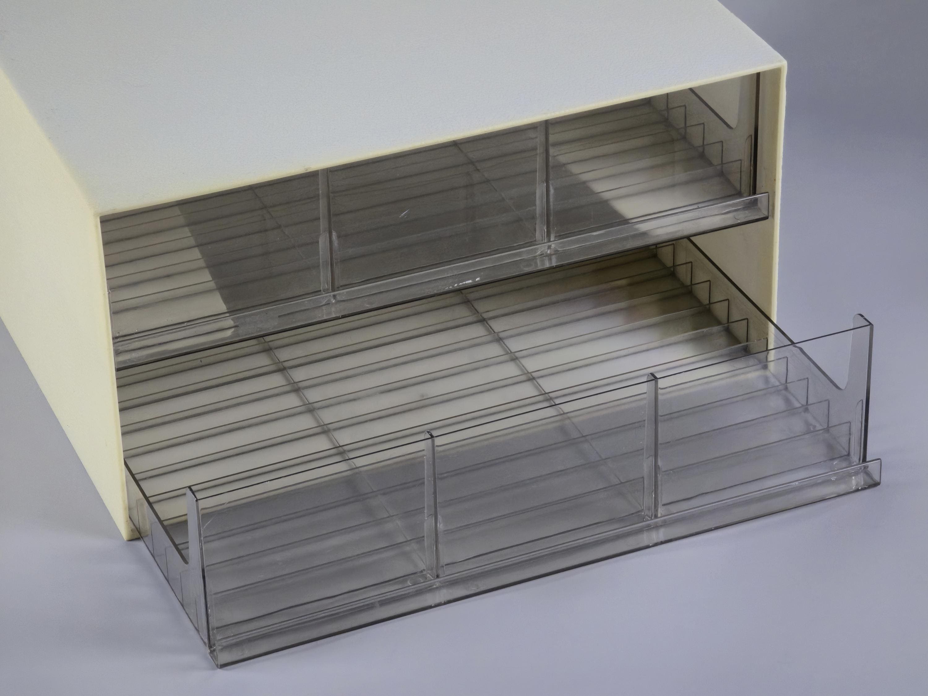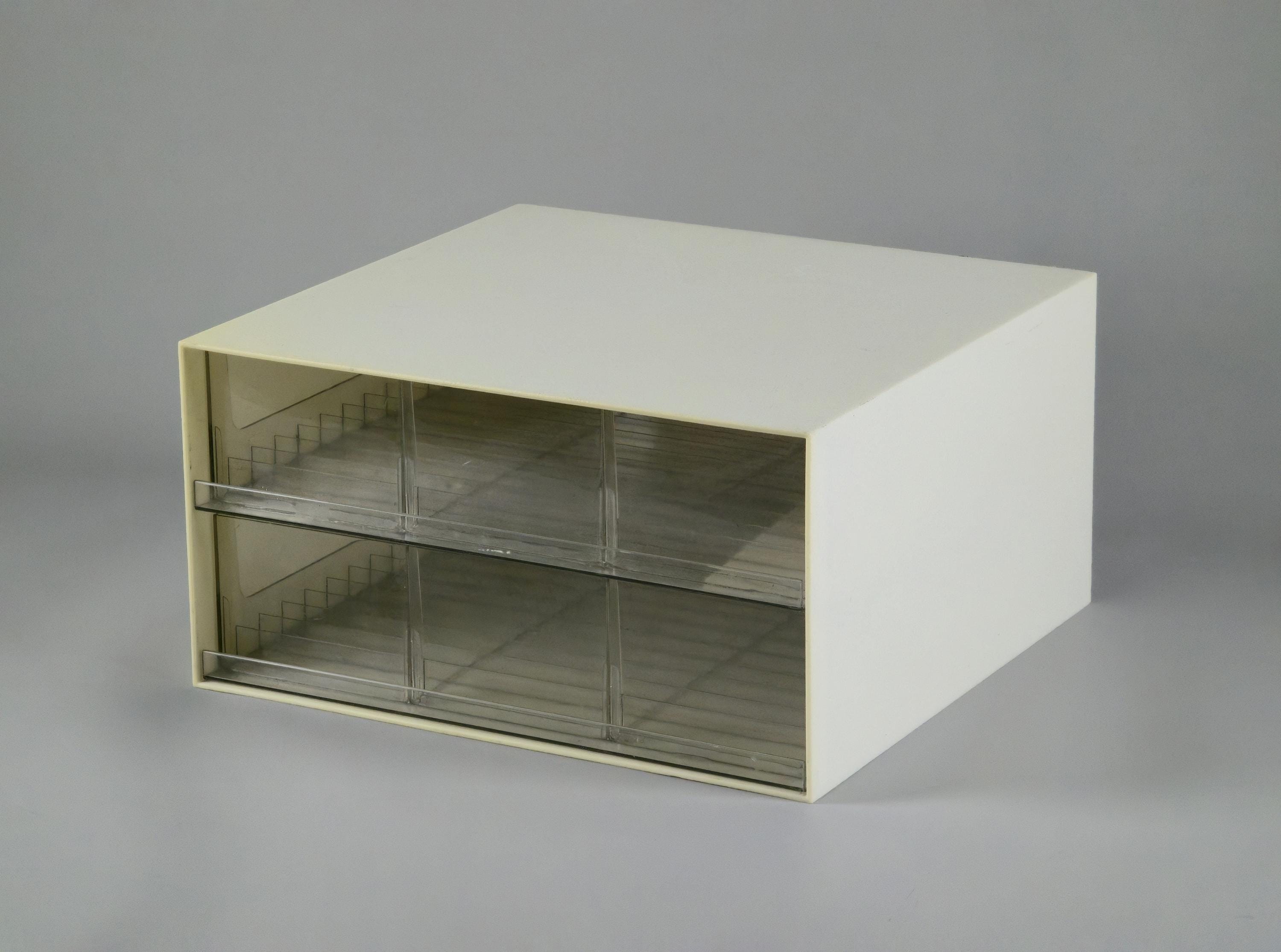 Vintage 1970s cassettes storage box with tinted plastic drawers.