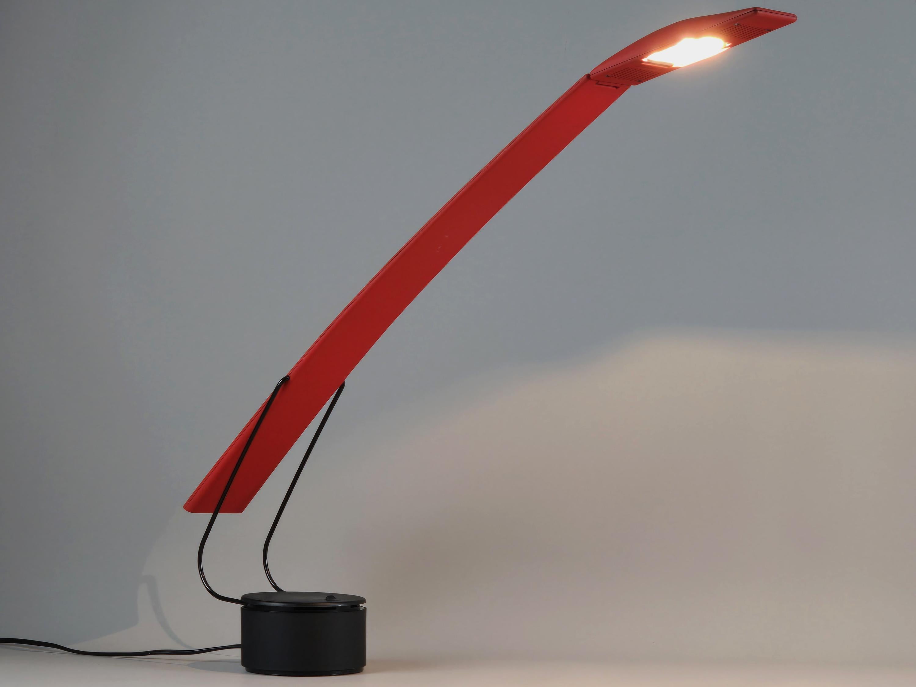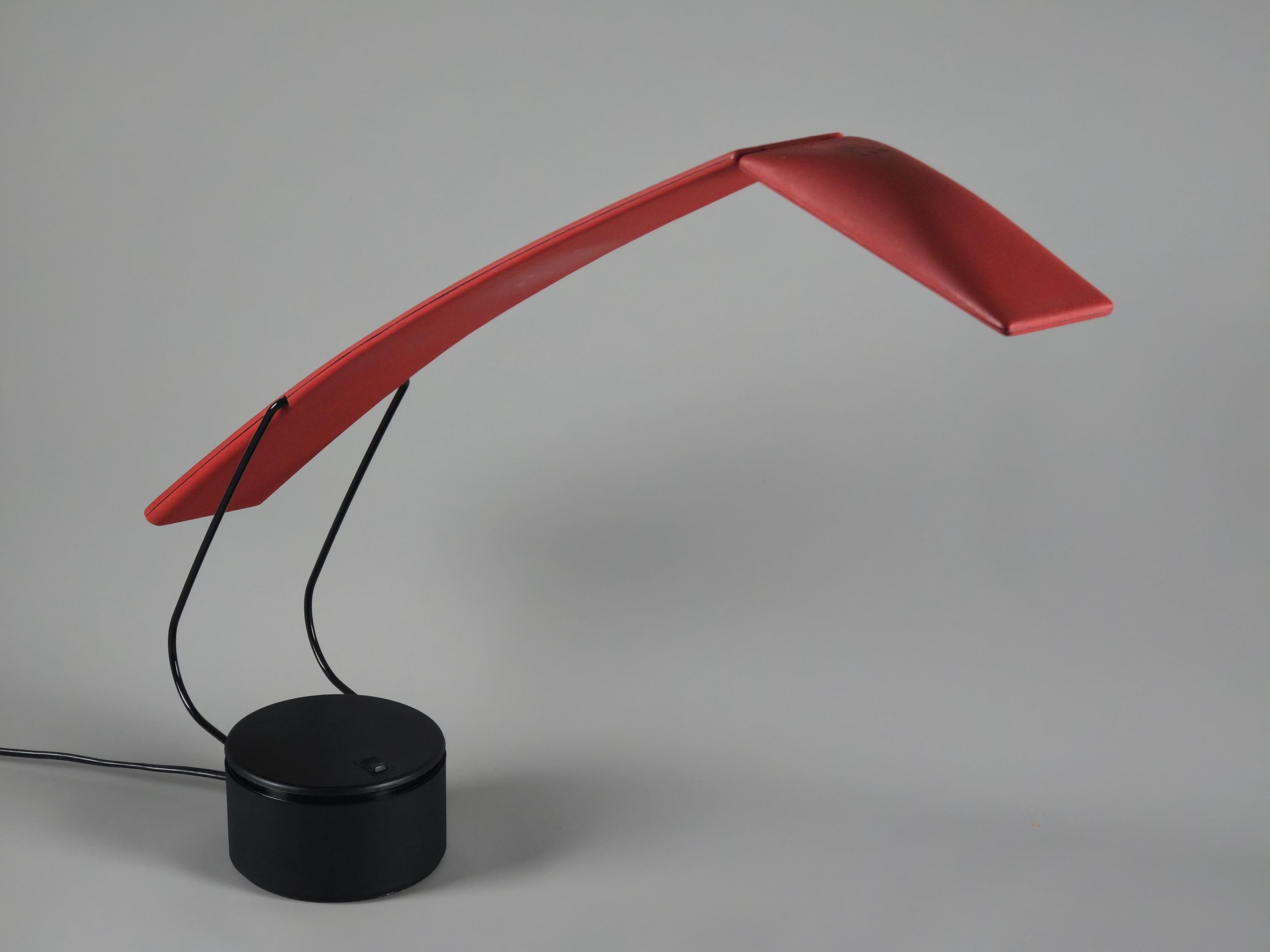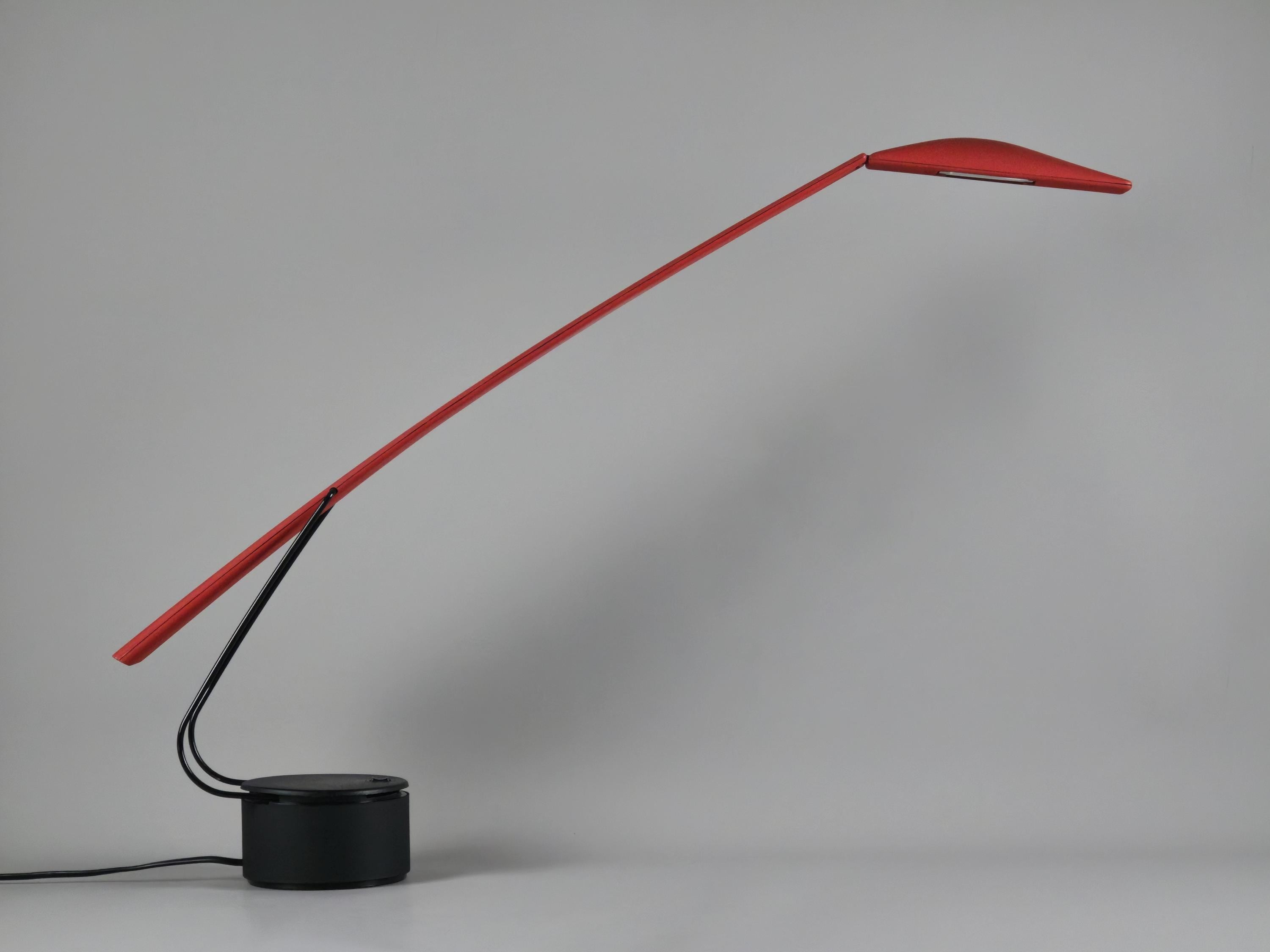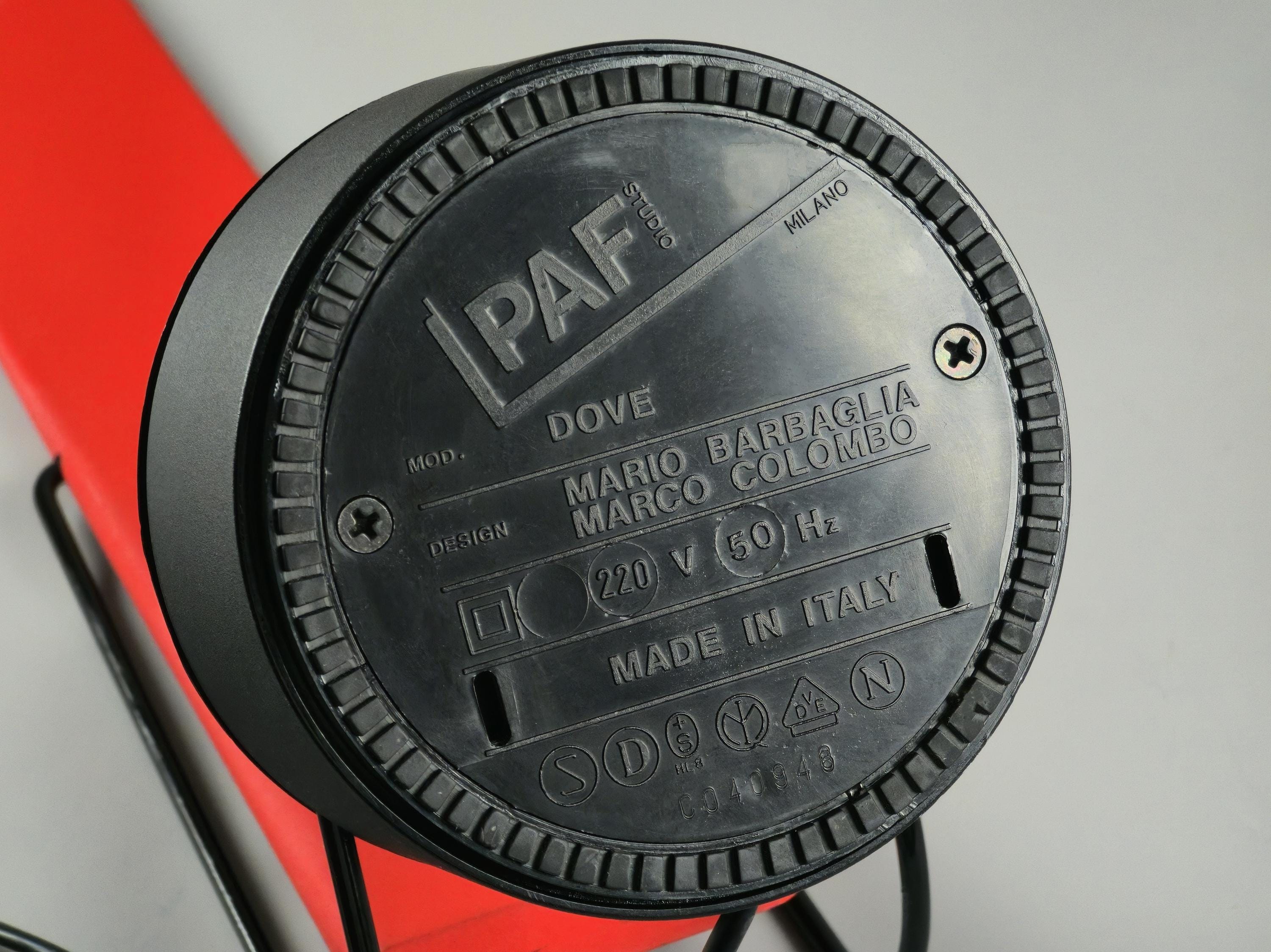 Iconic 'Dove' desk lamp by Mario Barbaglia & Marco Colombo For PAF Studio, Milano. The lamp features a black cylindrical base that houses the electrics and provides stability. A thin, black metal support rises from the base and connects to the long, adjustable arm, which is the lamp's most striking feature. The light source is housed in a flat, aerodynamic, or "beak-like" head at the end of the red arm, giving the lamp its "Dove" name.