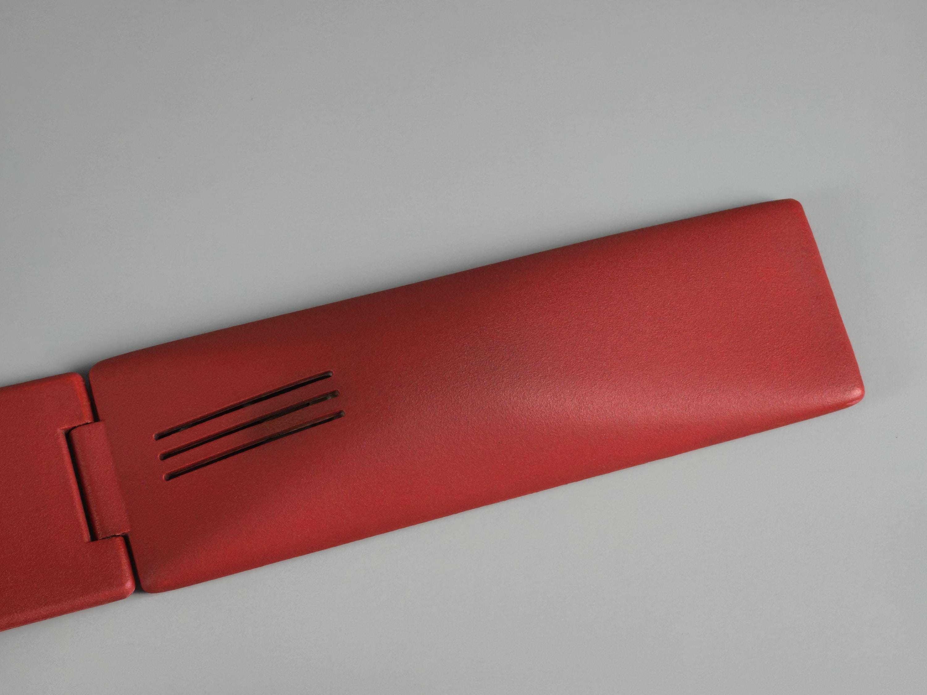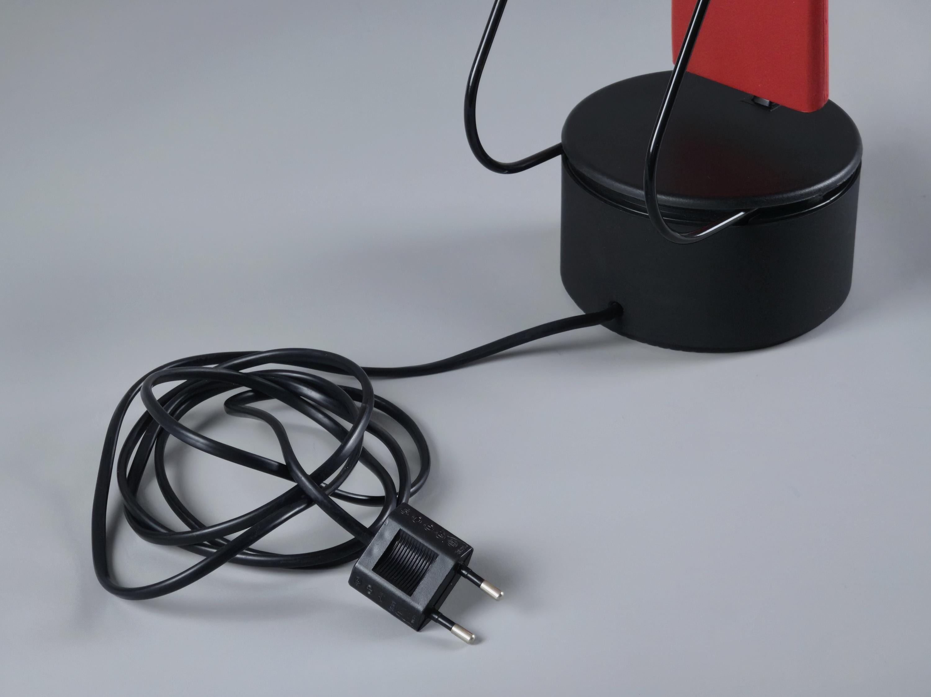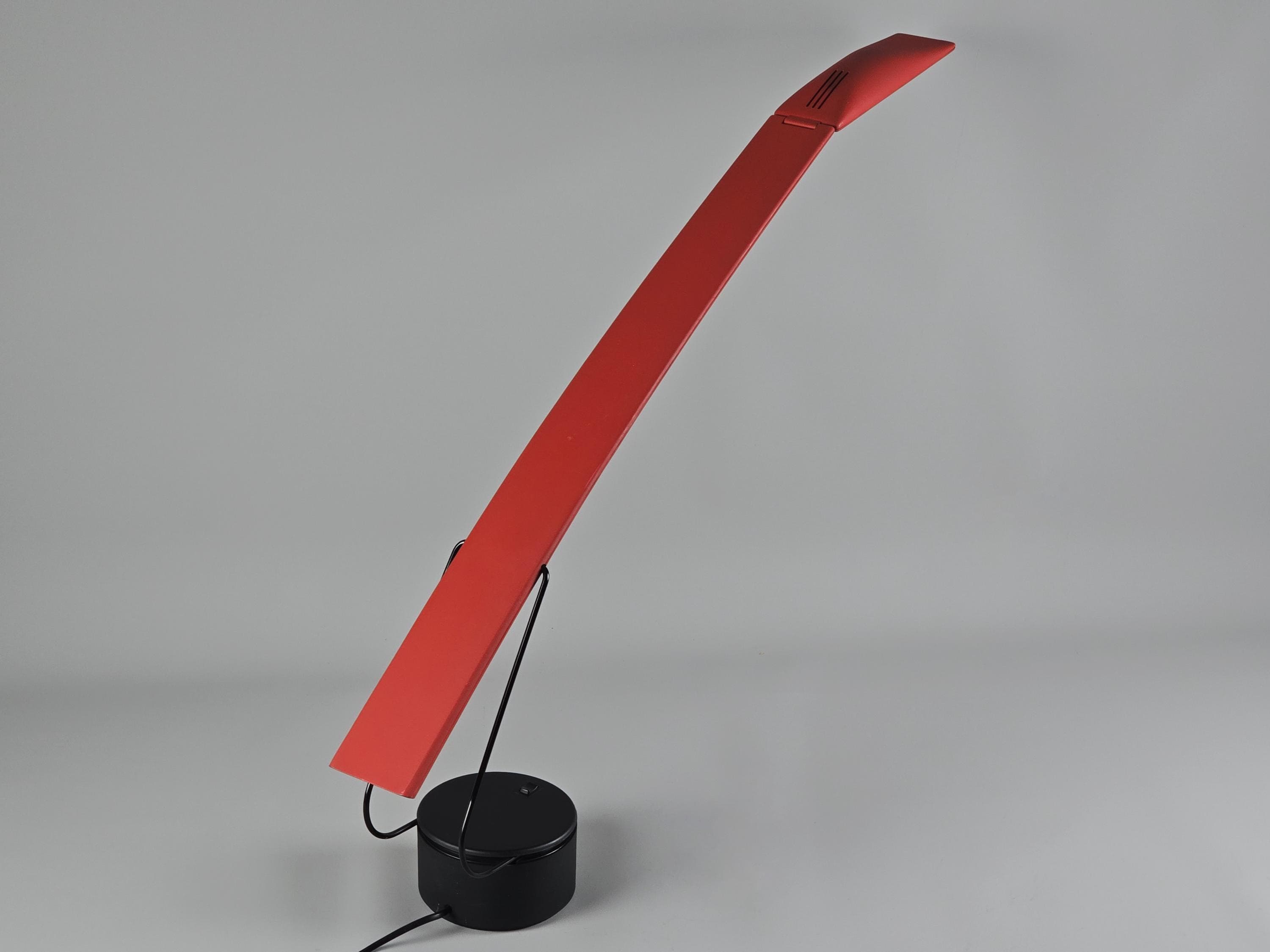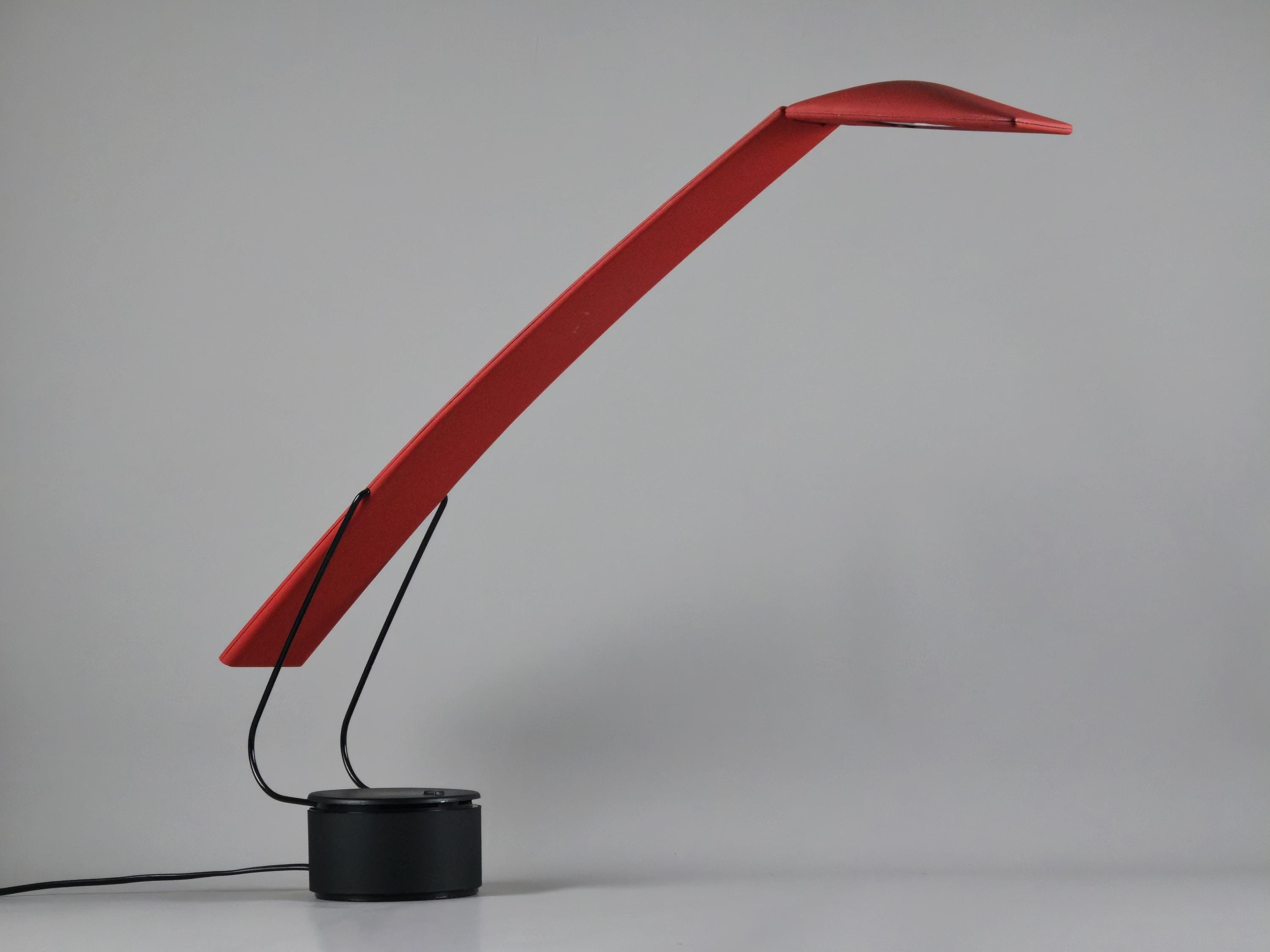 Iconic 'Dove' desk lamp by Mario Barbaglia & Marco Colombo For PAF Studio, Milano. The lamp features a black cylindrical base that houses the electrics and provides stability. A thin, black metal support rises from the base and connects to the long, adjustable arm, which is the lamp's most striking feature. The light source is housed in a flat, aerodynamic, or "beak-like" head at the end of the red arm, giving the lamp its "Dove" name.