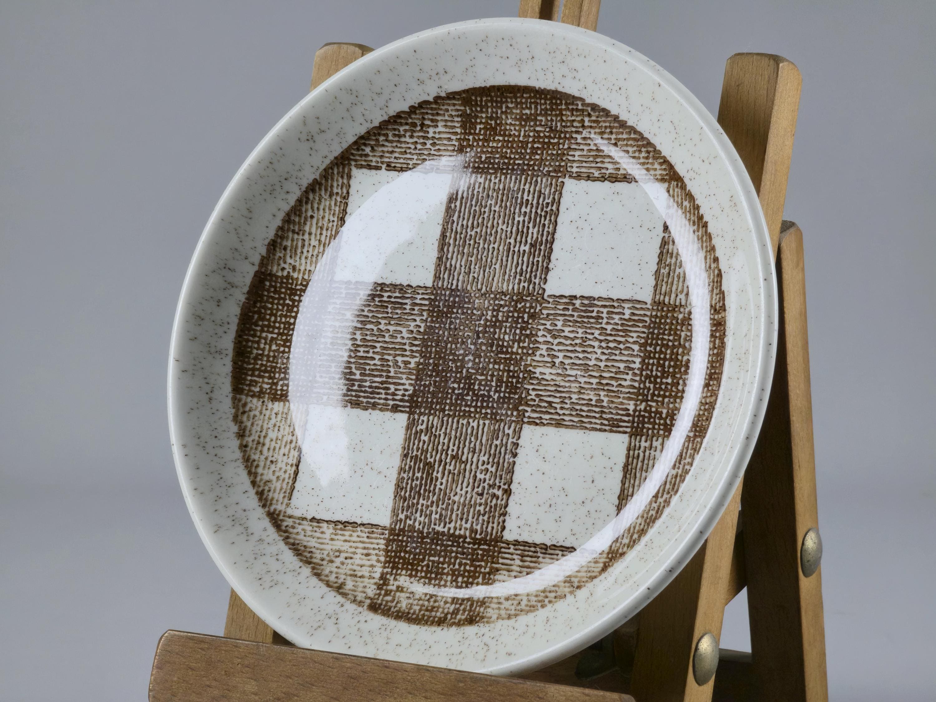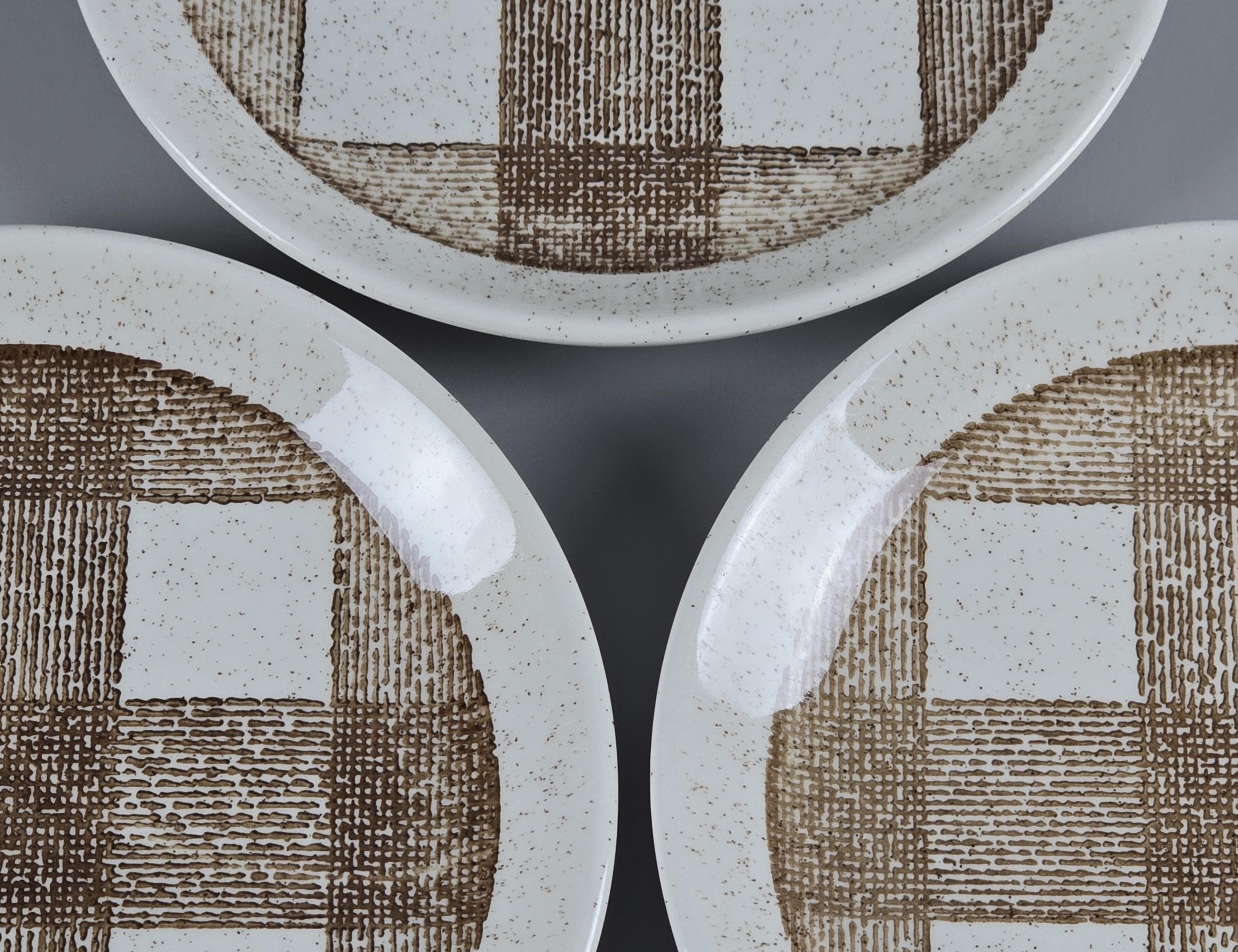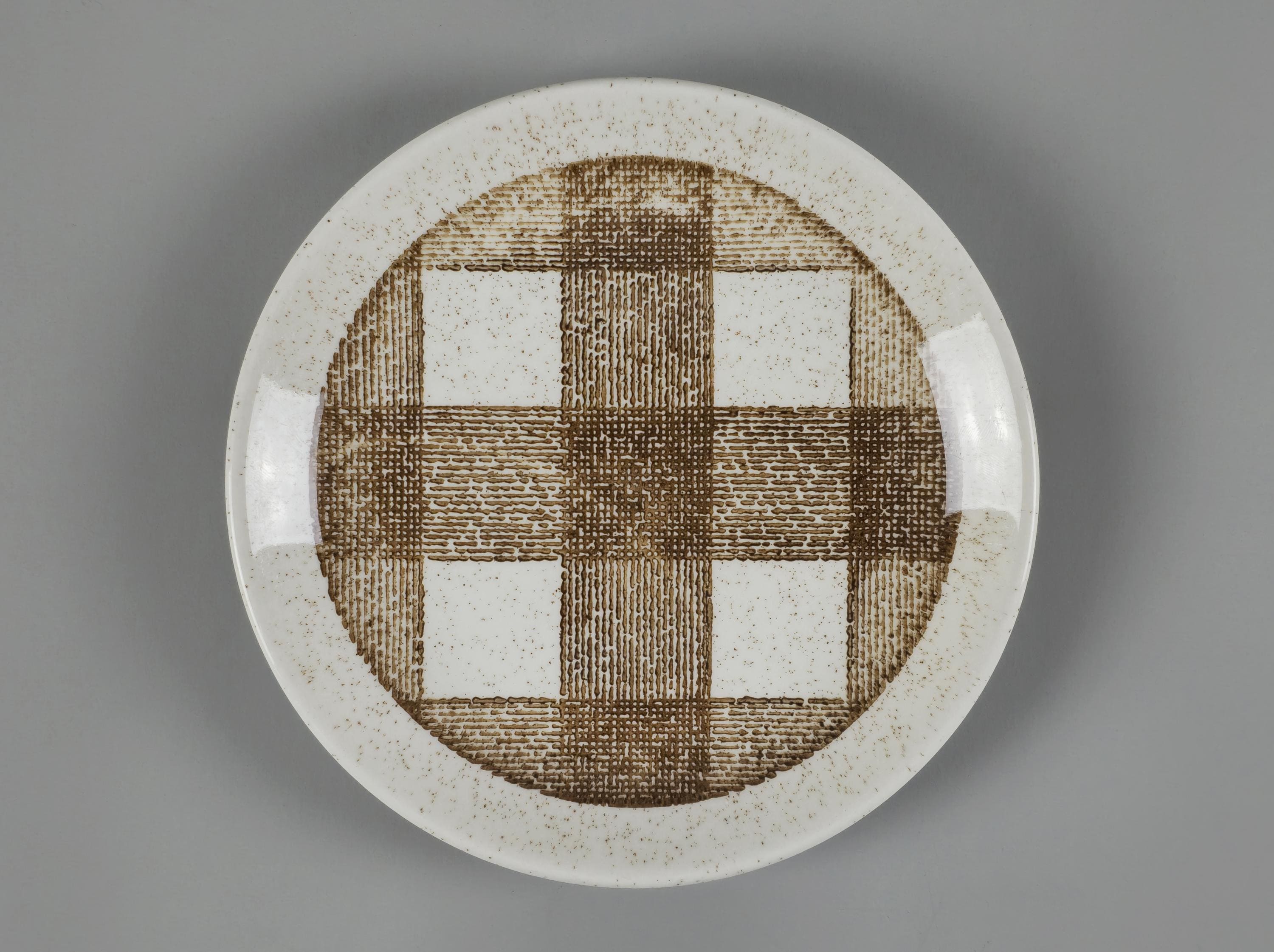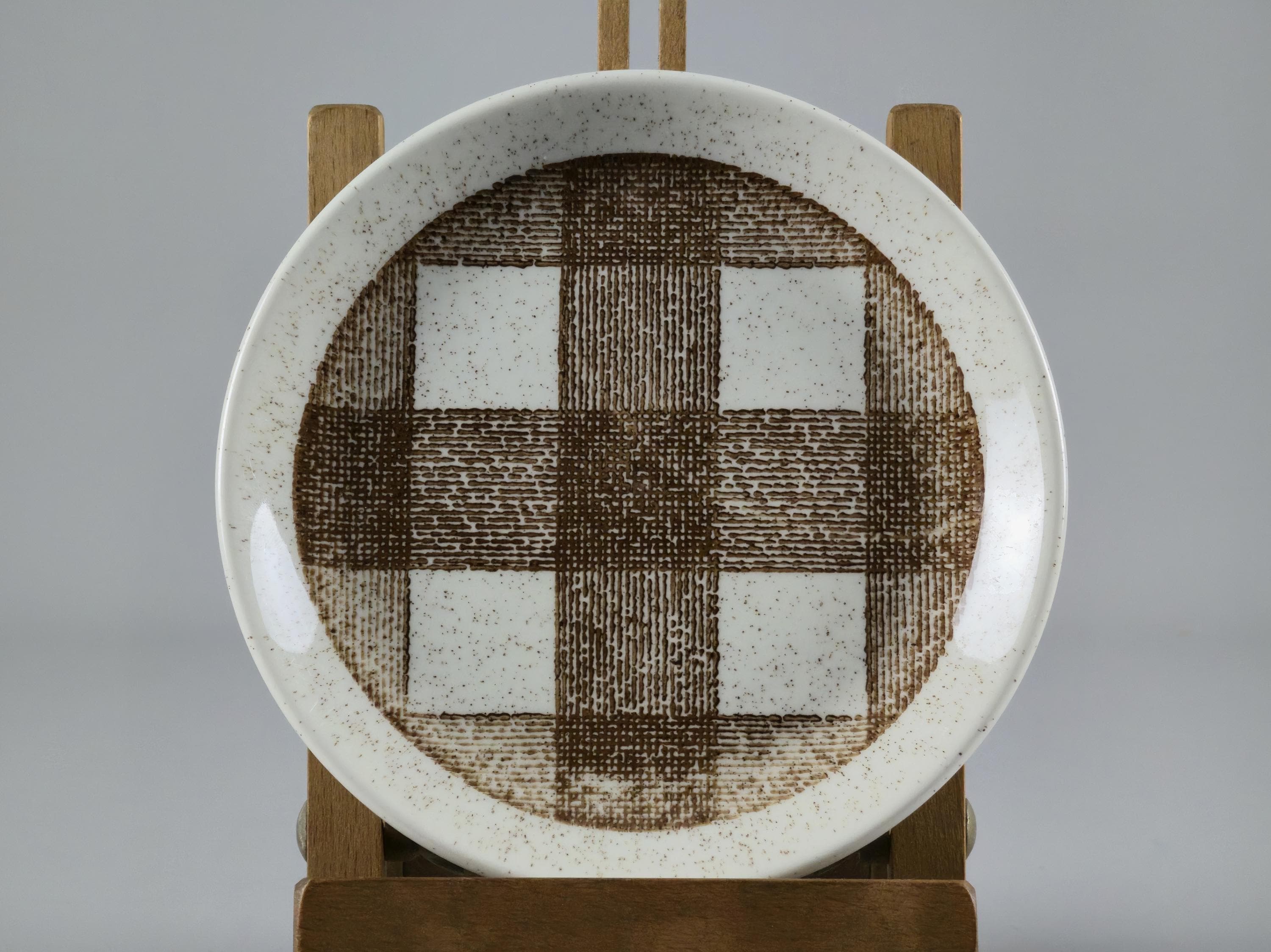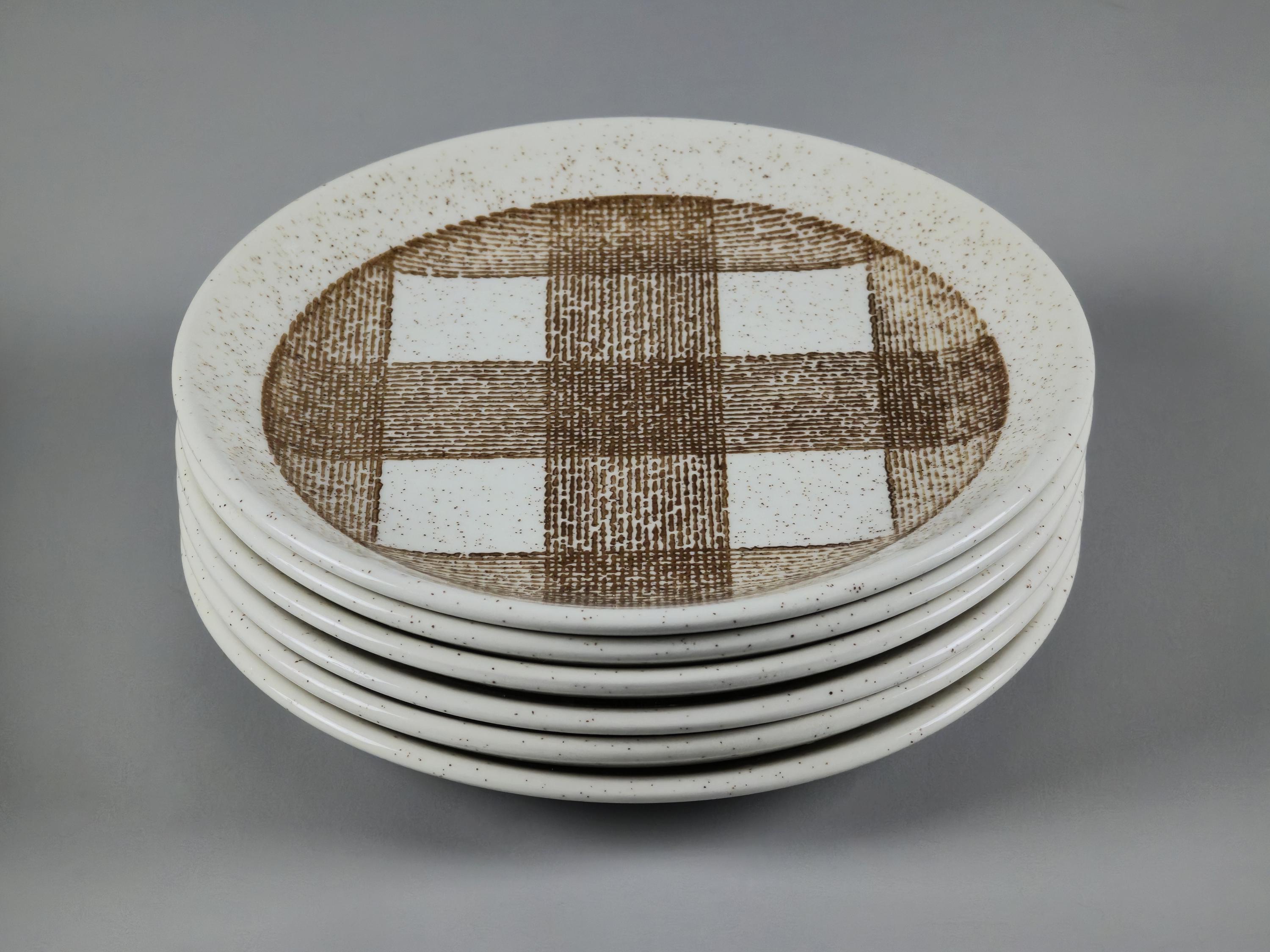 Classic set of six 1970s British stoneware plates from Biltons, made in Staffordshire, England. The design features a tartan plaid pattern, also known as the 'Celtic Rose' on cream speckled salt & pepper background.