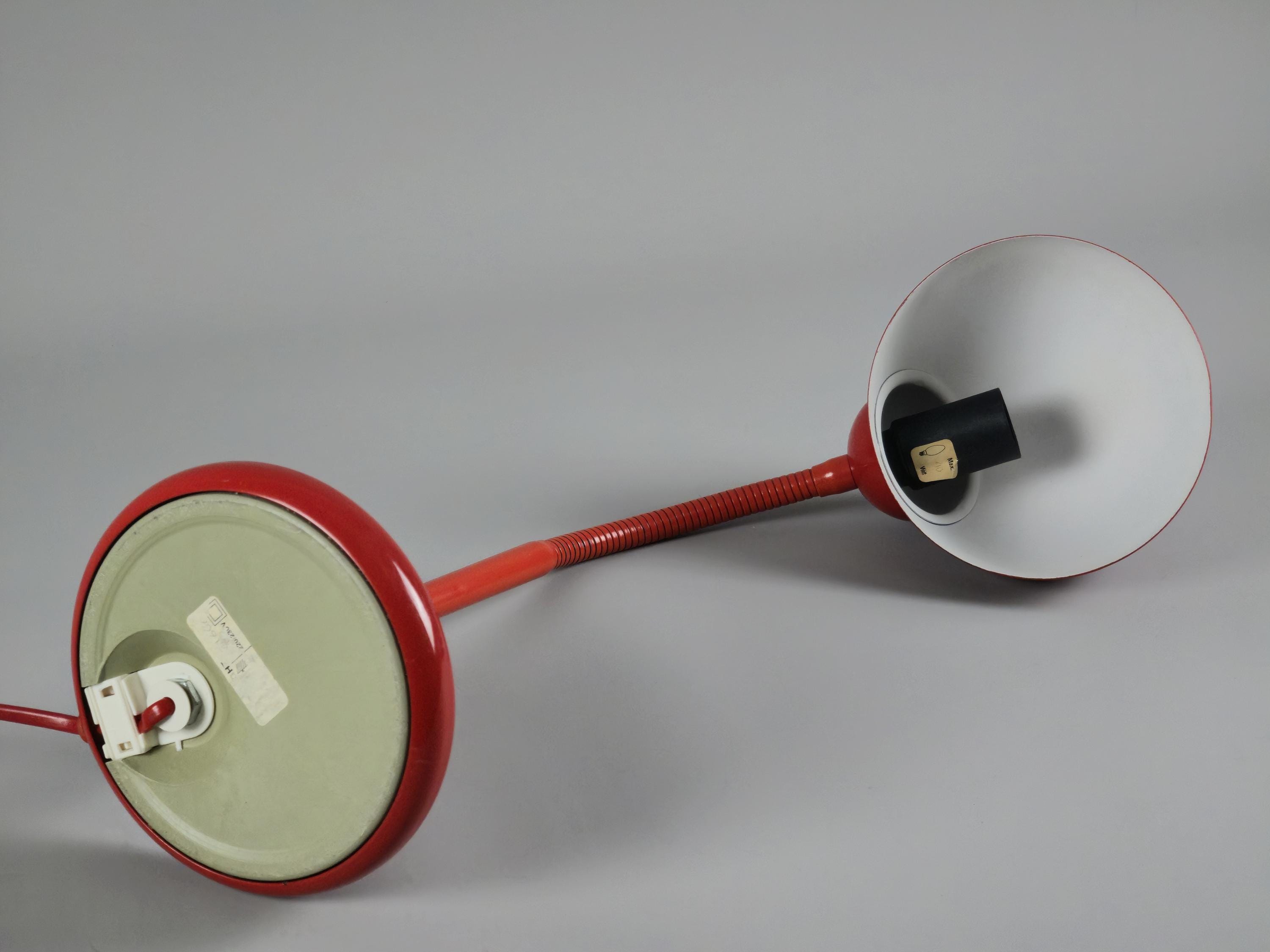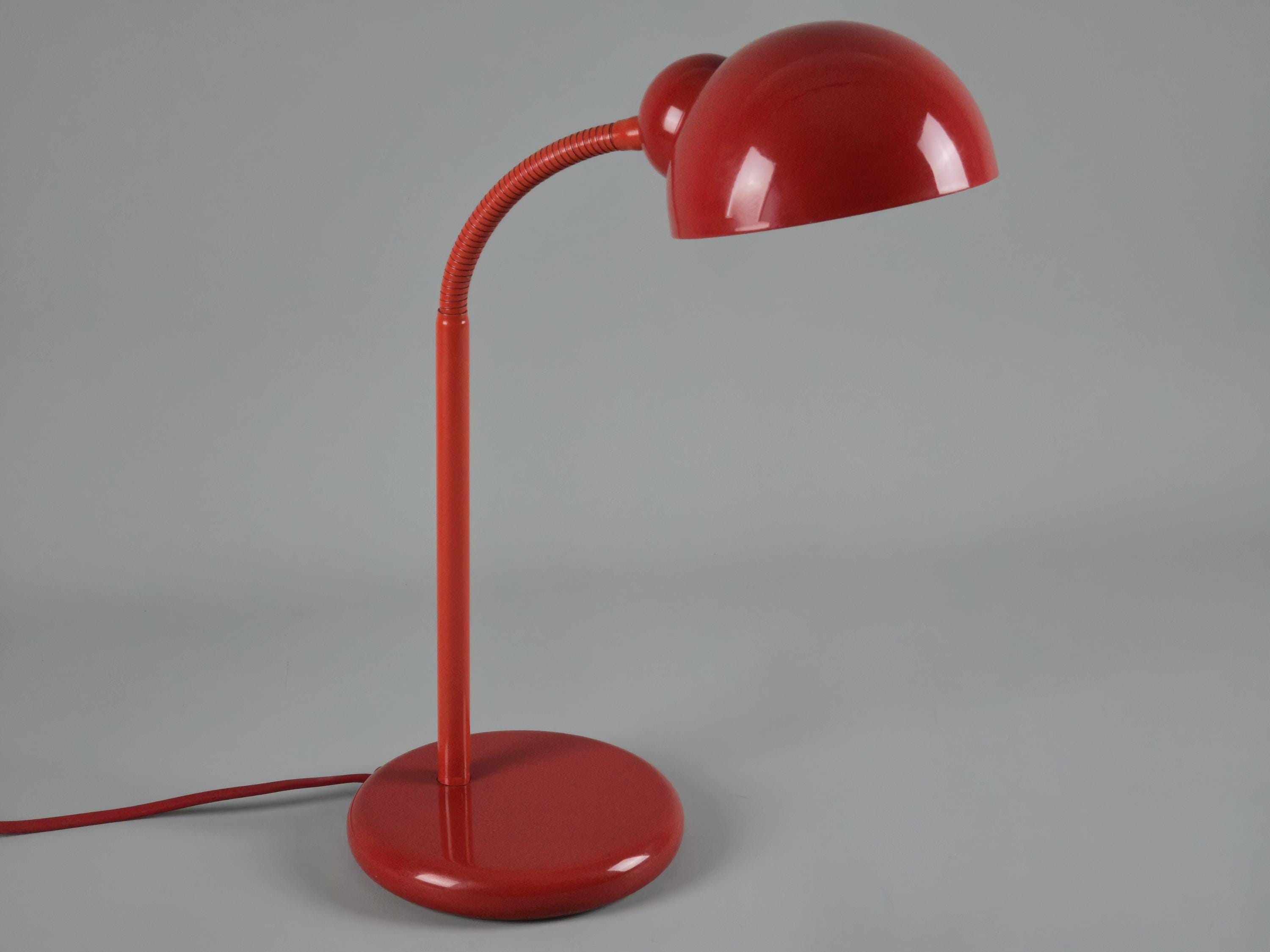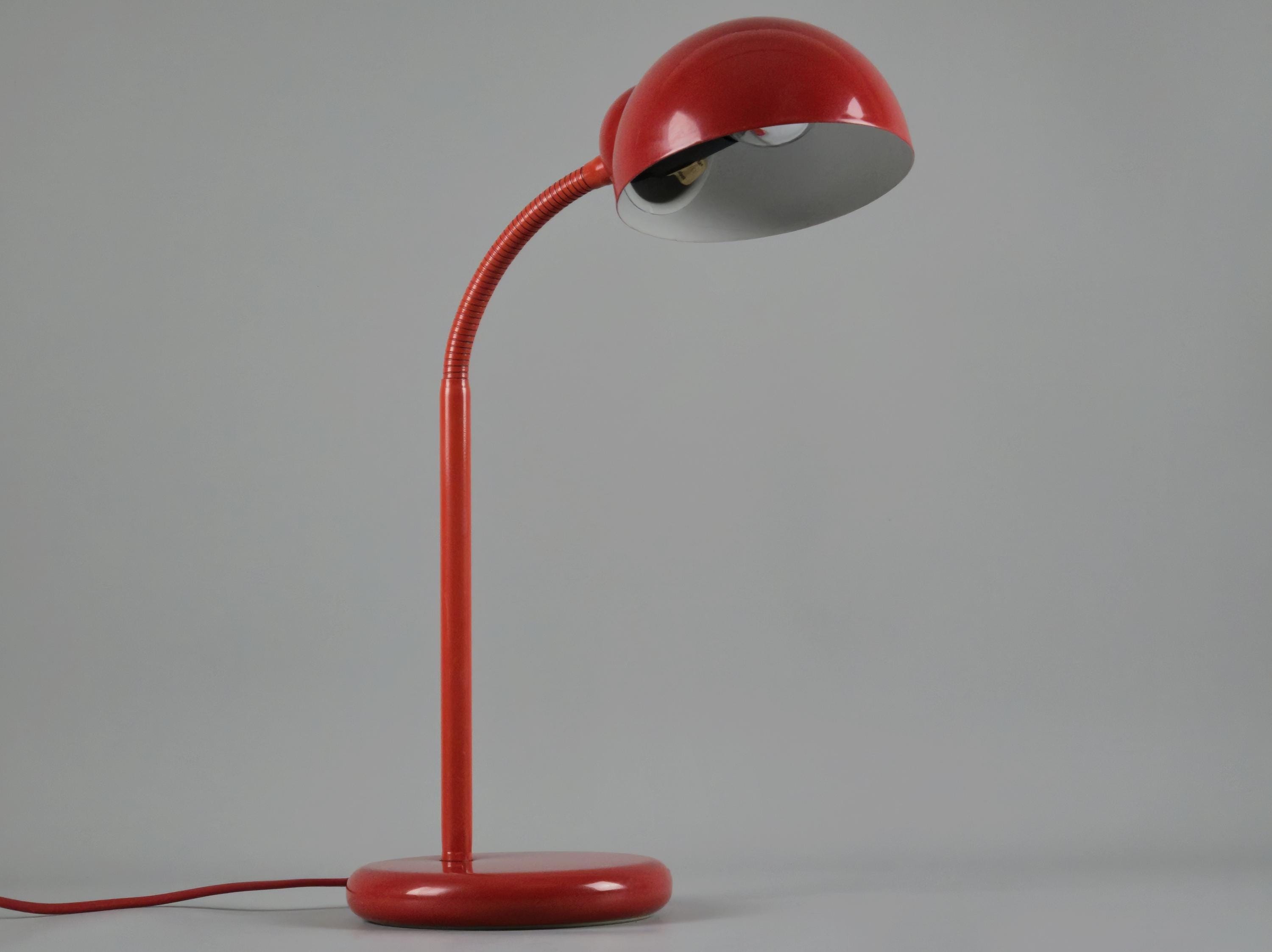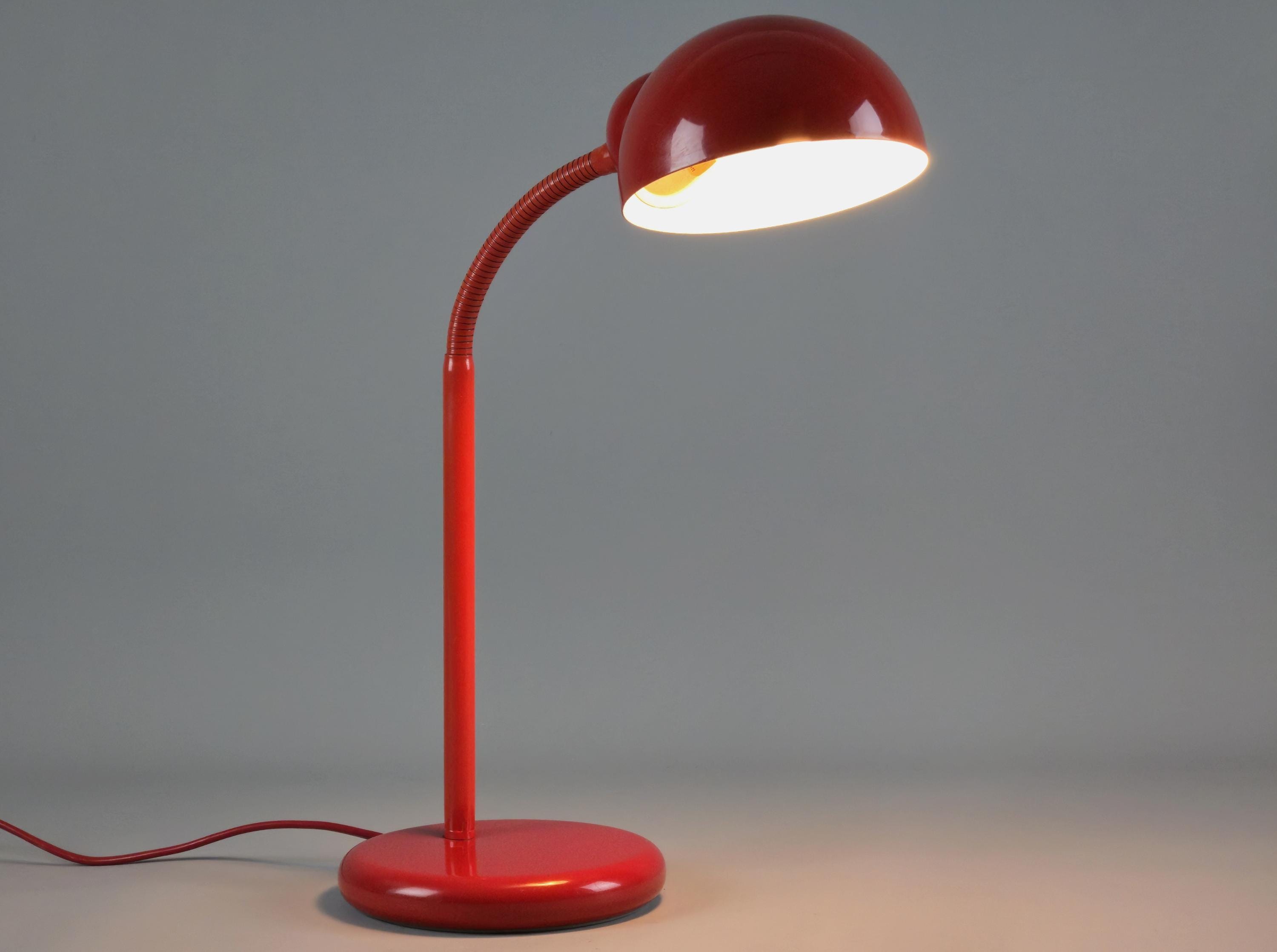 Vintage 1980s postmodern industrial style red lacquered utilitarian gooseneck desk lamp by Happylight Holland.