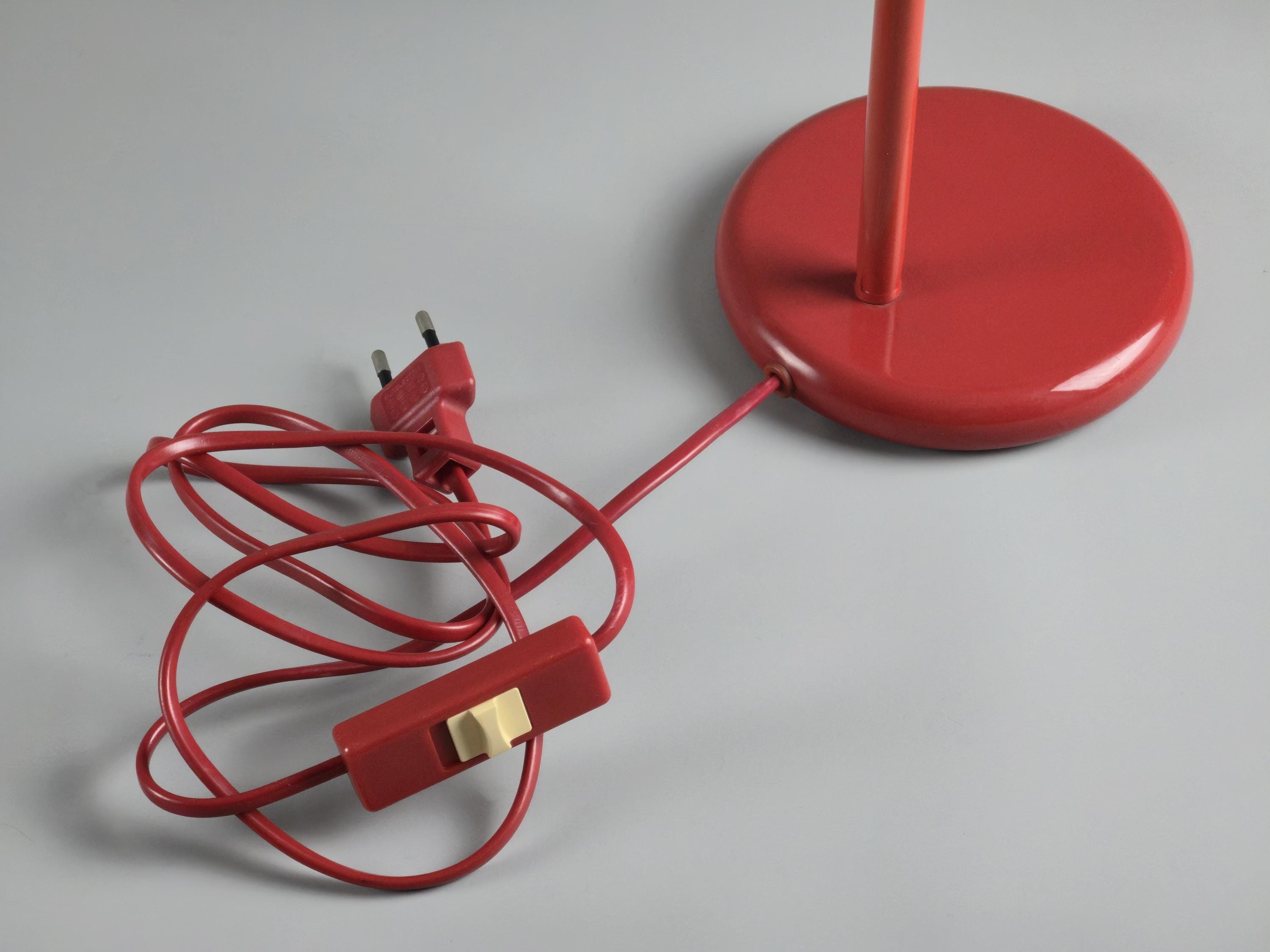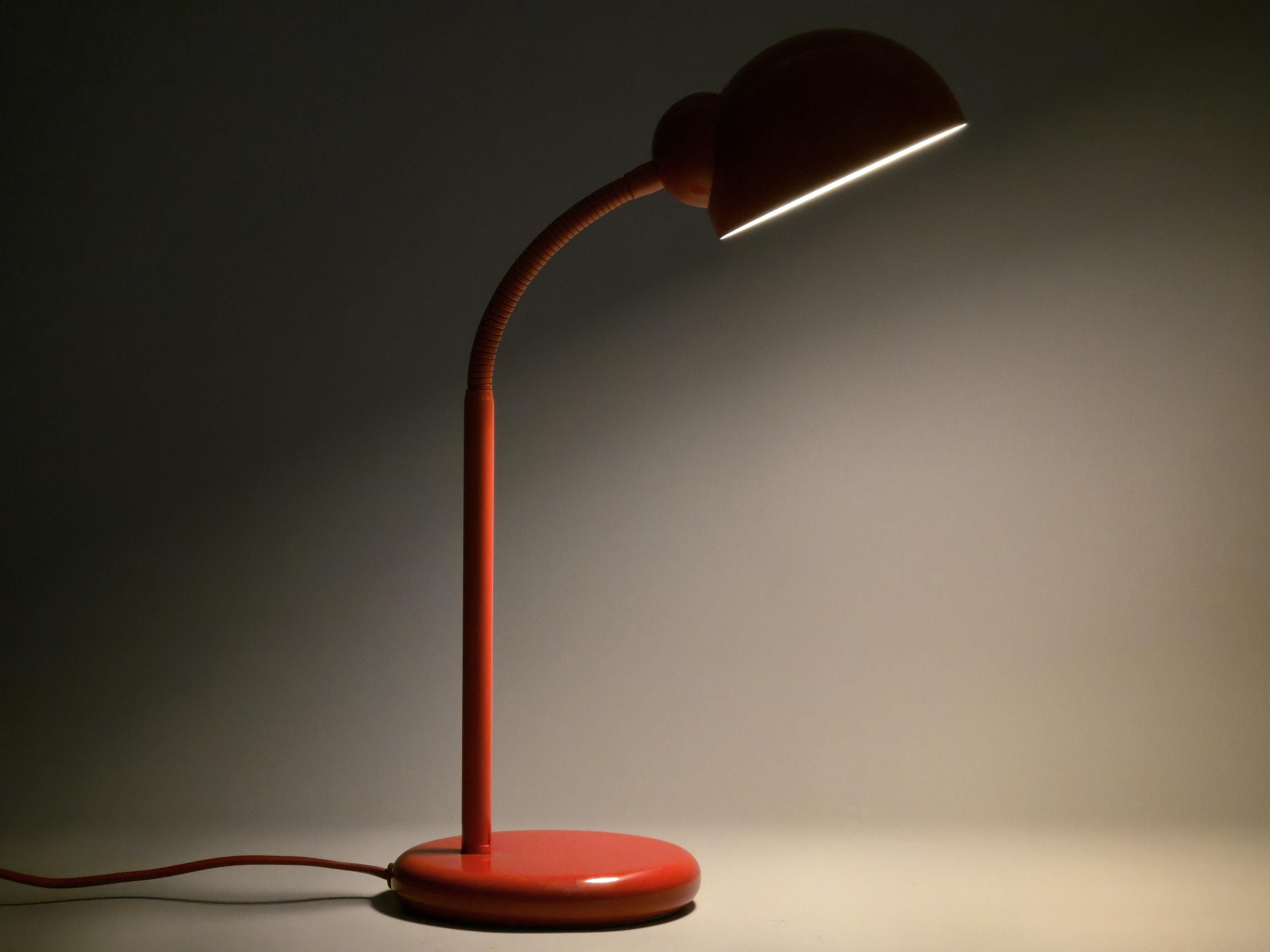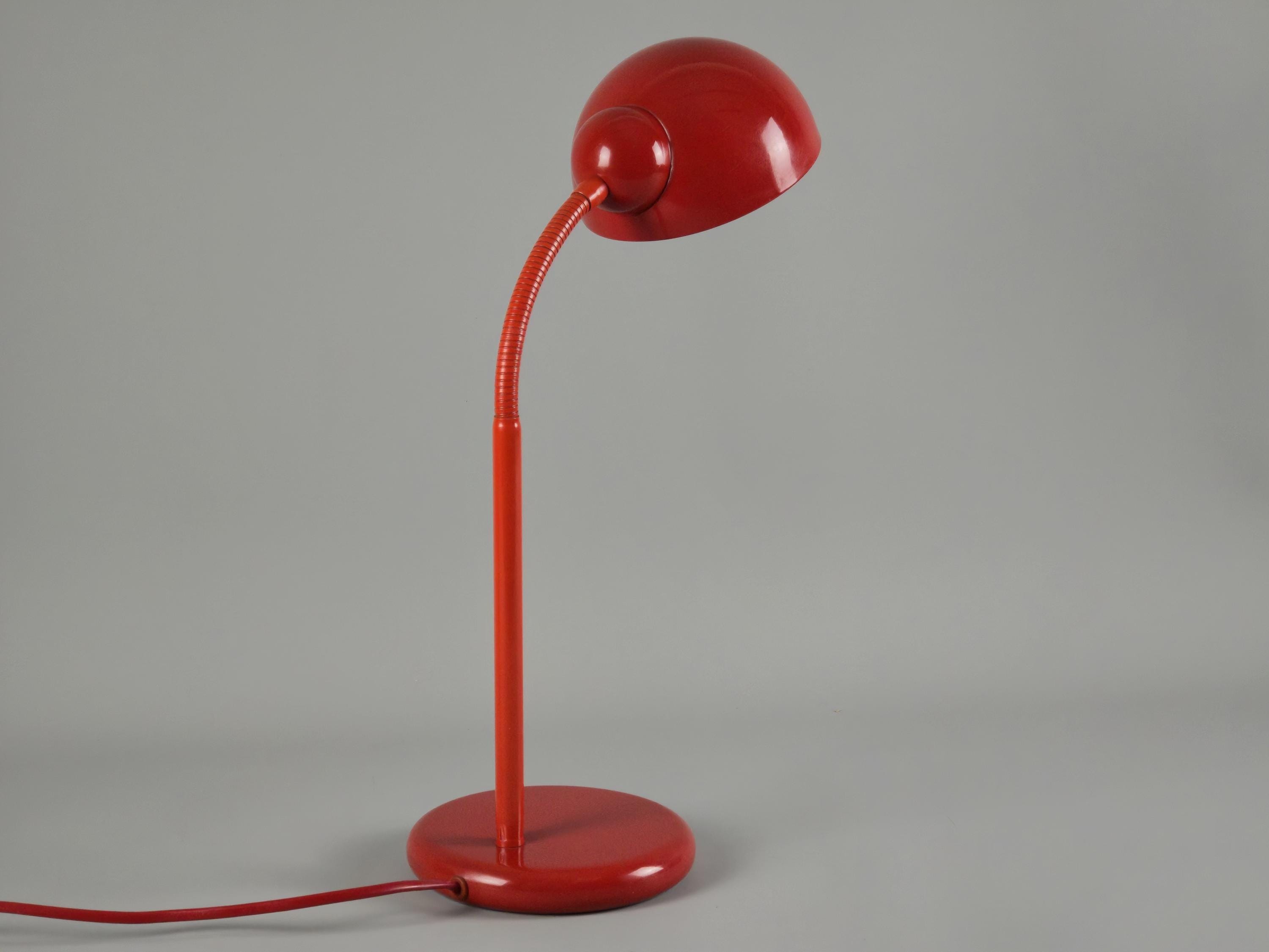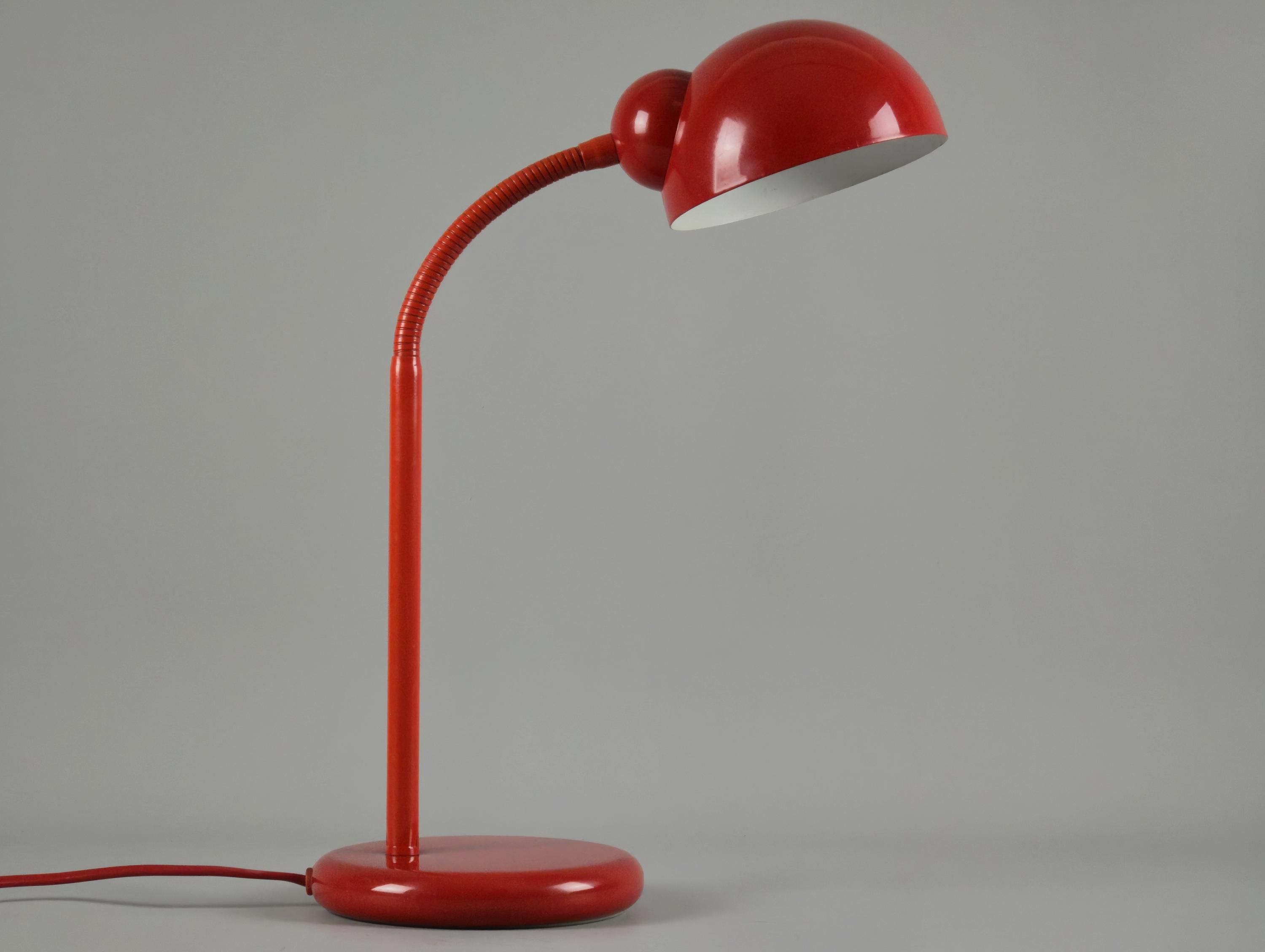 Vintage 1980s postmodern industrial style red lacquered utilitarian gooseneck desk lamp by Happylight Holland.