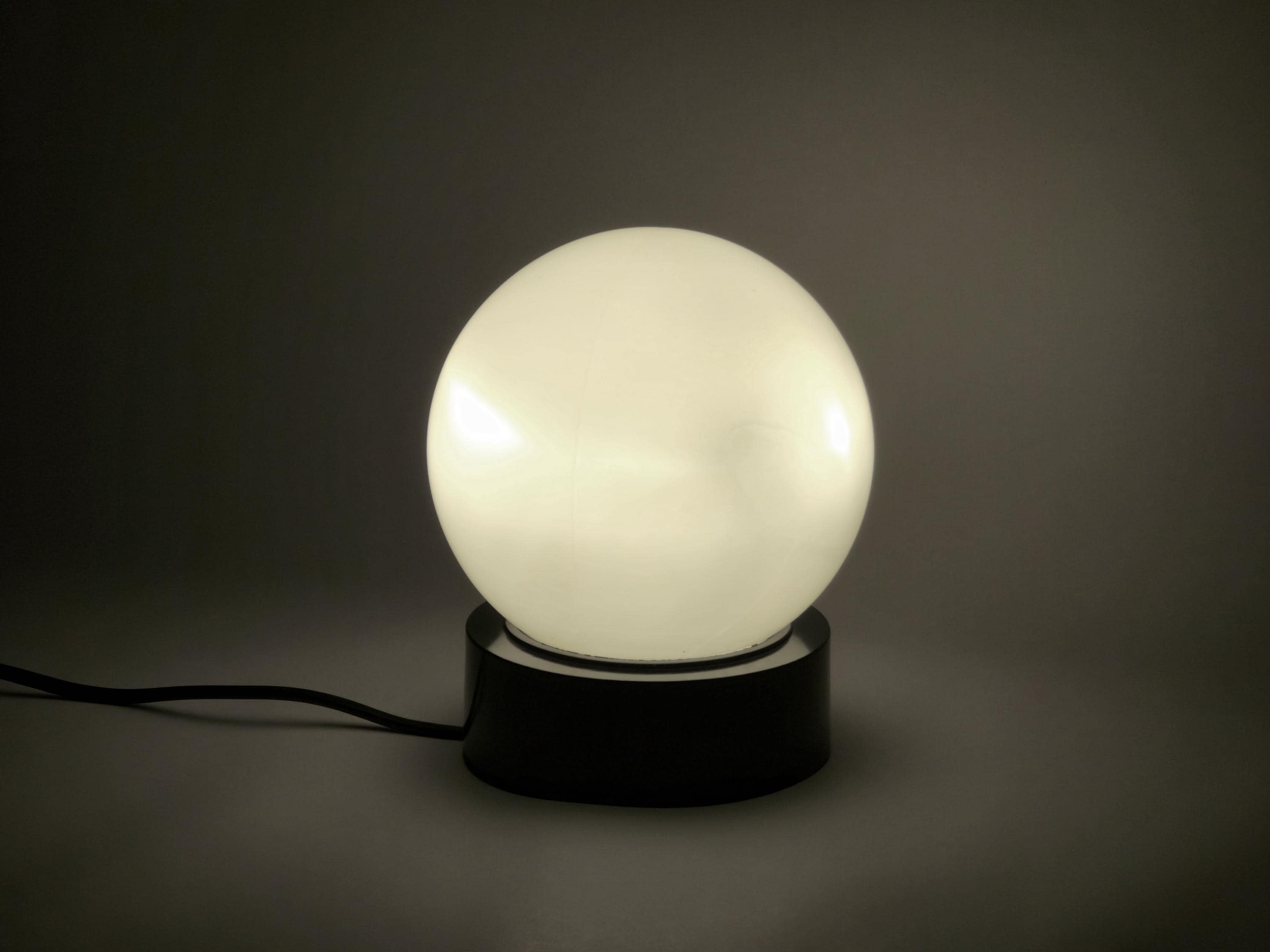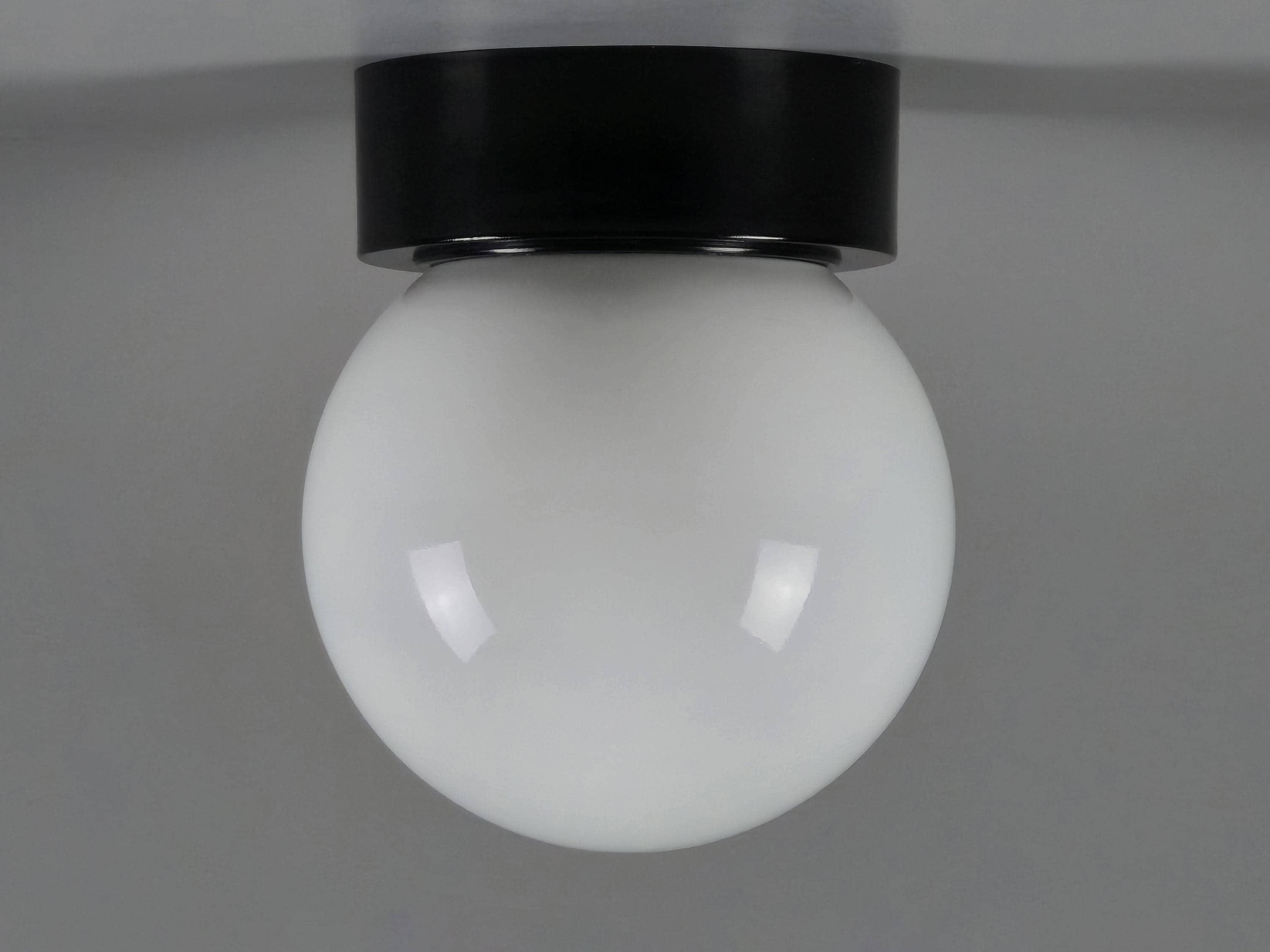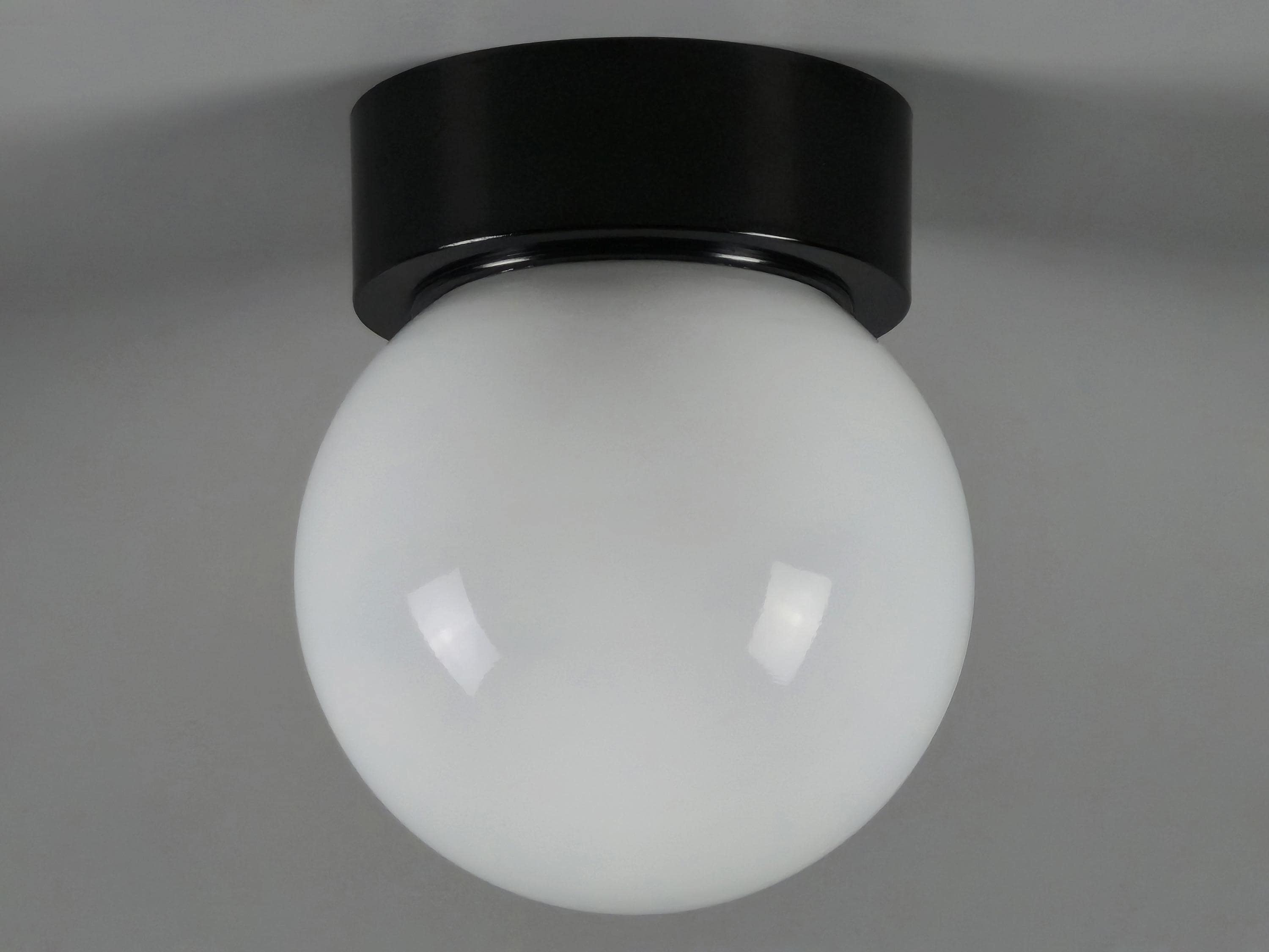 Vintage 1960s ceiling or wall light fixture by Corodex in excellent condition. It can be installed on both ceilings and walls, and comes with a black bakelite base and a white opaline glass ball shade.