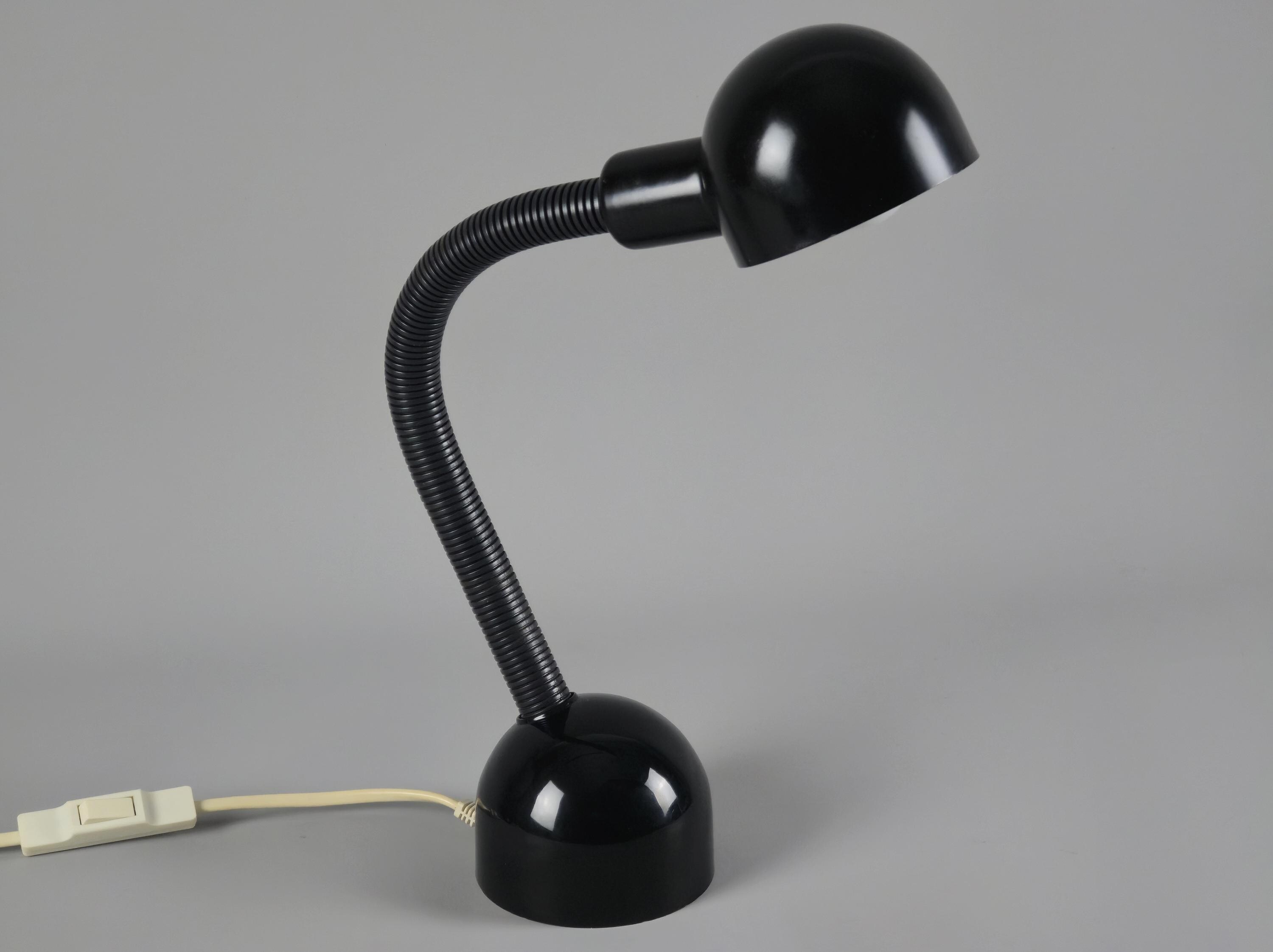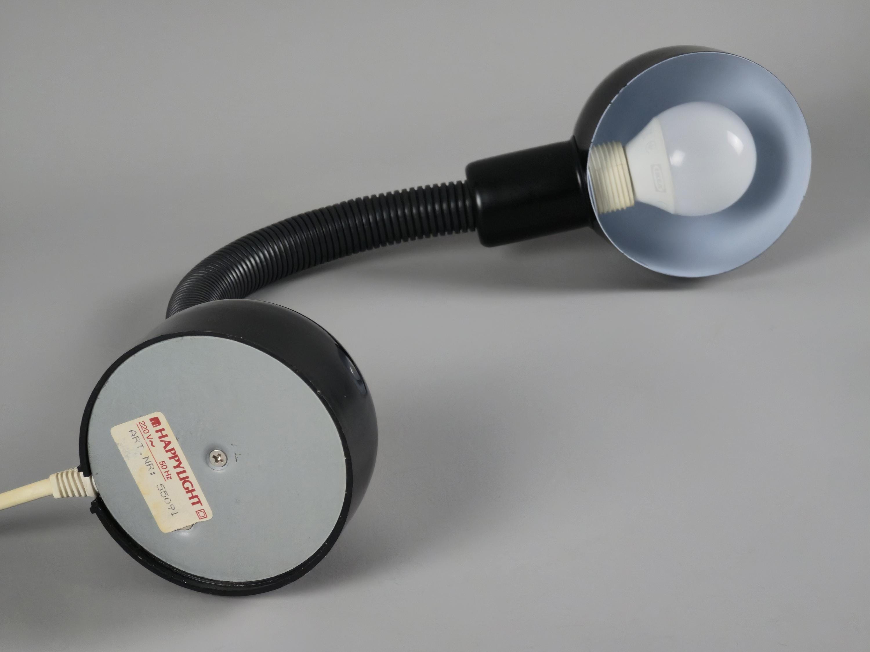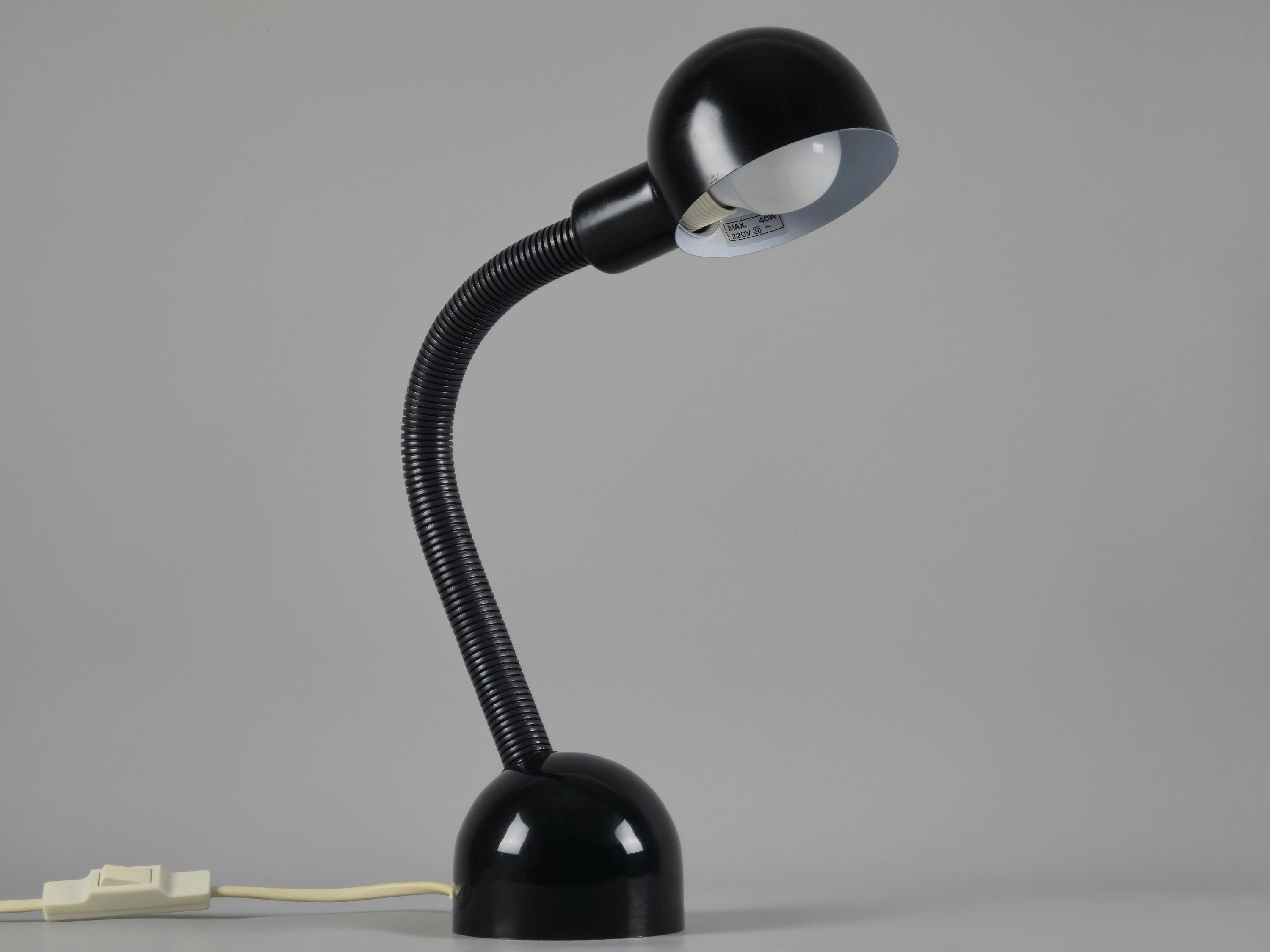 Vintage 1980s postmodern industrial style black lacquered utilitarian gooseneck desk lamp by Happylight Holland.
