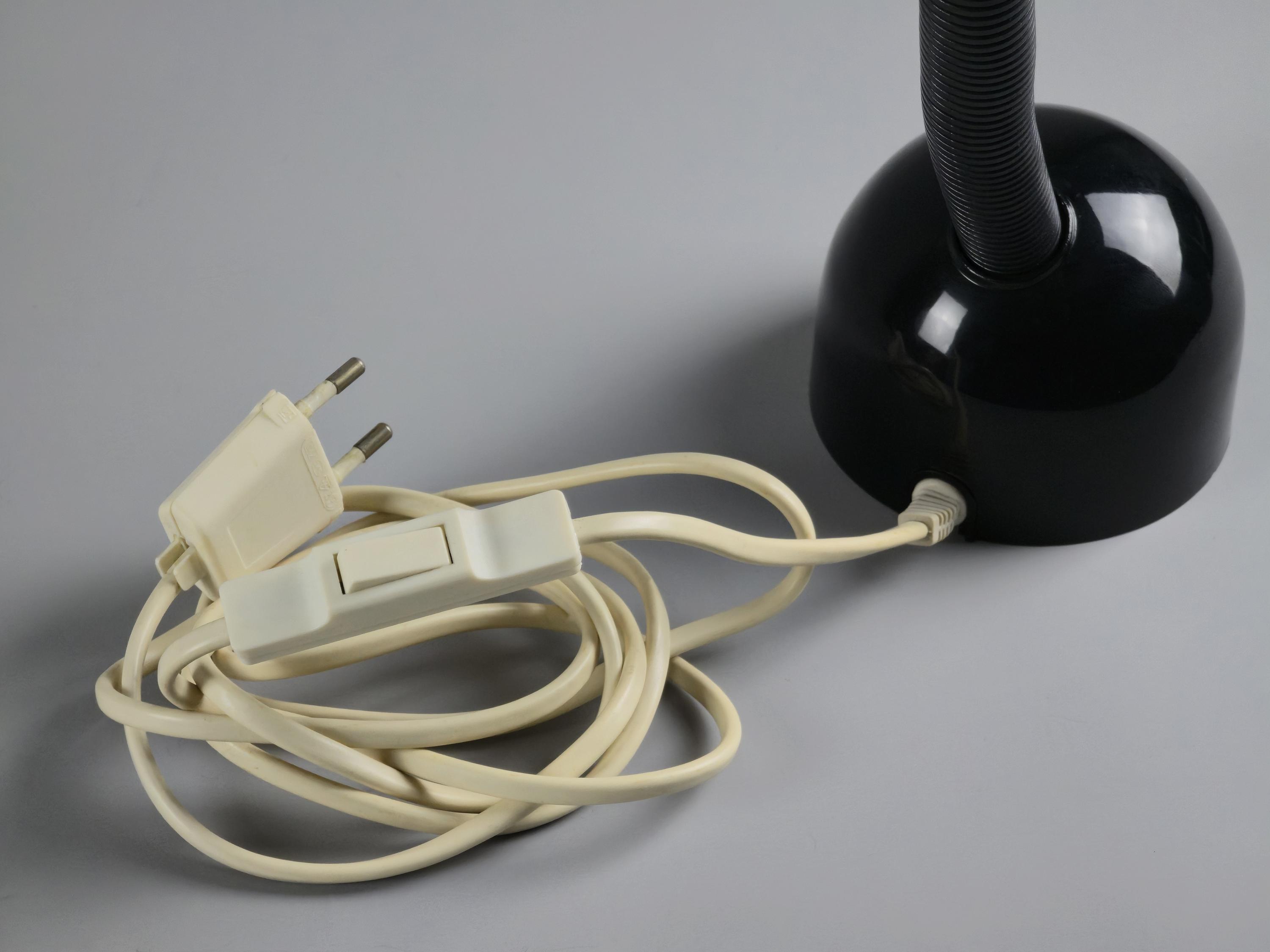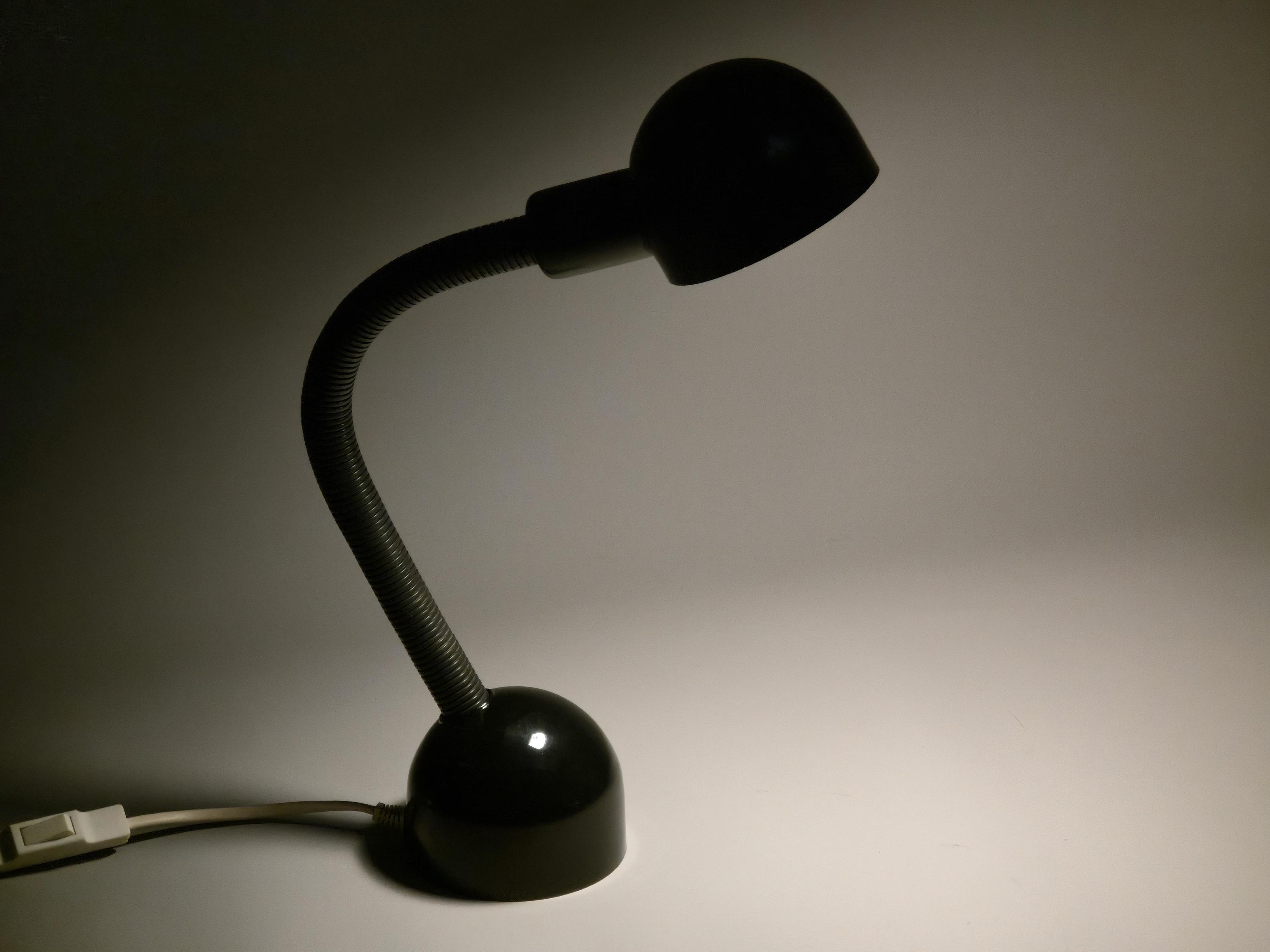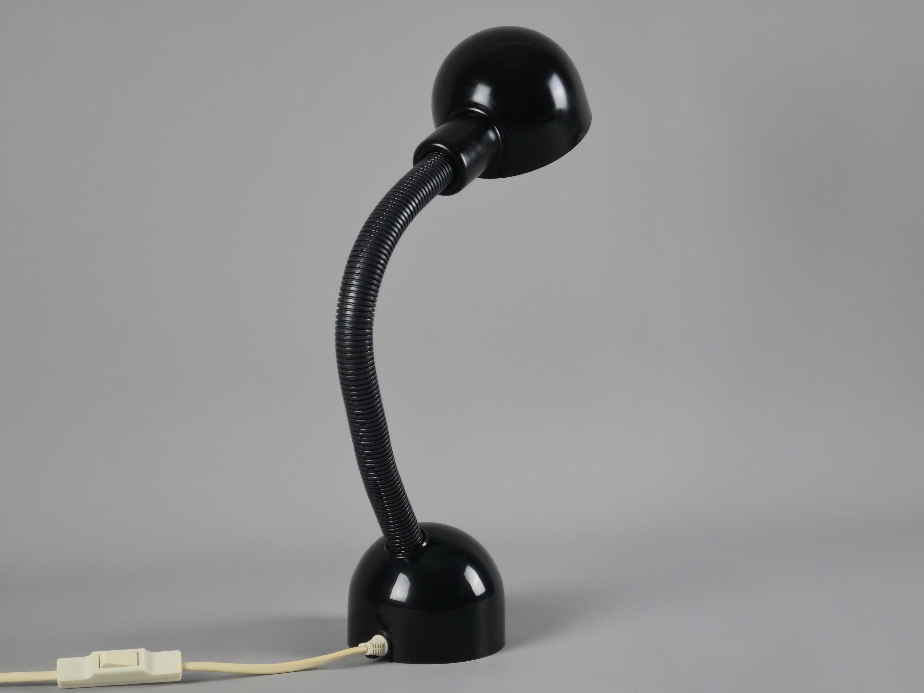 Vintage 1980s postmodern industrial style black lacquered utilitarian gooseneck desk lamp by Happylight Holland.