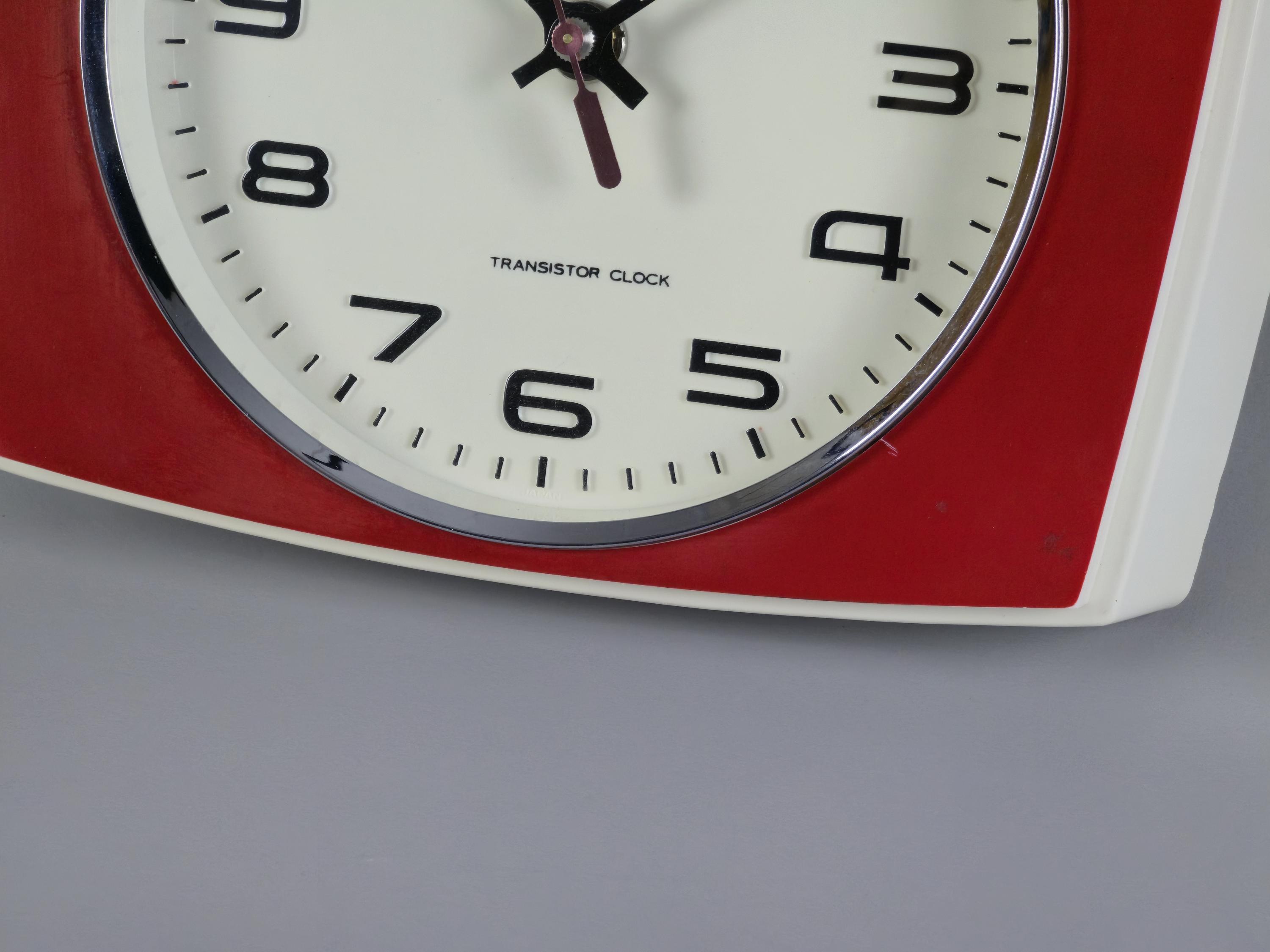 Retro-chic vintage plastic transistor wall clock from the 1970s by Rhythm Japan in excellent condition.