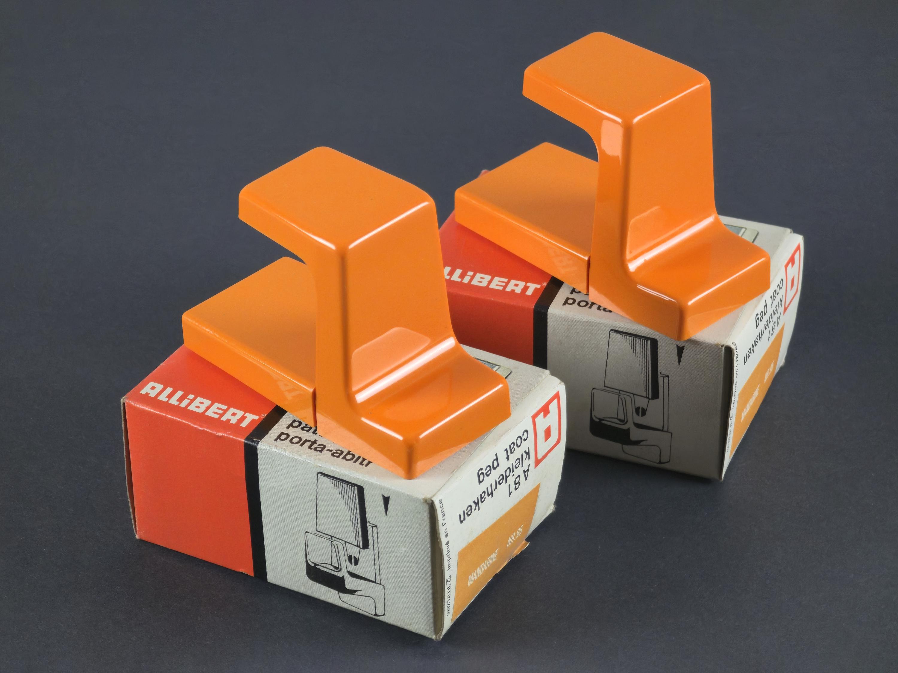 New in box 1970s vintage pair of orange plastic wall hooks from 'Serie Europa' by Allibert France.