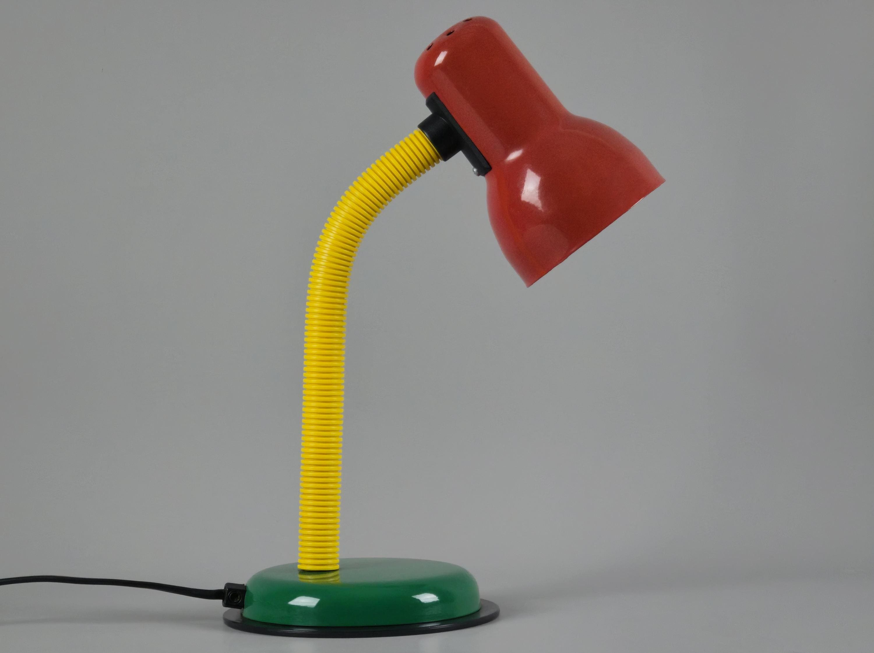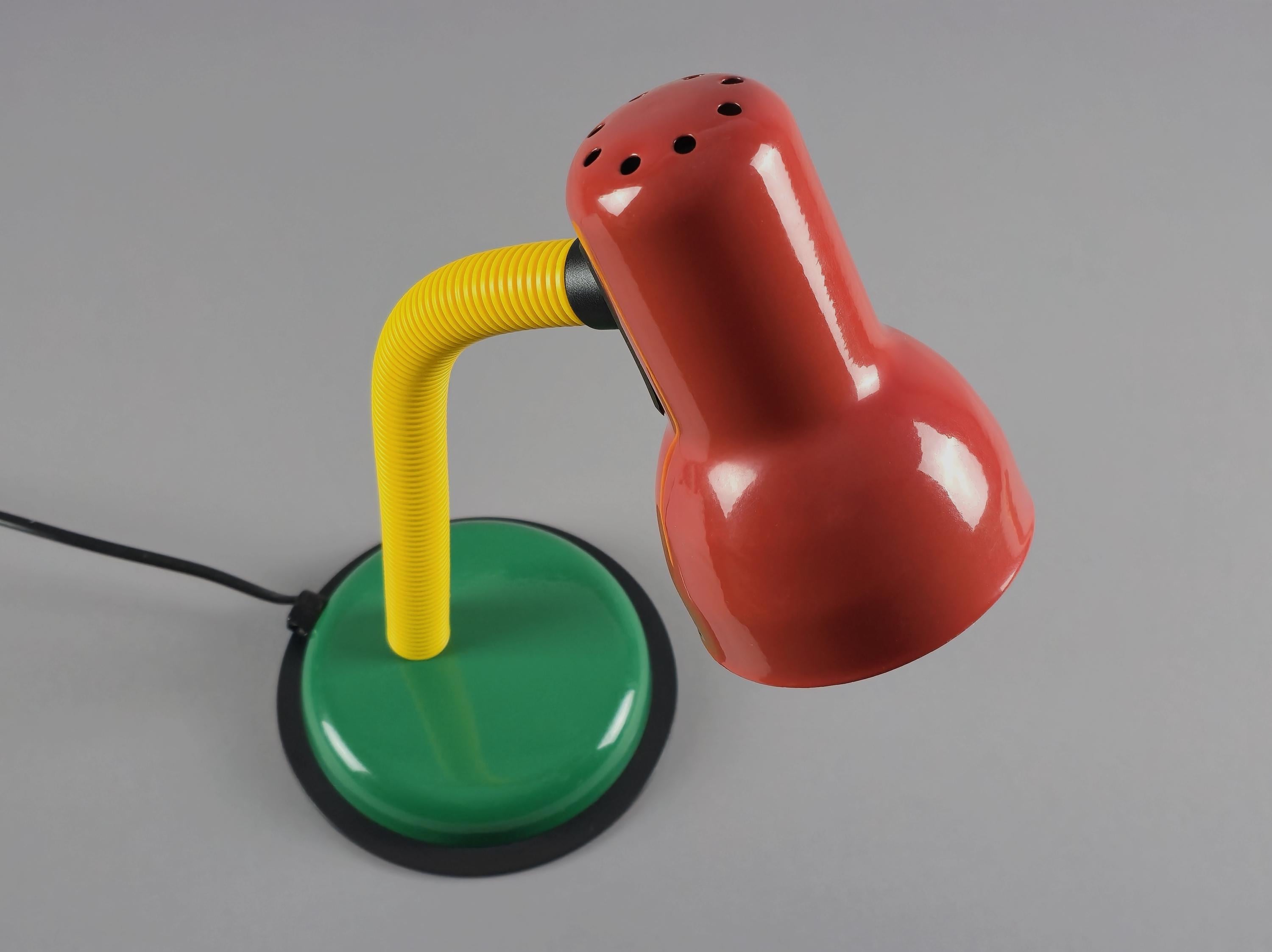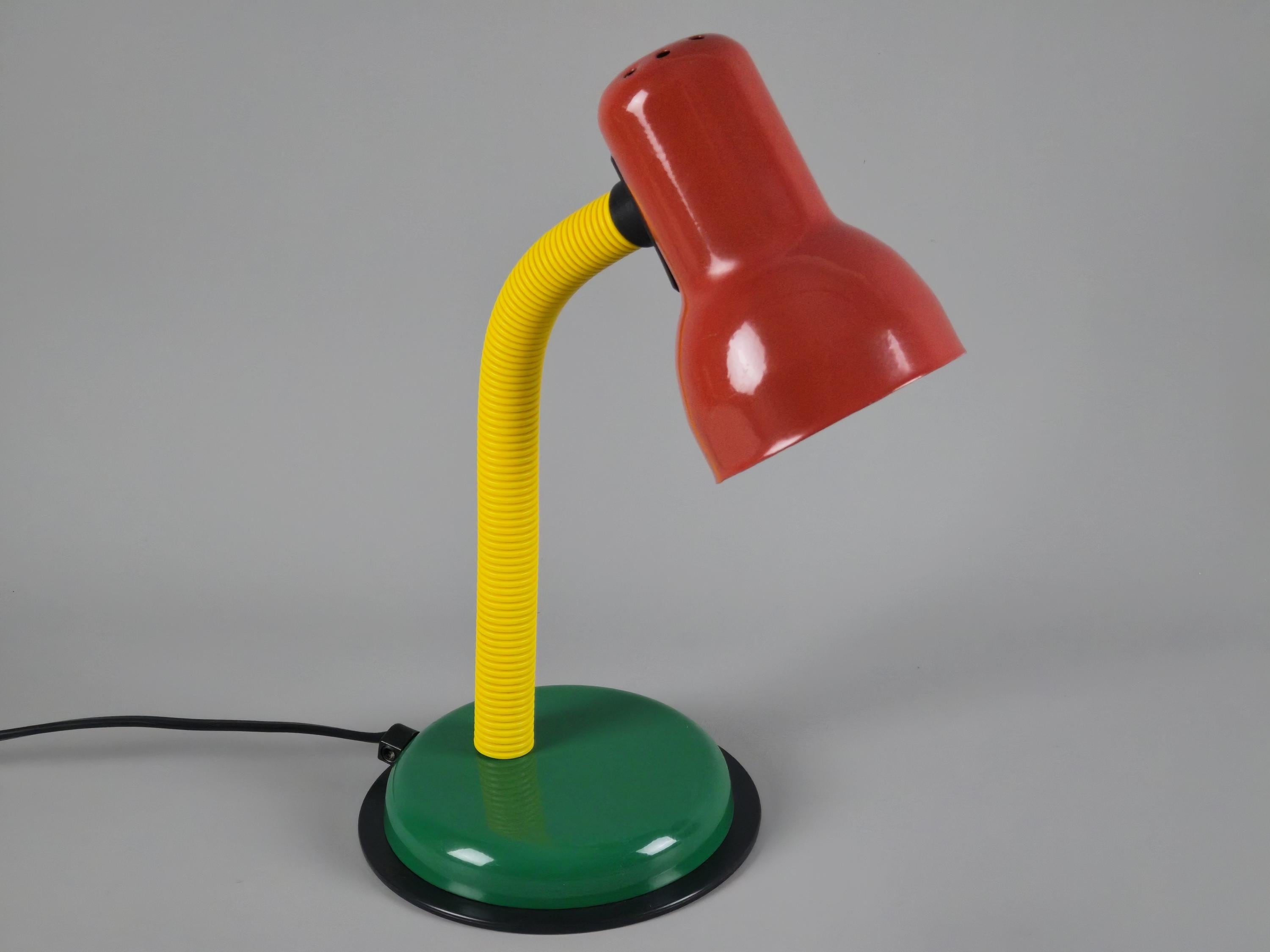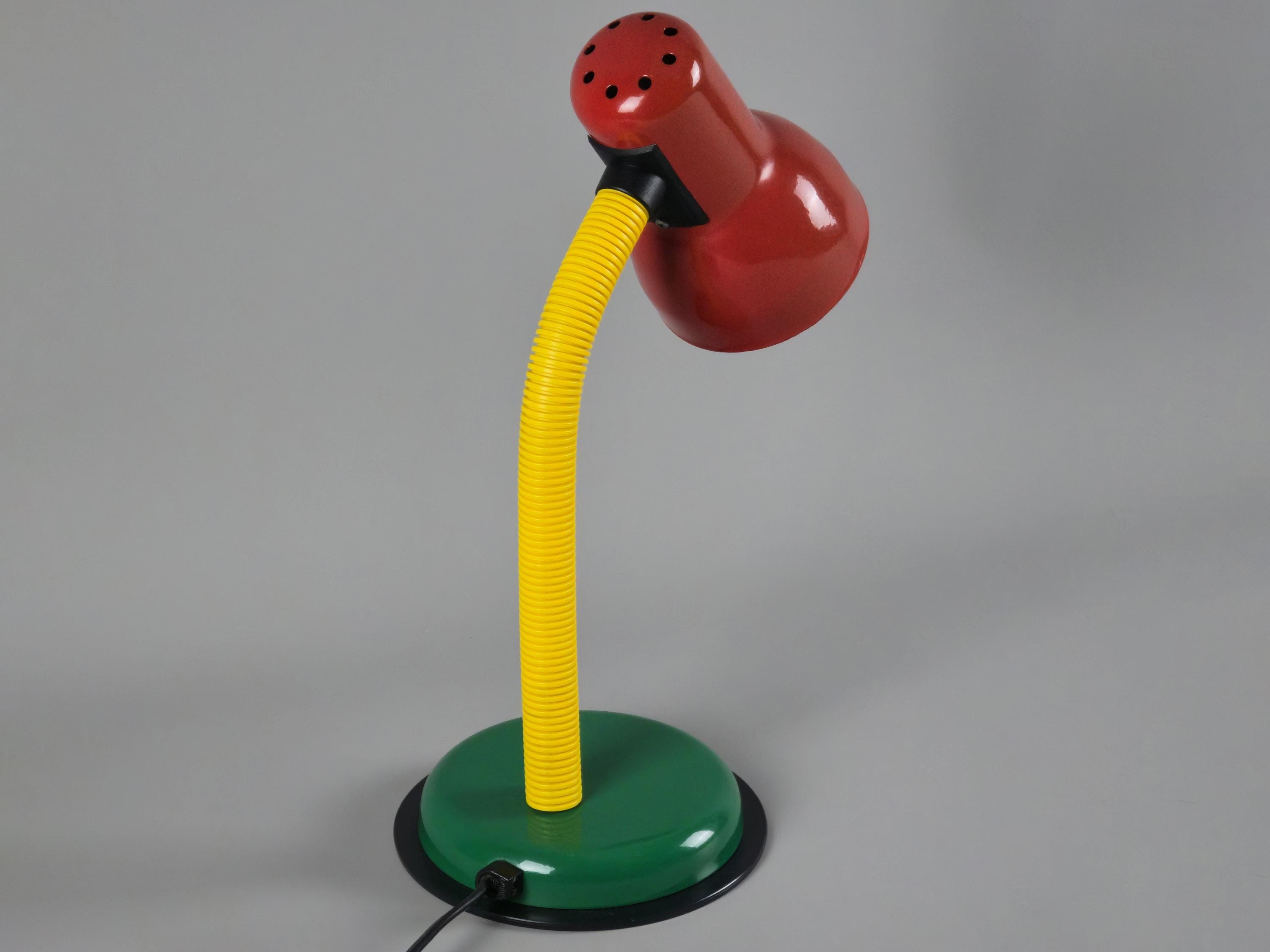 Vintage postmodern-industrial style tricolor utilitarian gooseneck desk lamp by Bramma Italy (dated) from 1996.