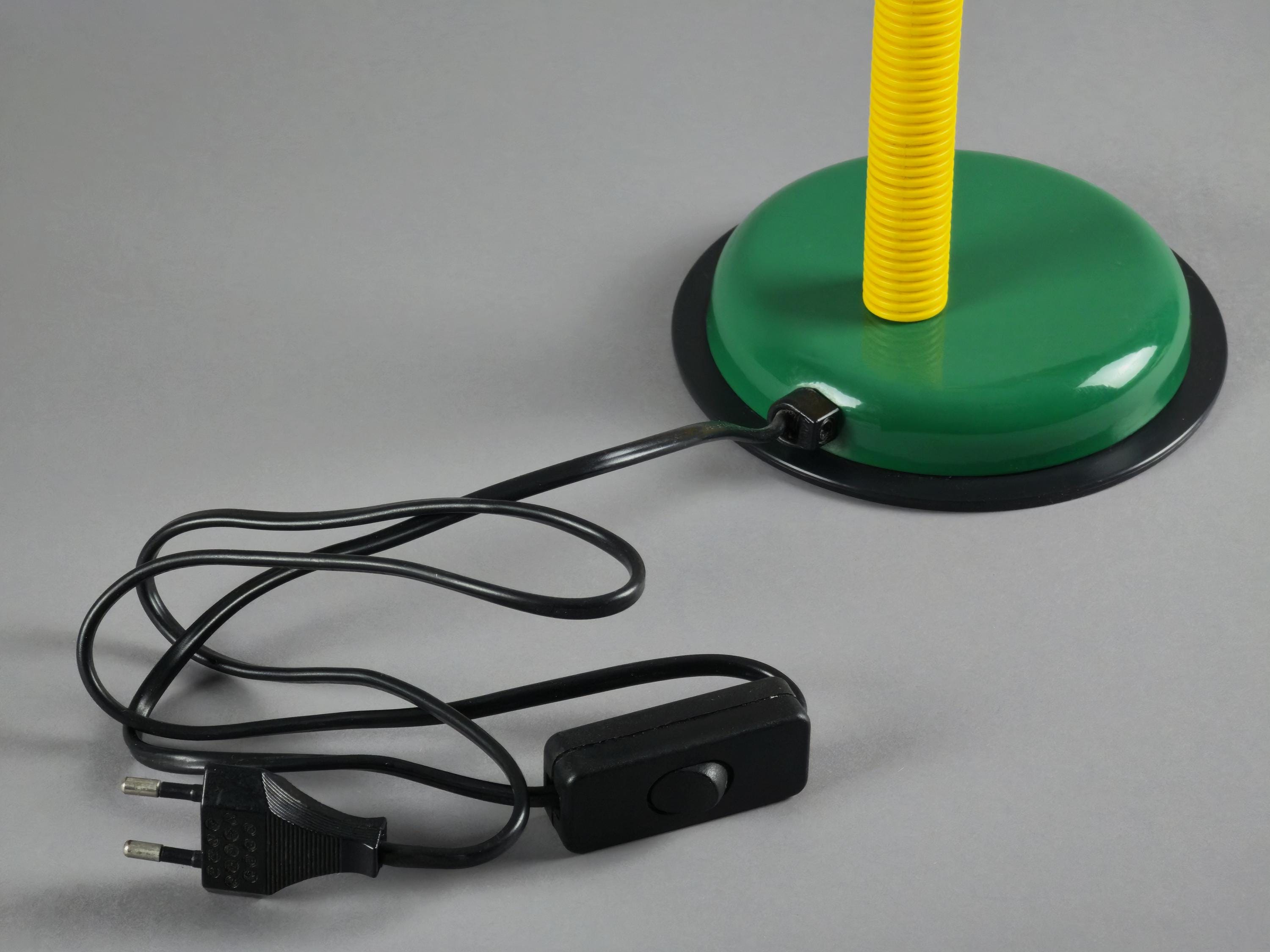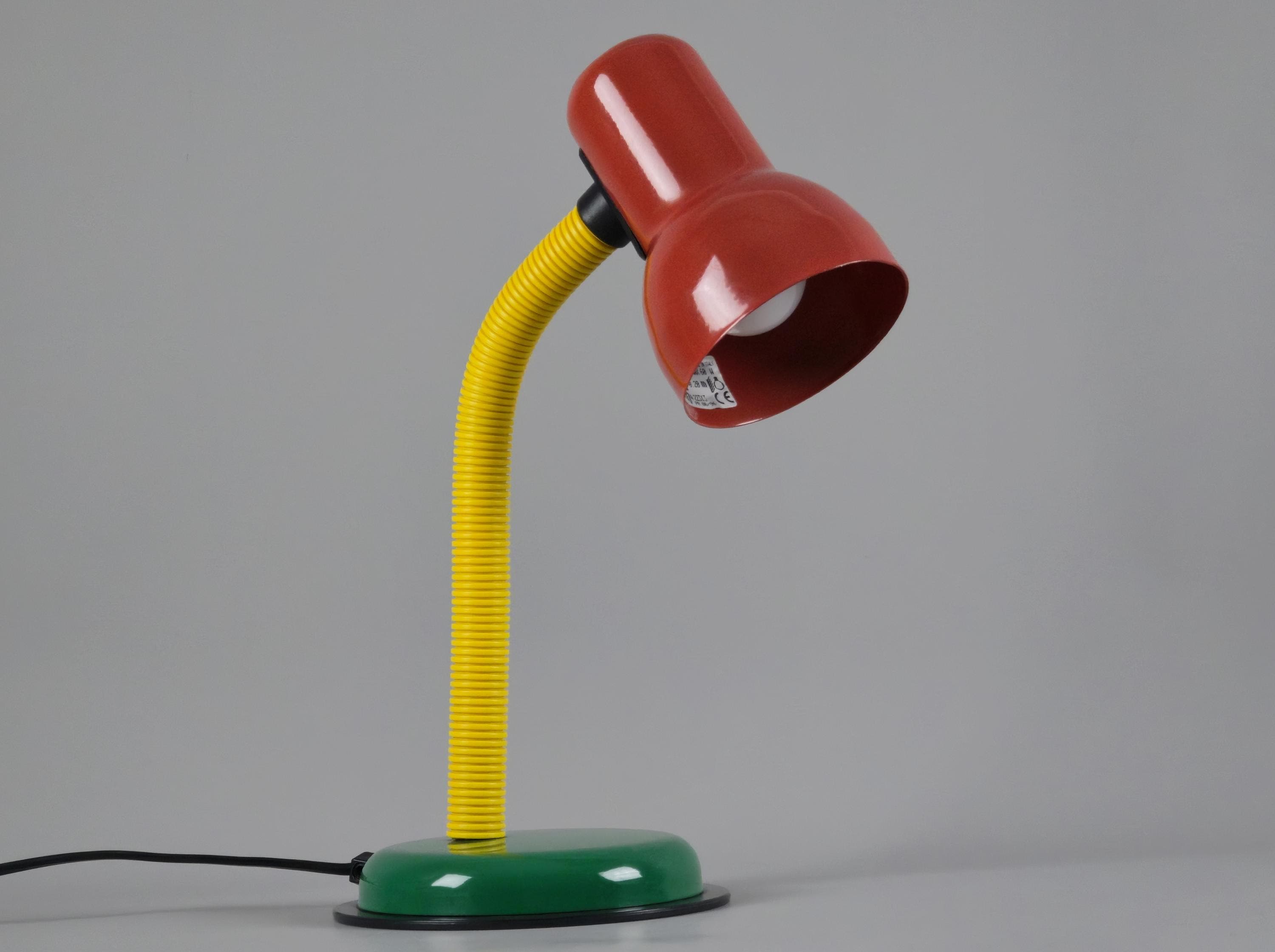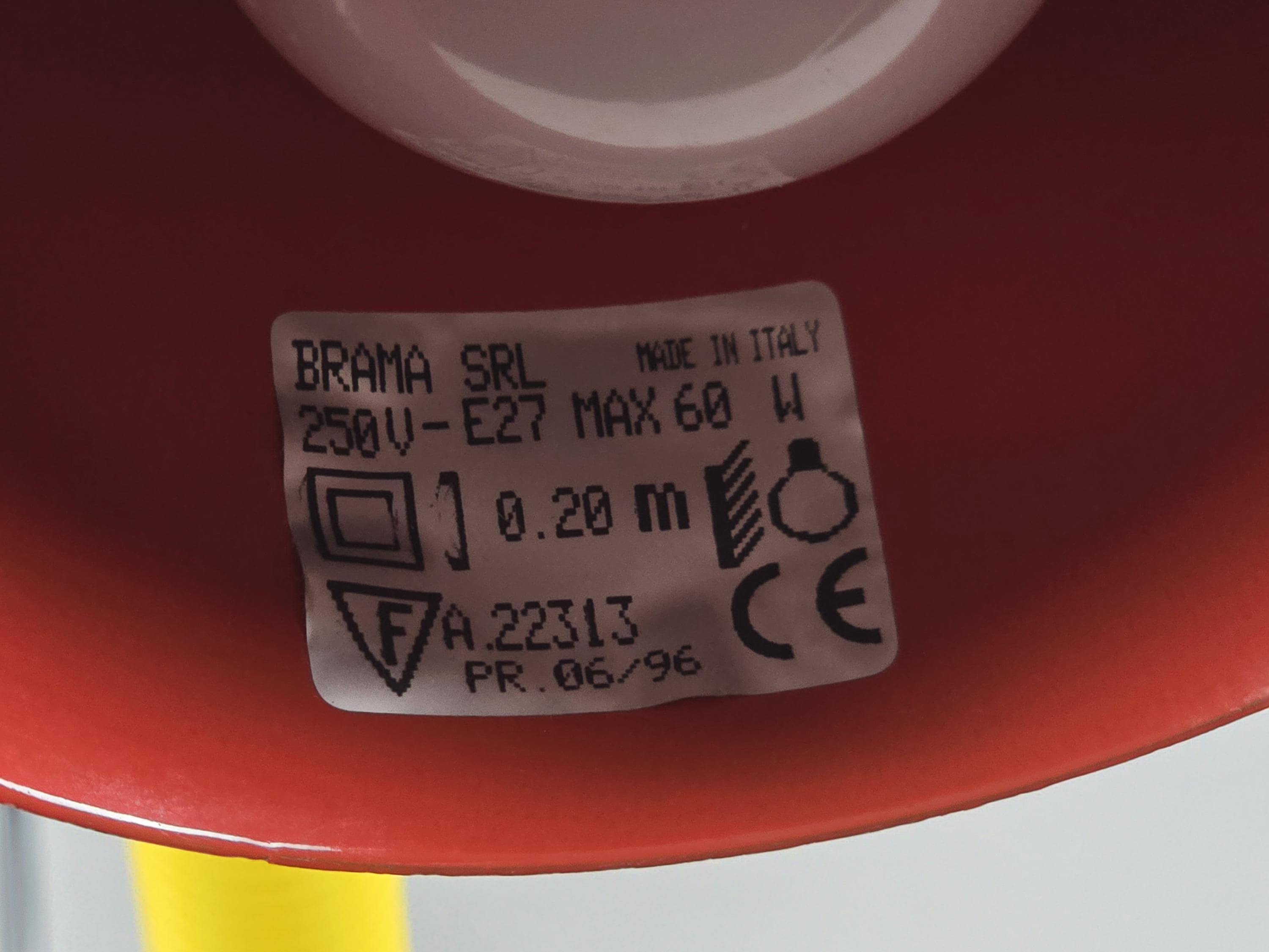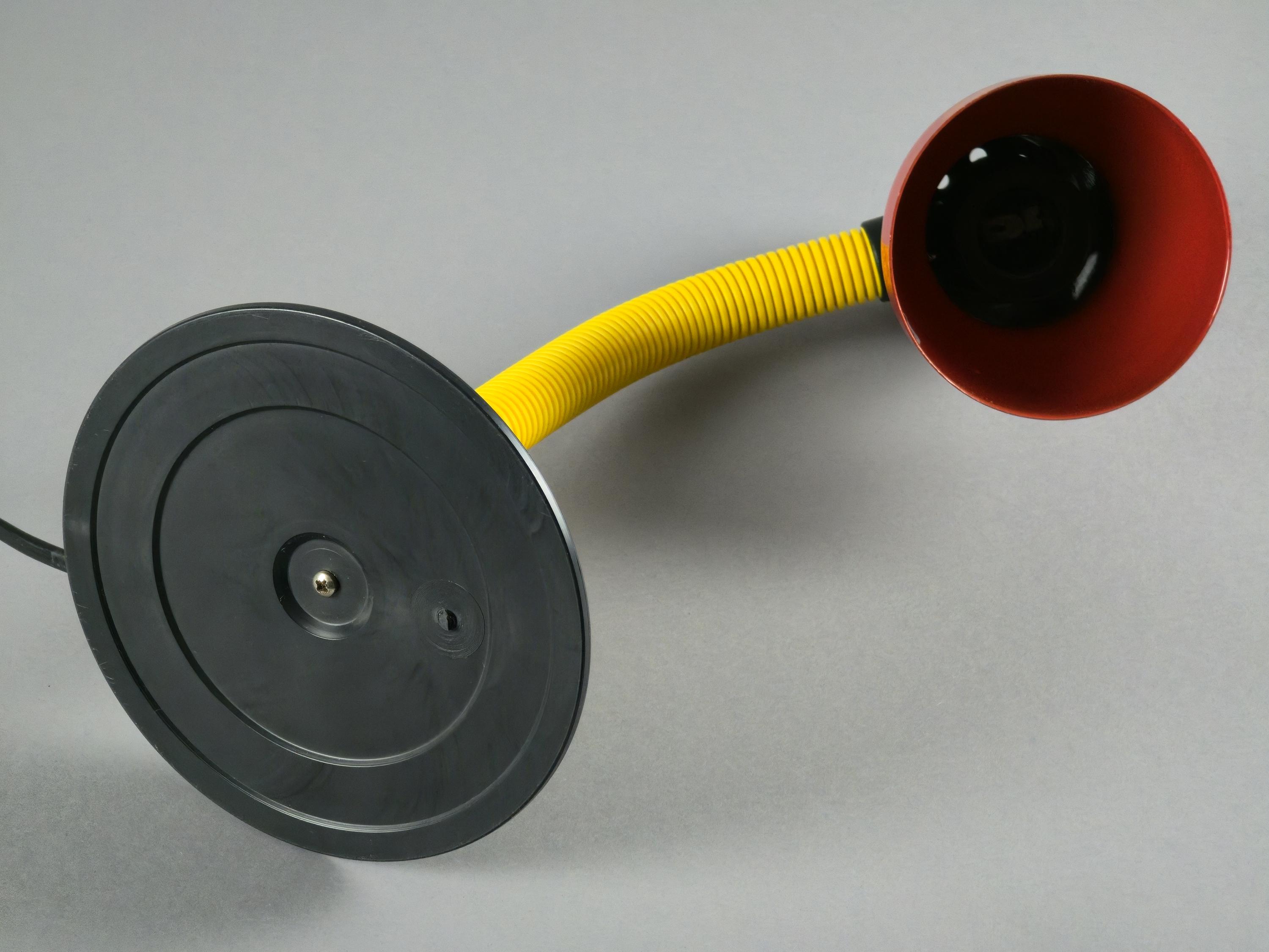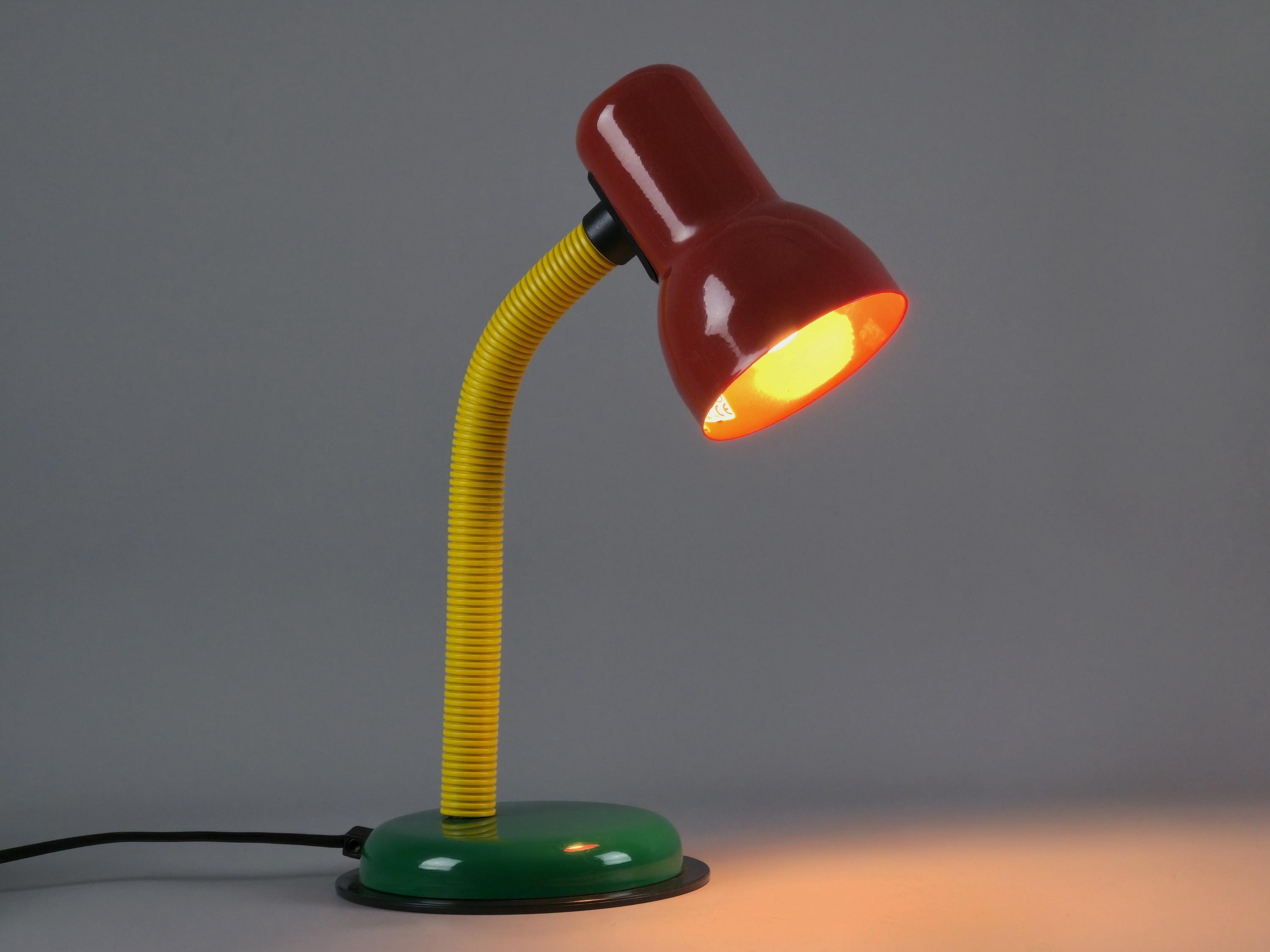 Vintage postmodern-industrial style tricolor utilitarian gooseneck desk lamp by Bramma Italy (dated) from 1996.