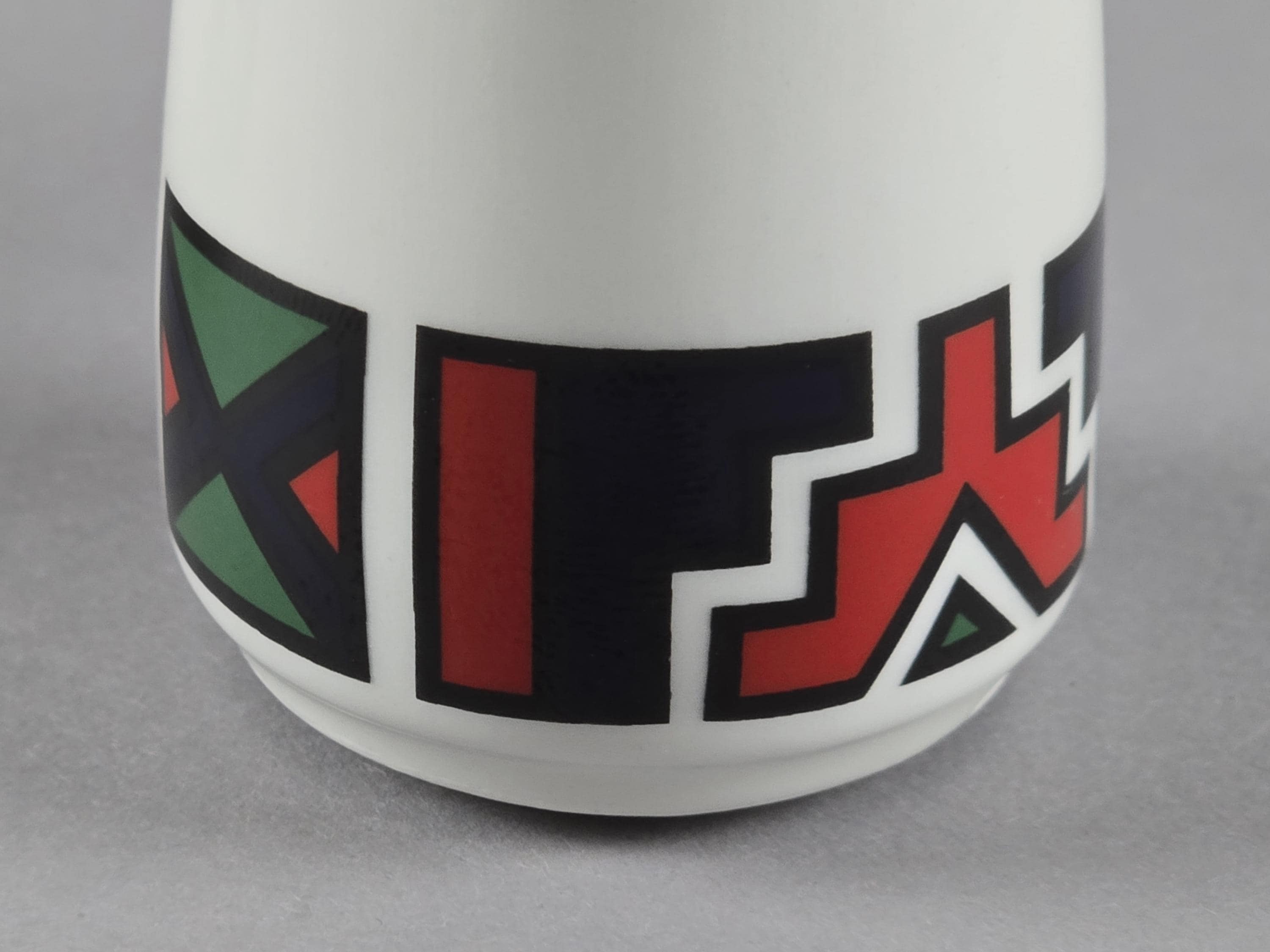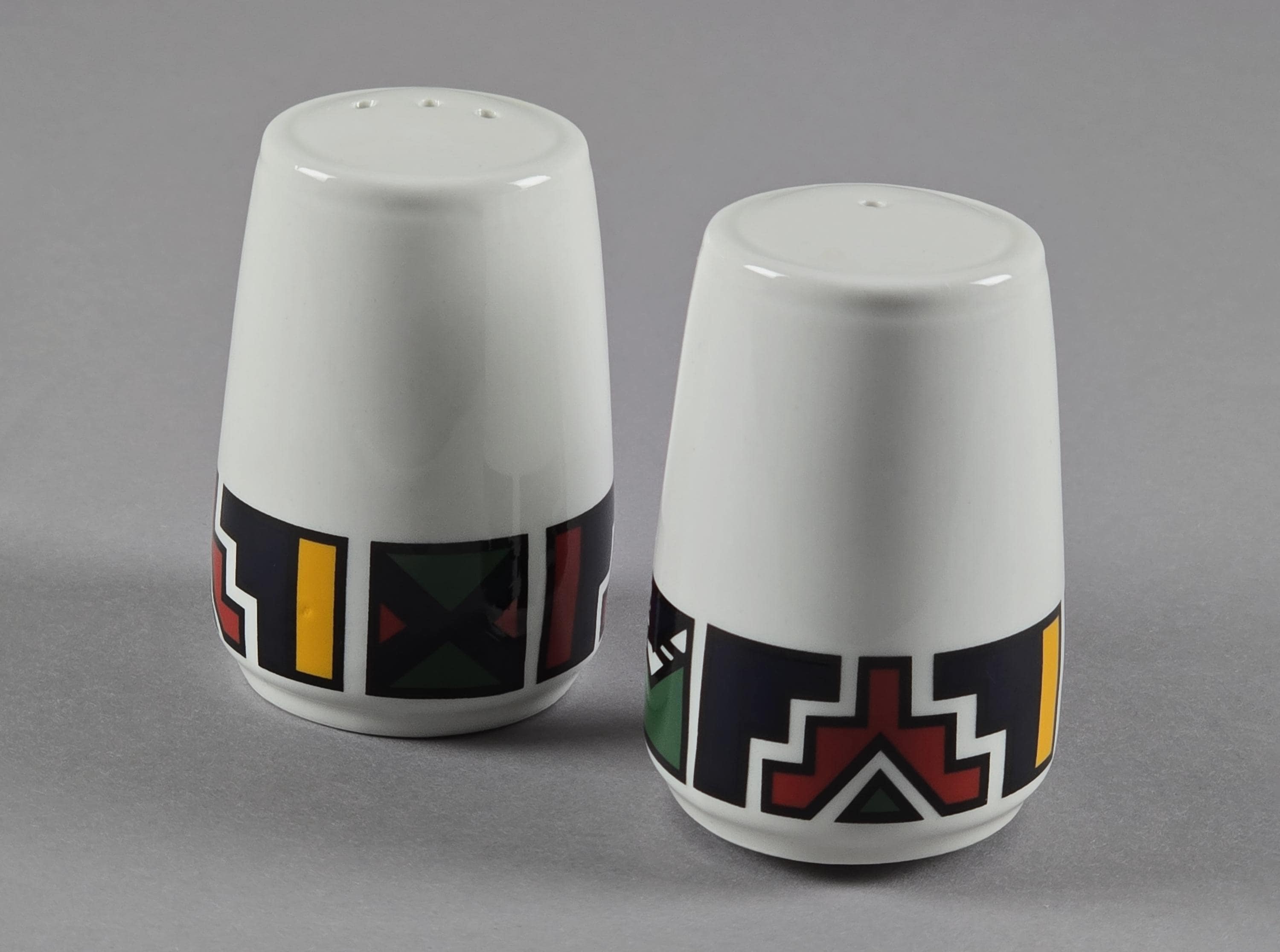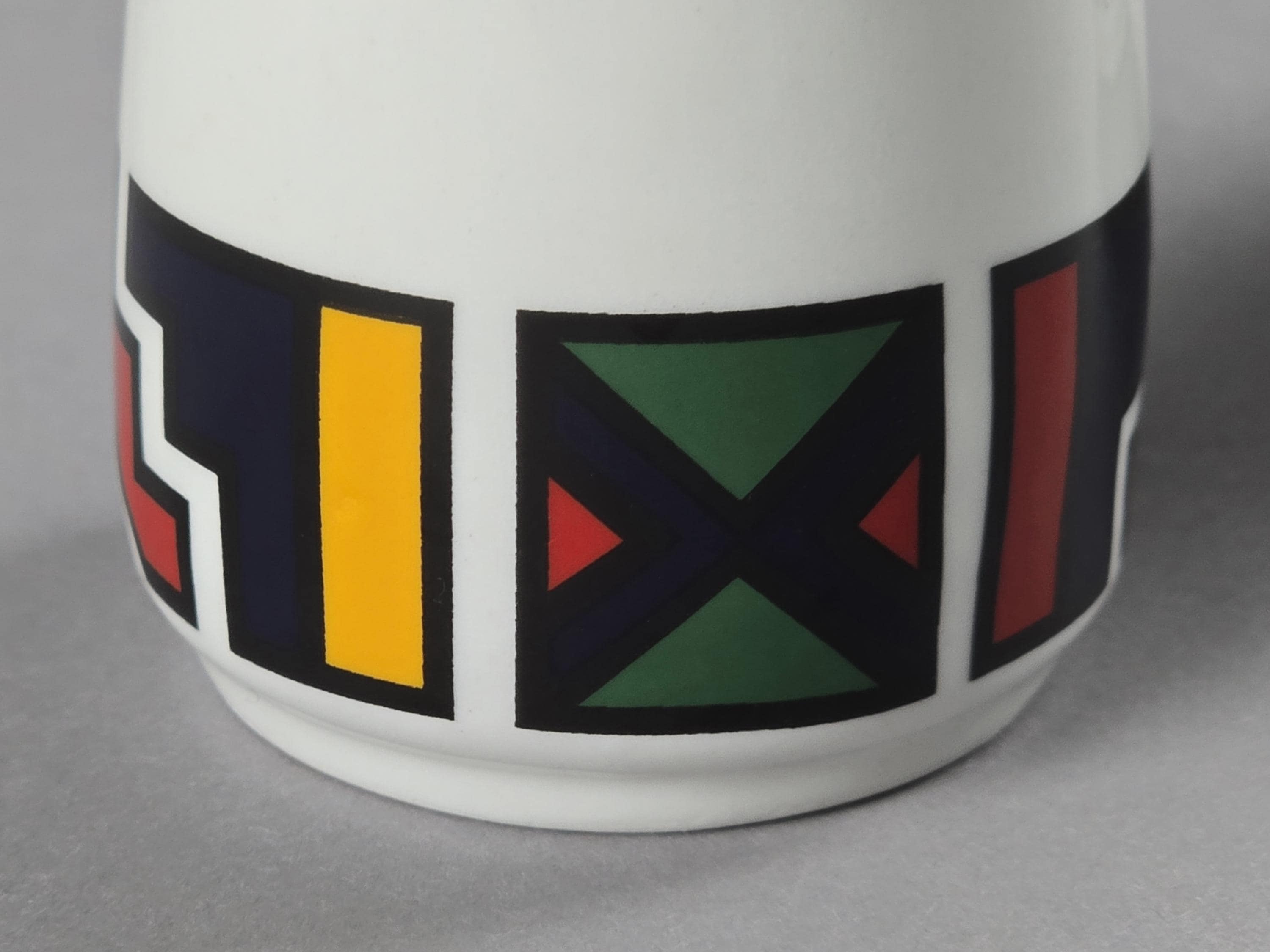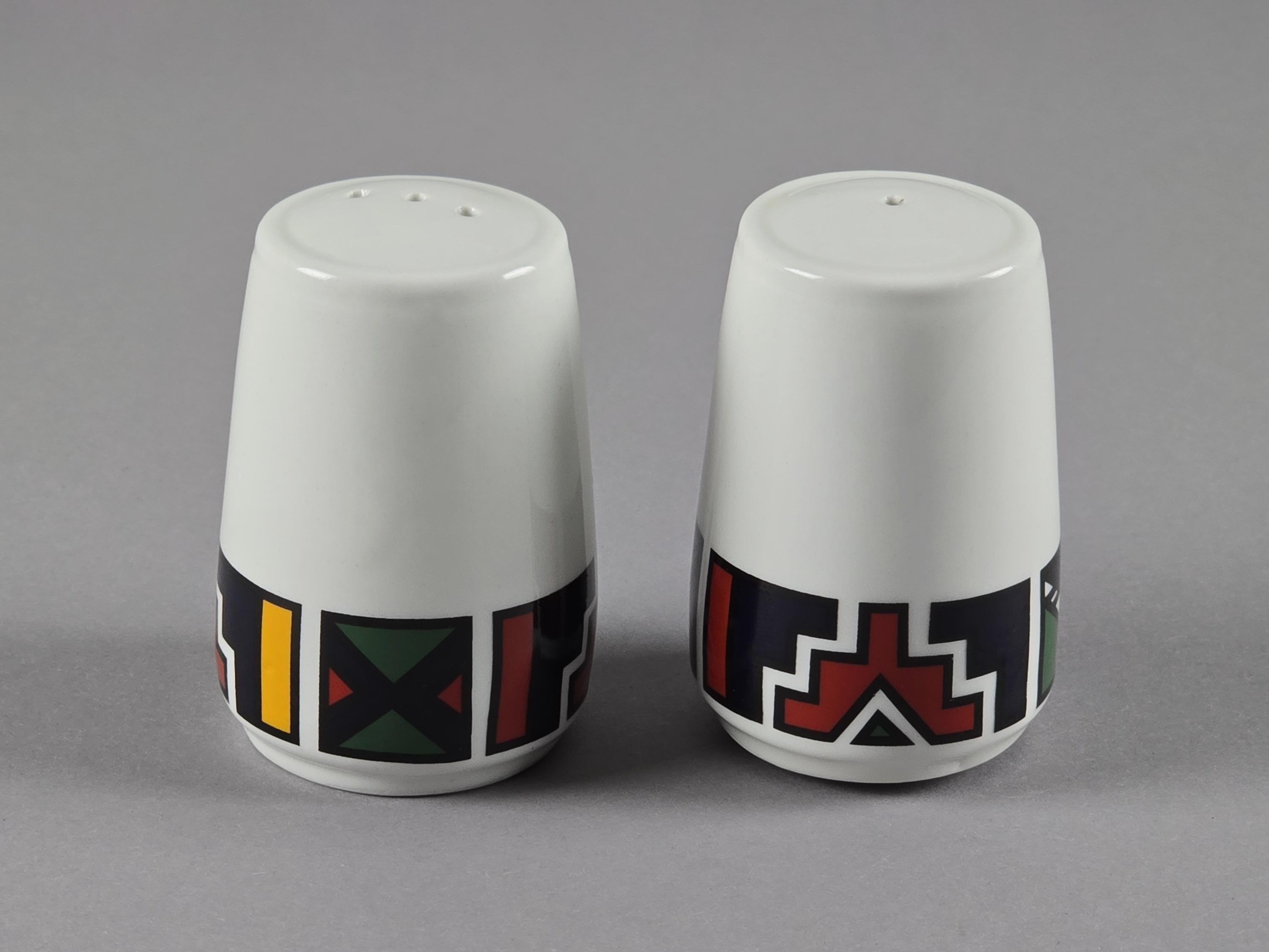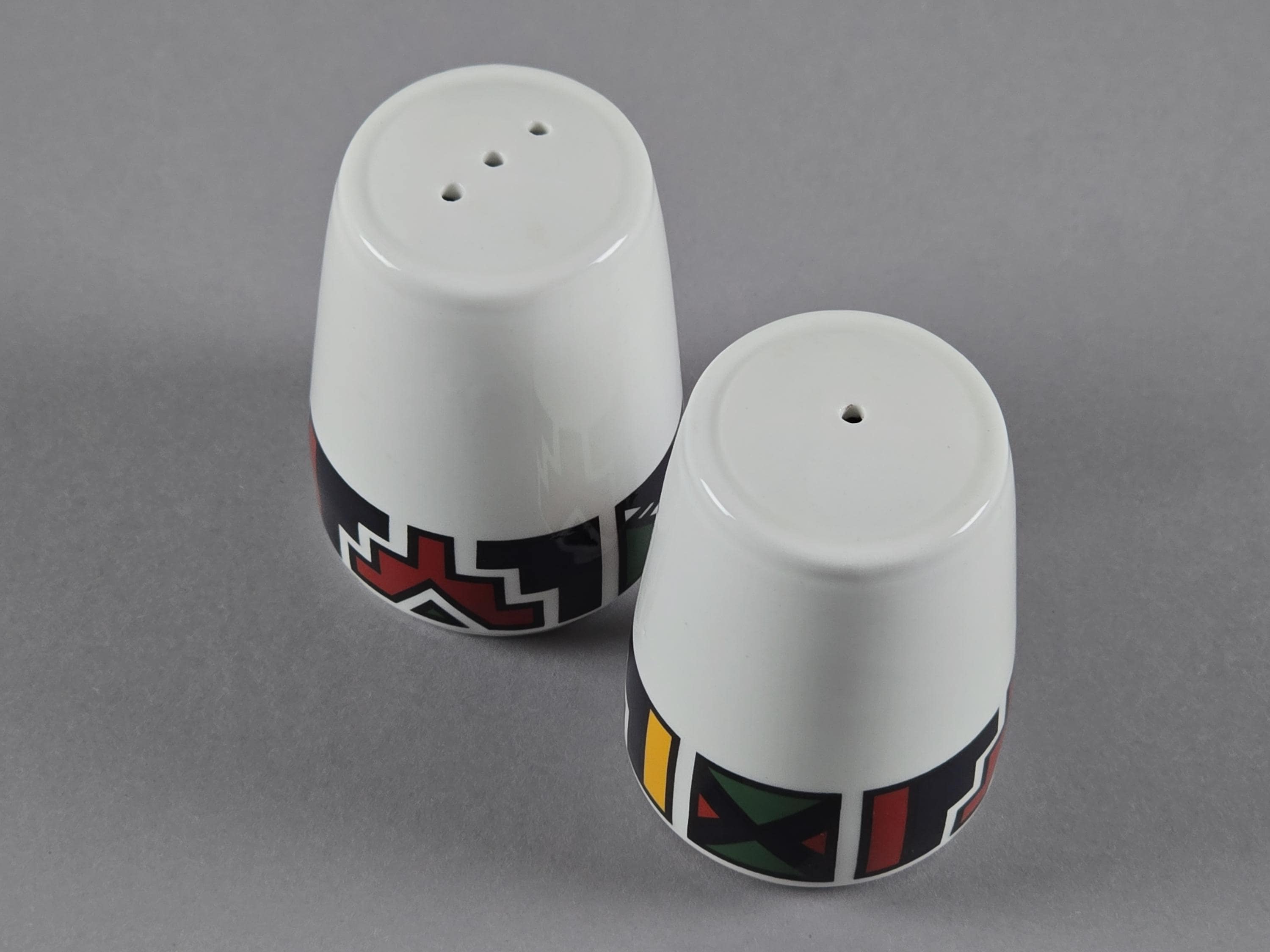 Vintage 1970s ceramic salt & pepper shakers set by Regina Industries Ltd. England. They feature a tapered cylindrical shape in white, decorated around the base with a bold, multi-colored geometric or tribal-style band in black, red, yellow, and green.