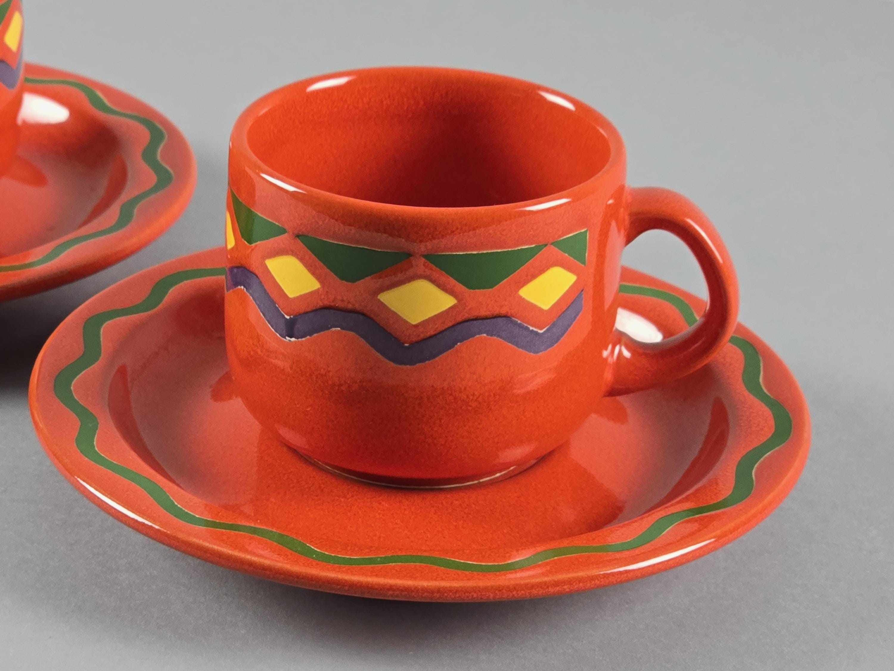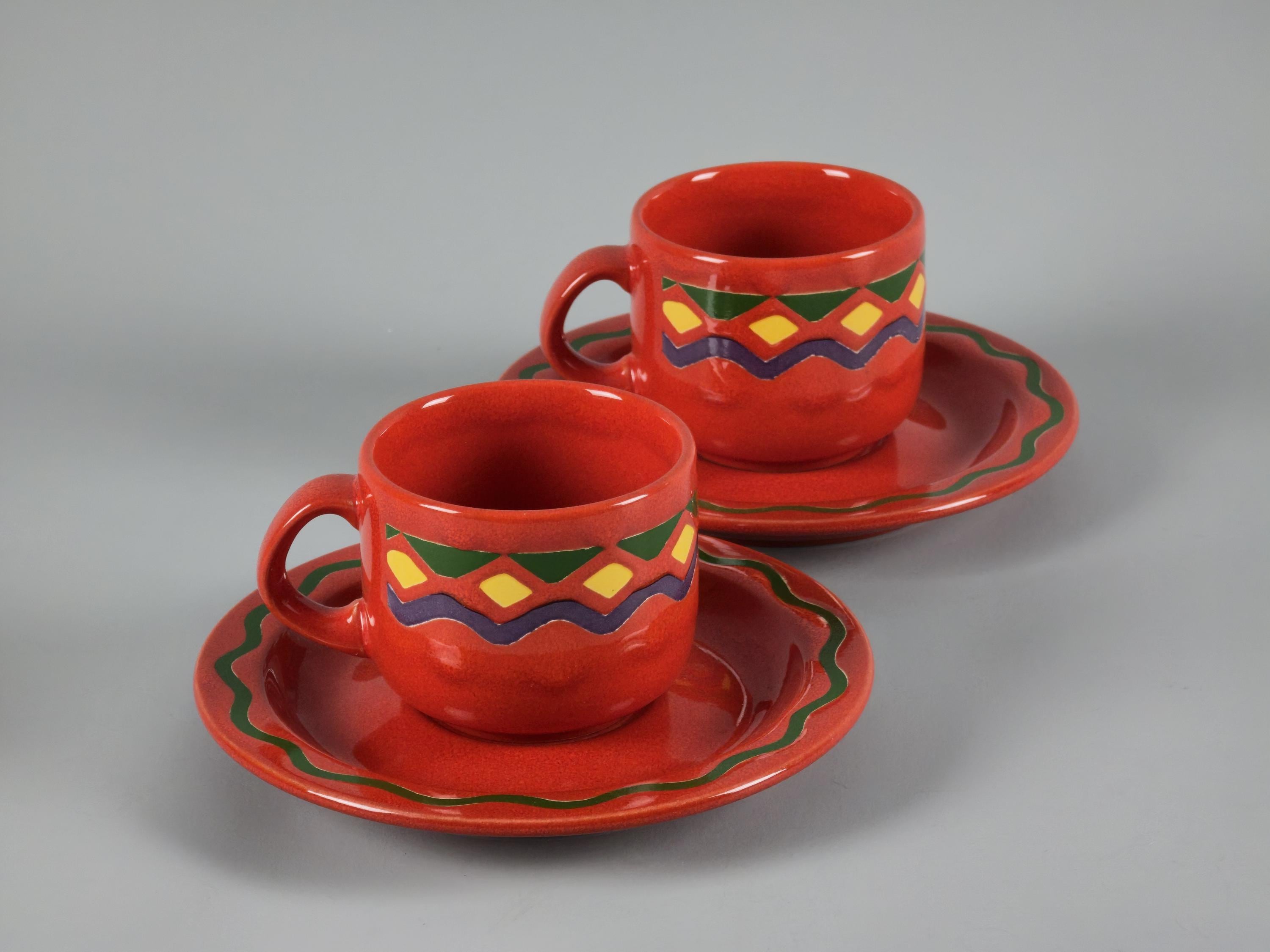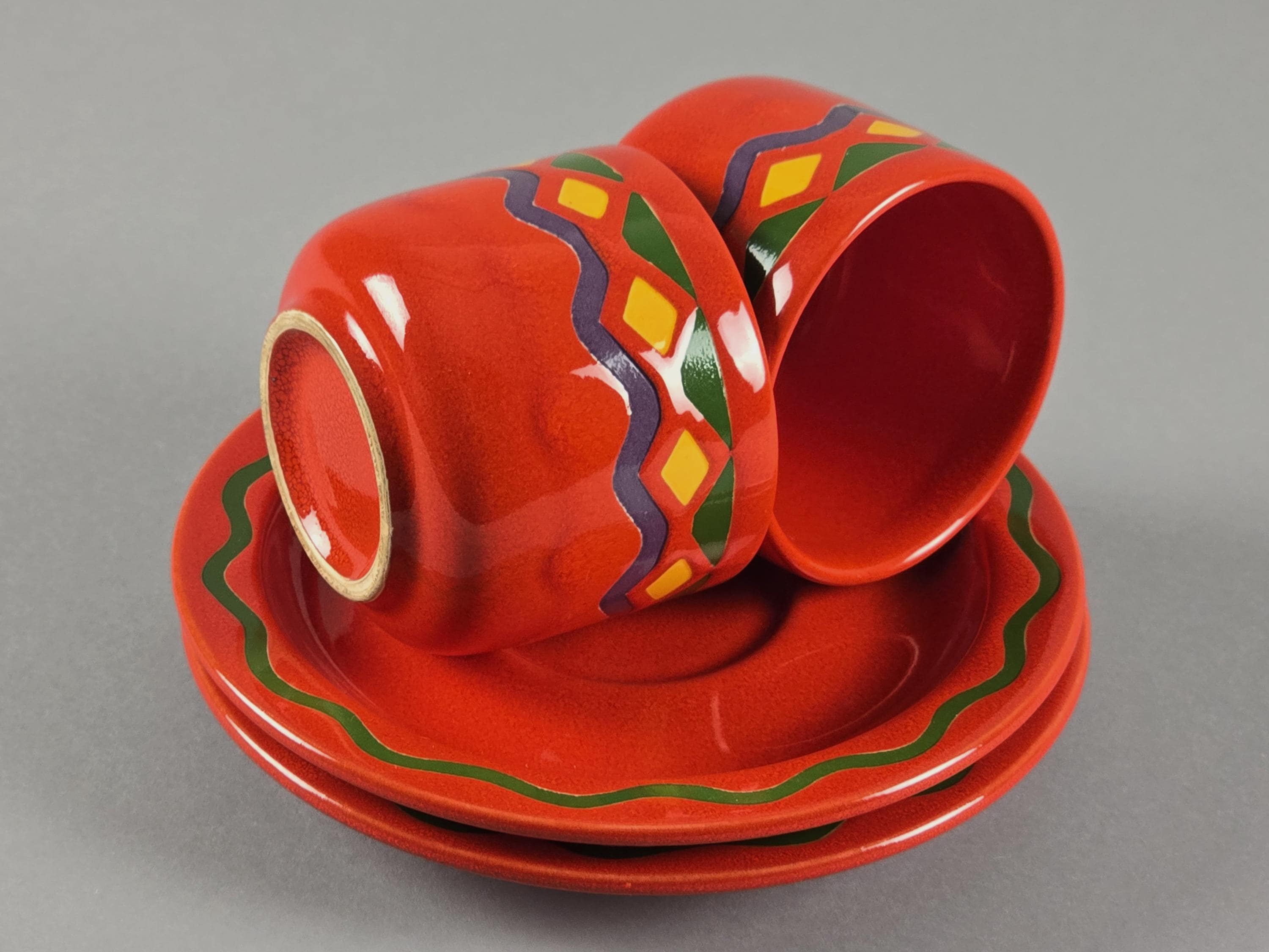 Lovely vintage pair of red ceramic teacups with saucers by Wächtersbach Keramik featuring a colorful, geometric, zigzag, or wave-like band of green, yellow, and purple around the rims.
