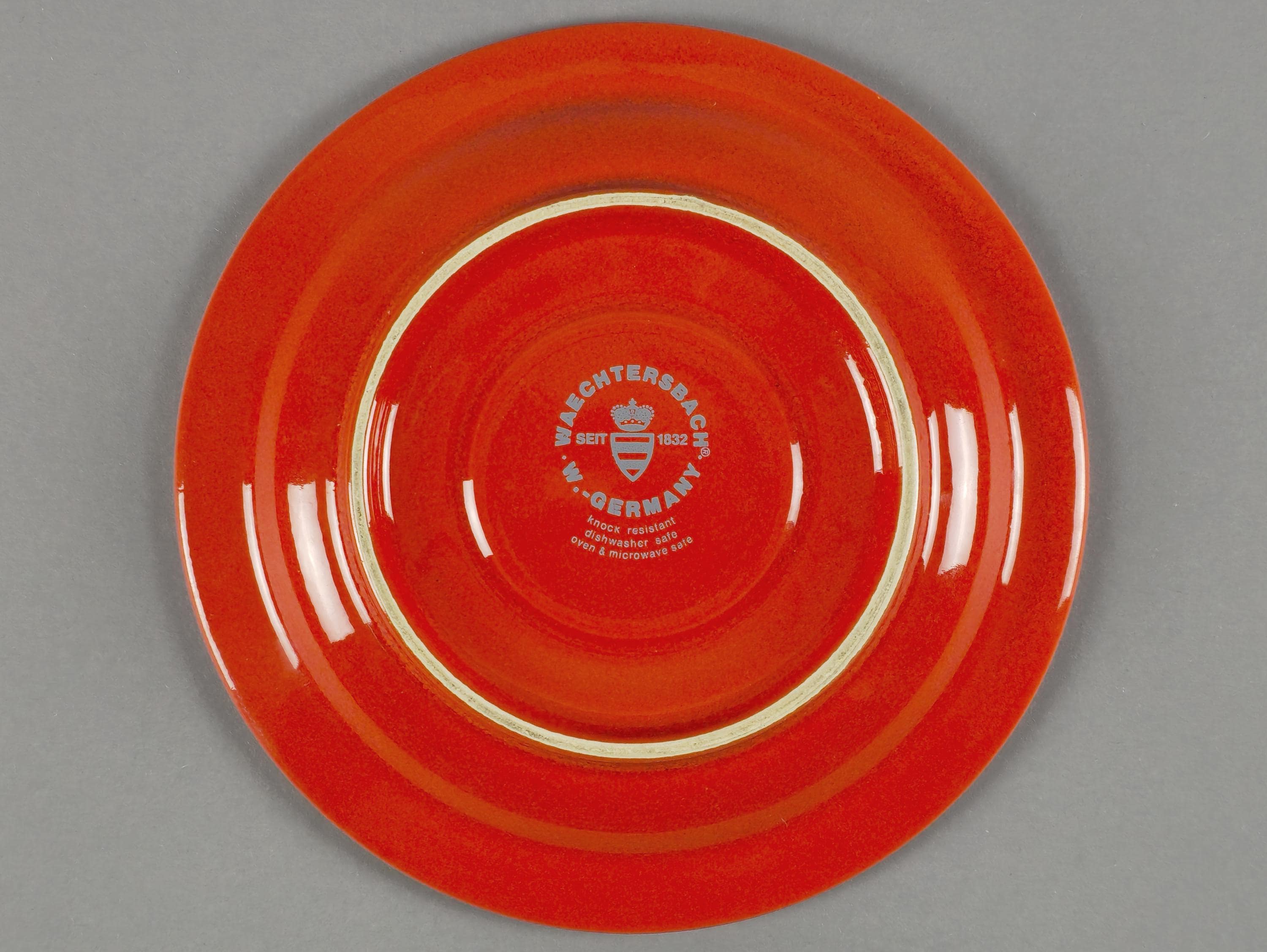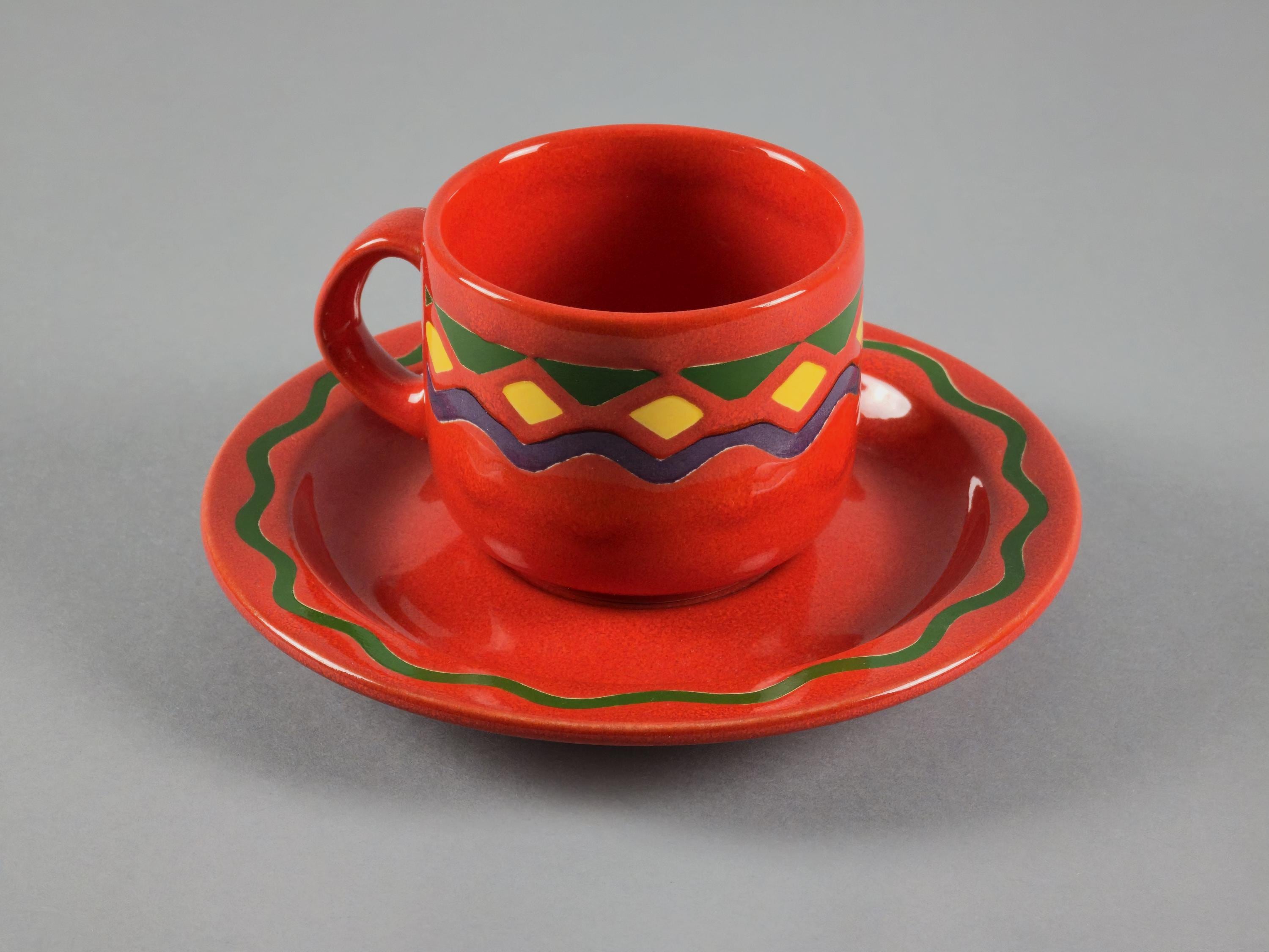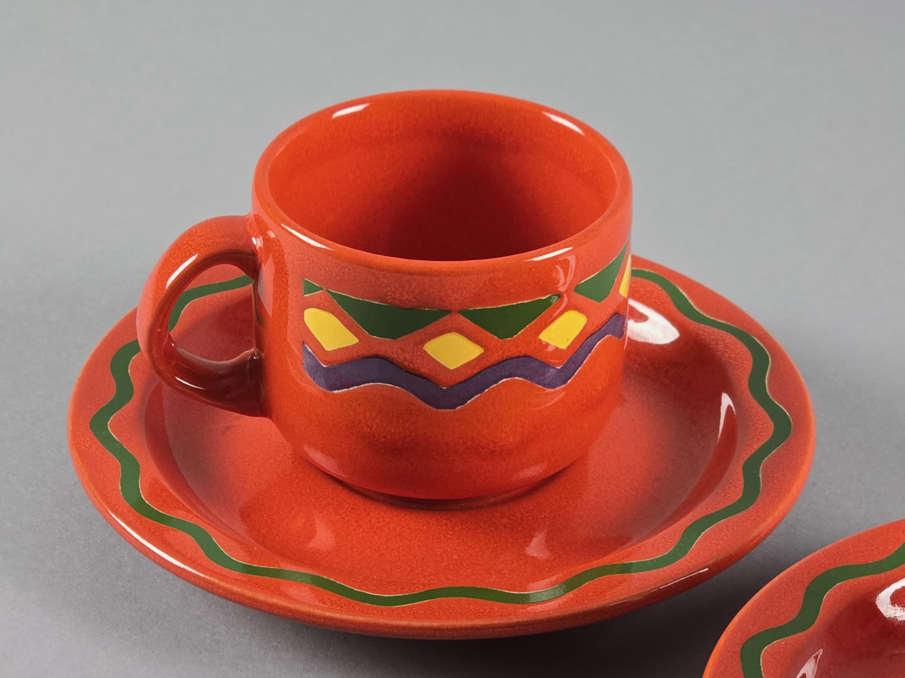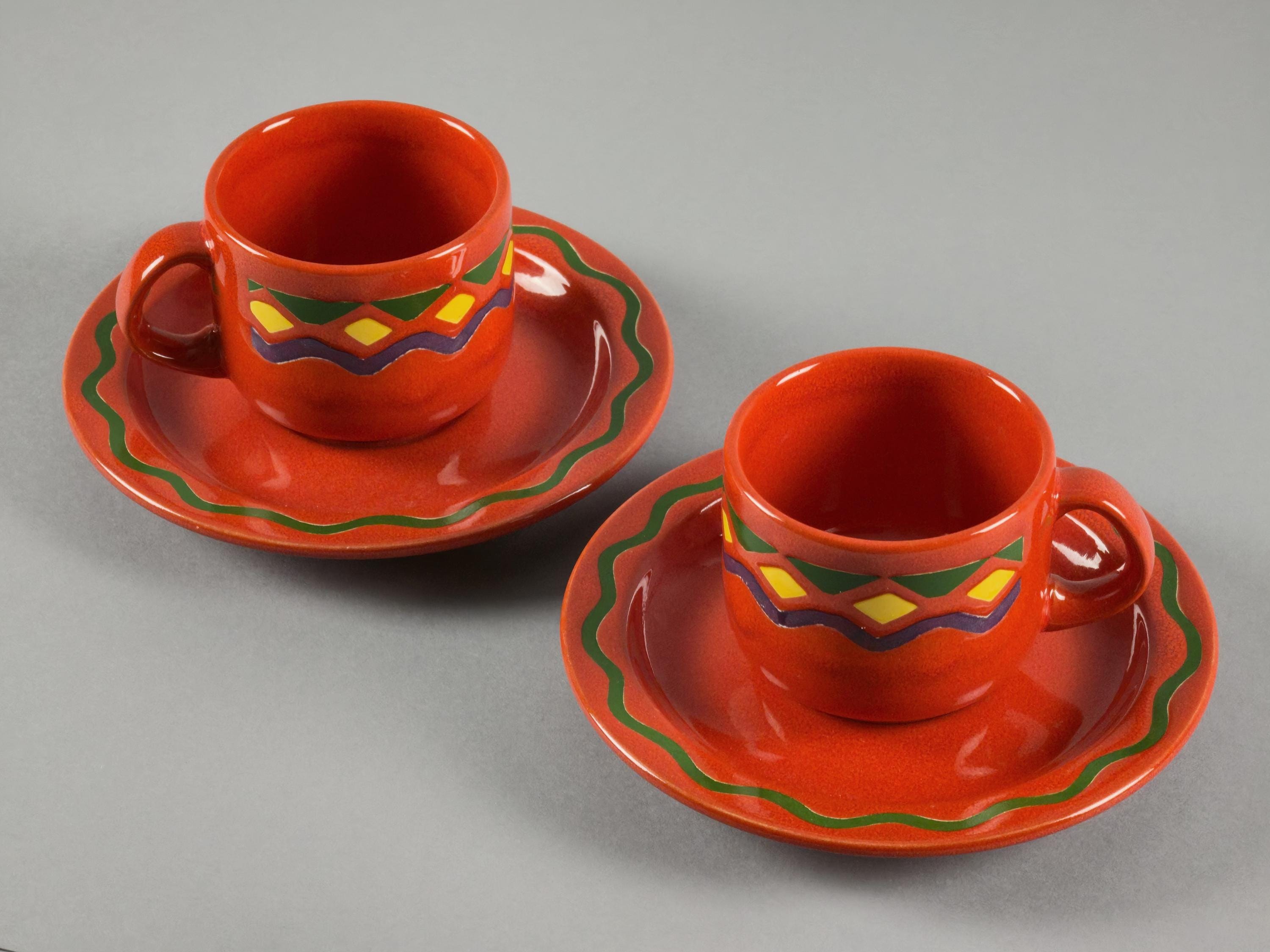 Lovely vintage pair of red ceramic teacups with saucers by Wächtersbach Keramik featuring a colorful, geometric, zigzag, or wave-like band of green, yellow, and purple around the rims.