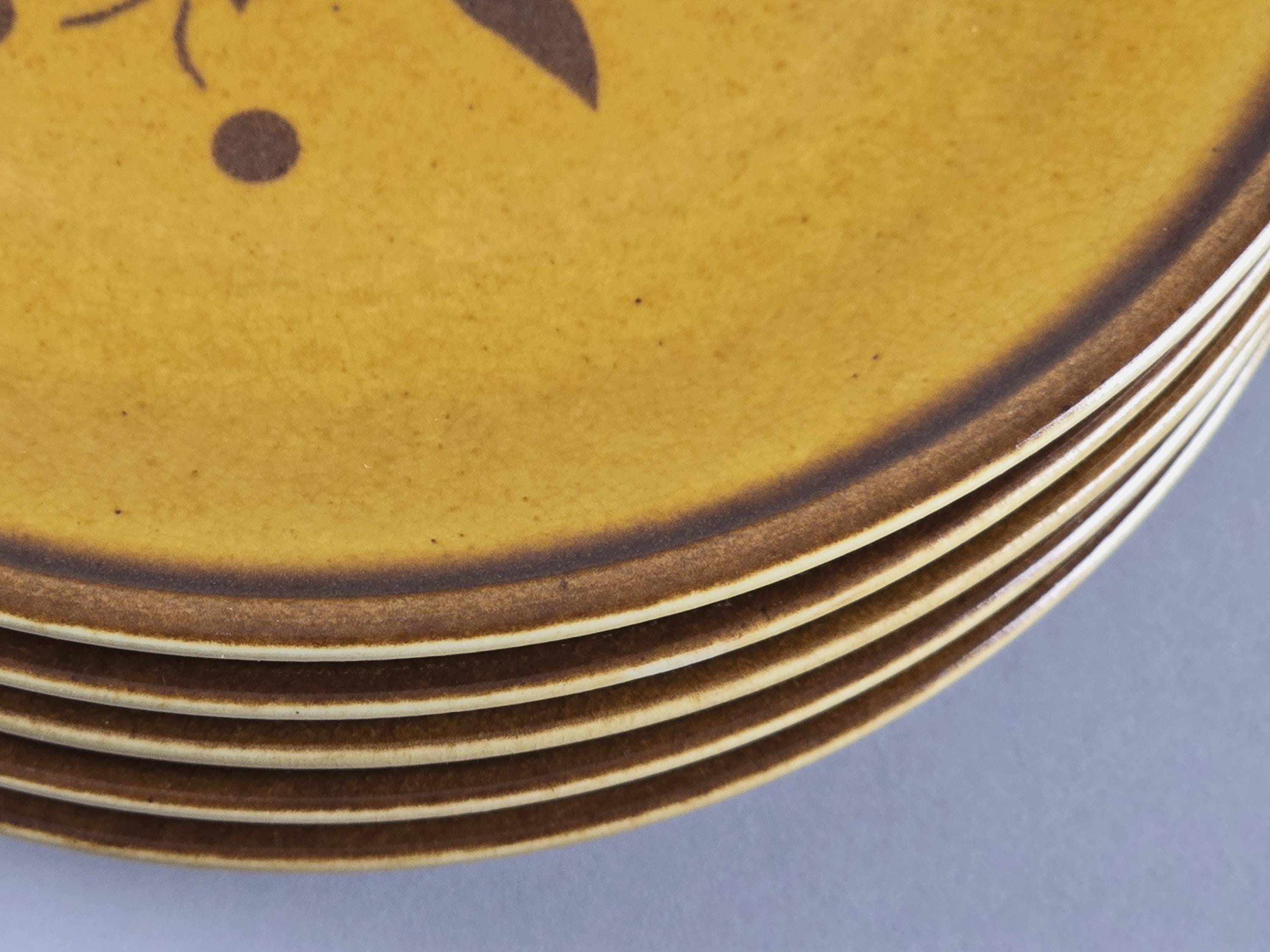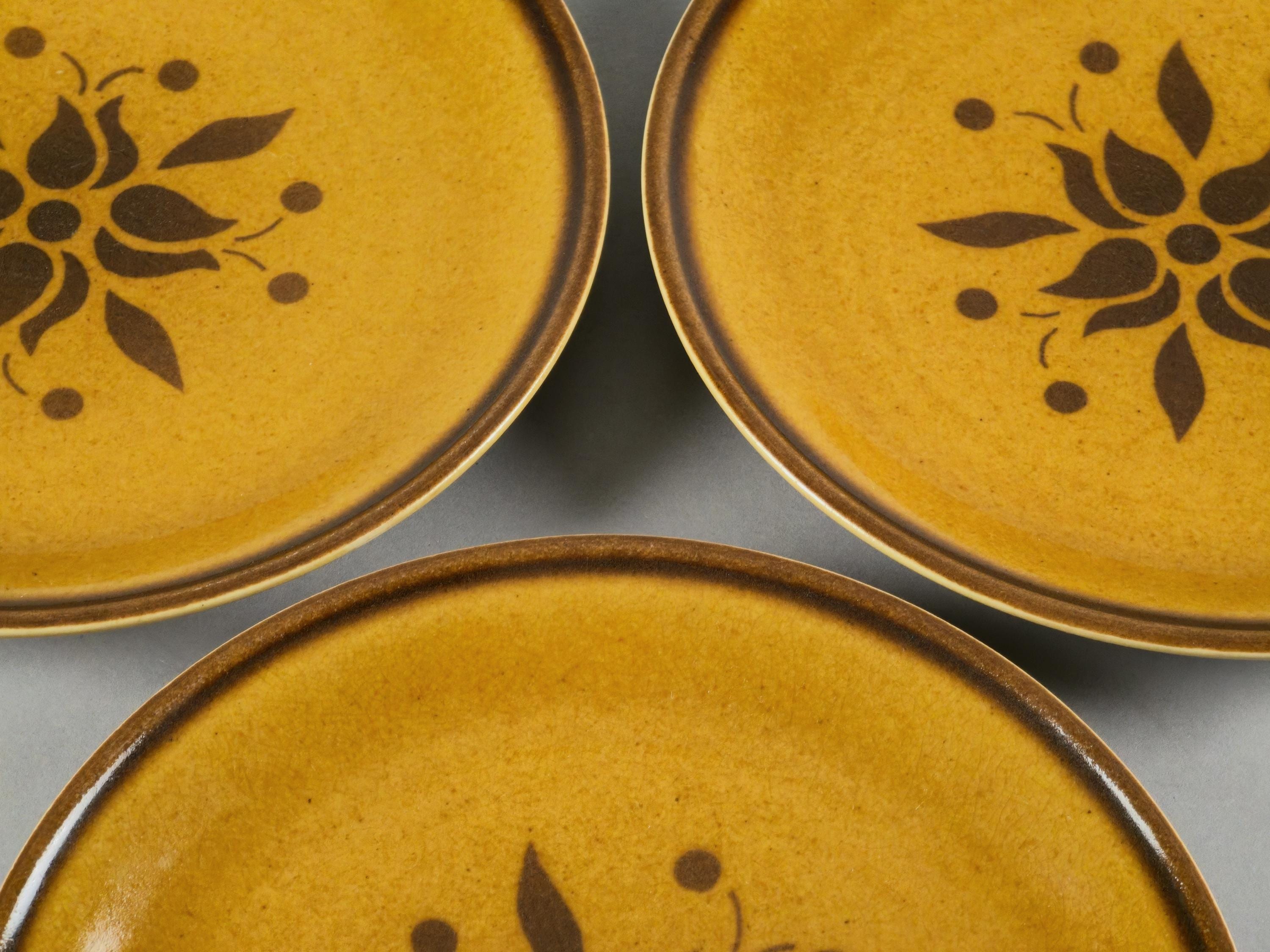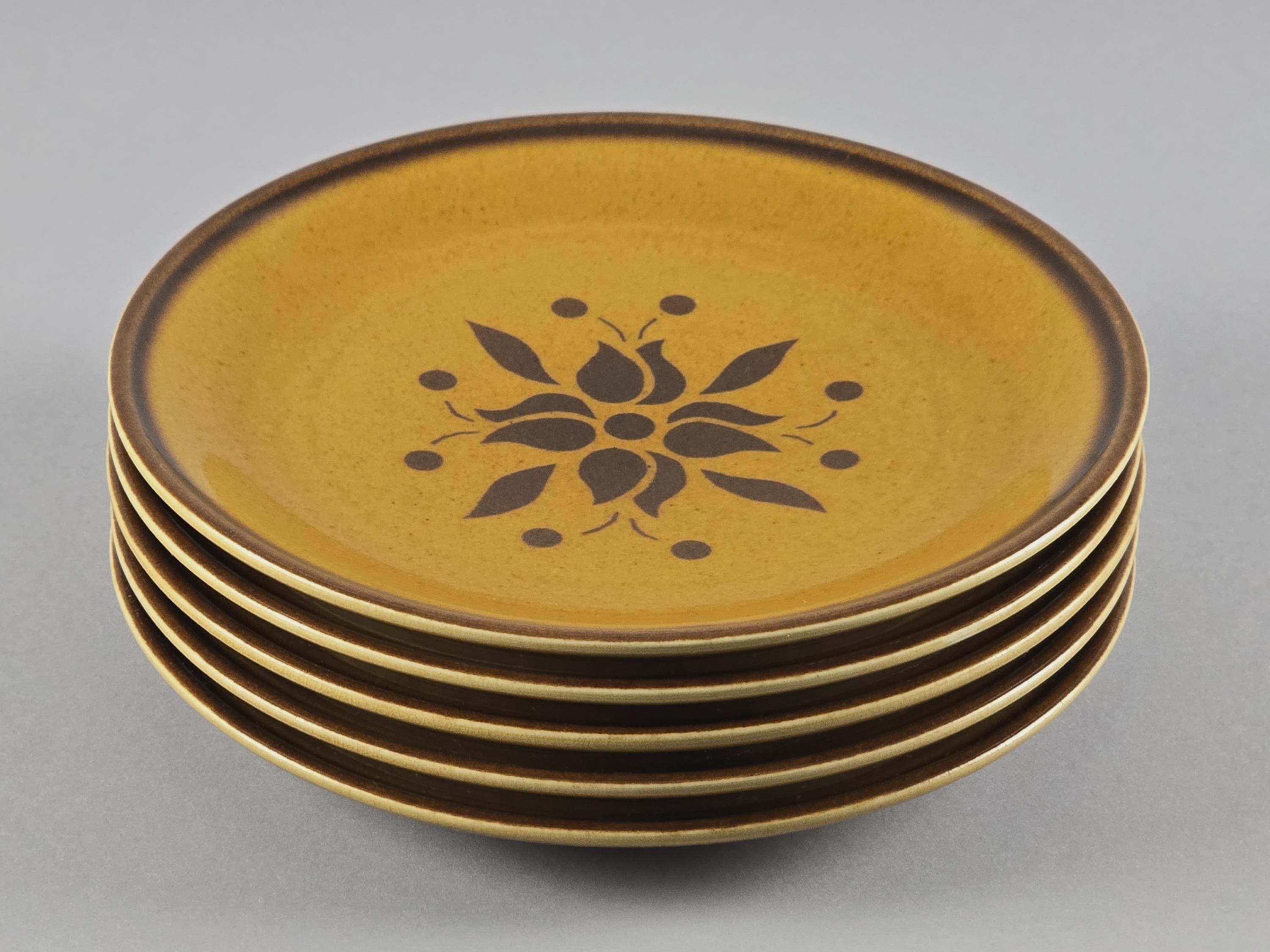 Vintage 1970s set of 5 tan stoneware plates with concentric rings around the rim in dark brown, with retro floral design.