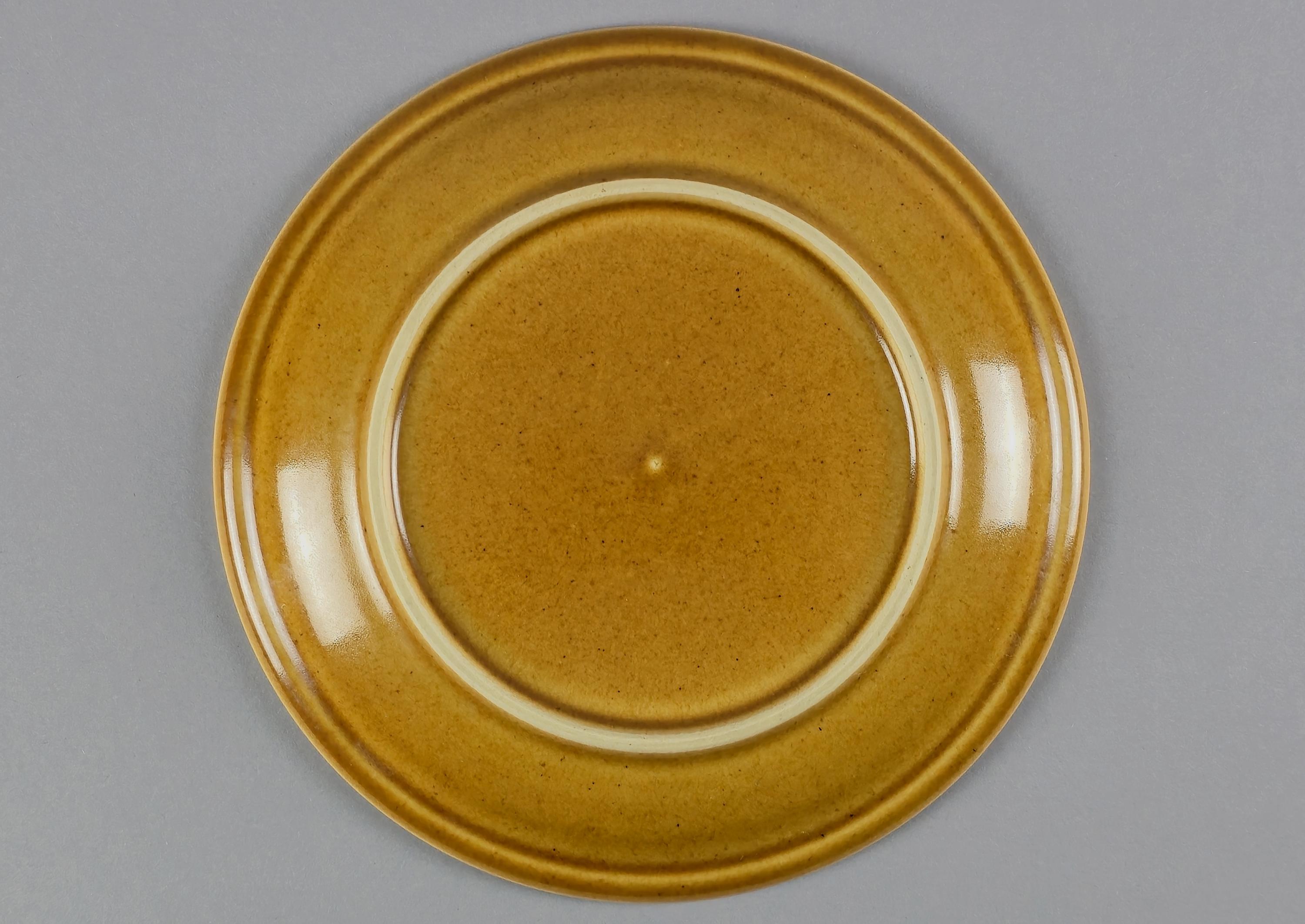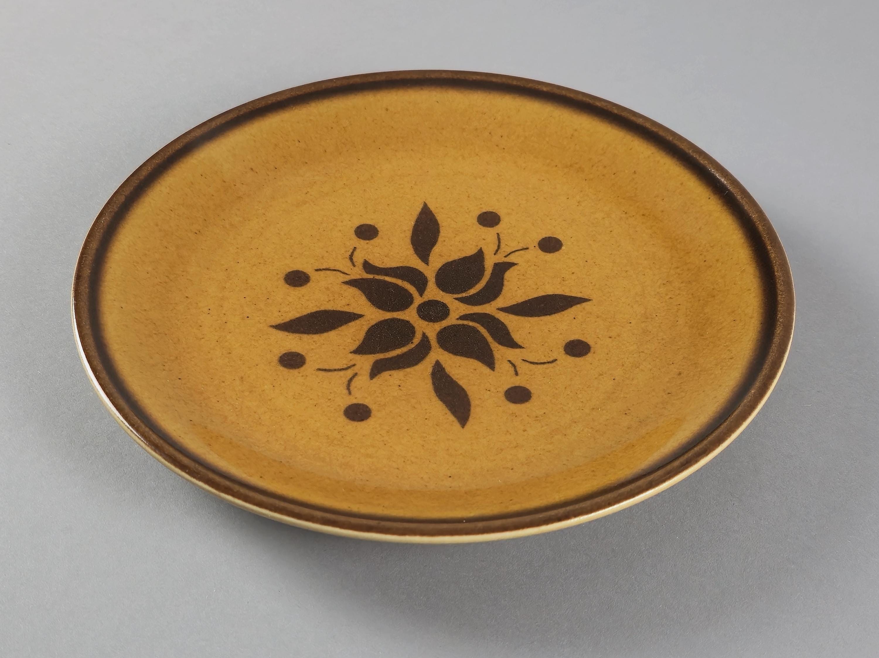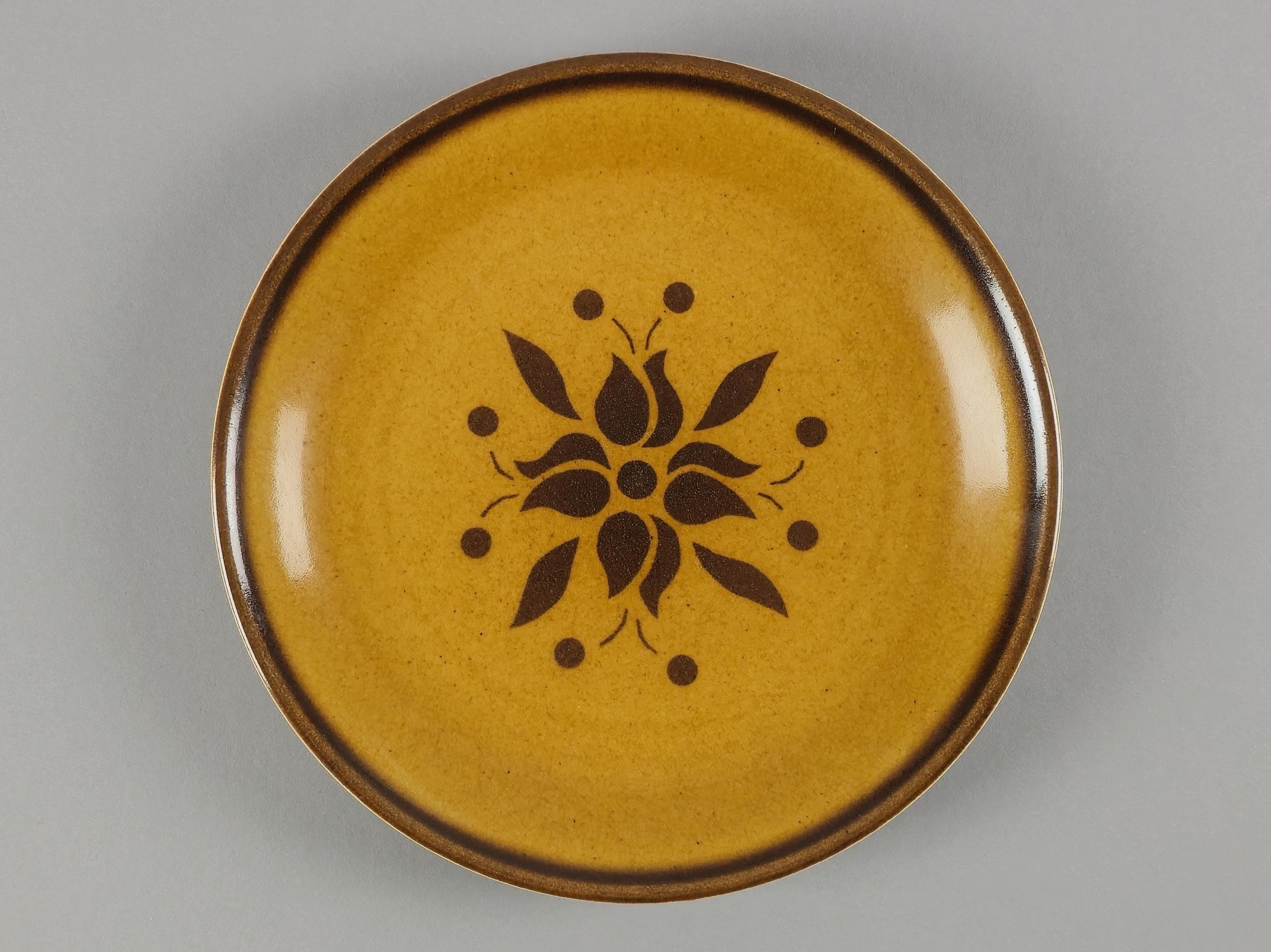 Vintage 1970s set of 5 tan stoneware plates with concentric rings around the rim in dark brown, with retro floral design.