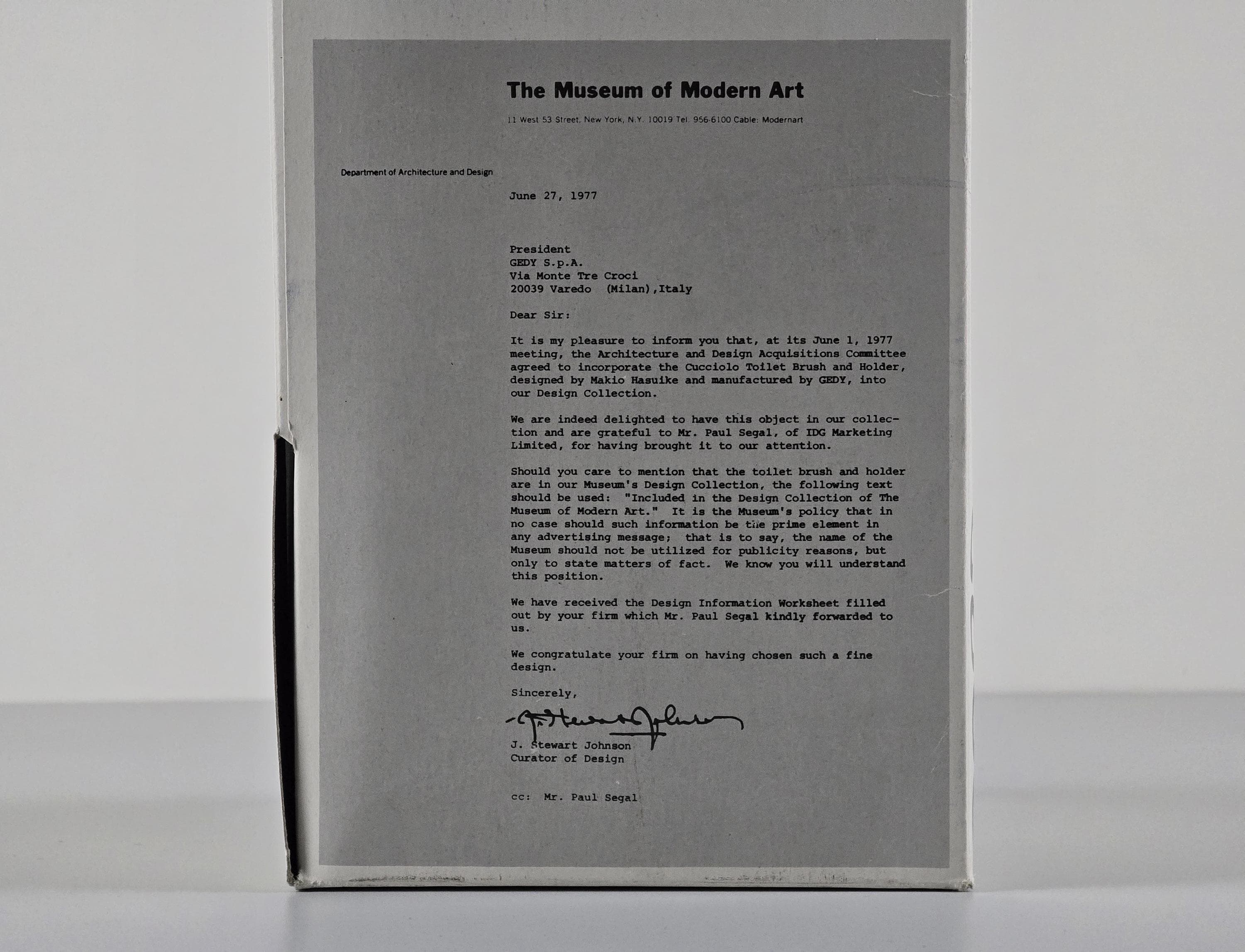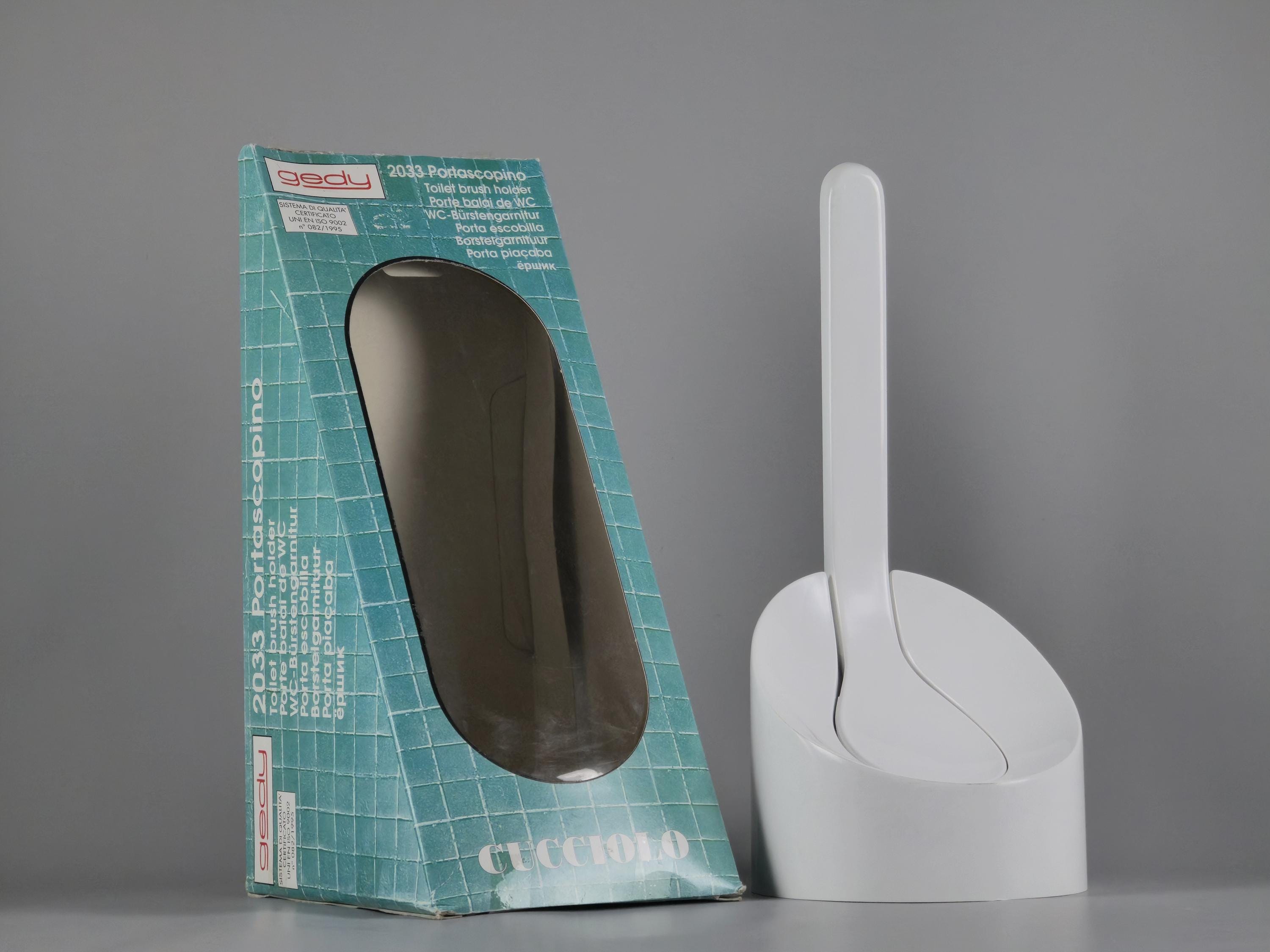 New in box vintage white plastic toilet brush holder Cucciolo from the 1970s by Makio Hasuike for Gedy Italy. Part of the New York MoMA permanent design collection.