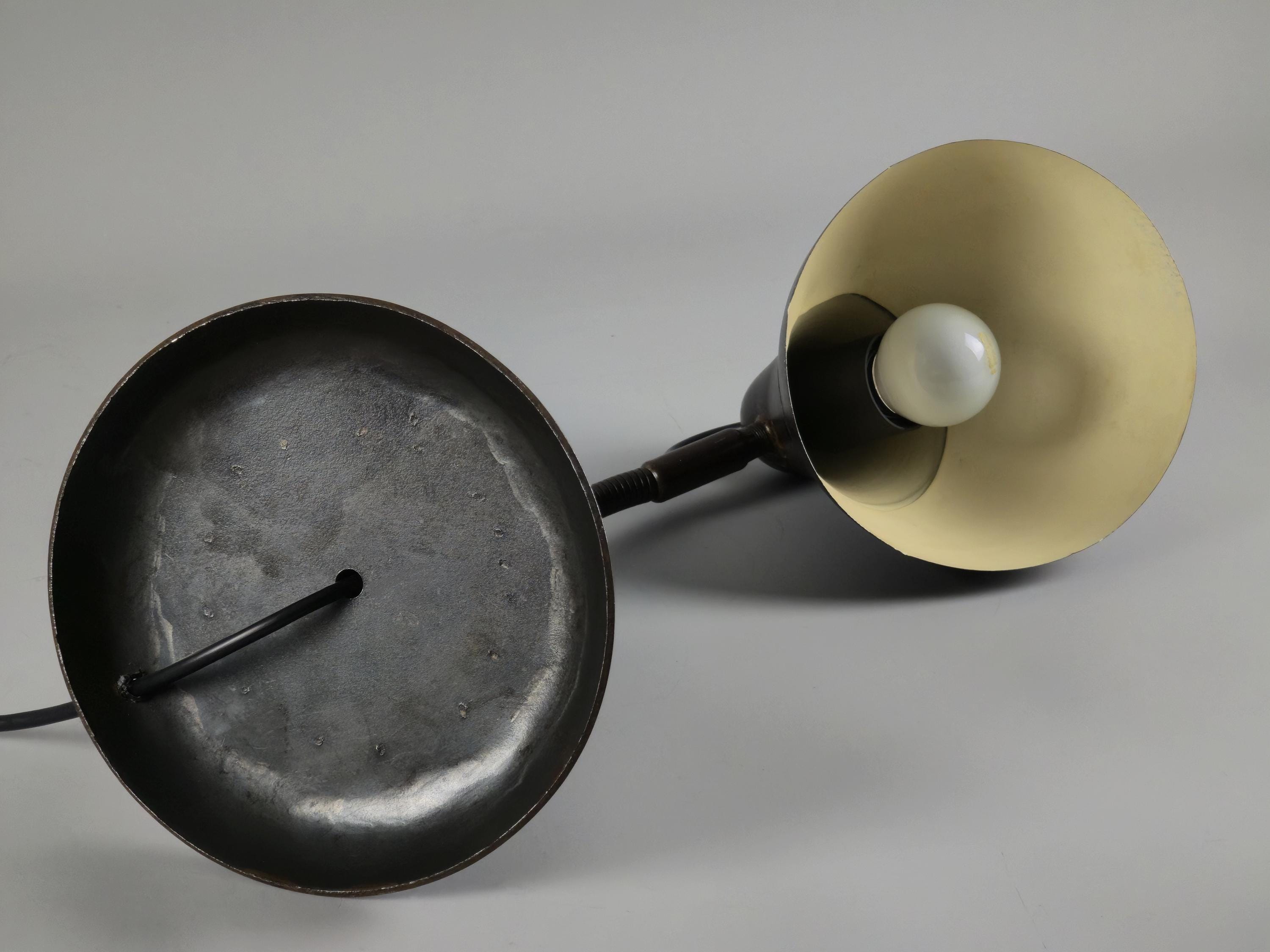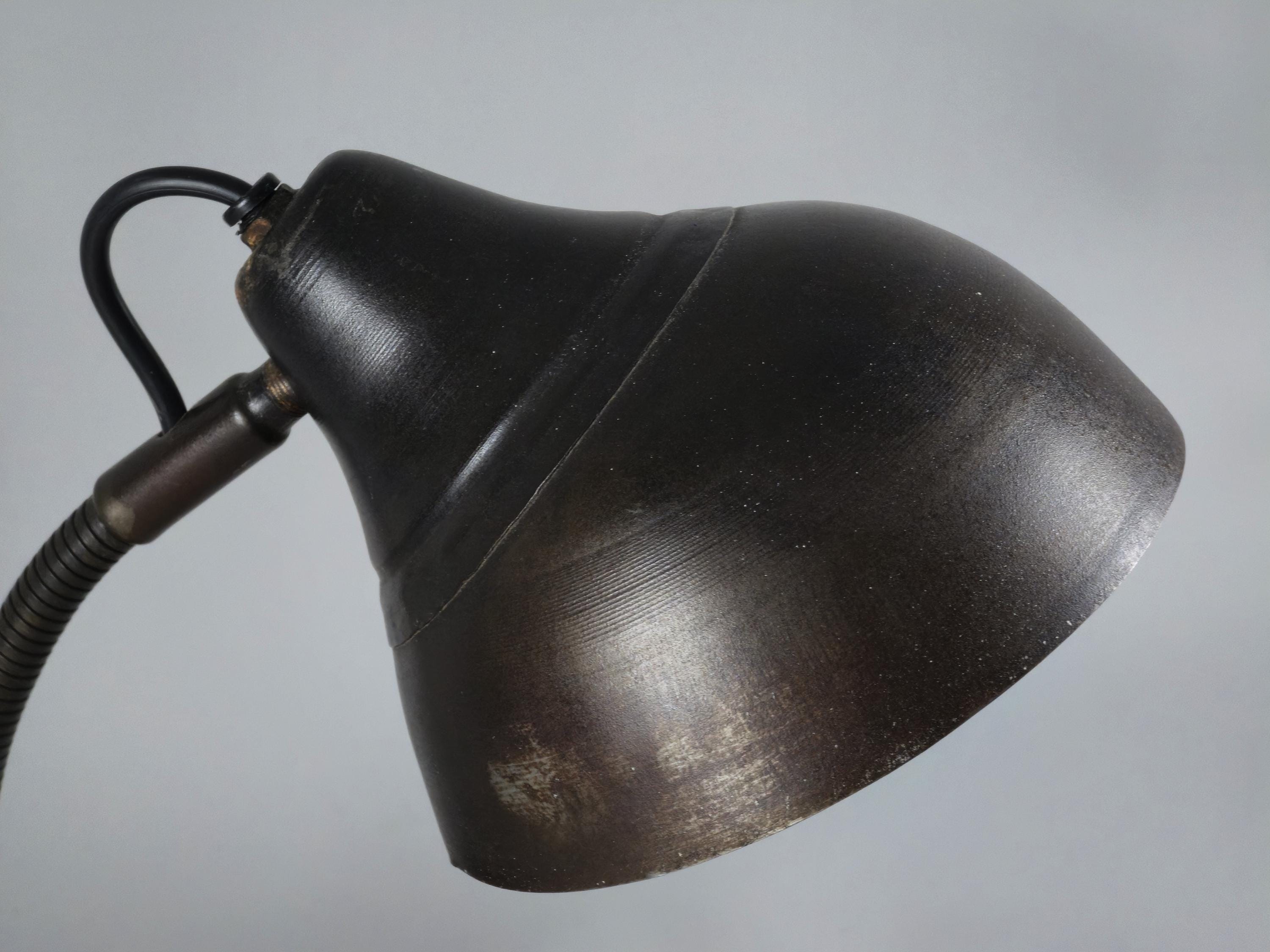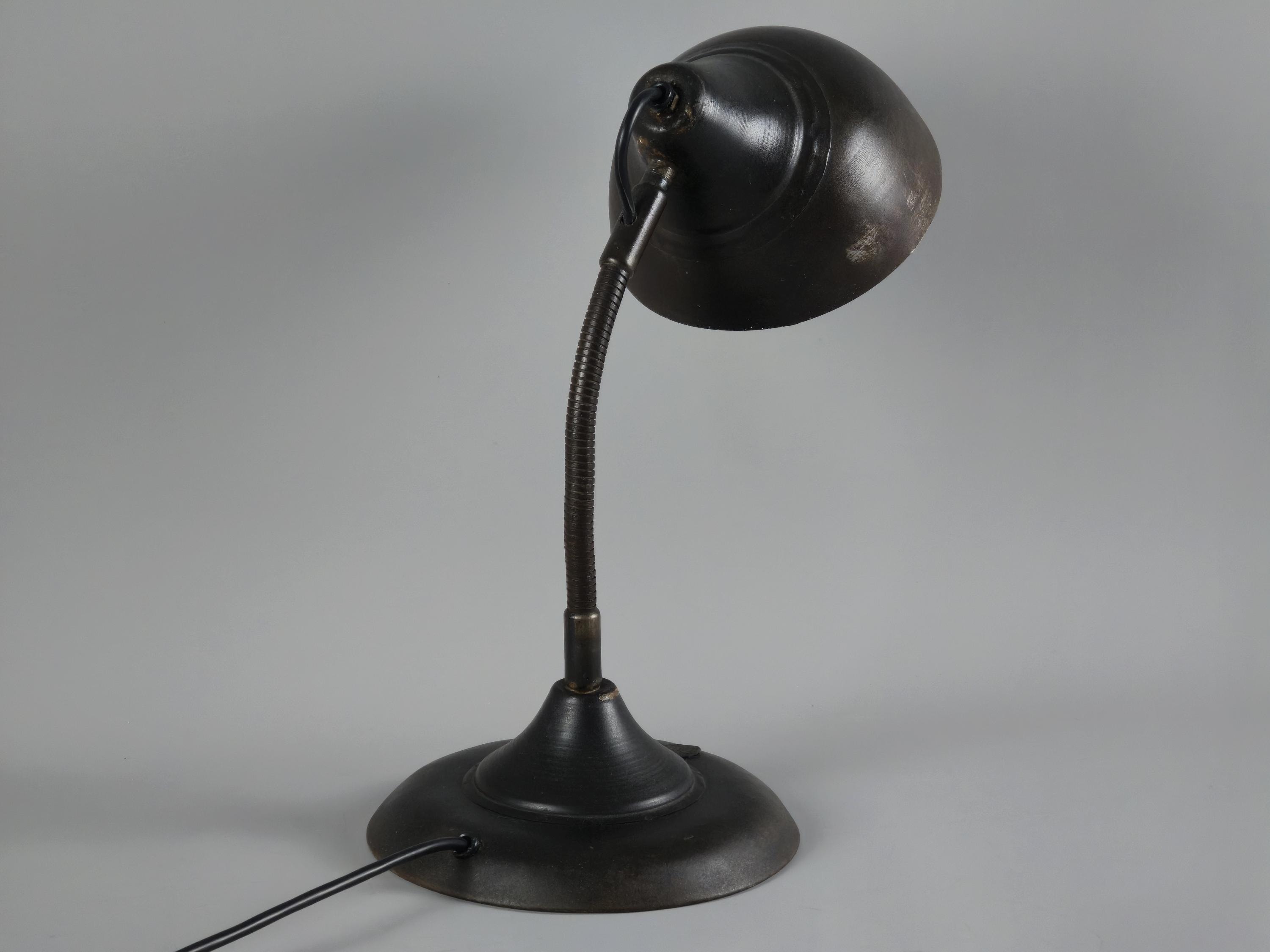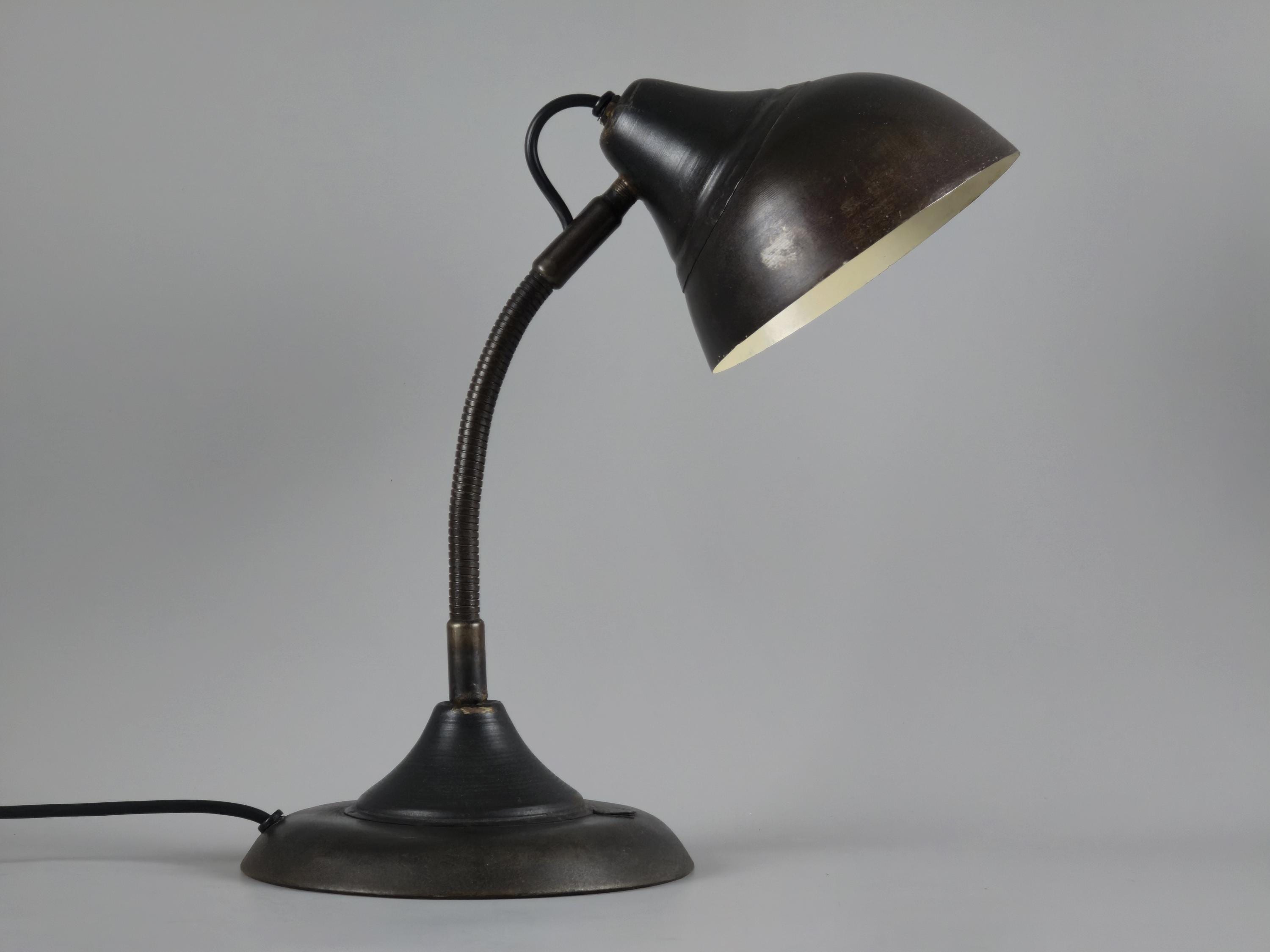 Authentic 1940s French industrial desk lamp with a timeless, functional design. The lamp is made of a solid metal base, an adjustable gooseneck arm, and a curved steel shade in dark brown-black with a warm patina.