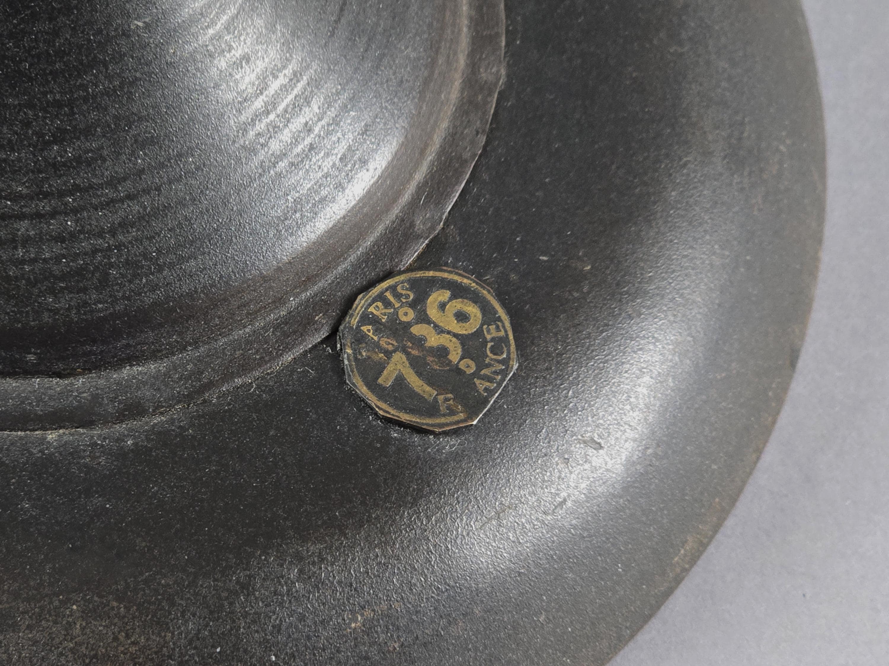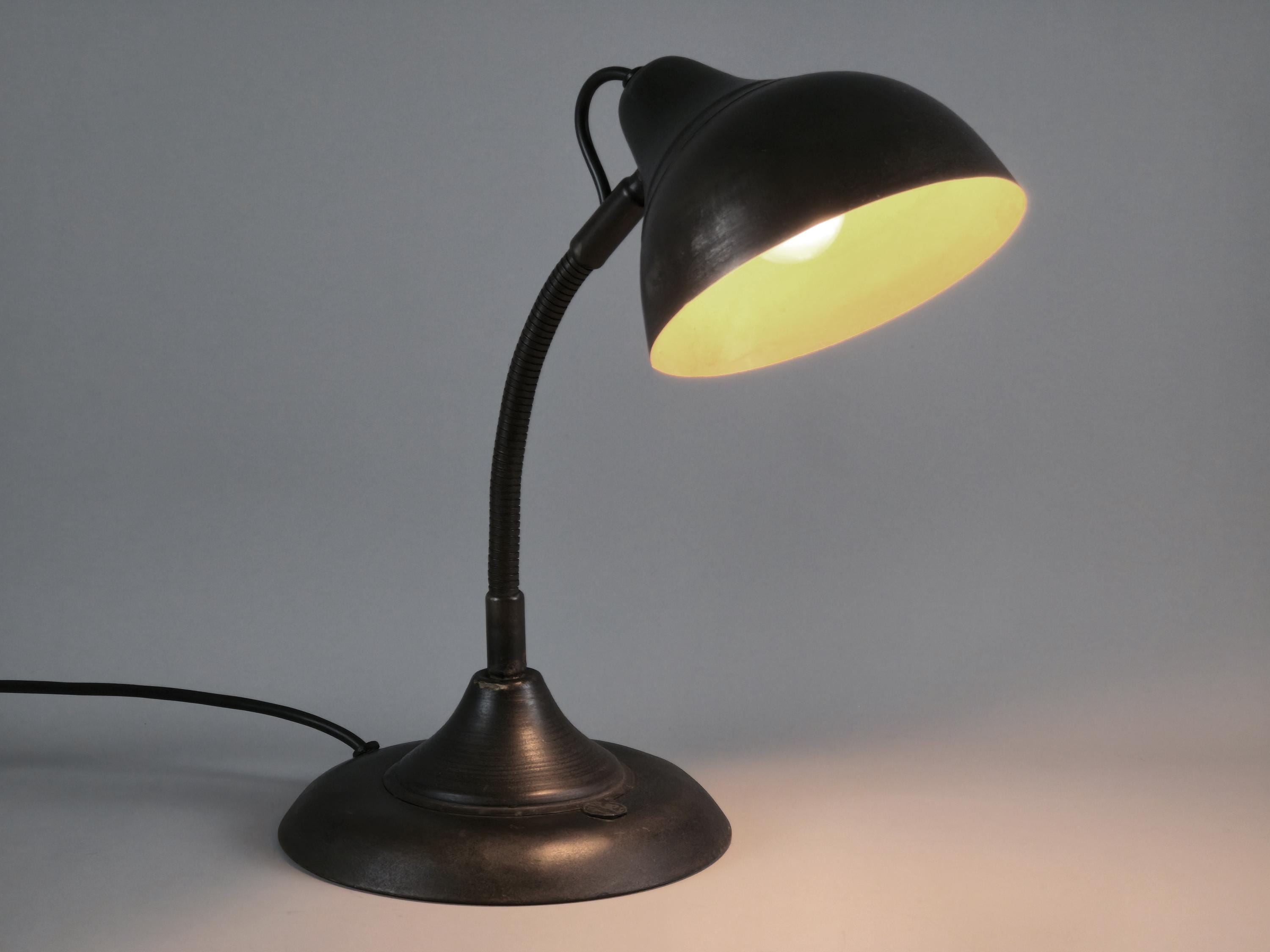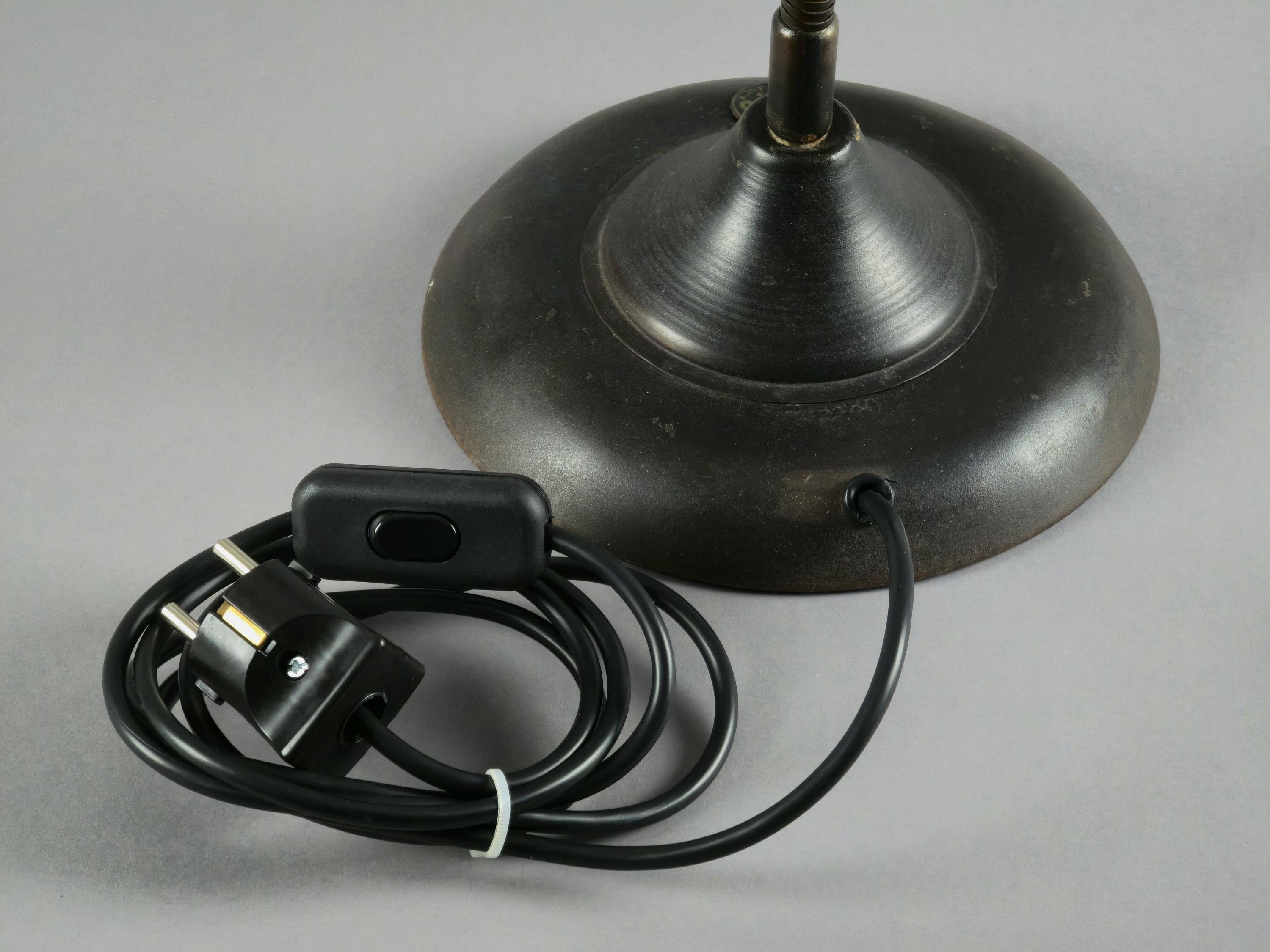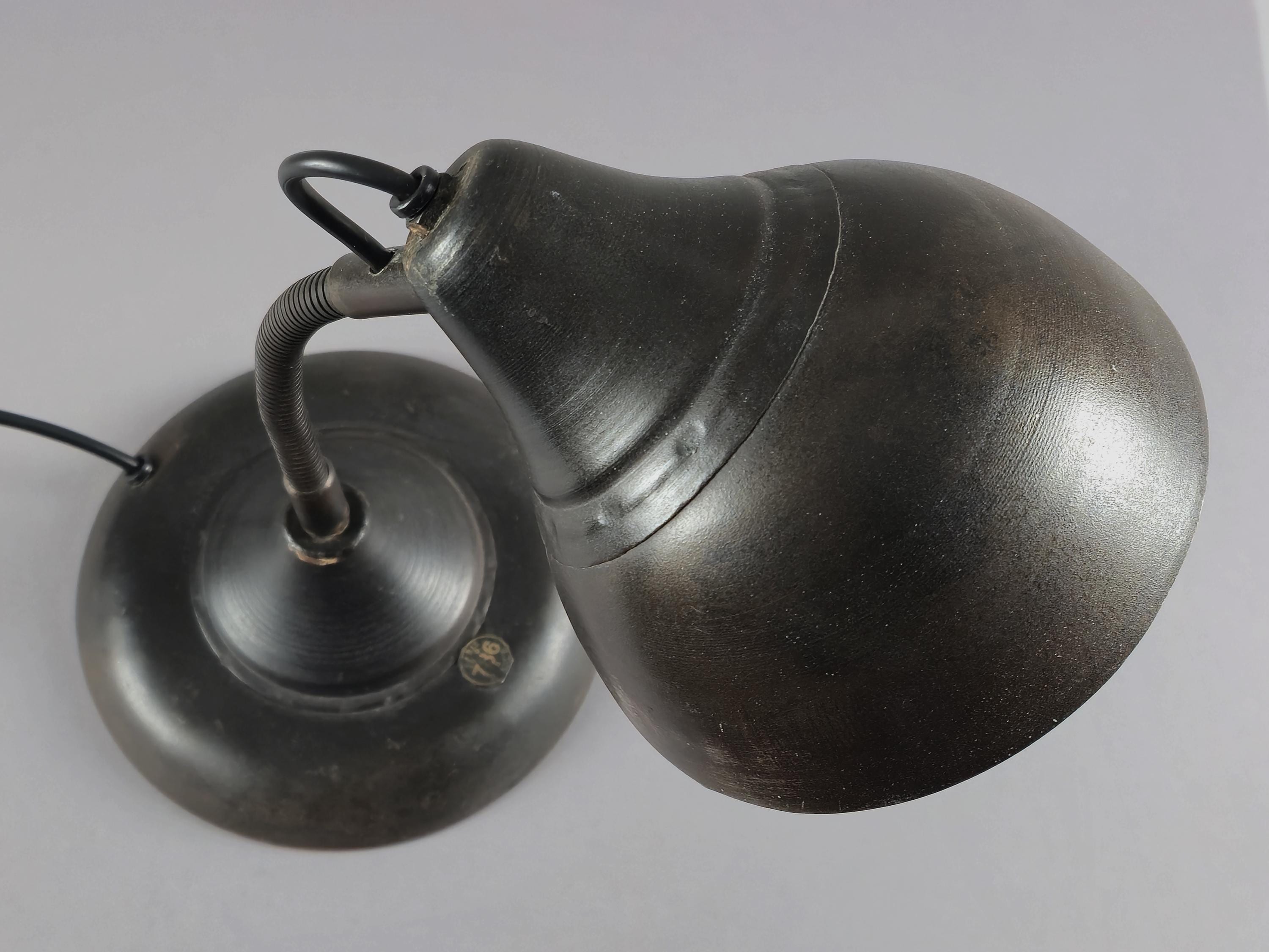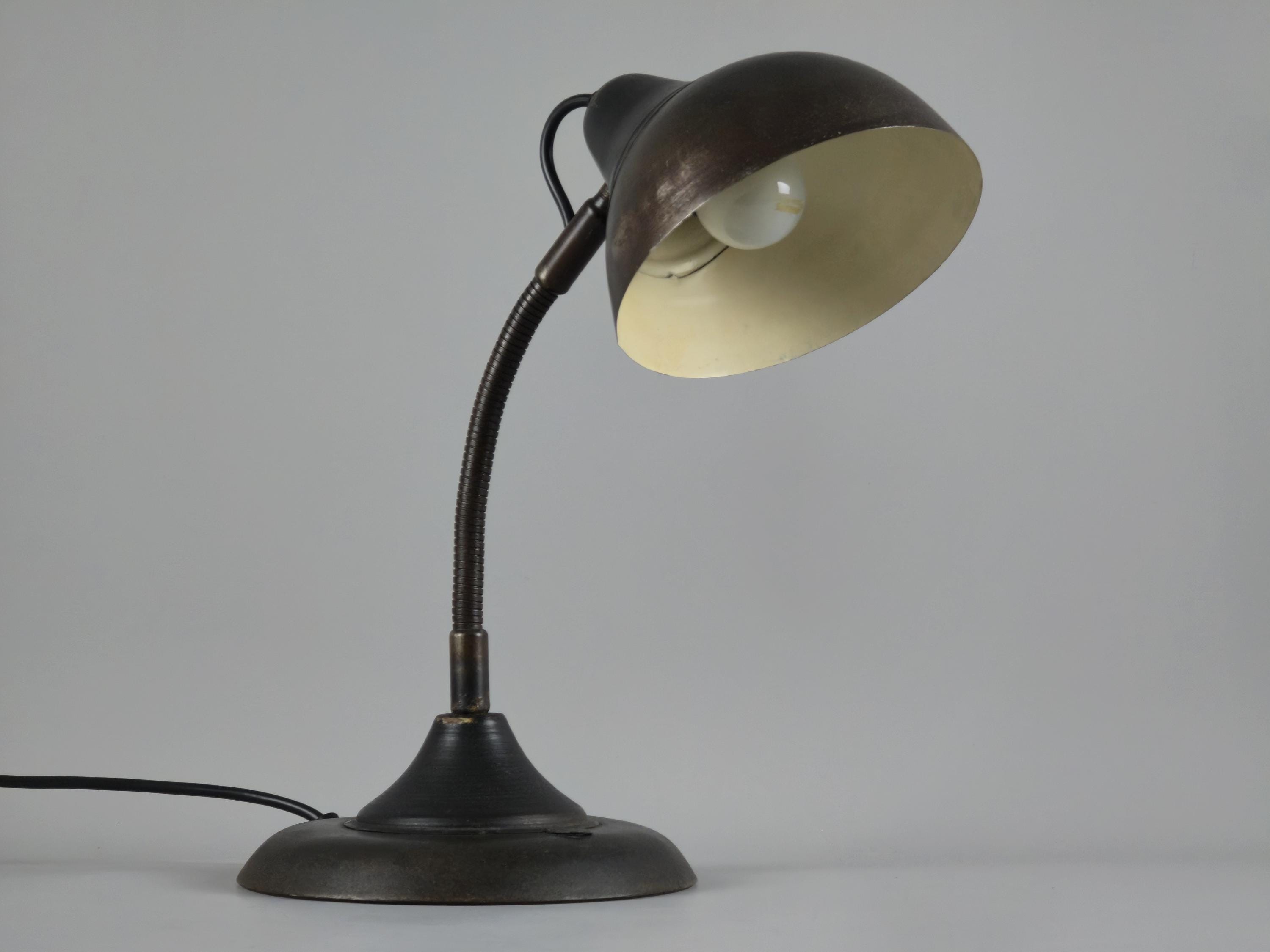 Authentic 1940s French industrial desk lamp with a timeless, functional design. The lamp is made of a solid metal base, an adjustable gooseneck arm, and a curved steel shade in dark brown-black with a warm patina.