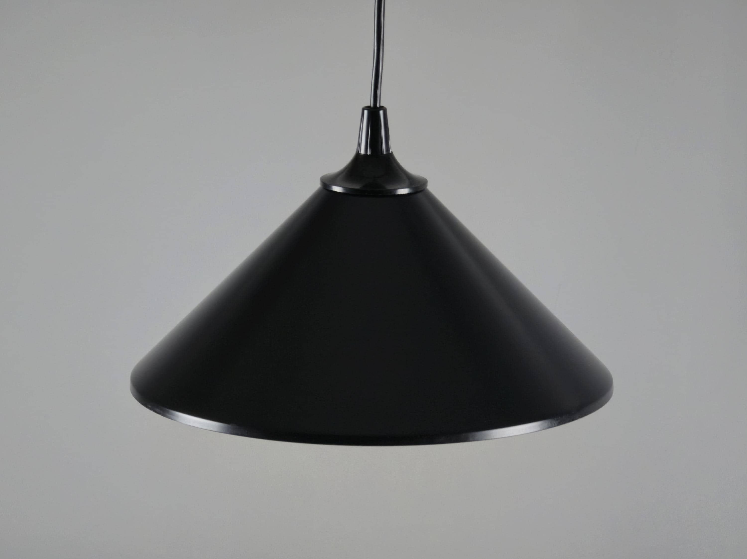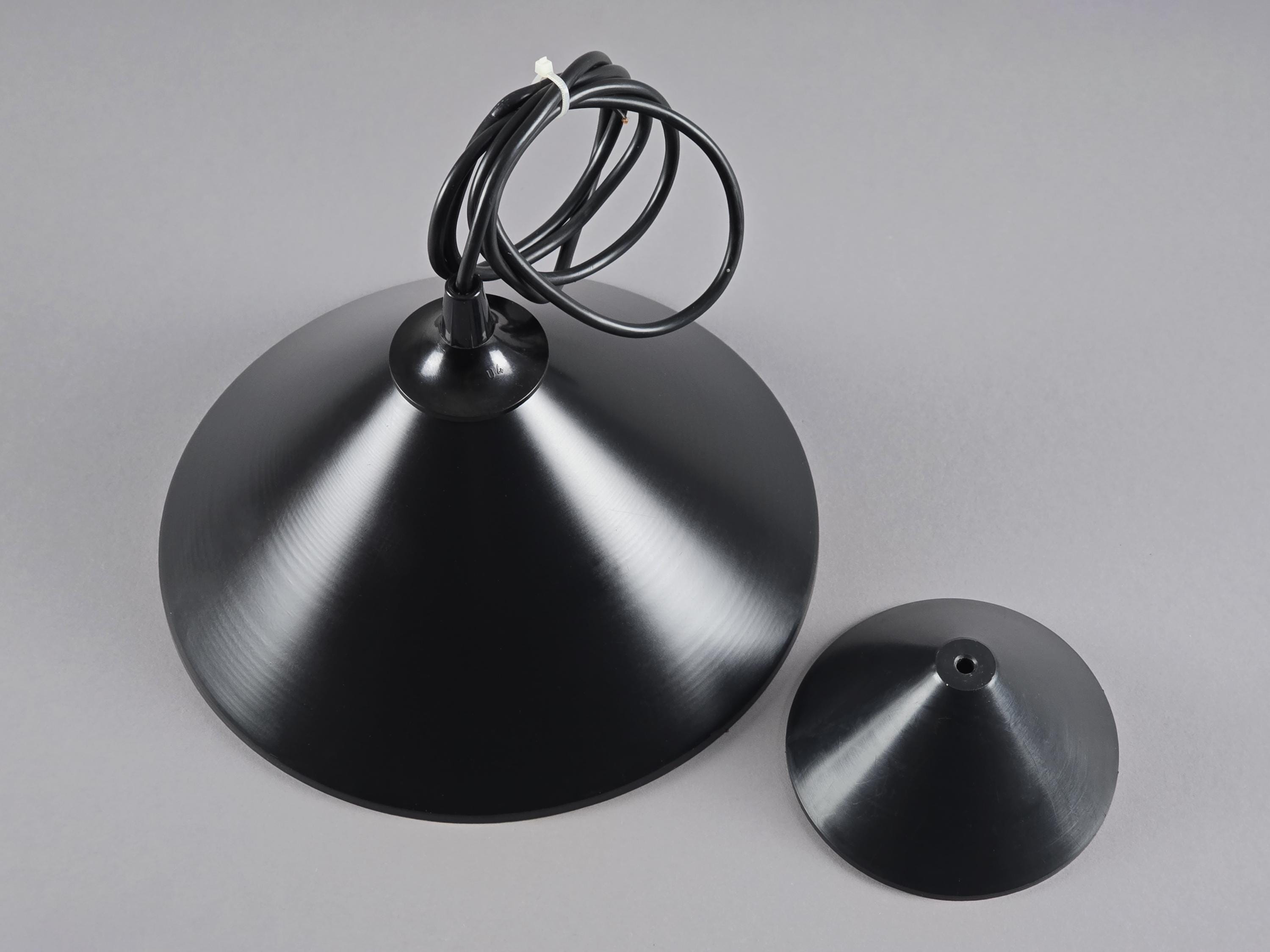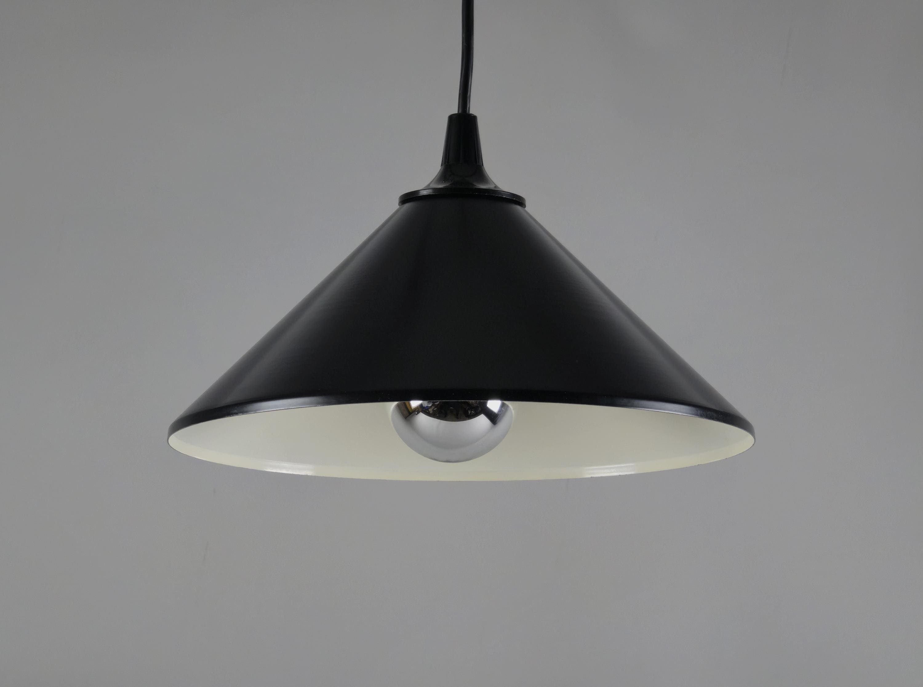 Lovely vintage conical black industrial pendant lamp from the 1980s in excellent condition. With a form rooted in industrial and Bauhaus design, it’s ideal for clean, utilitarian spaces, whether above a kitchen island, dining table, or workspace.