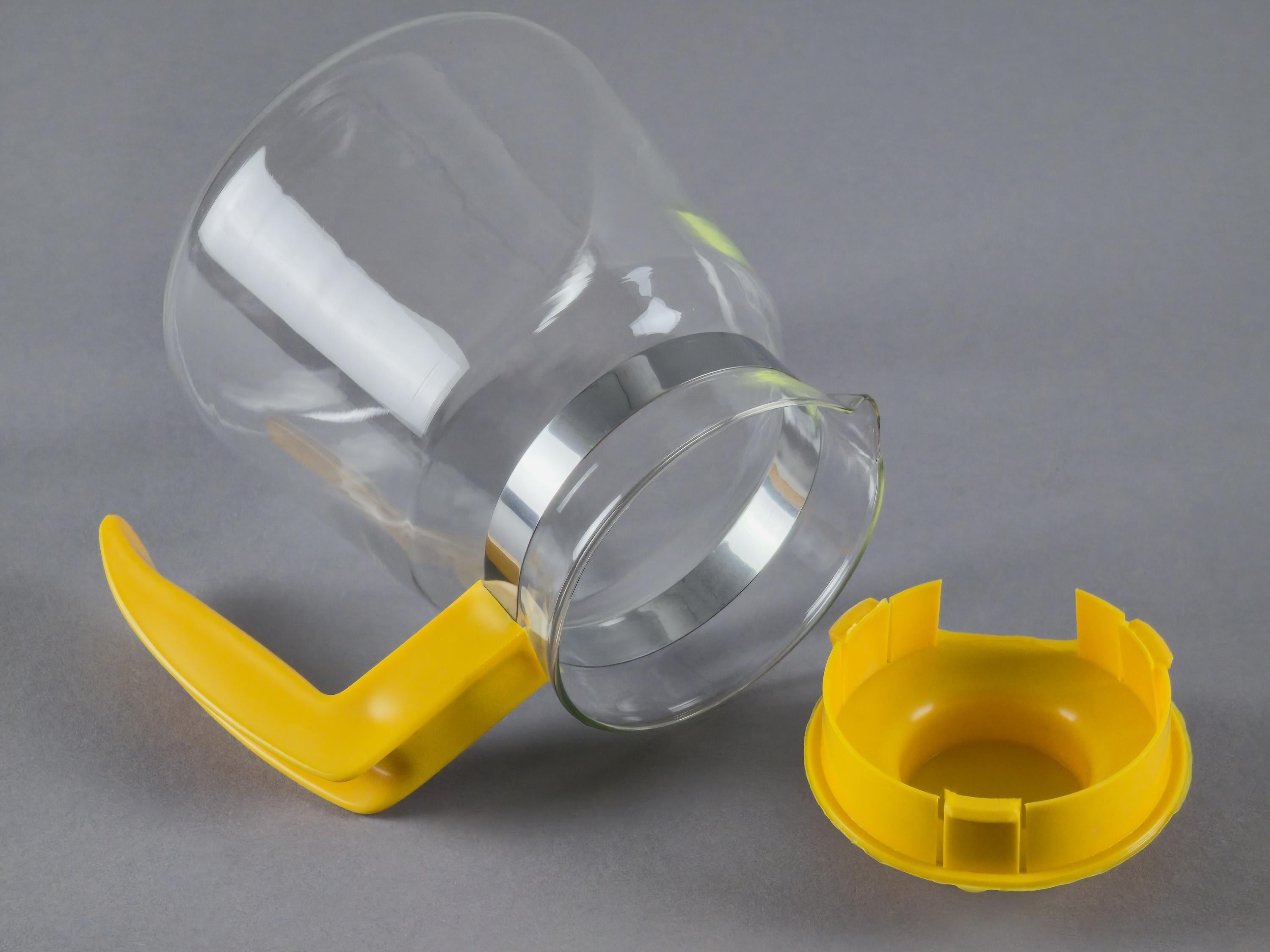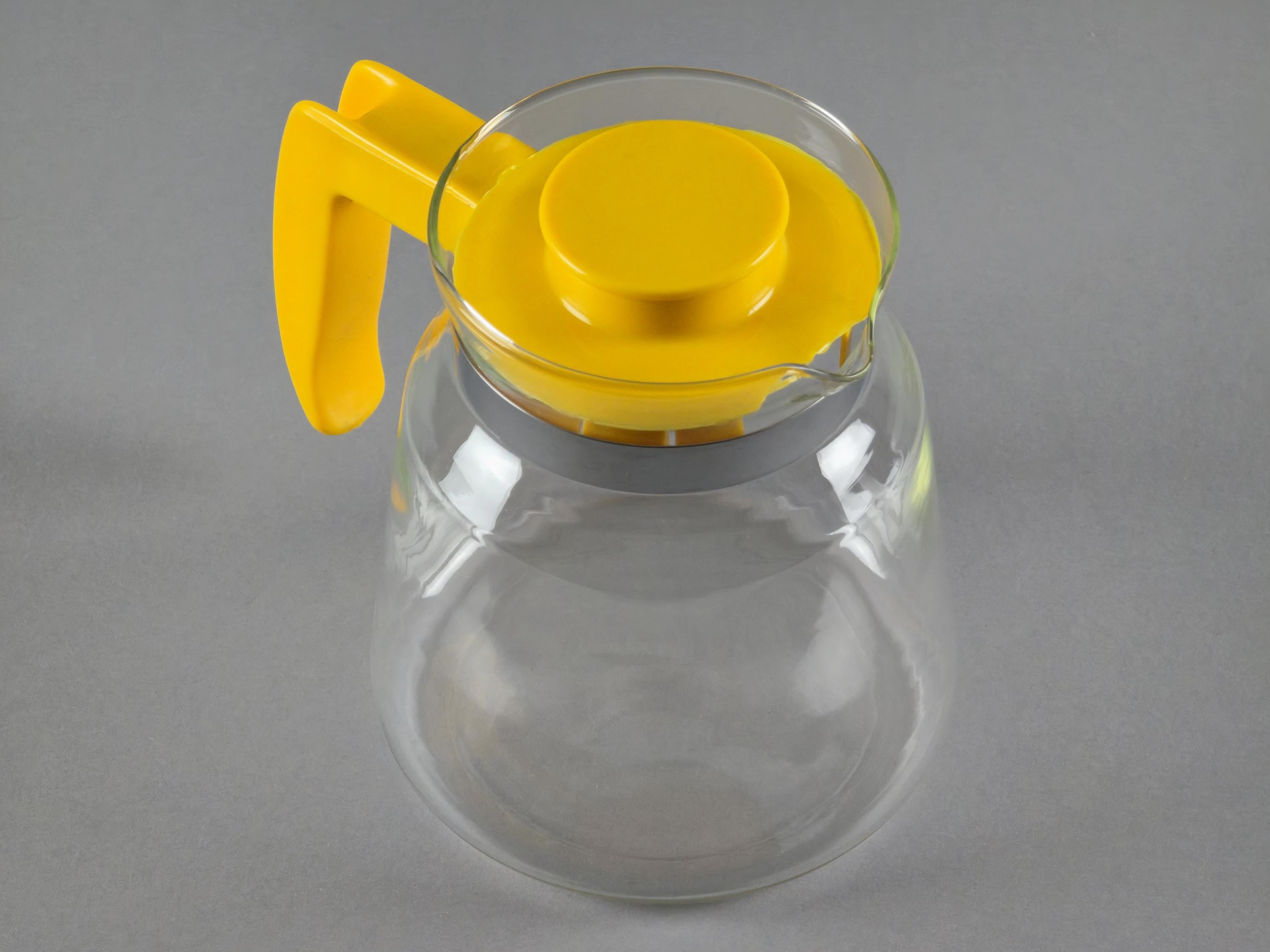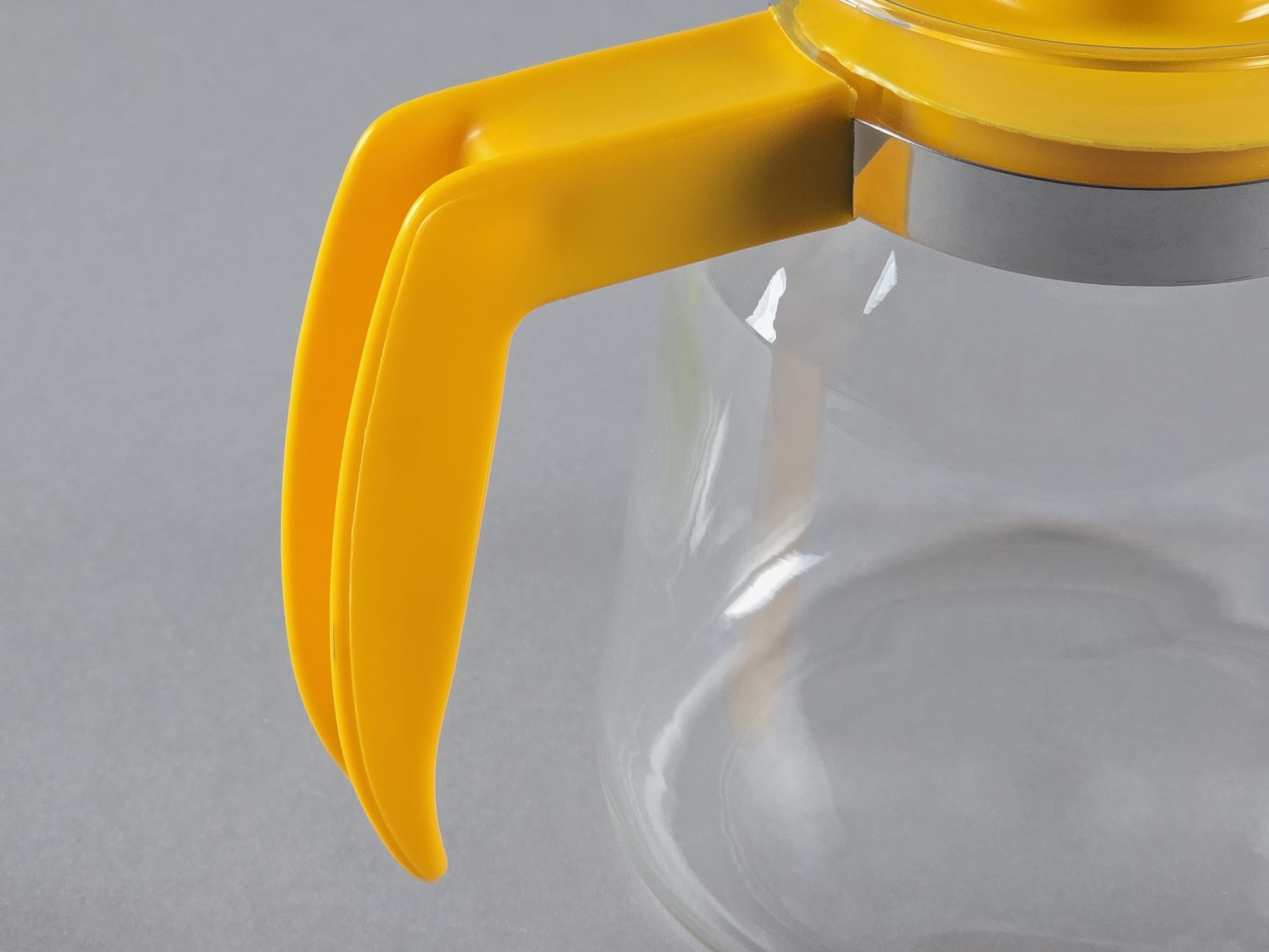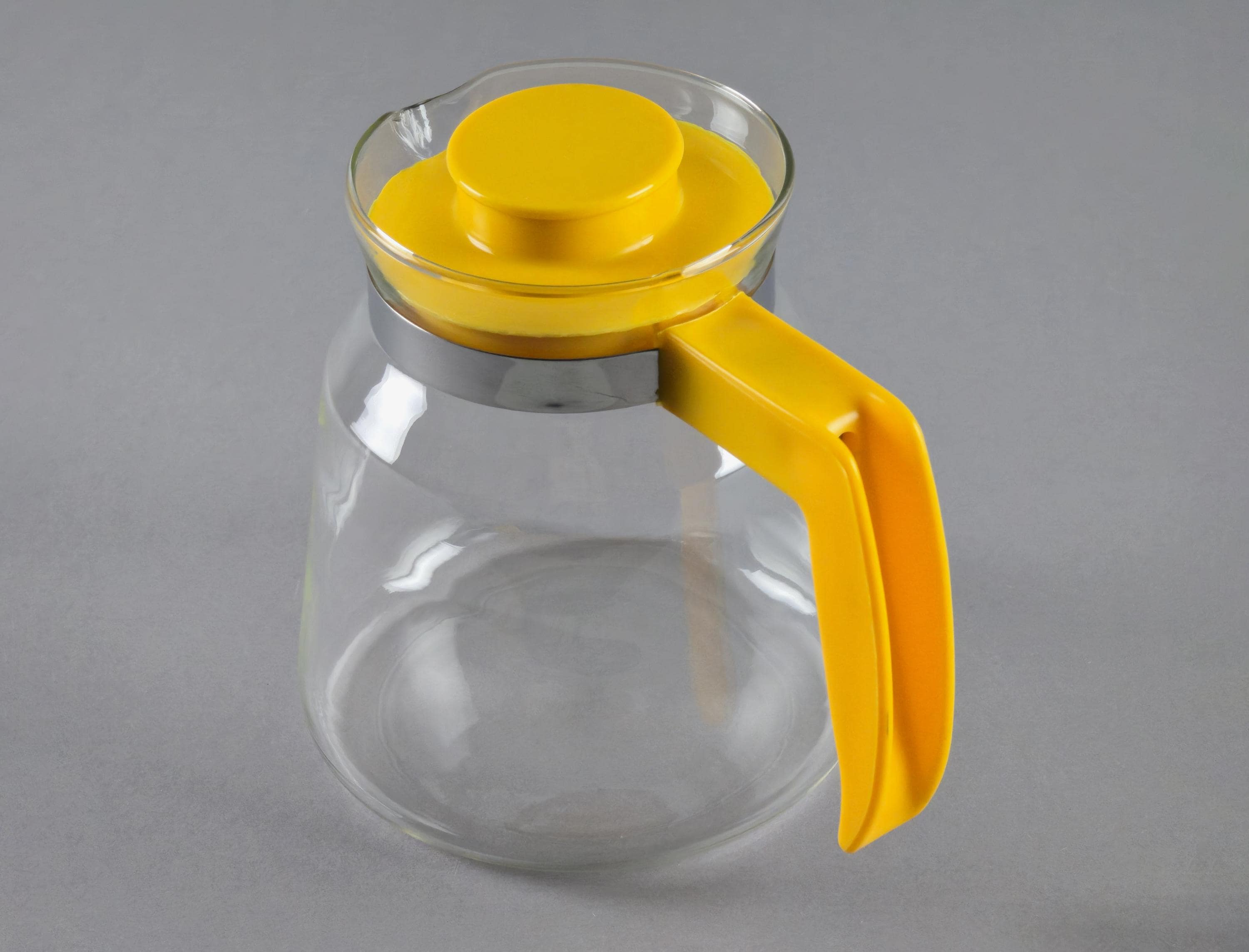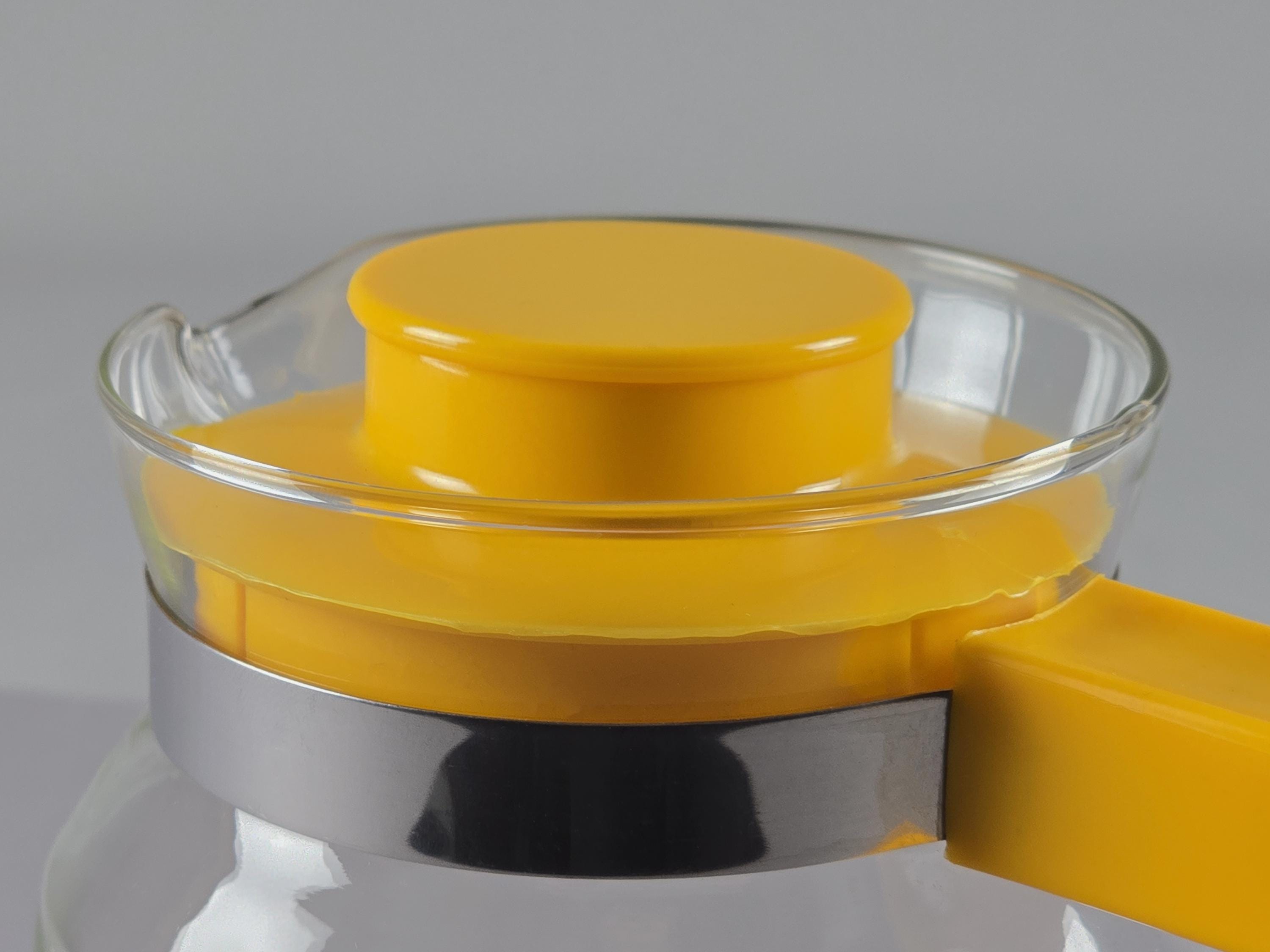 1980s Vintage borosilicate glass coffee and tea carafe with bold yellow plastic handle and lid, and chrome collar.