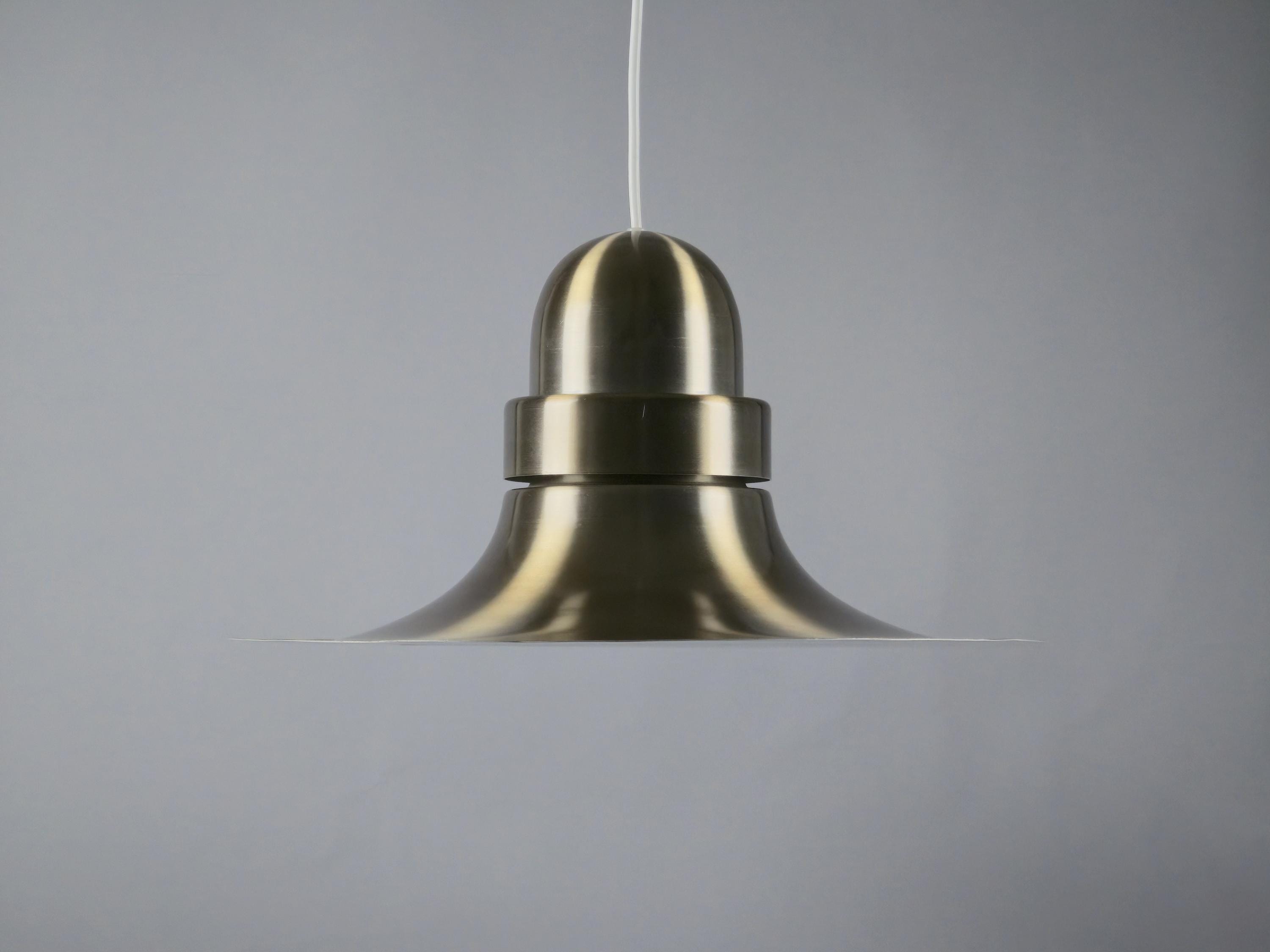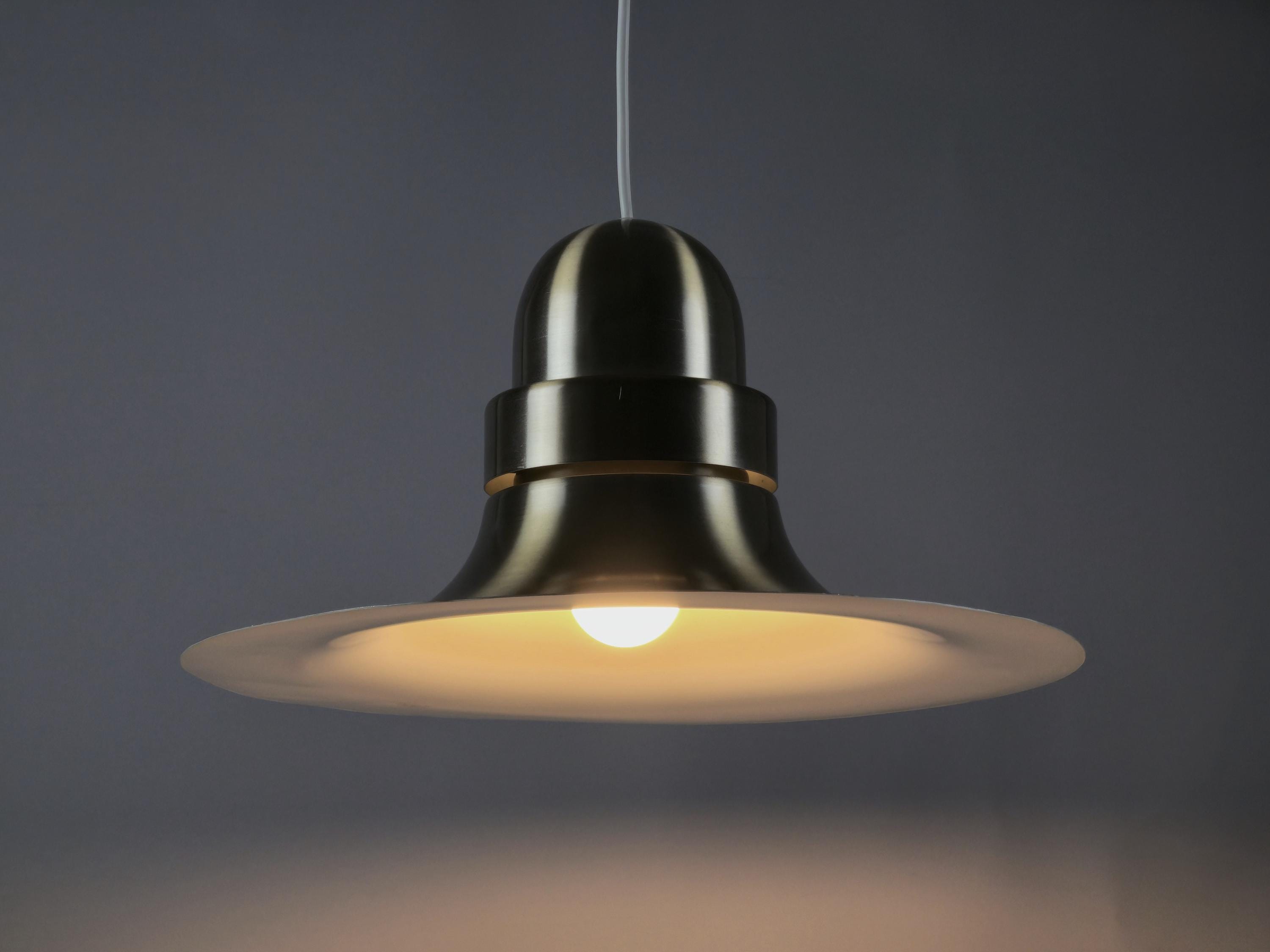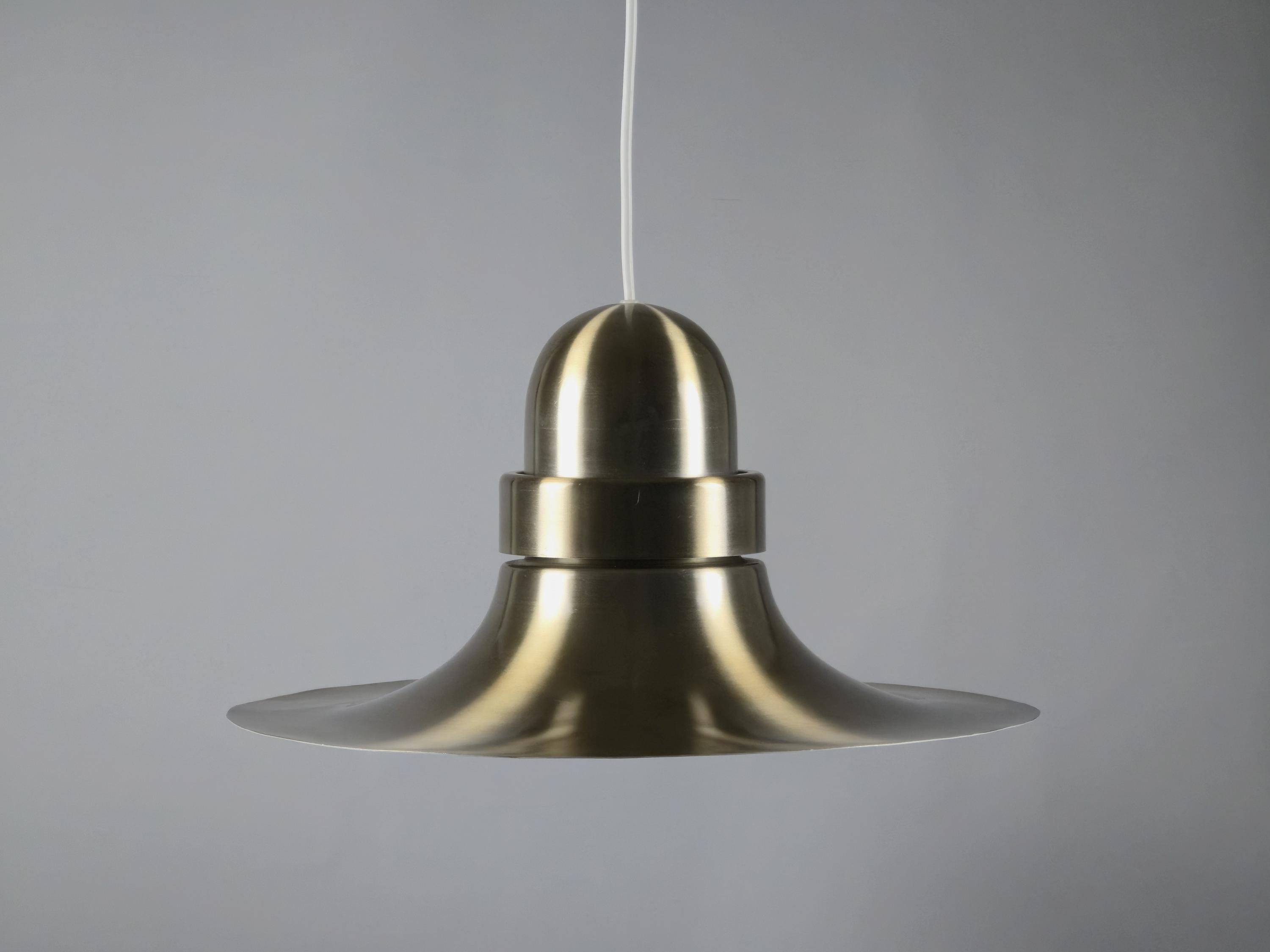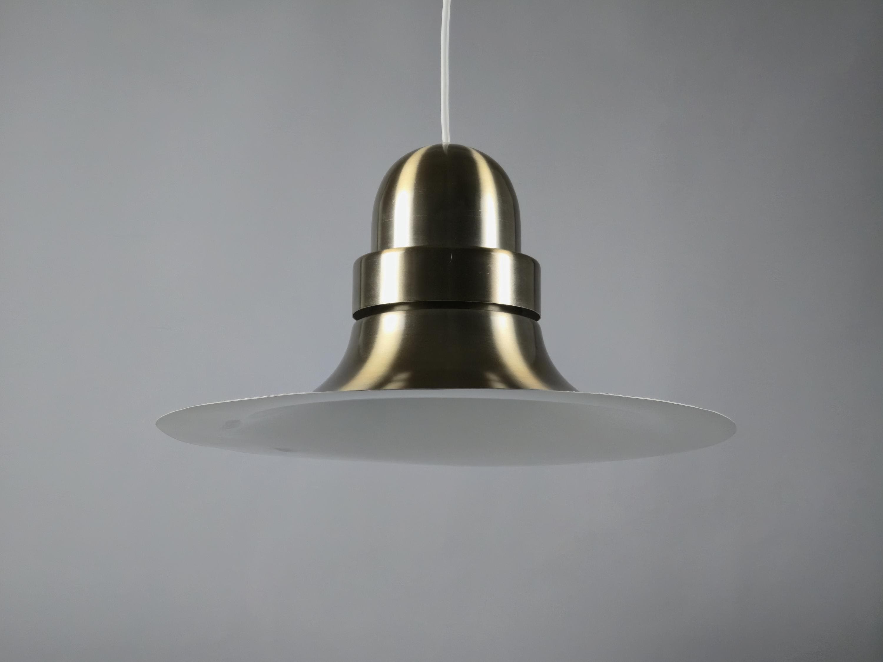 Vintage 1960s mid-century modern pendant lamp by VEB Metalldrücker Halle. This piece reflects the era’s fascination with Scandinavian-inspired design, reminiscent of the work of Johannes Hammerborg, with its clean lines and sculptural metalwork.
