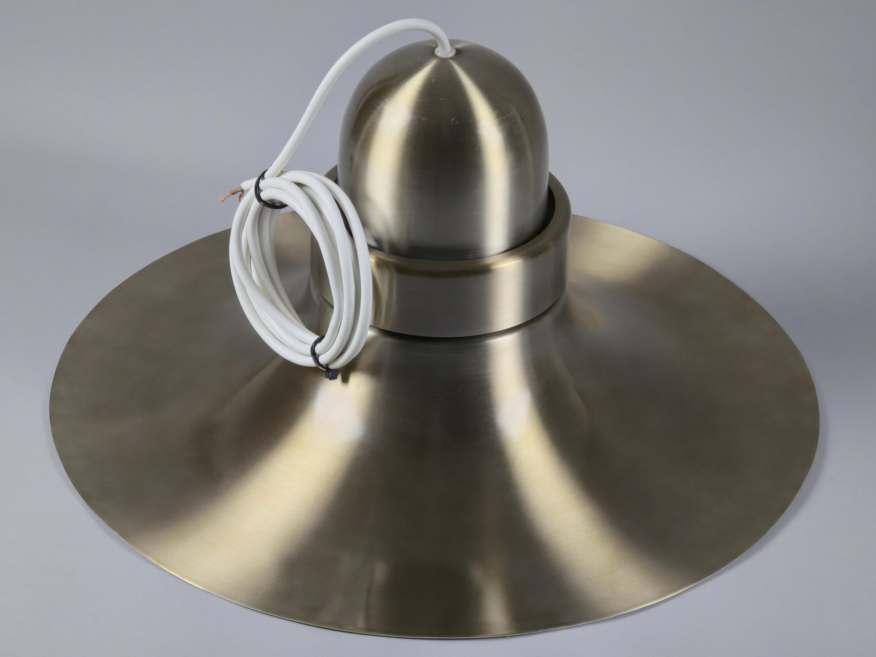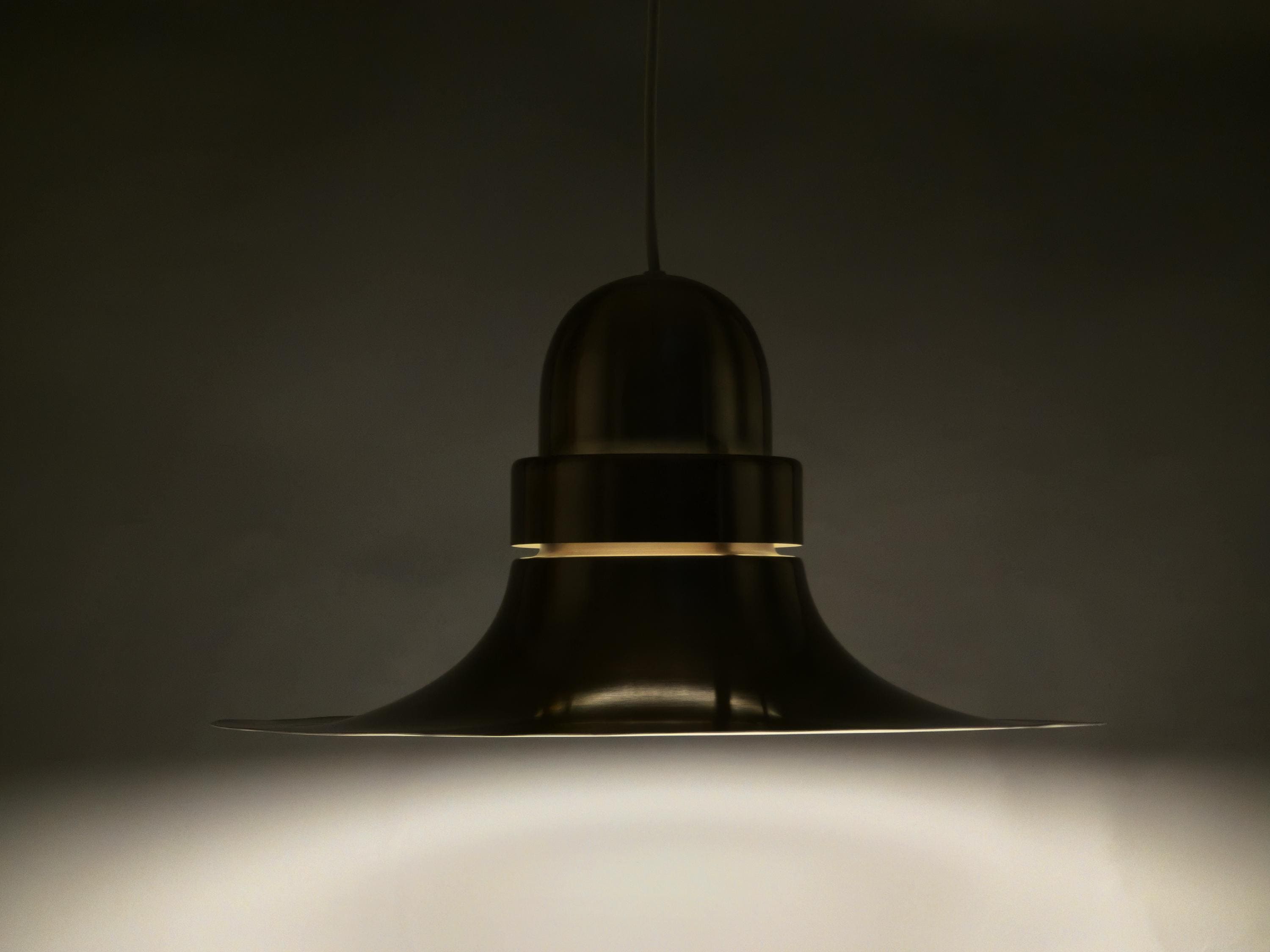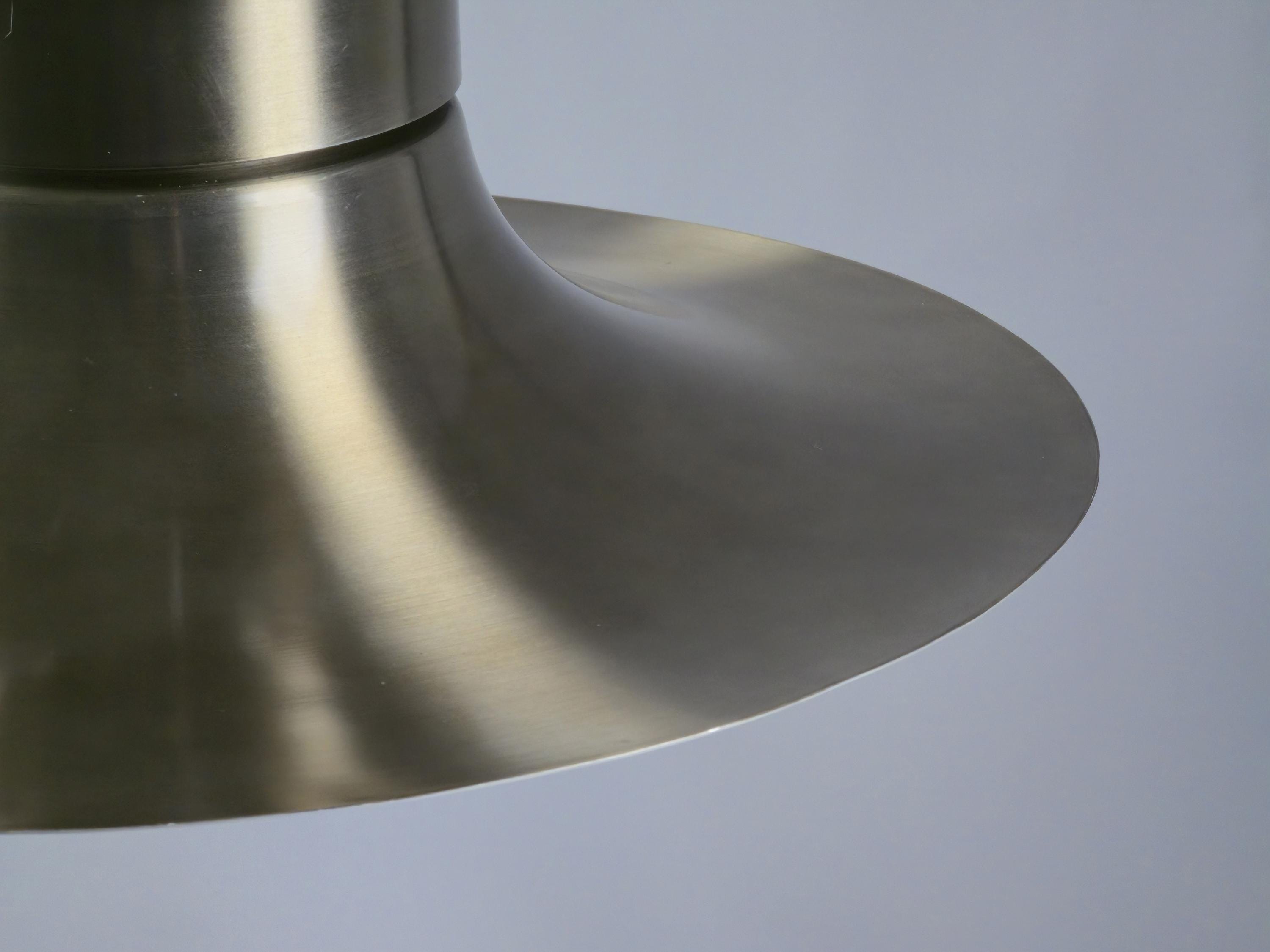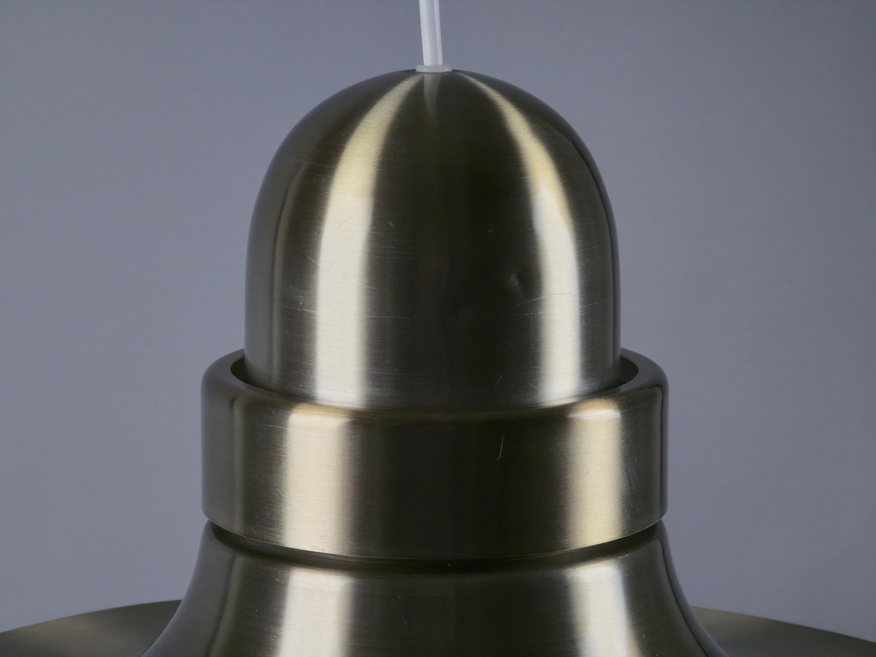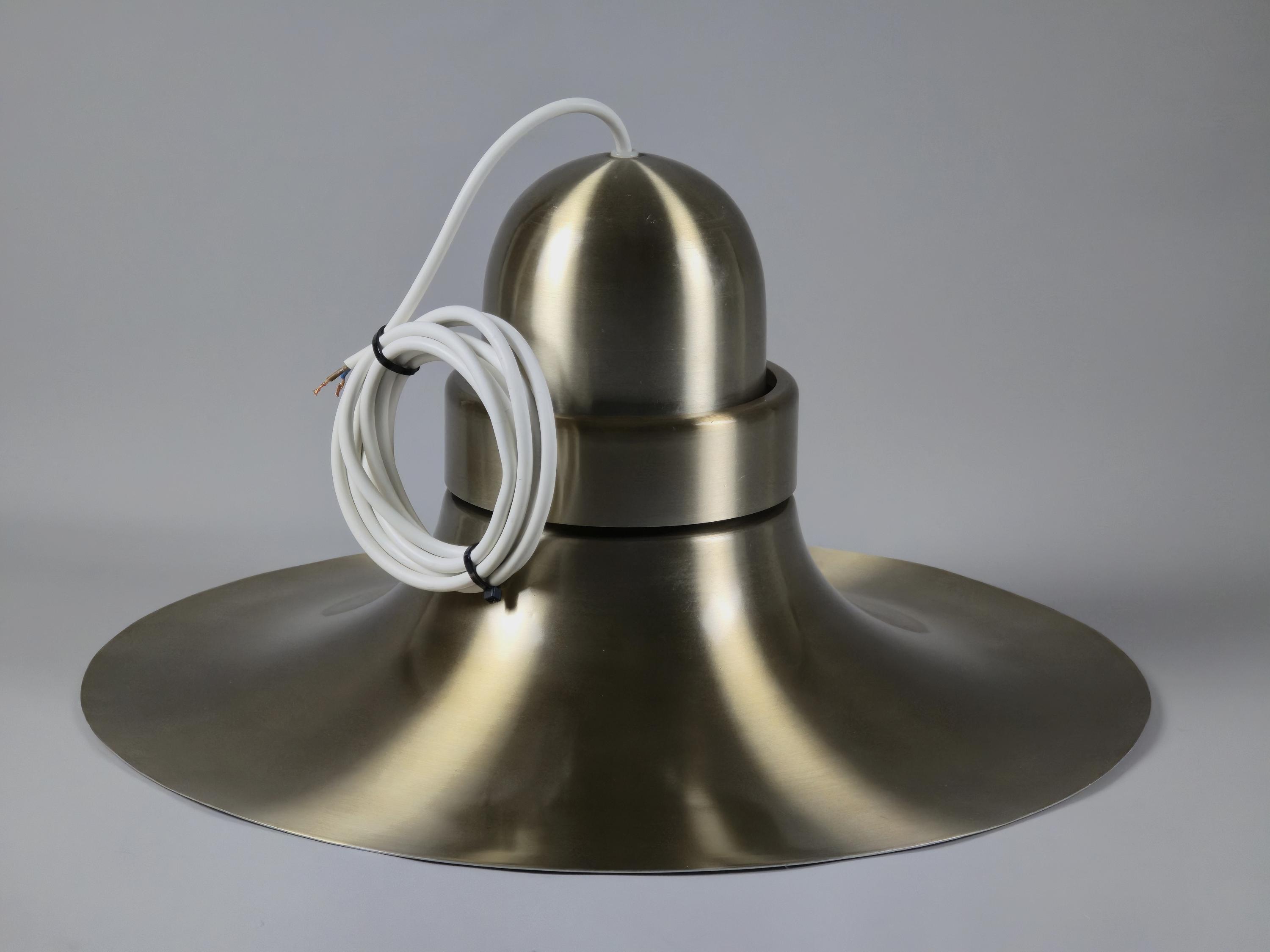 Vintage 1960s mid-century modern pendant lamp by VEB Metalldrücker Halle. This piece reflects the era’s fascination with Scandinavian-inspired design, reminiscent of the work of Johannes Hammerborg, with its clean lines and sculptural metalwork.
