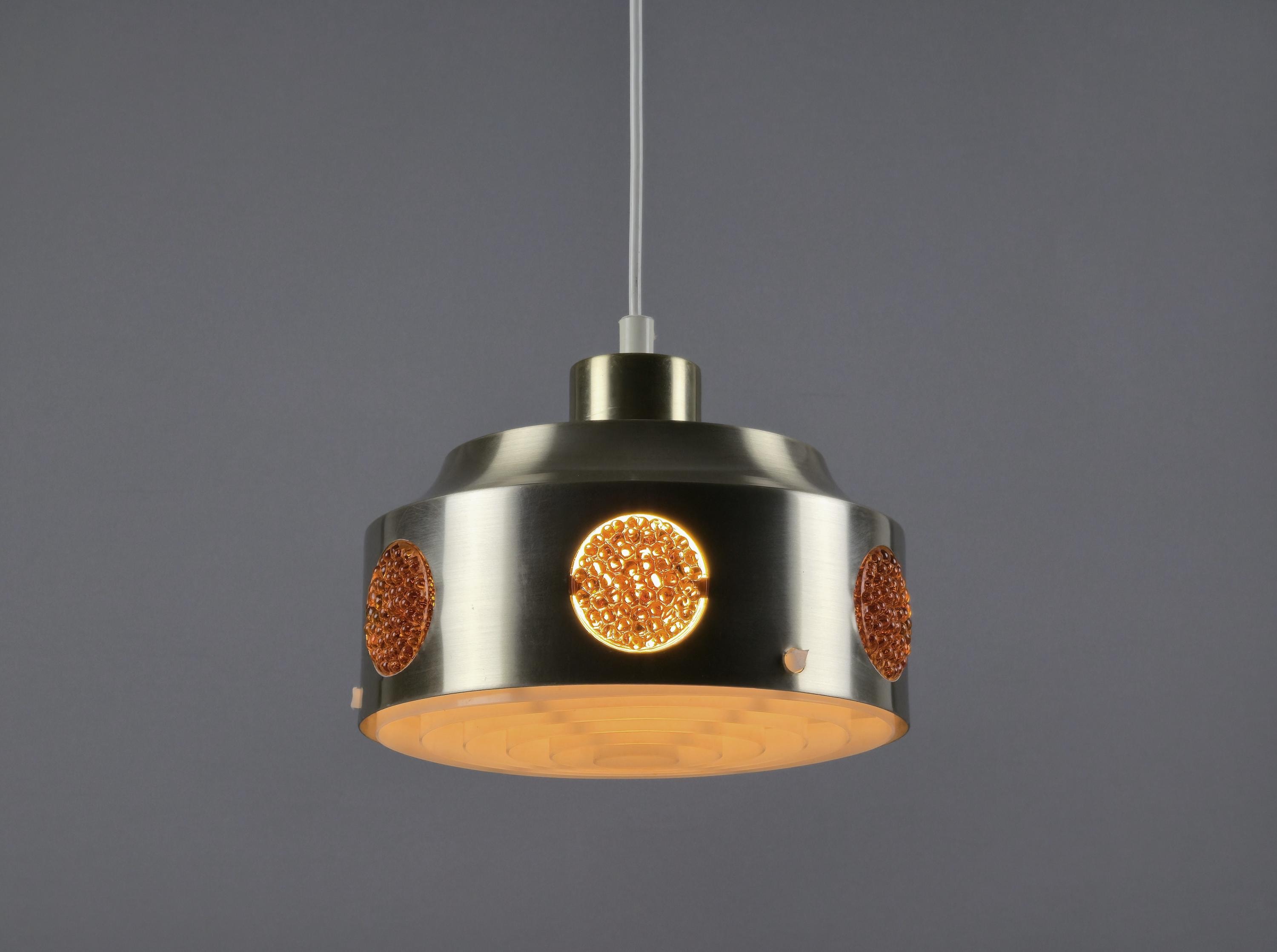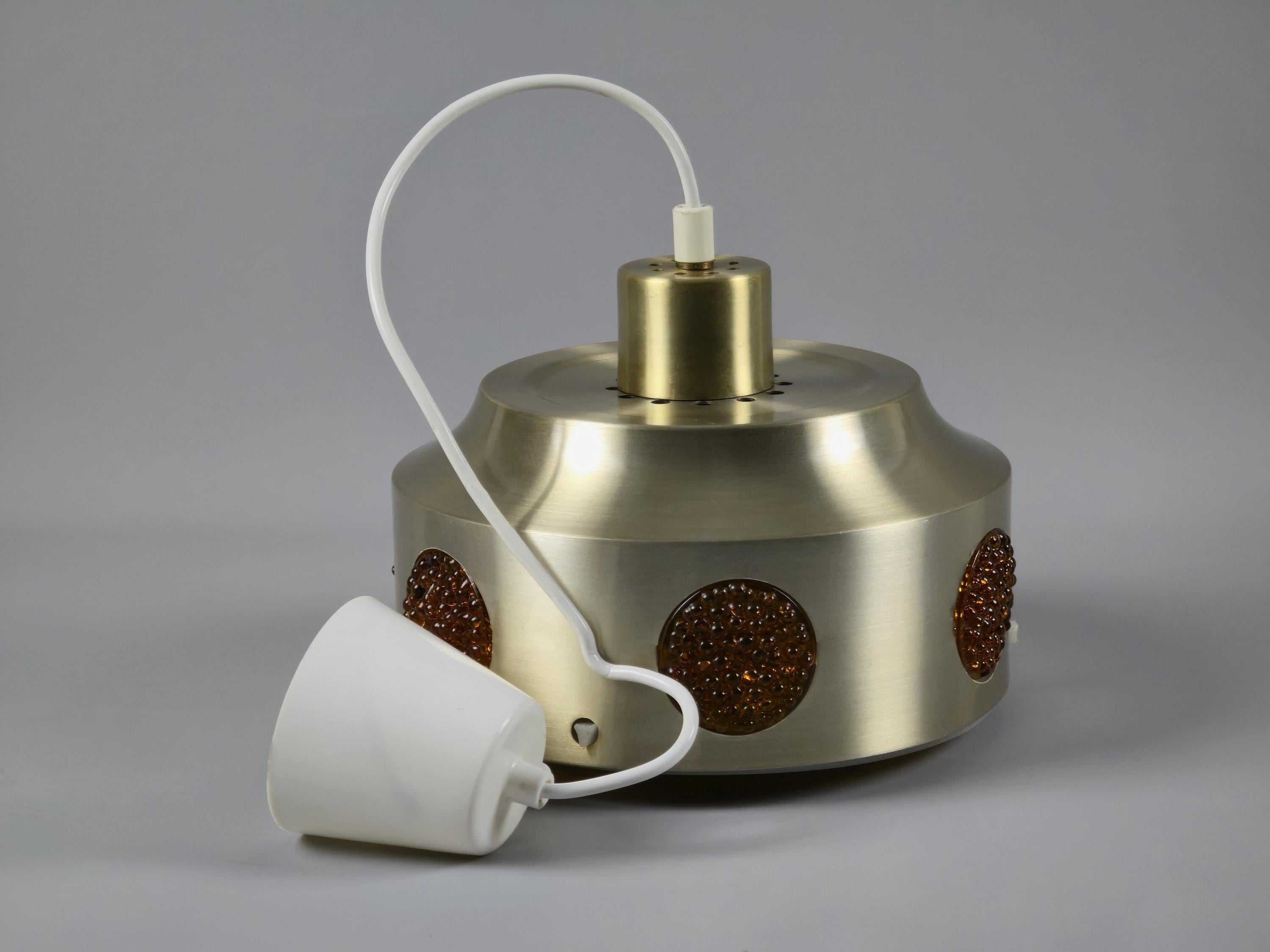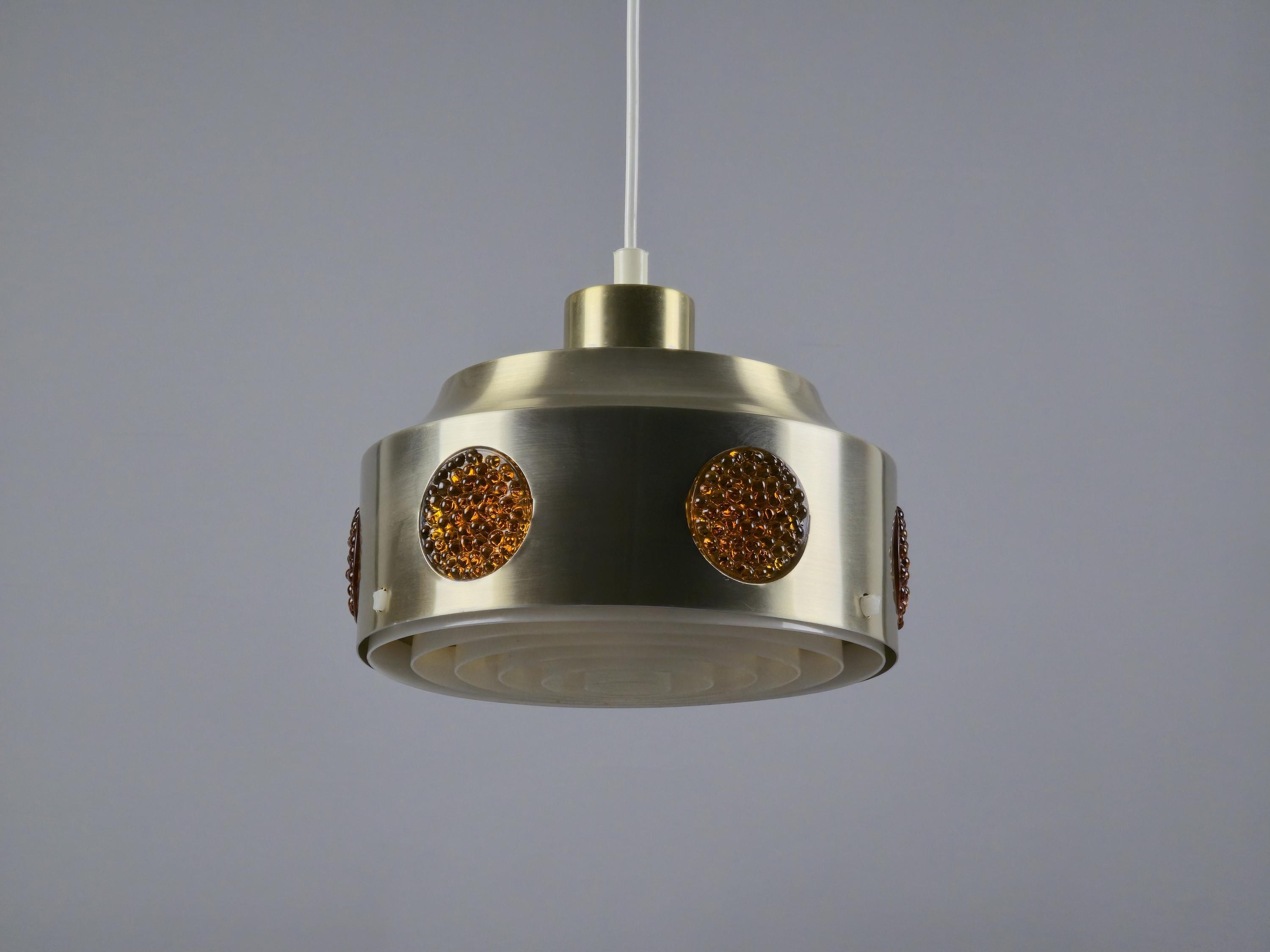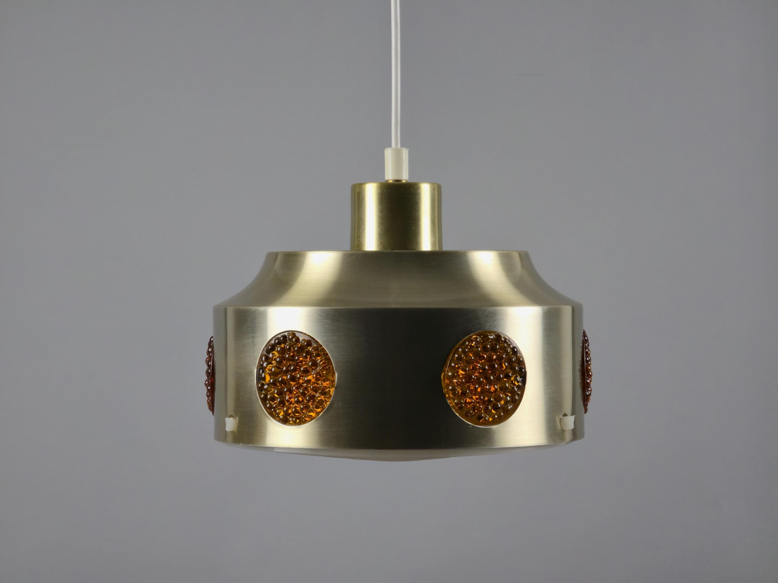 Classic 1960s Danish mid-century modern brass pendant lamp with inlaid round amber details and a louvered diffuser.
