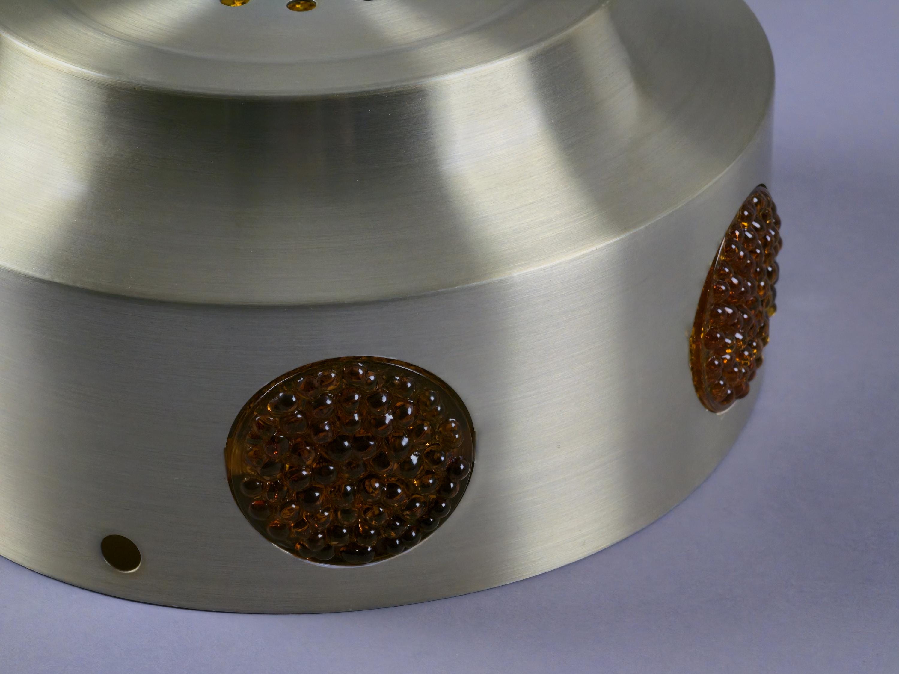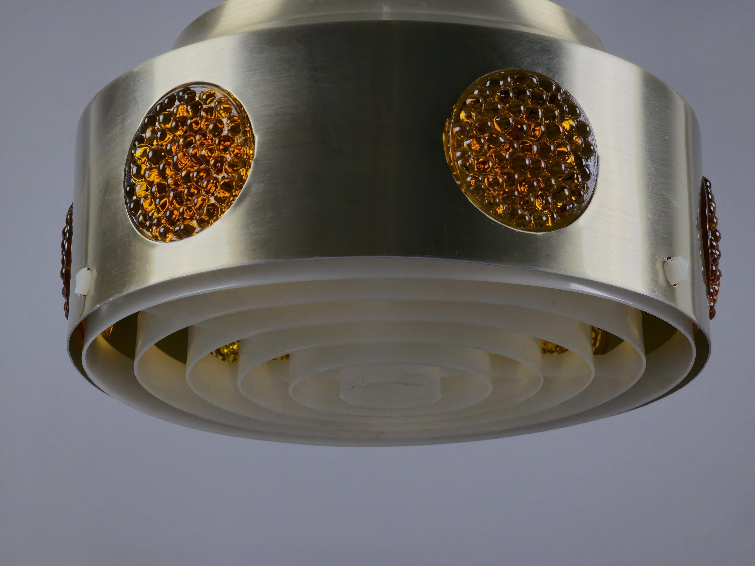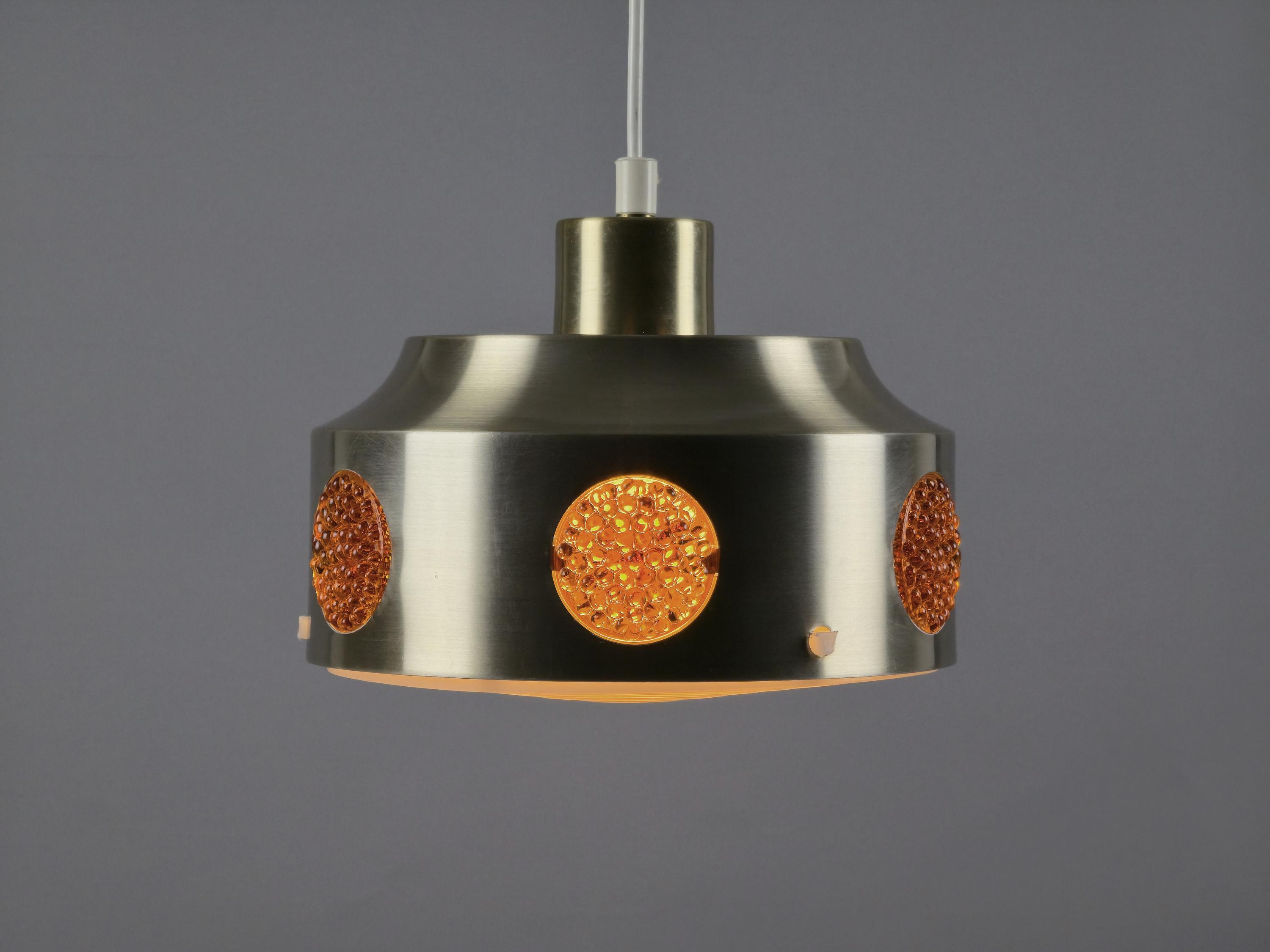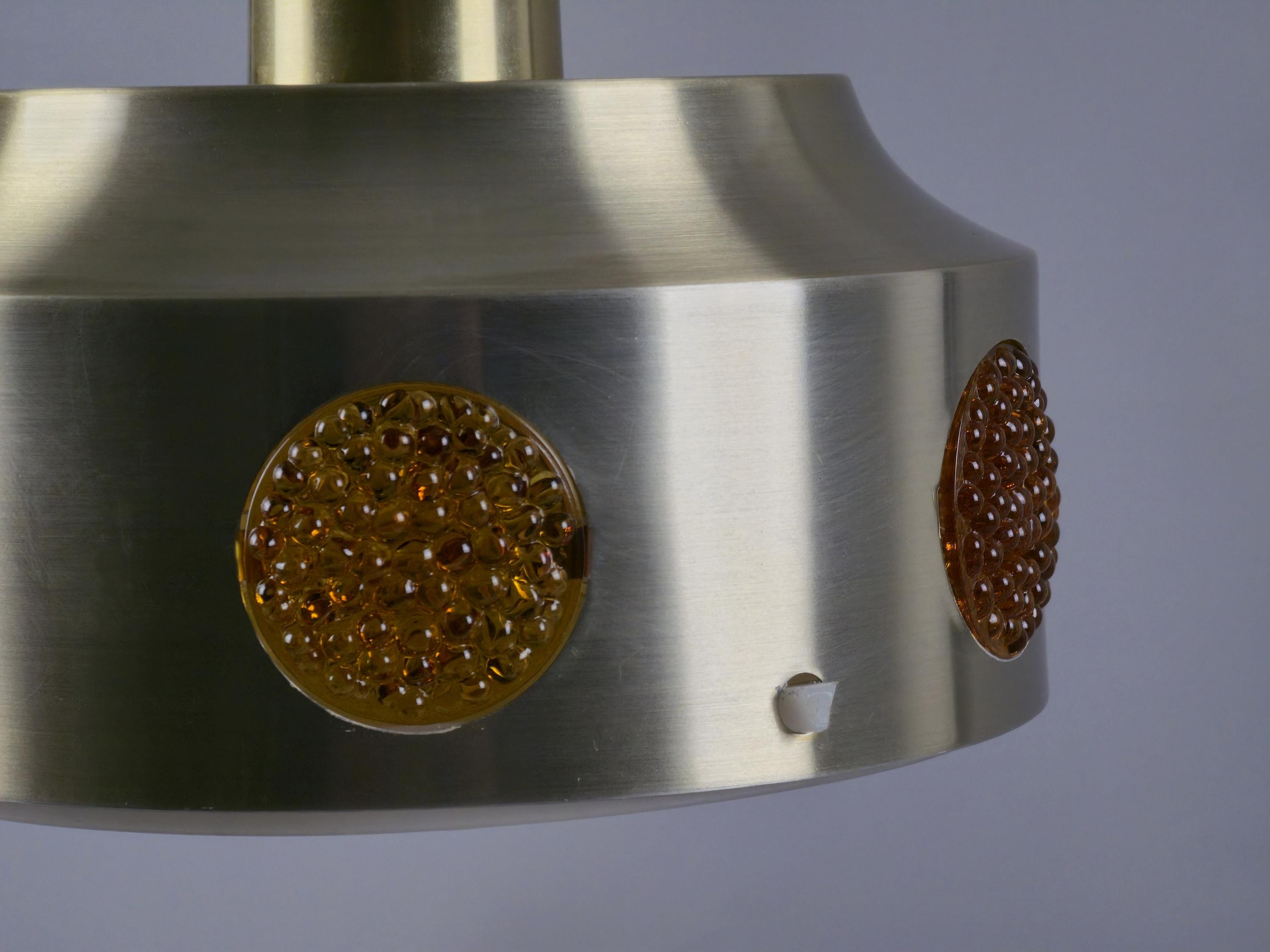 Classic 1960s Danish mid-century modern brass pendant lamp with inlaid round amber details and a louvered diffuser.