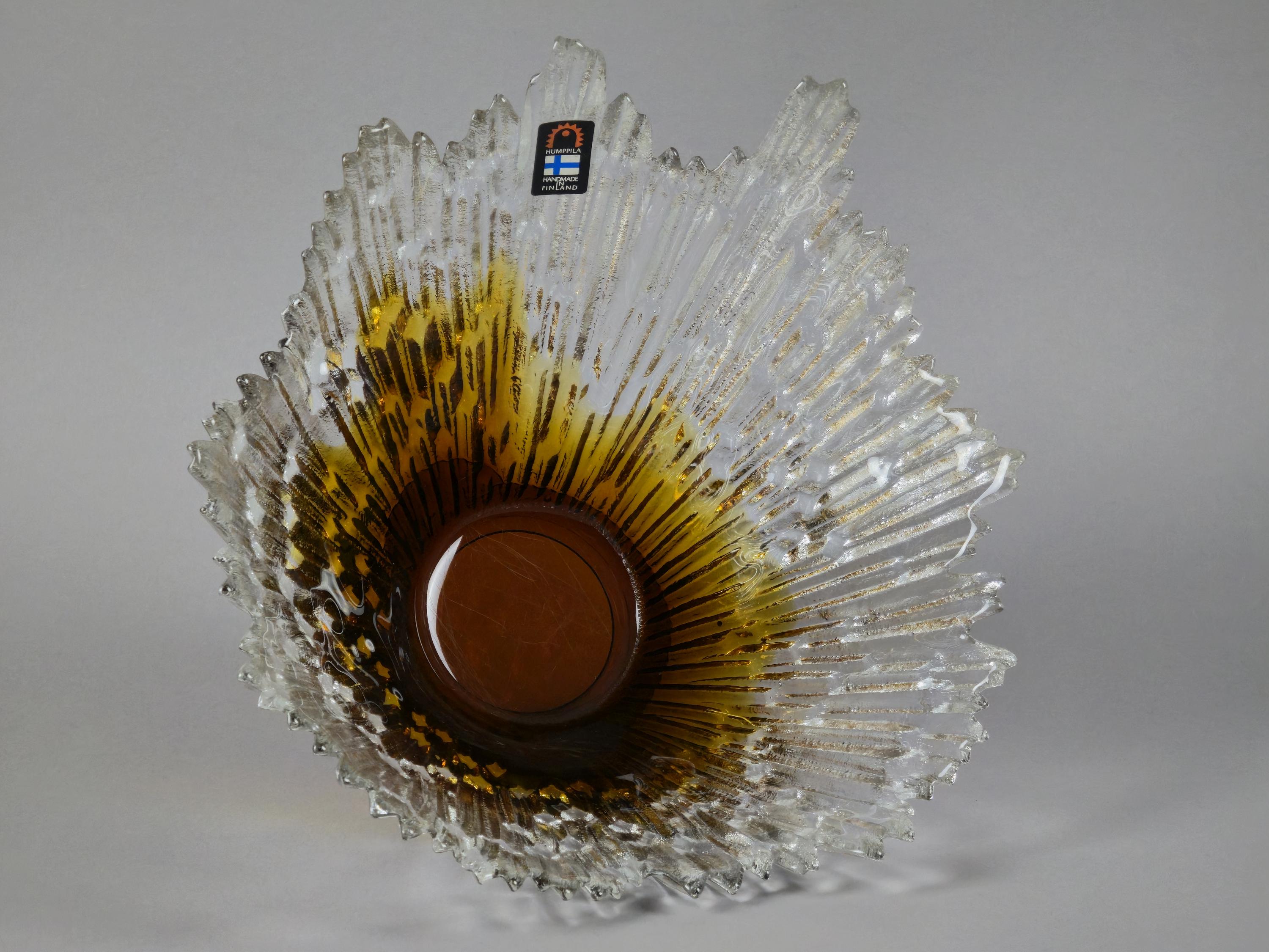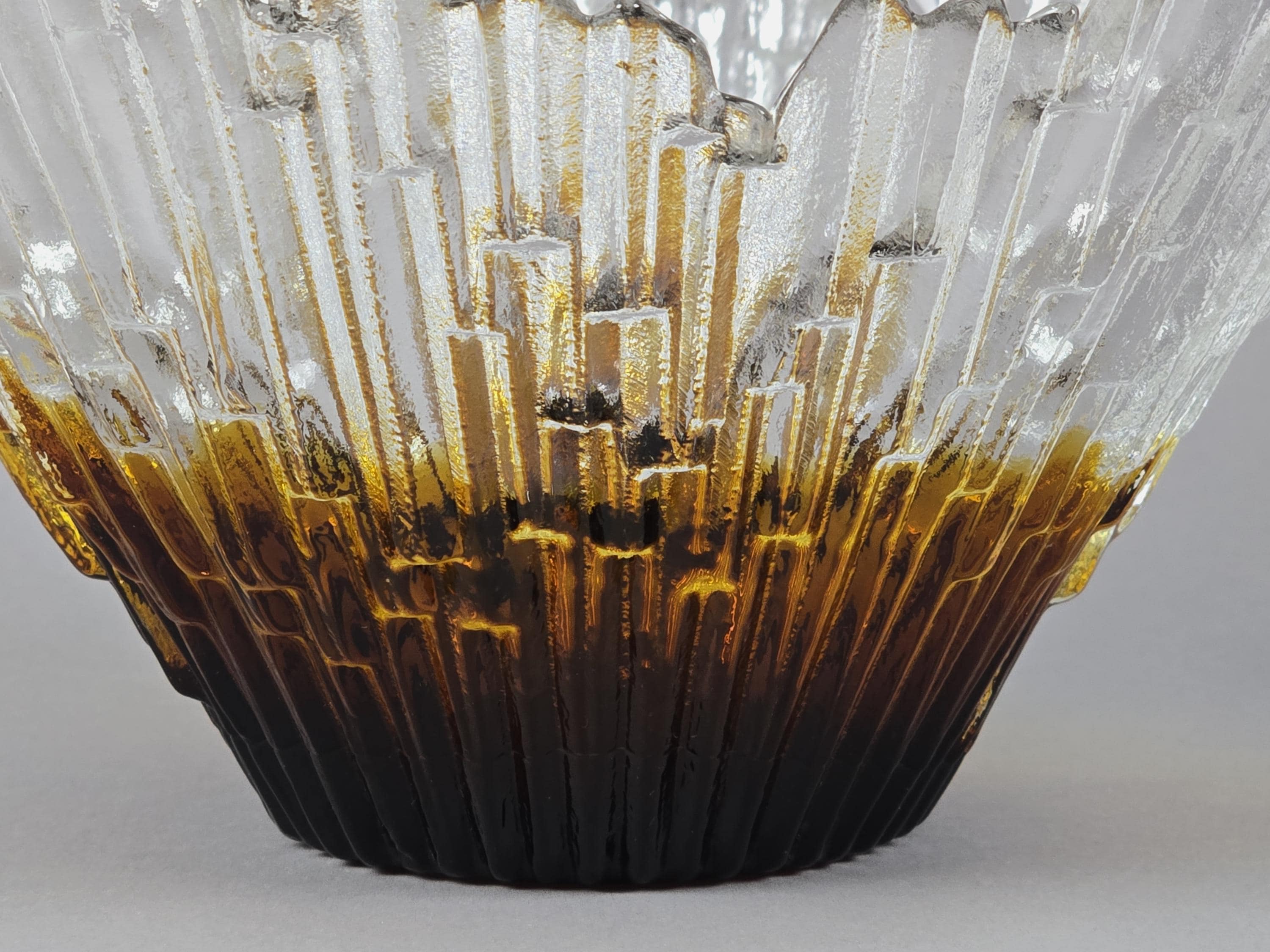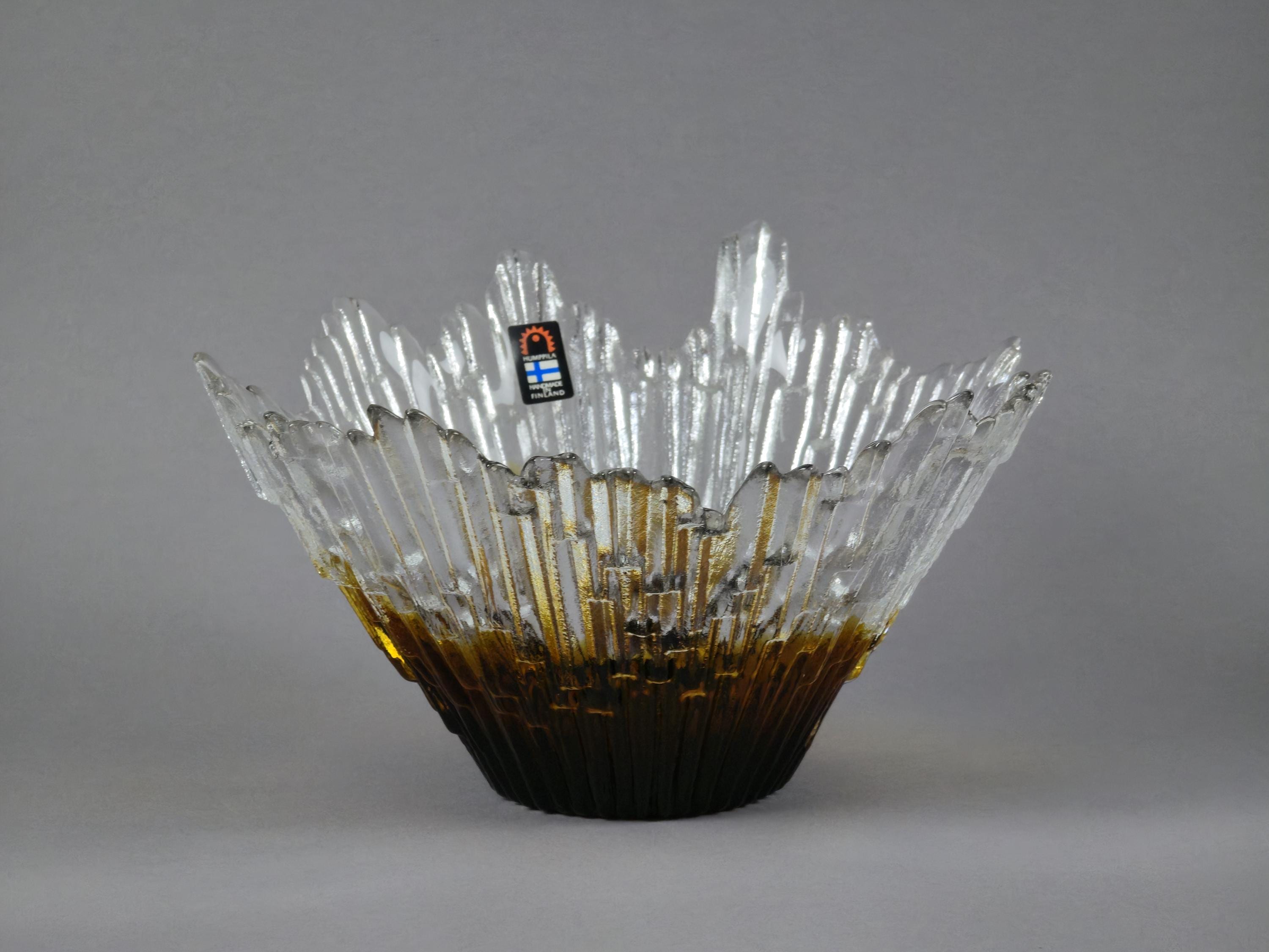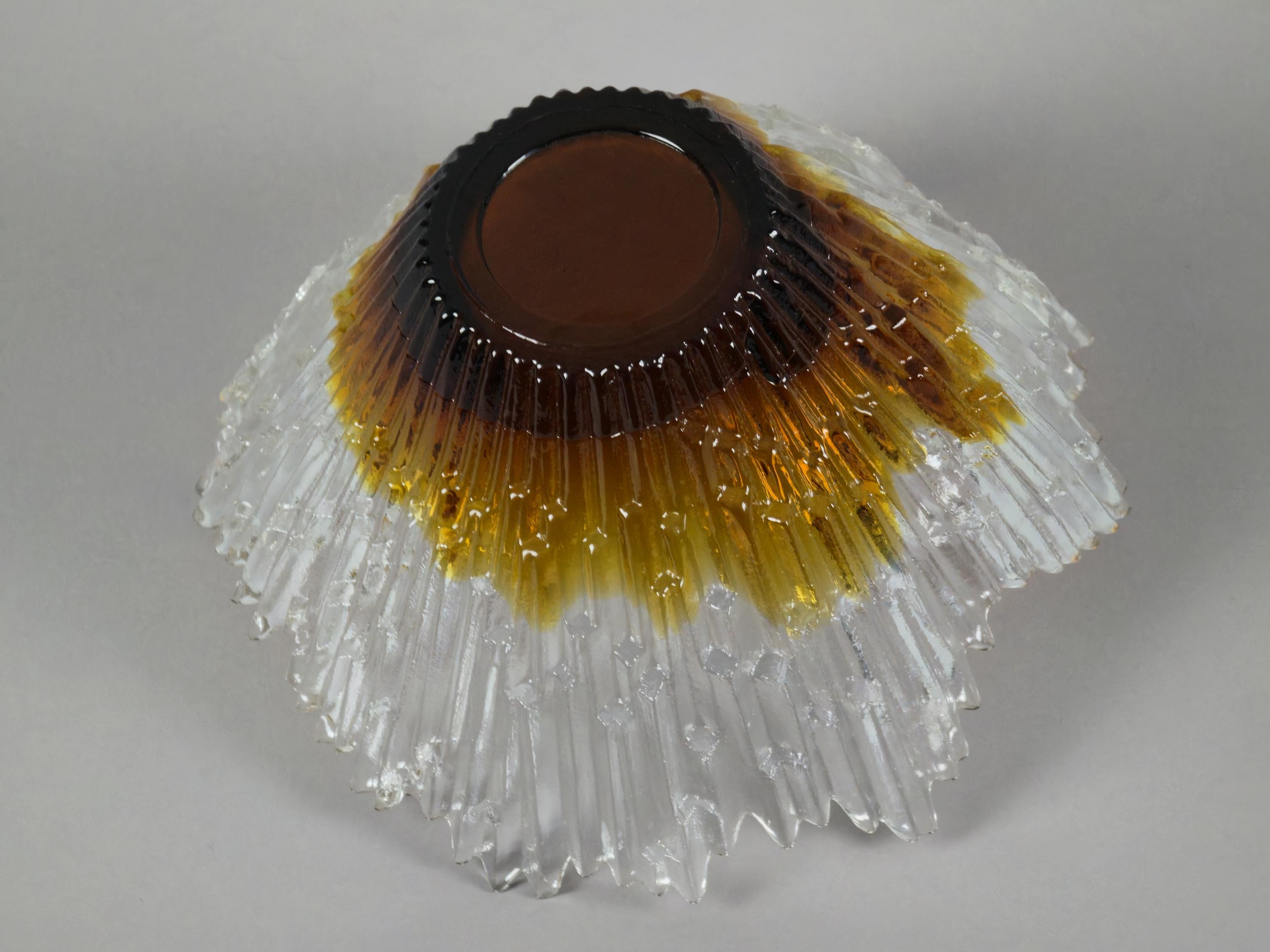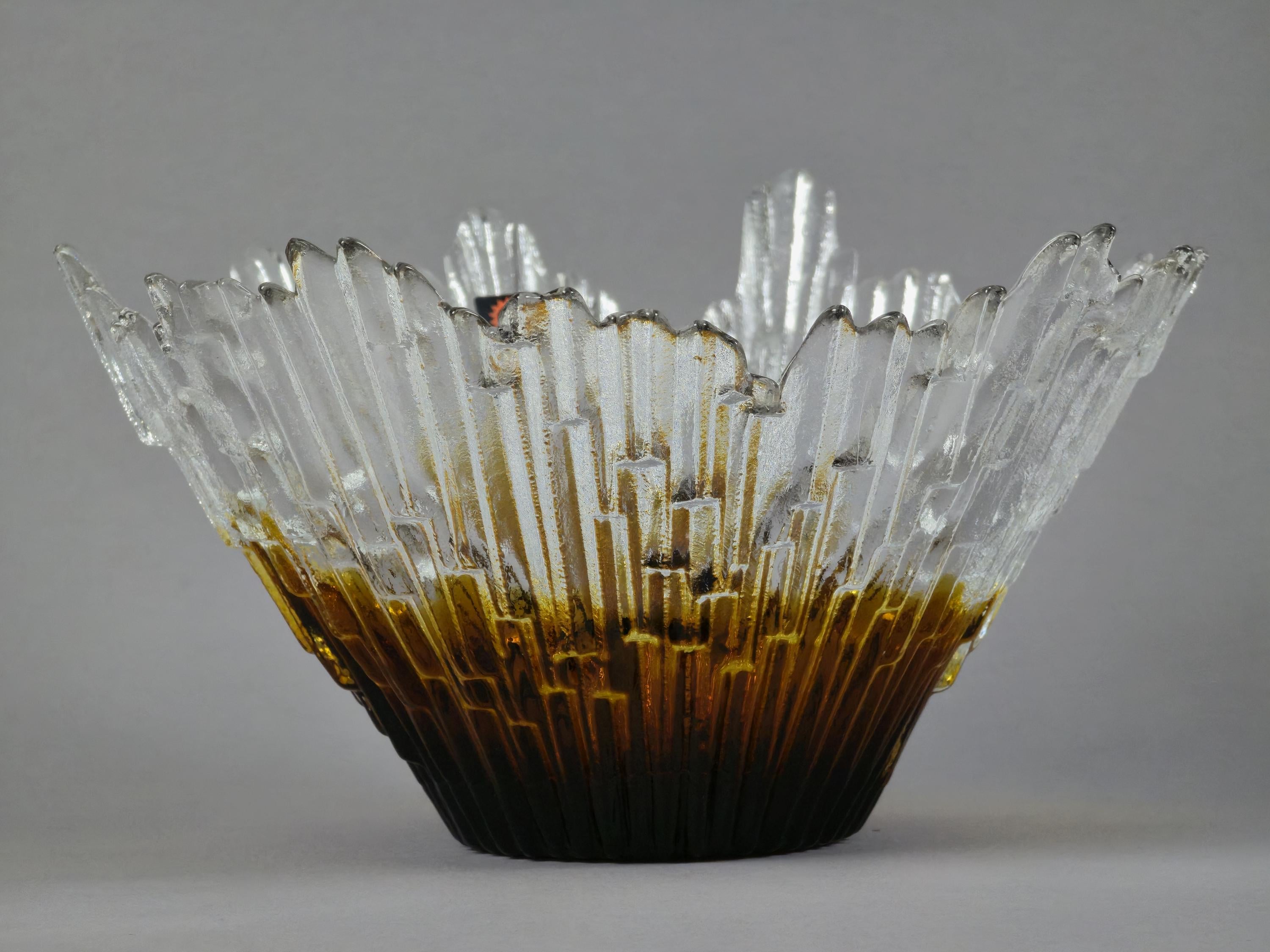 Stunning 1970s vintage art glass bowl Revontulet "Northern Lights" by Tauno Wirkkala for Humppila Lasi Finland. It is known for its distinctive brutalist "ice crystal" or "melted ice" texture and form, featuring a clear top and an amber gradient colored base, which gives it a sculptural, natural appearance.