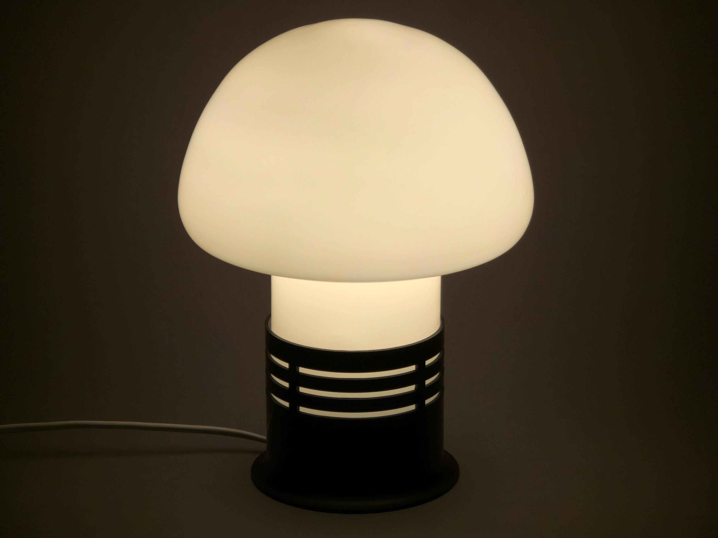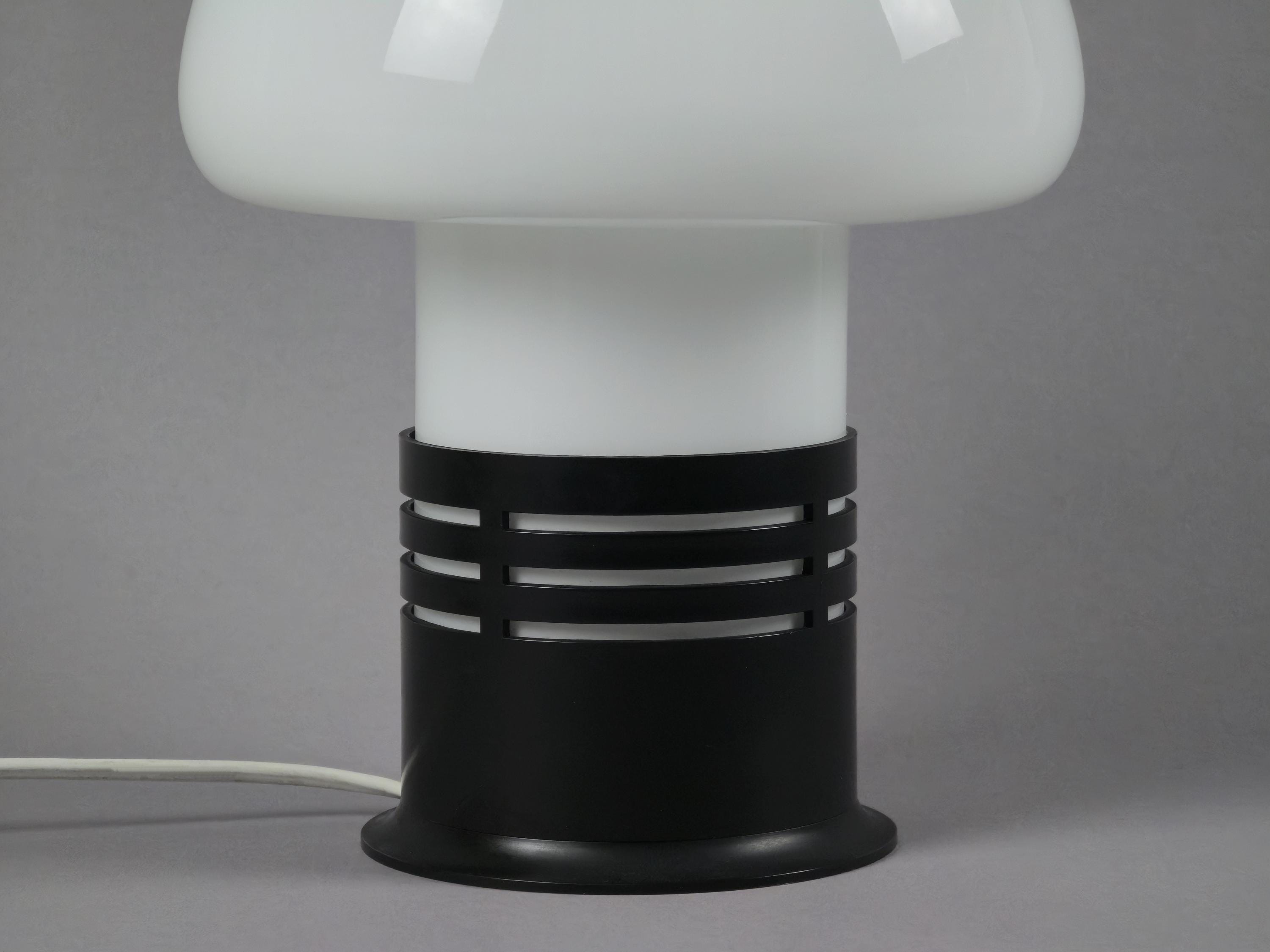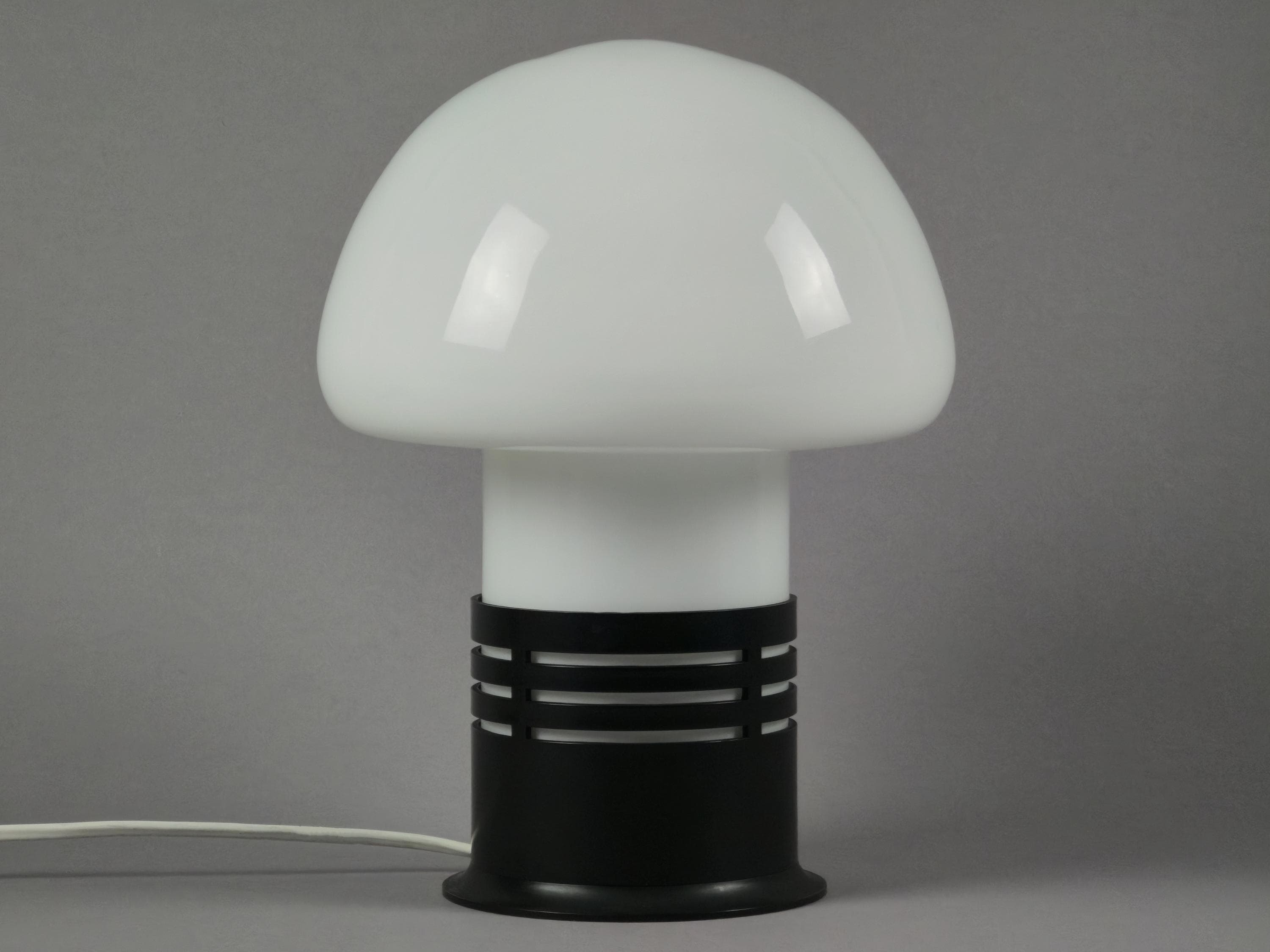 Vintage 1970s white opaline glass mushroom table lamp by Stockmann-Orno Finland. It comes with a dark-grey plastic foot.