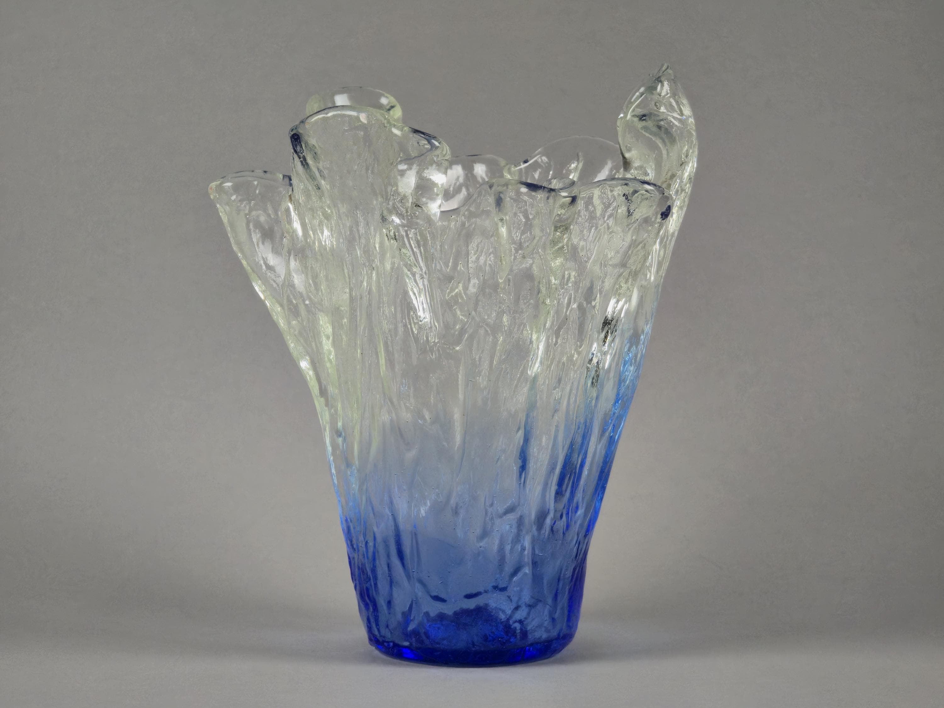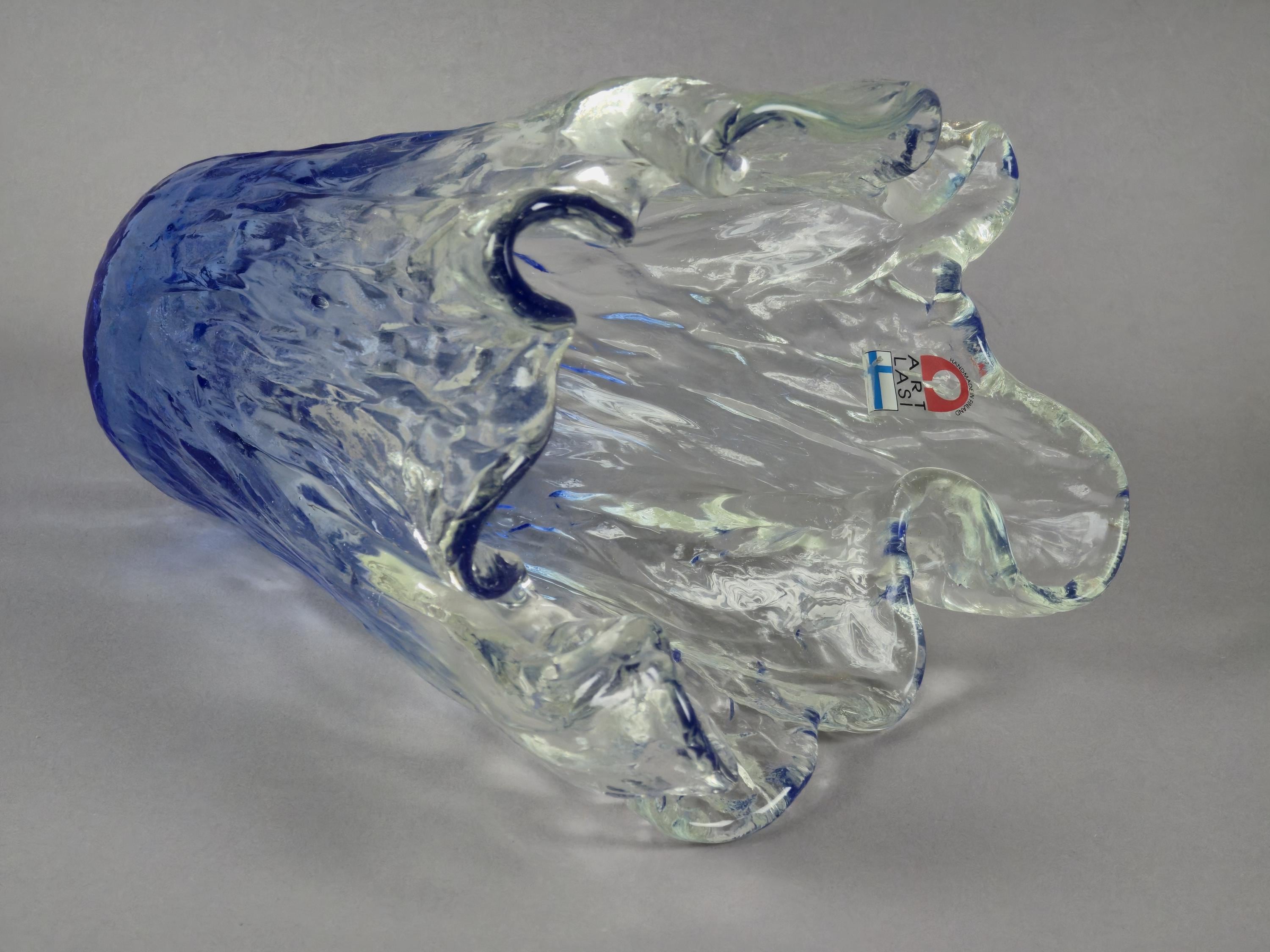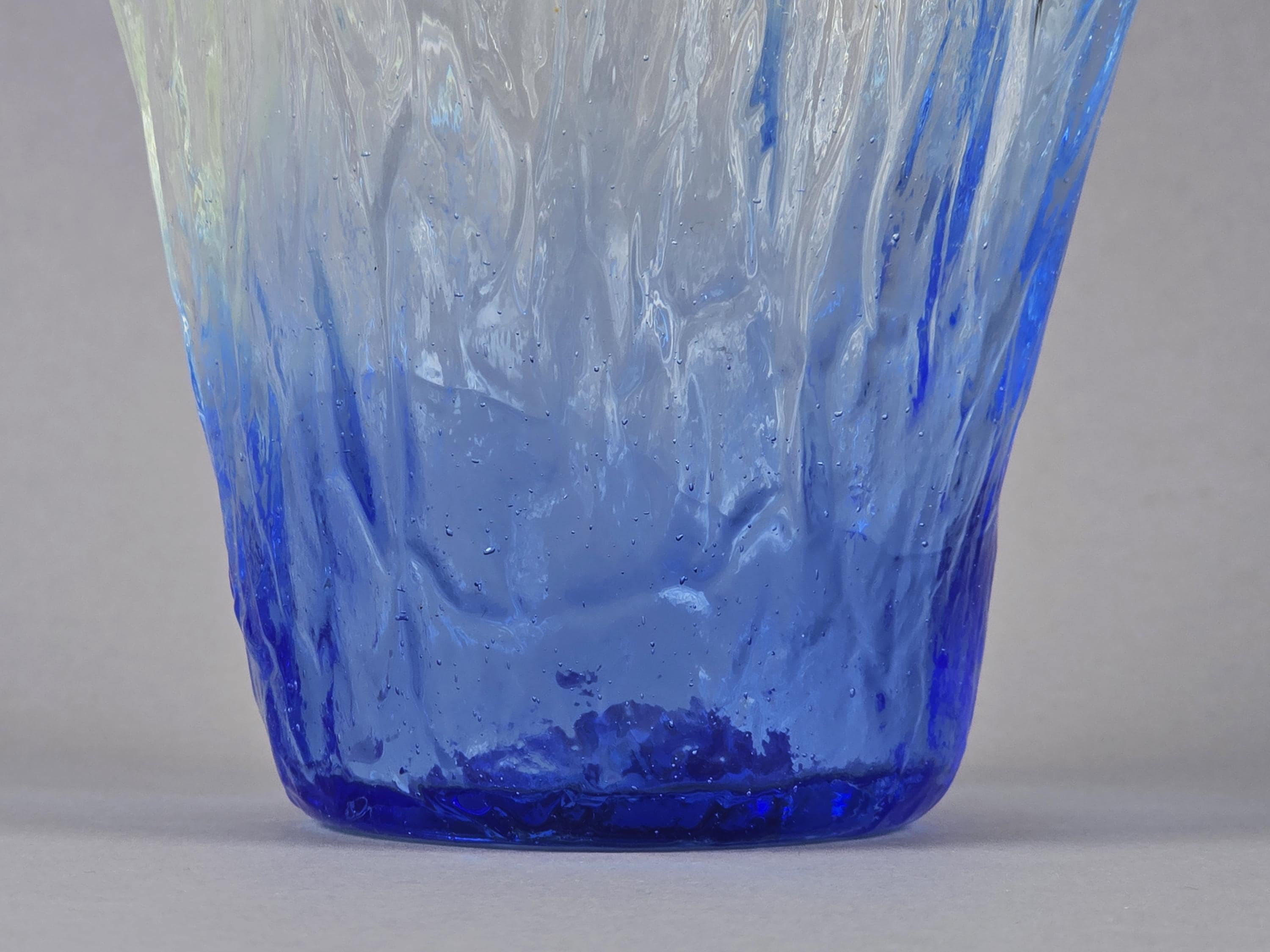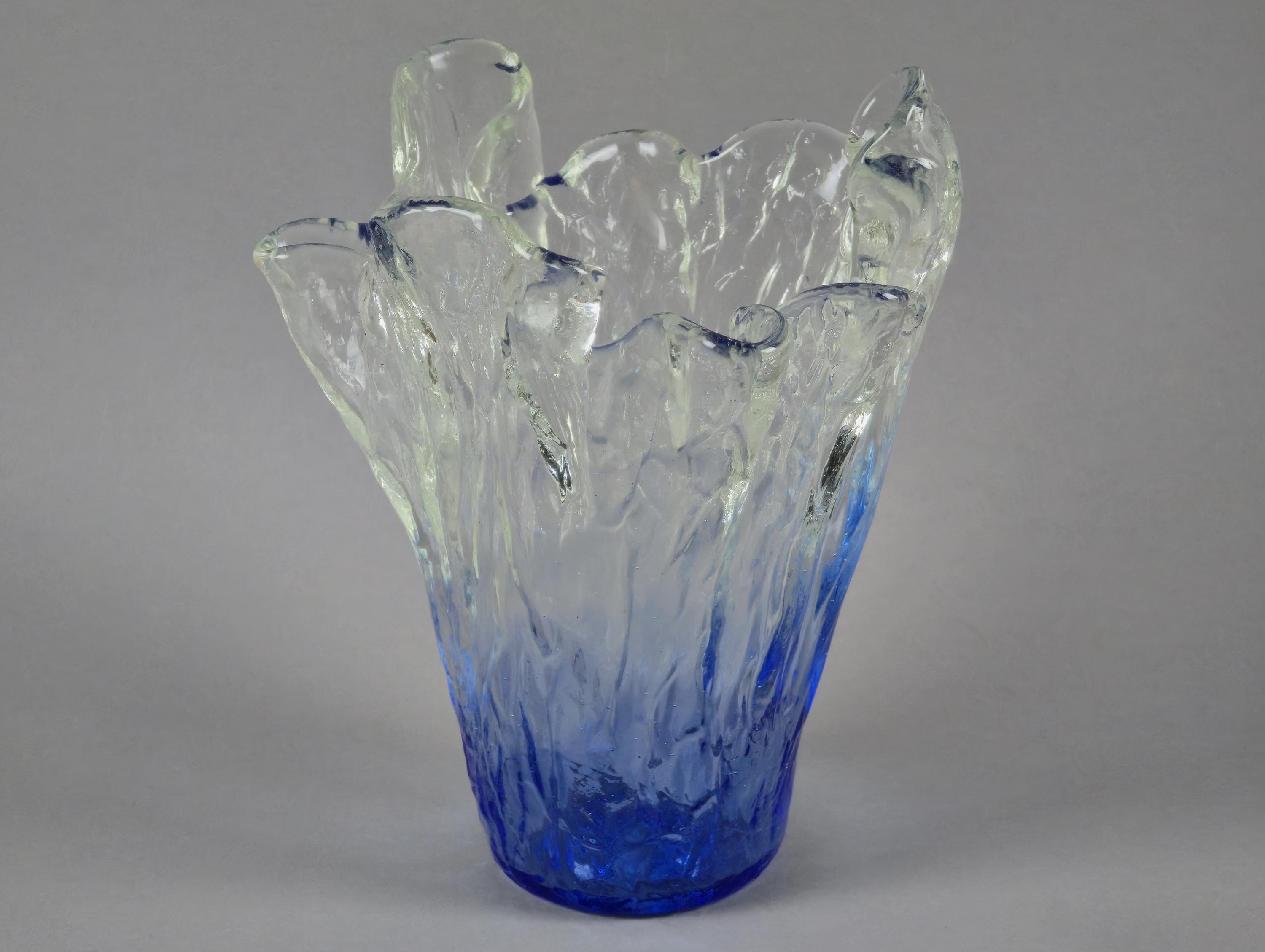 Vintage 1970s Finnish handmade glacier / bark textured art glass vase by Lasilandia Finland. The vase features an organic shape transitioning from blue hues at the bottom to clear 'ice' texture at the top.
