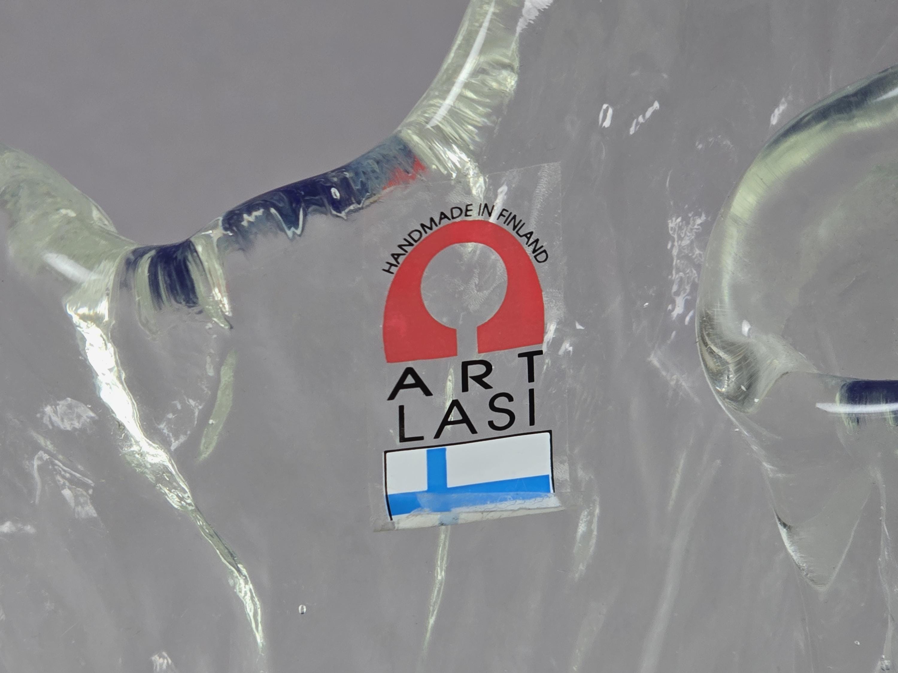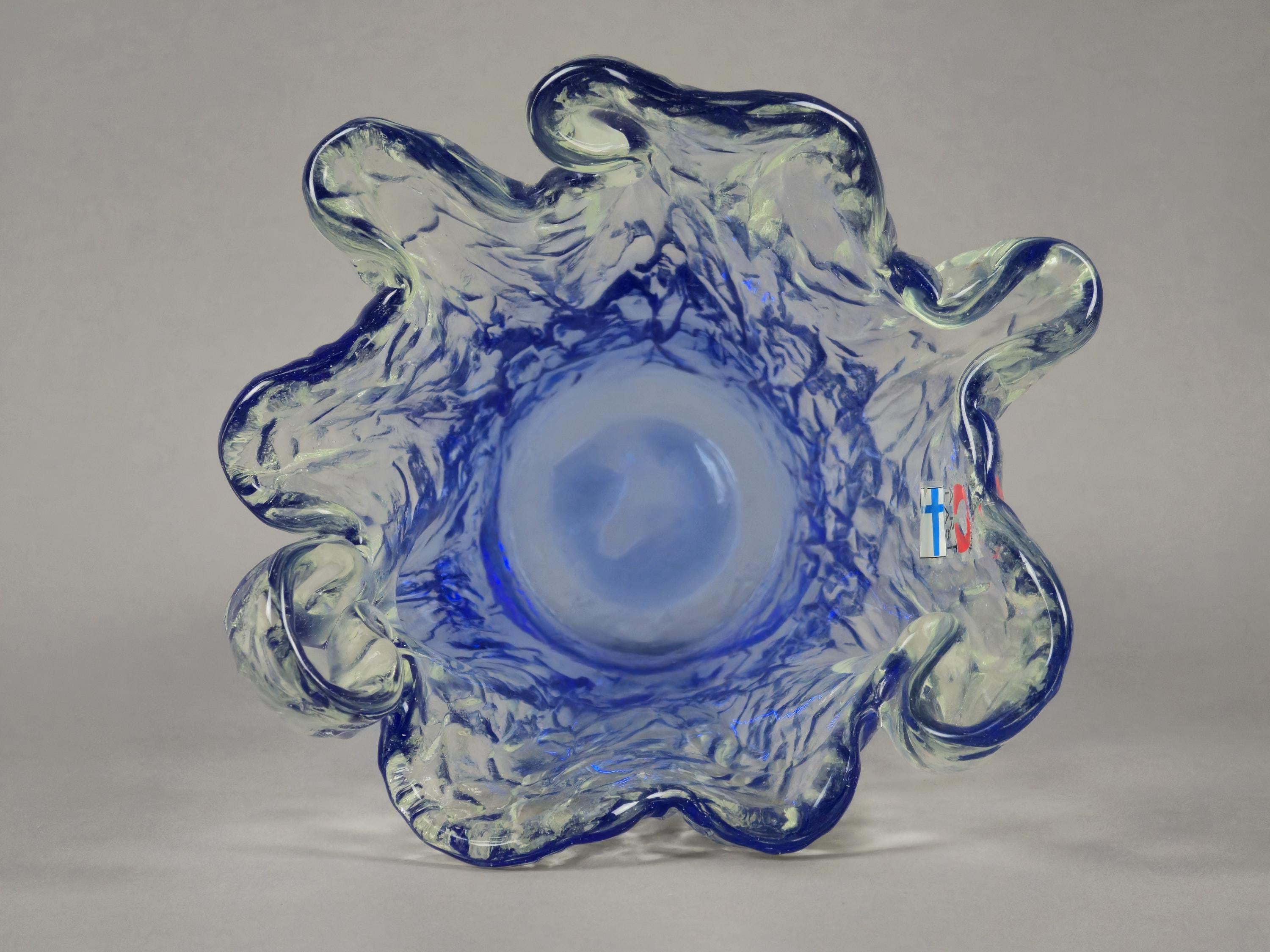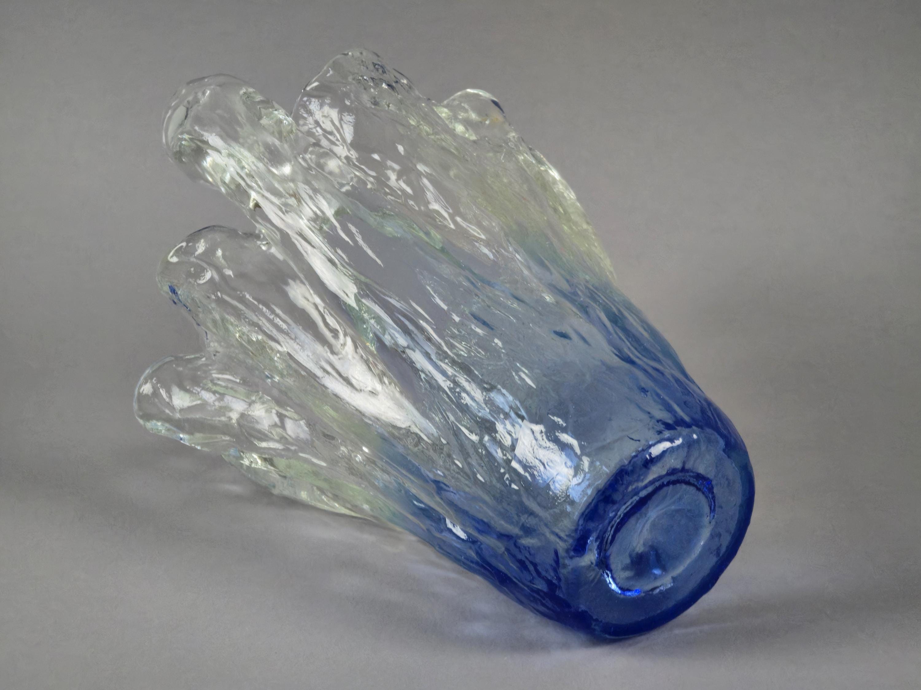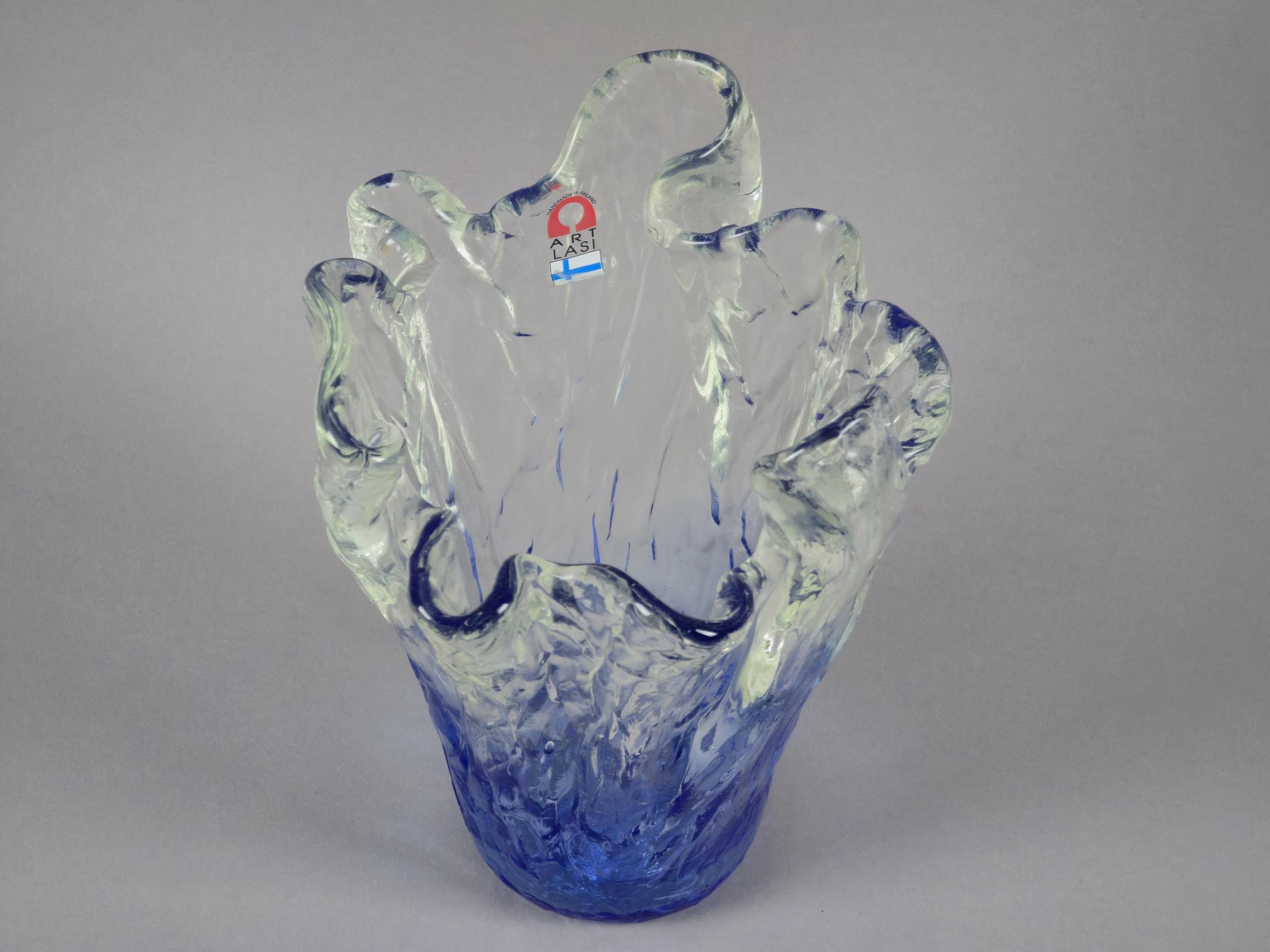 Vintage 1970s Finnish handmade glacier / bark textured art glass vase by Lasilandia Finland. The vase features an organic shape transitioning from blue hues at the bottom to clear 'ice' texture at the top.