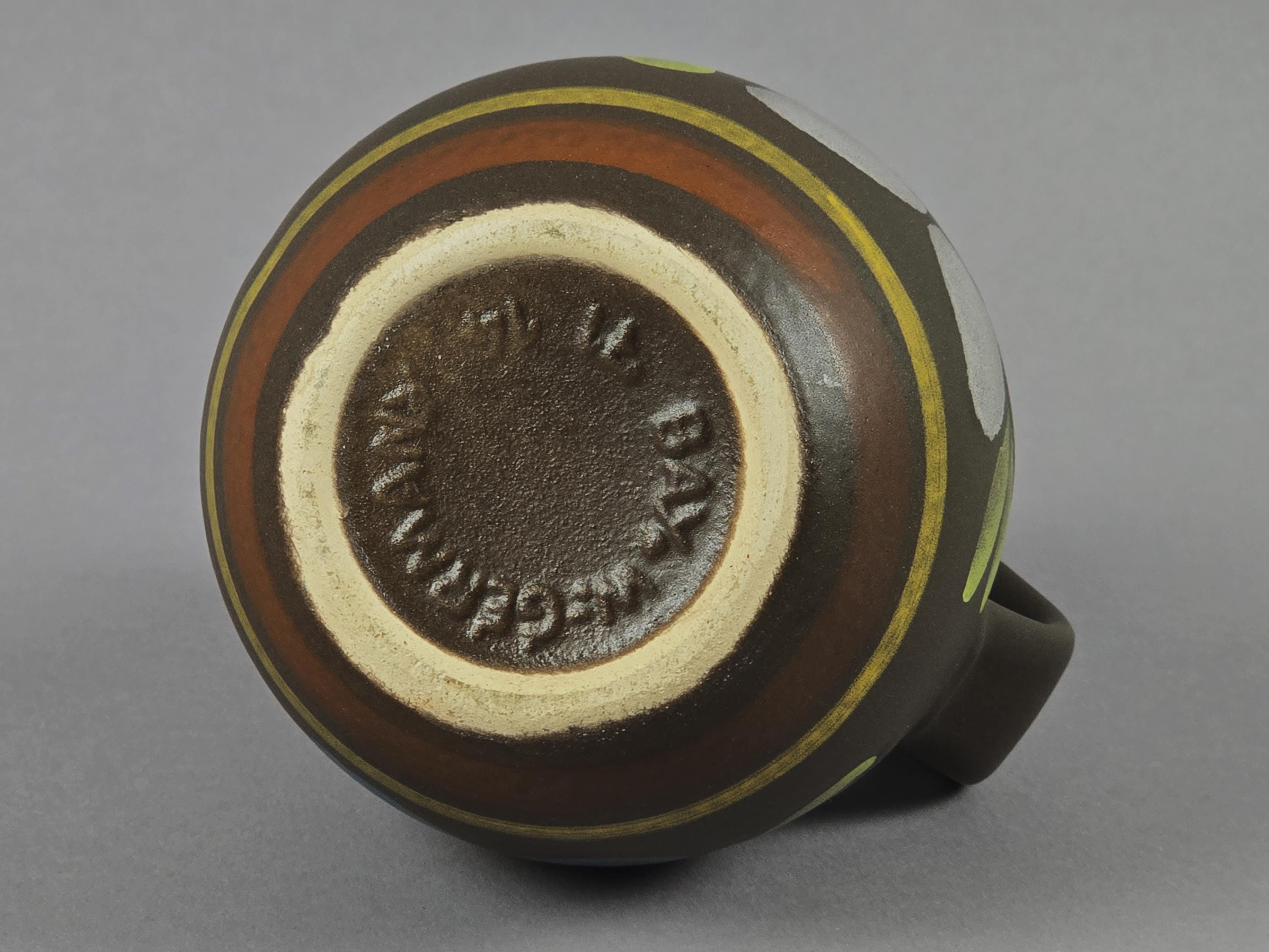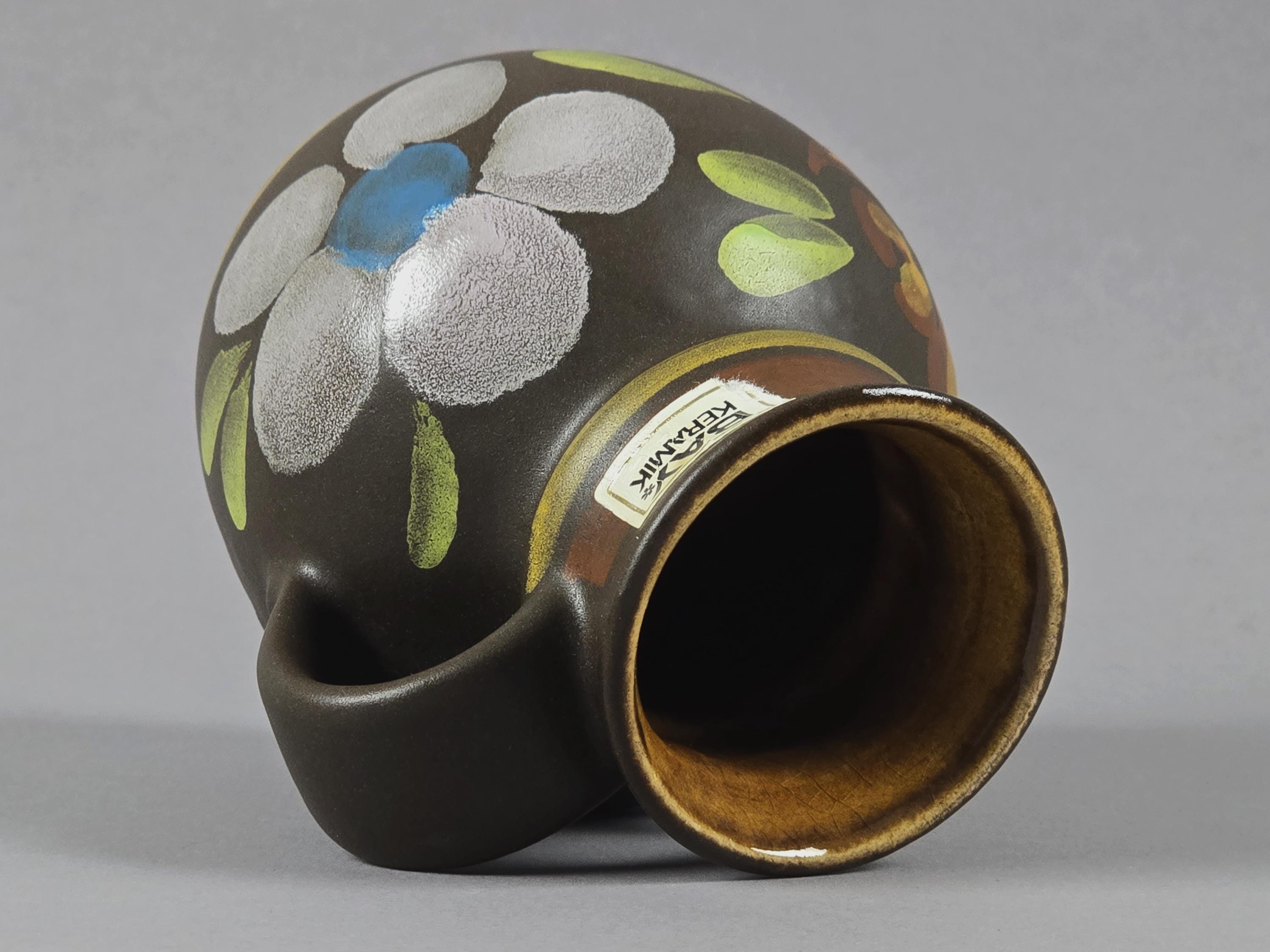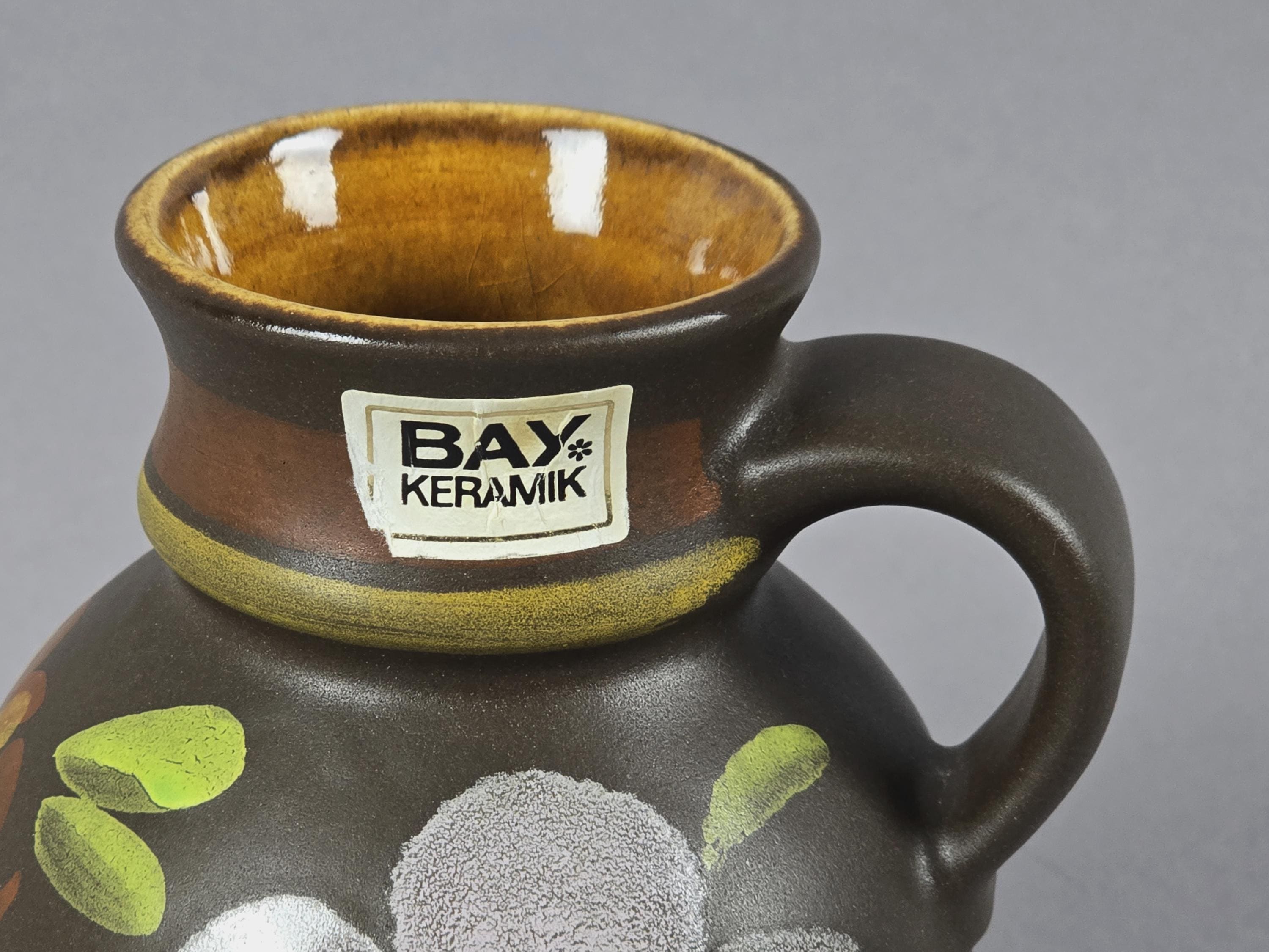 Original 1970s Bay Keramik stoneware vase from West Germany, featuring floral designs. Original sticker with marking at the bottom.