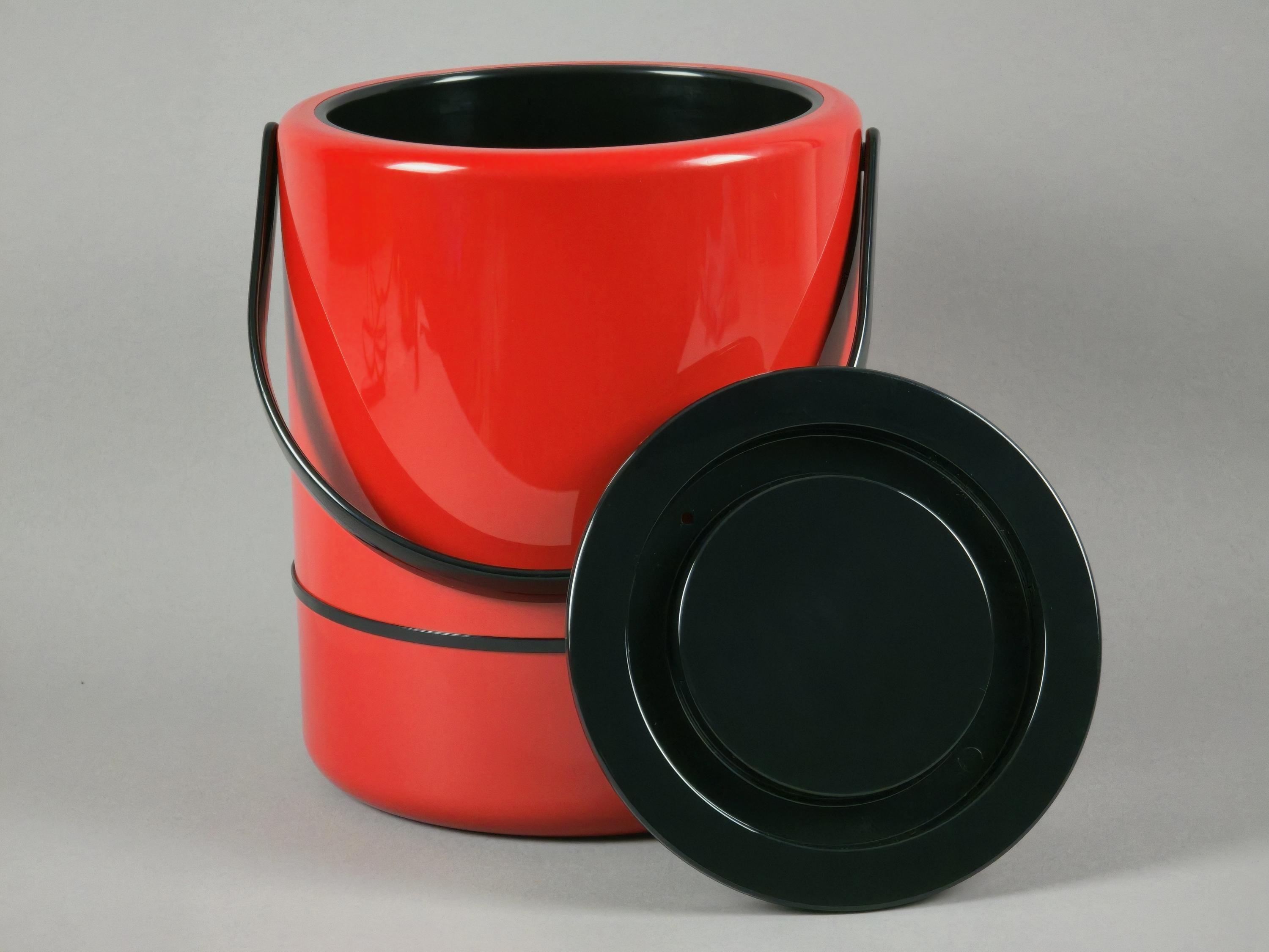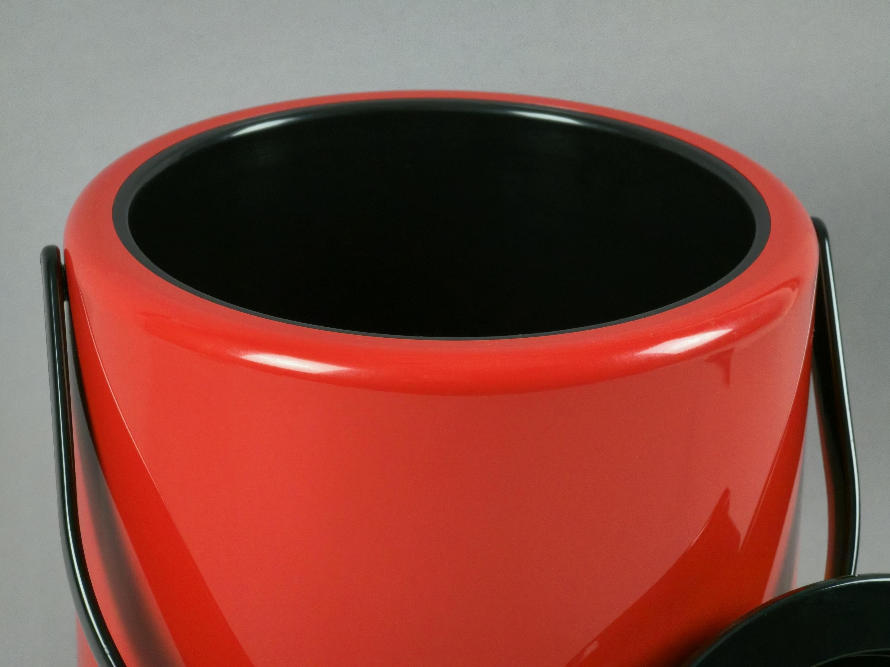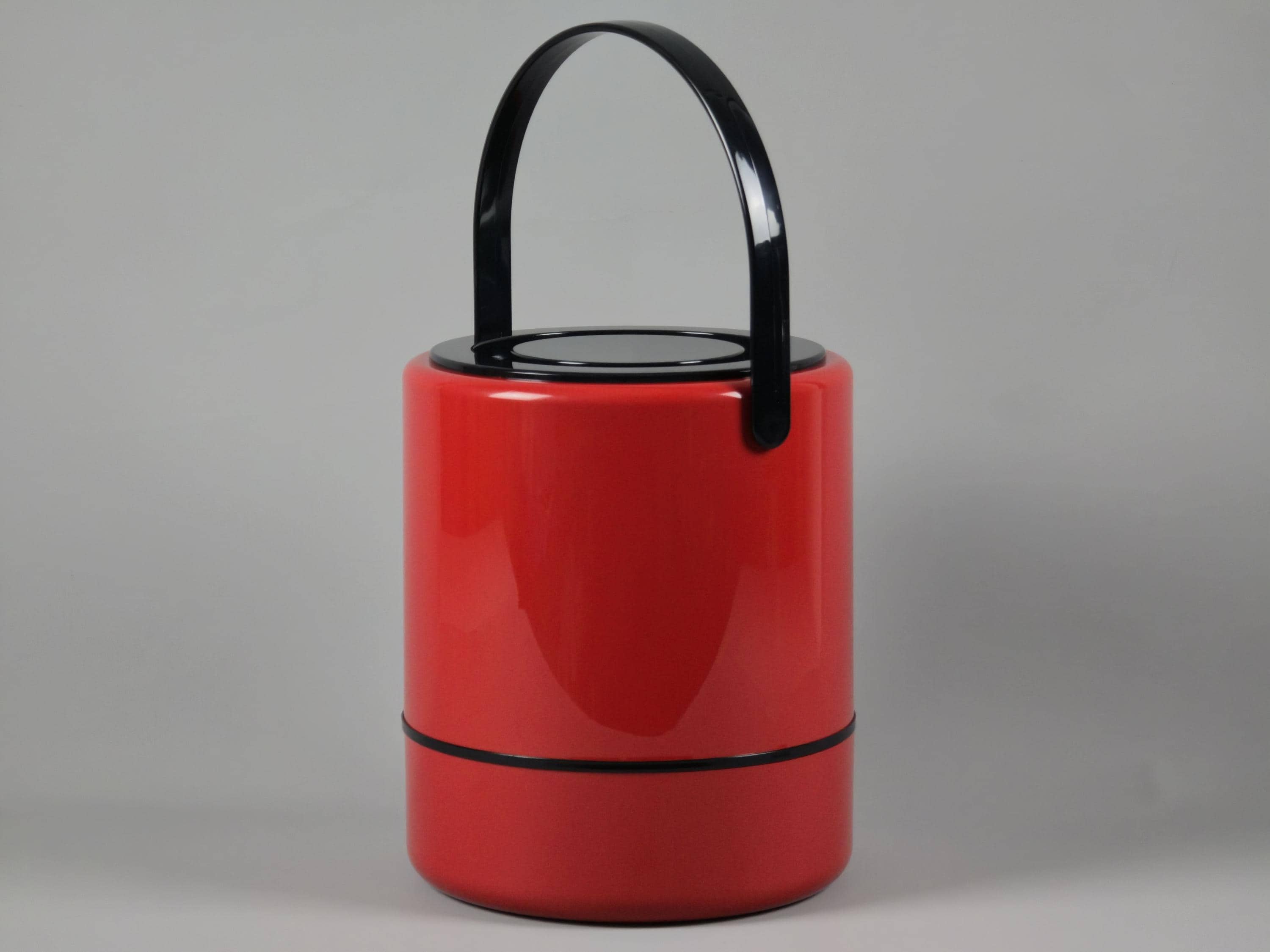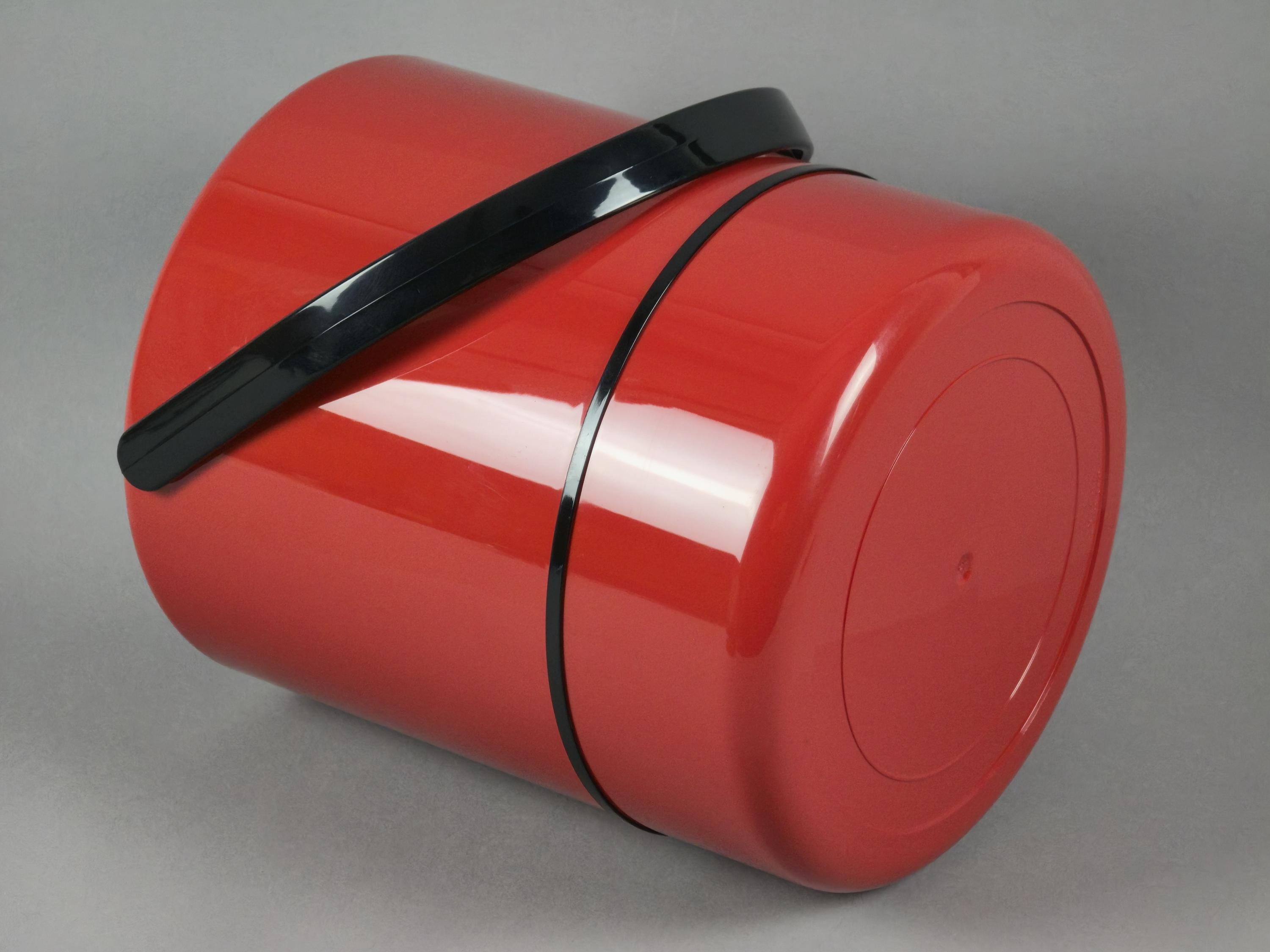 New old stock 1980s vintage red and black plastic large ice bucket with lid from the 'Casa Bar' series by Scaroni Italy.