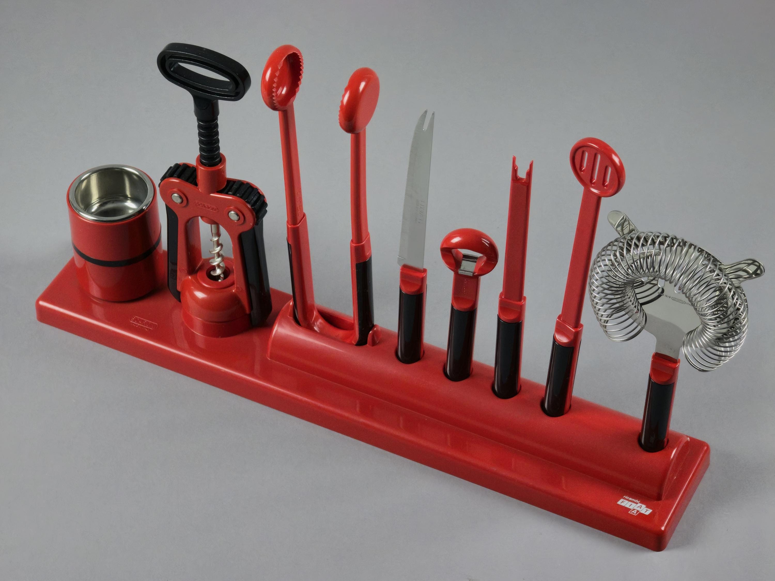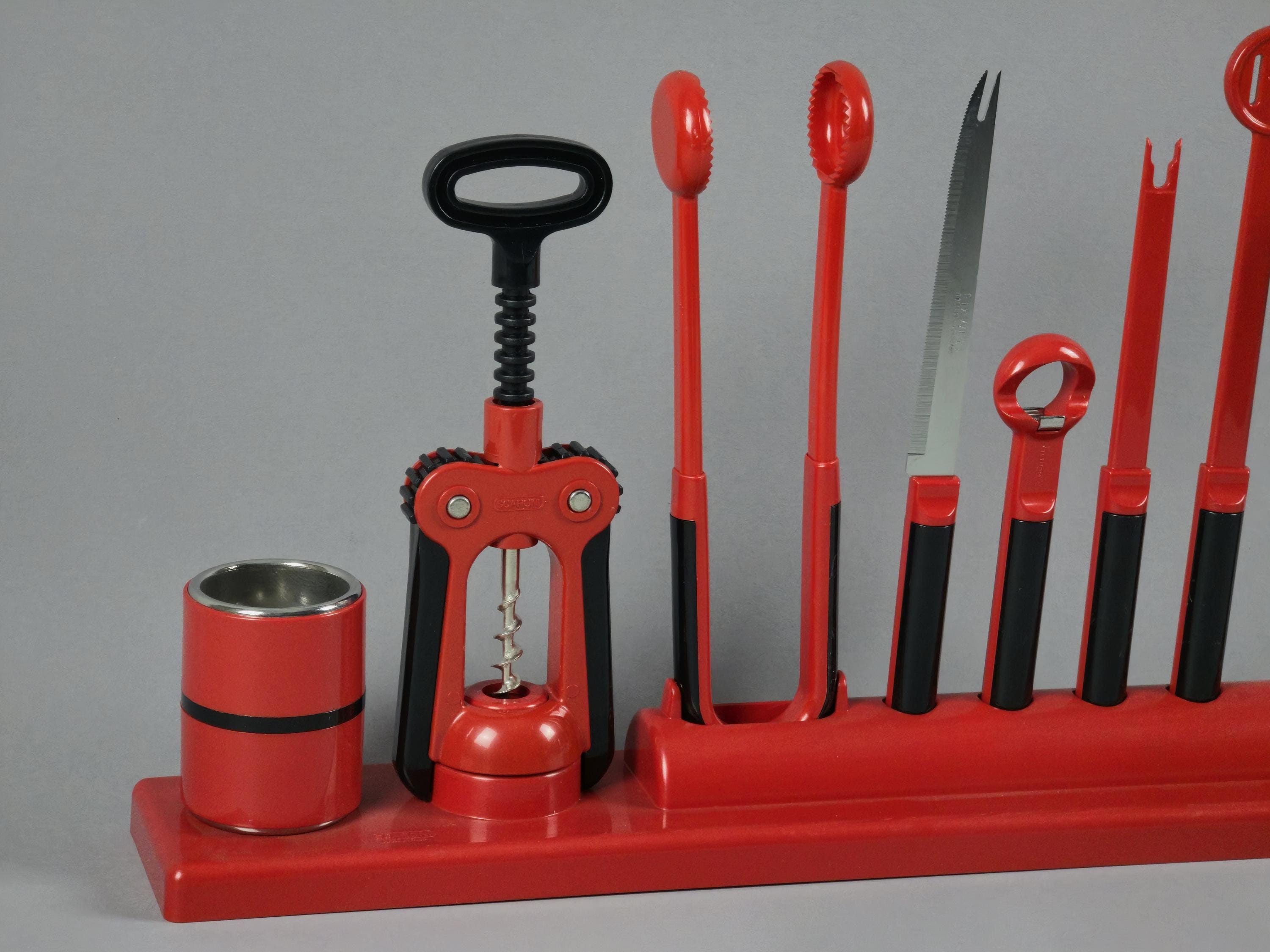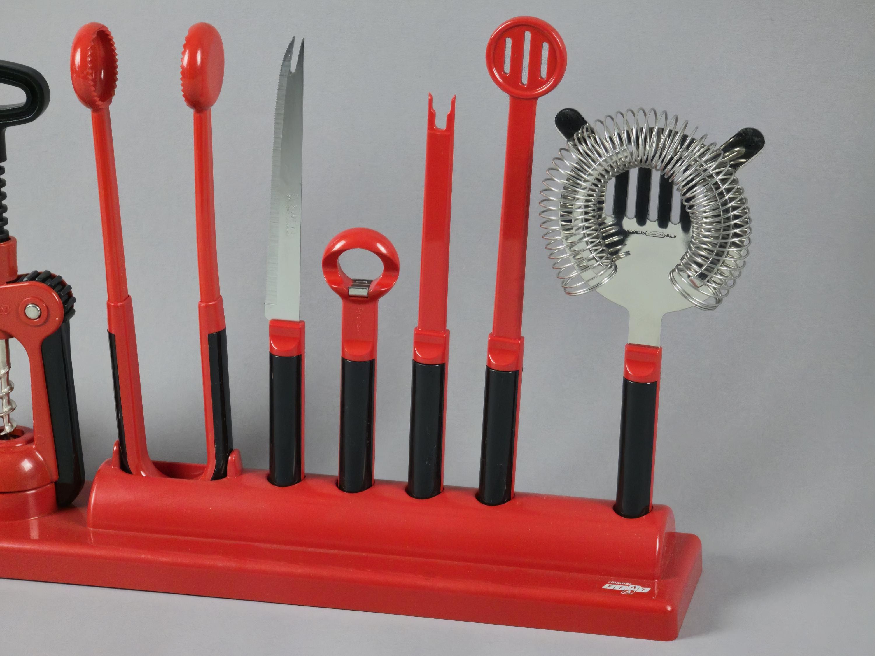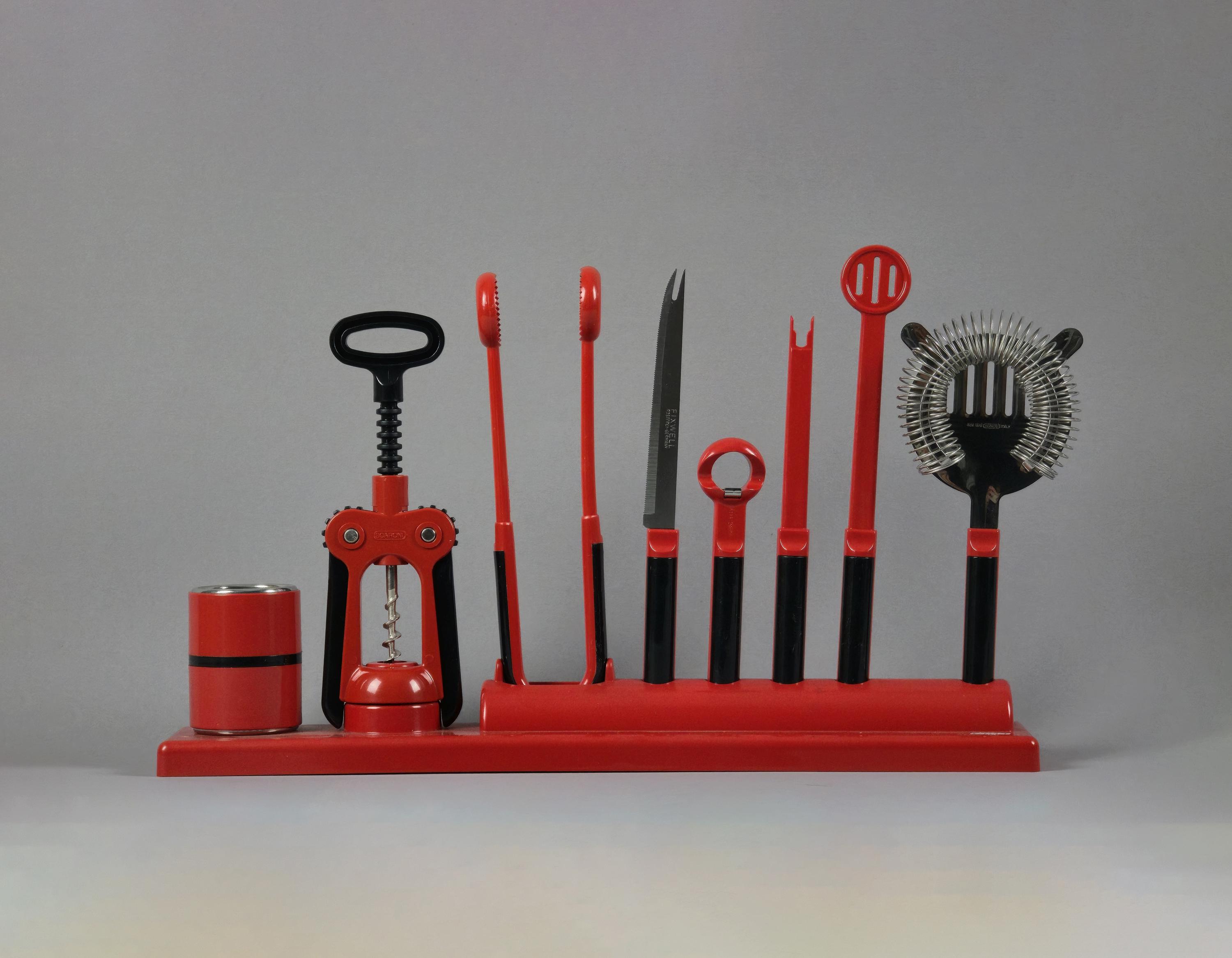 New old stock vintage 1980s red and black plastic cocktail bar set, tools and utensils set by Scaroni Italy. The set includes eight essential bar tools: a bottle stopper, corkscrew, ice tongs, olive fork, stirring spoon, bar knife, bottle opener, and cocktail strainer. Perfectly organized on a matching stand, this is both a practical and decorative addition to any bar cart or kitchen.