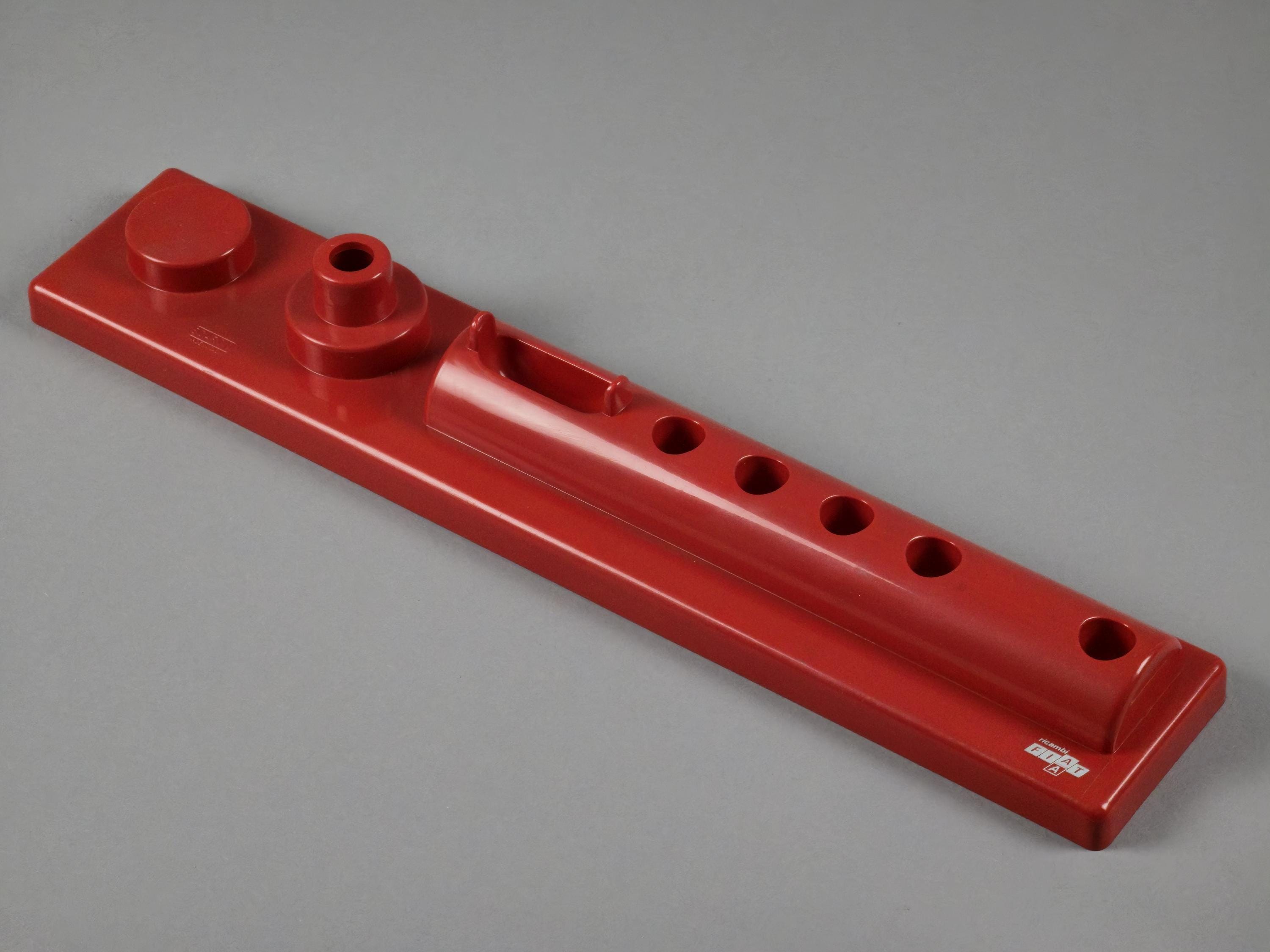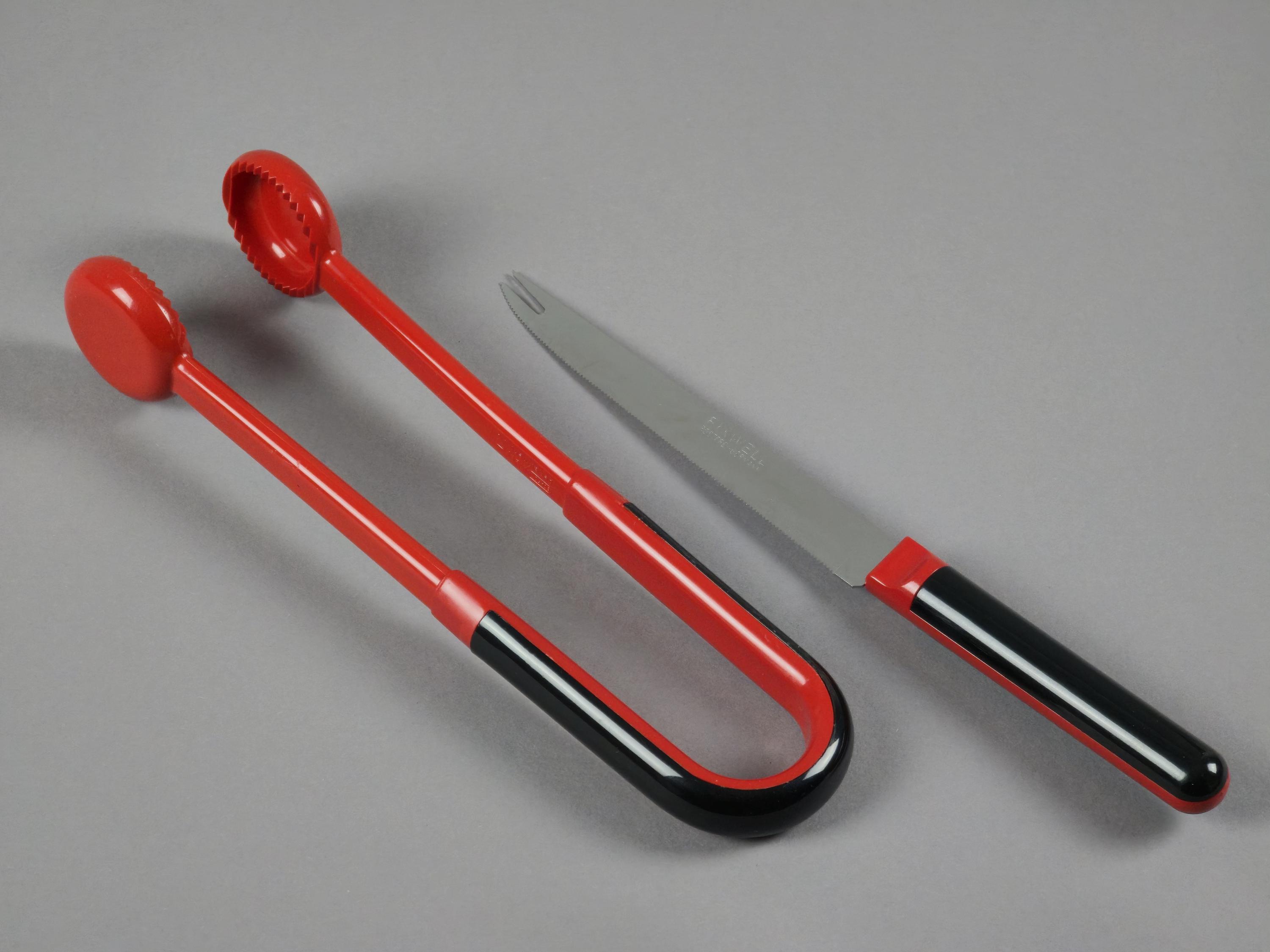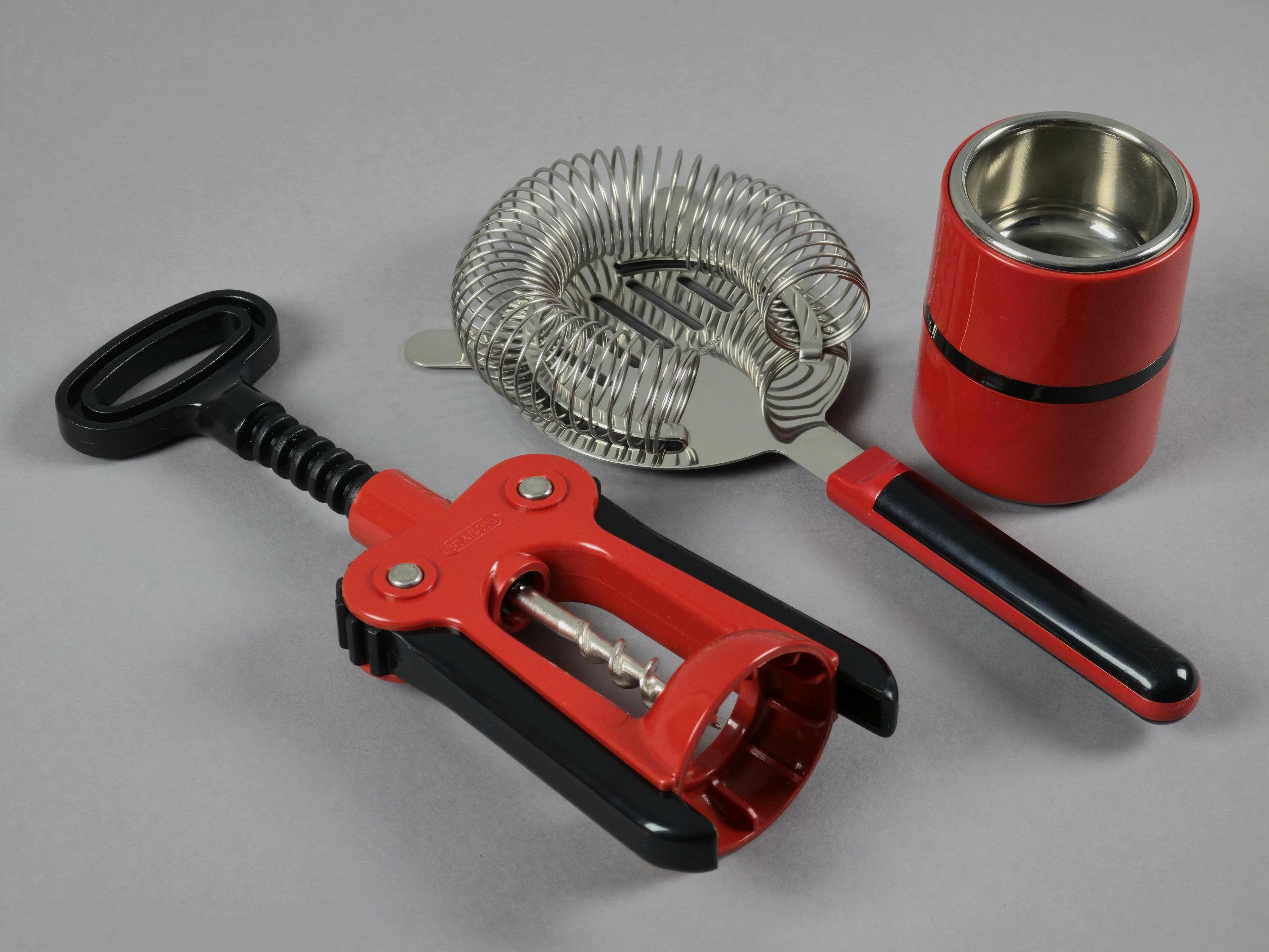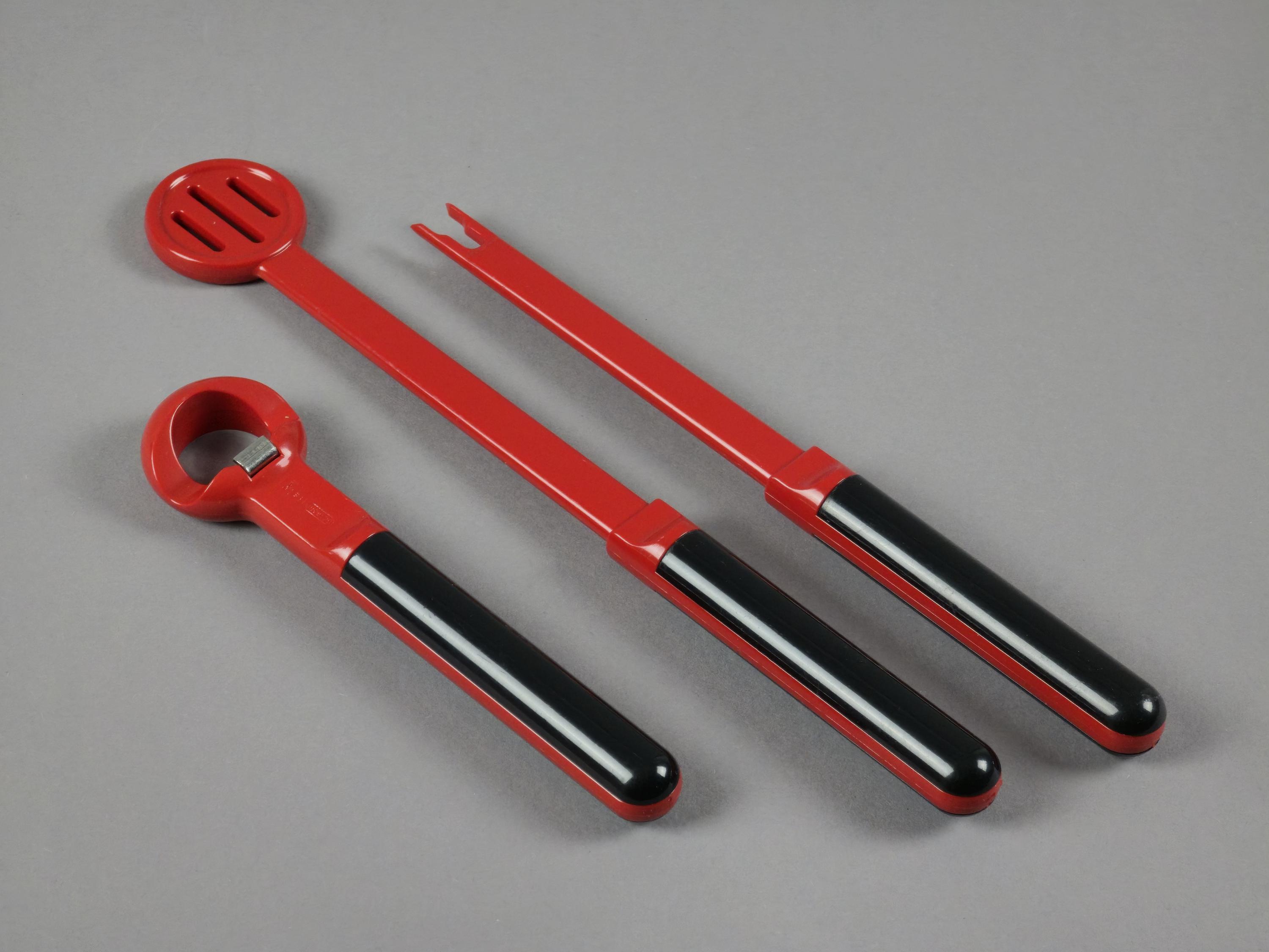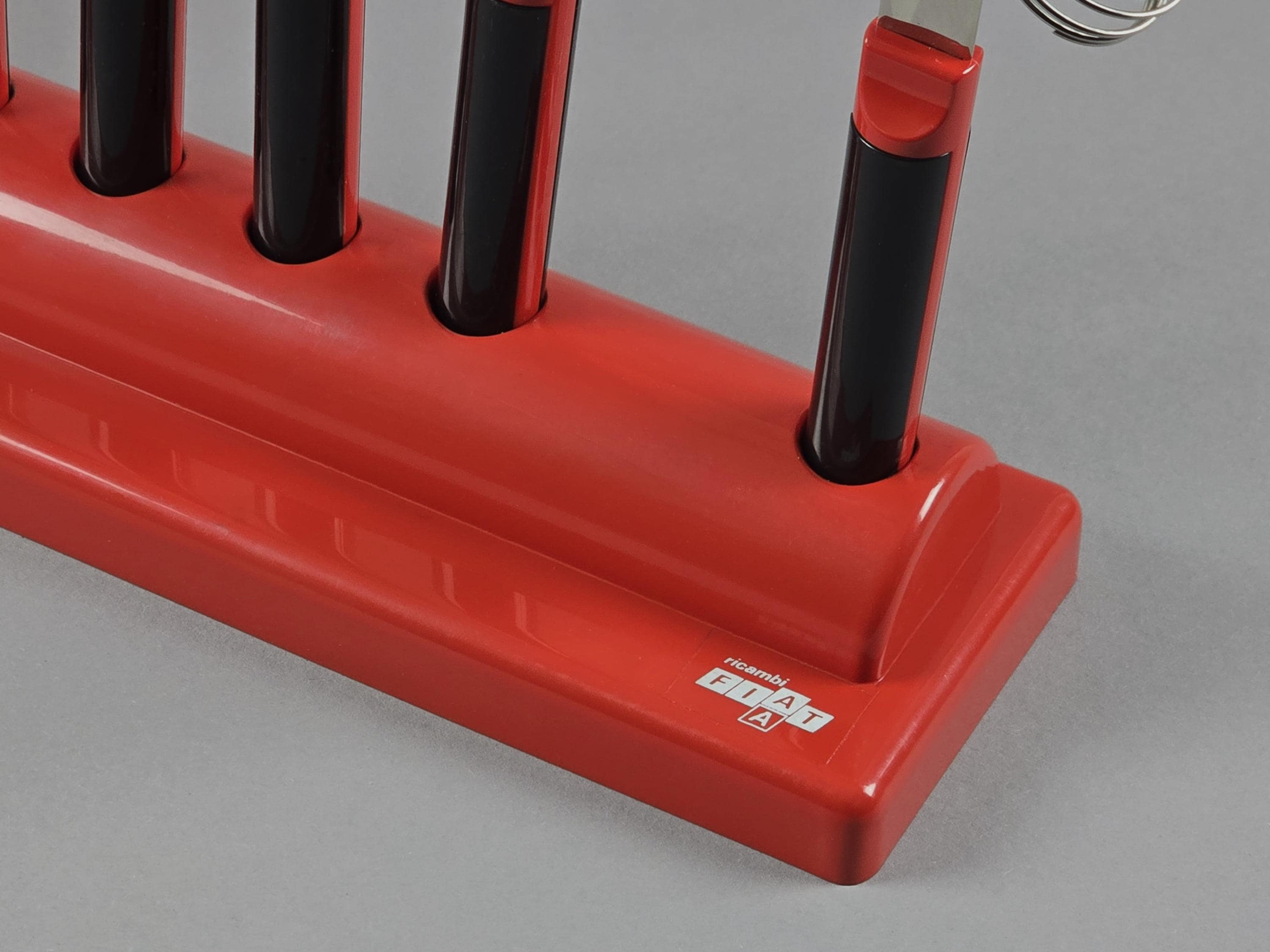New old stock vintage 1980s red and black plastic cocktail bar set, tools and utensils set by Scaroni Italy. The set includes eight essential bar tools: a bottle stopper, corkscrew, ice tongs, olive fork, stirring spoon, bar knife, bottle opener, and cocktail strainer. Perfectly organized on a matching stand, this is both a practical and decorative addition to any bar cart or kitchen.