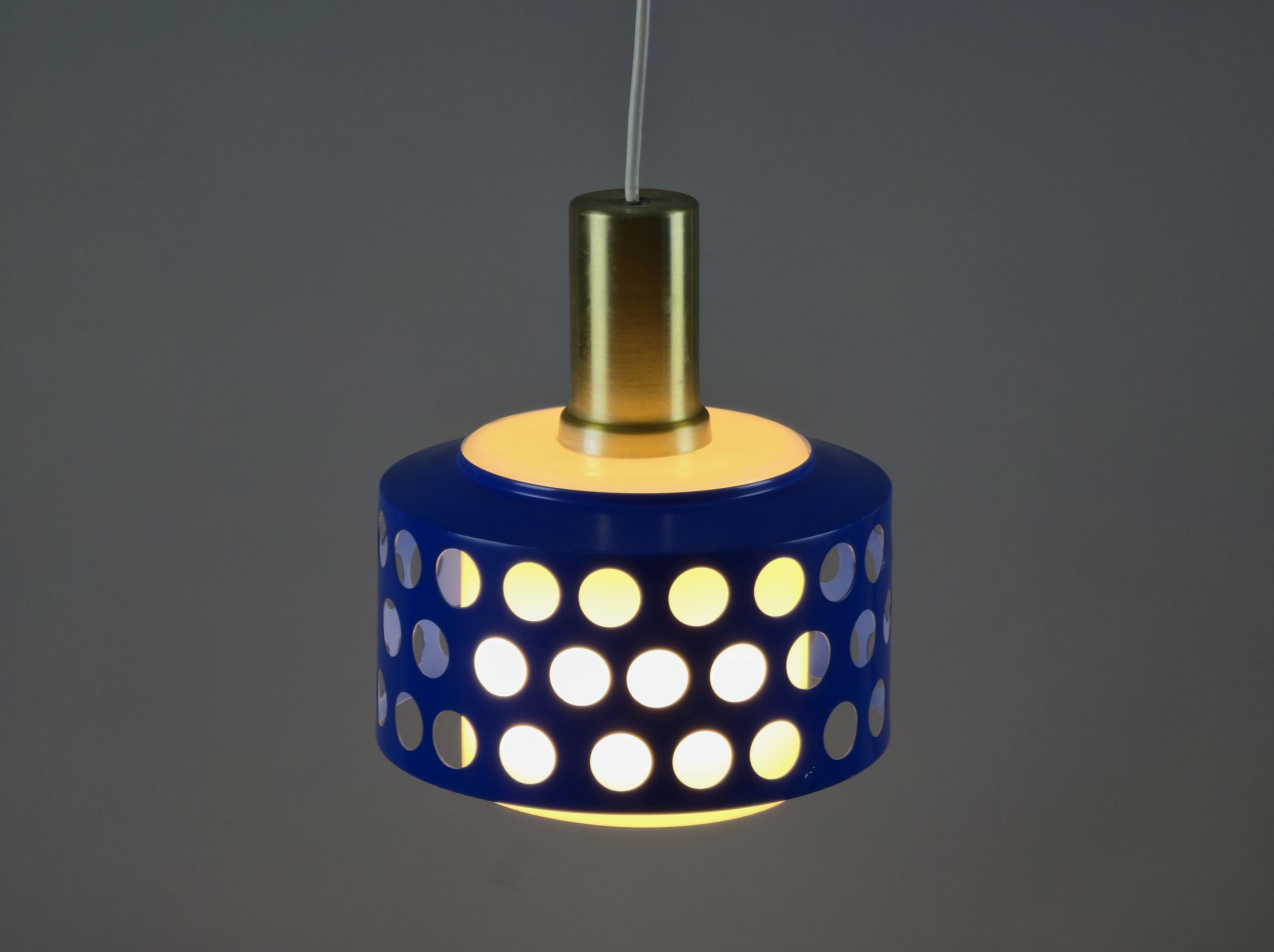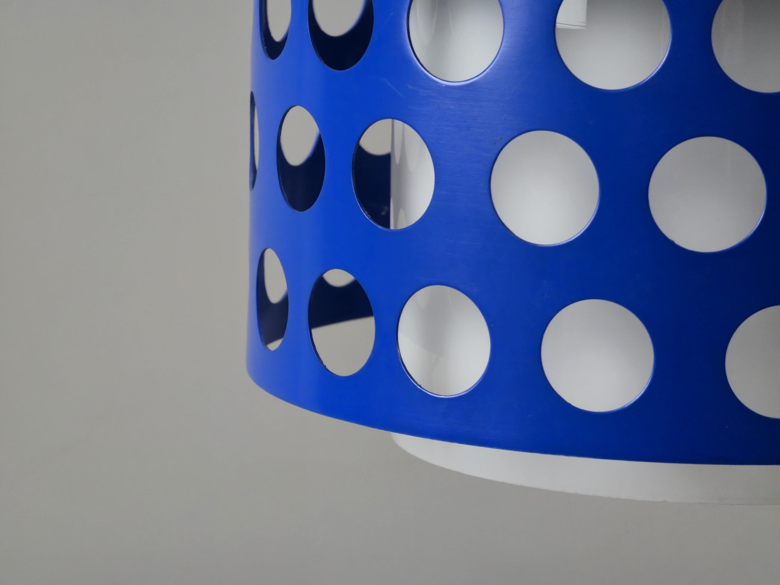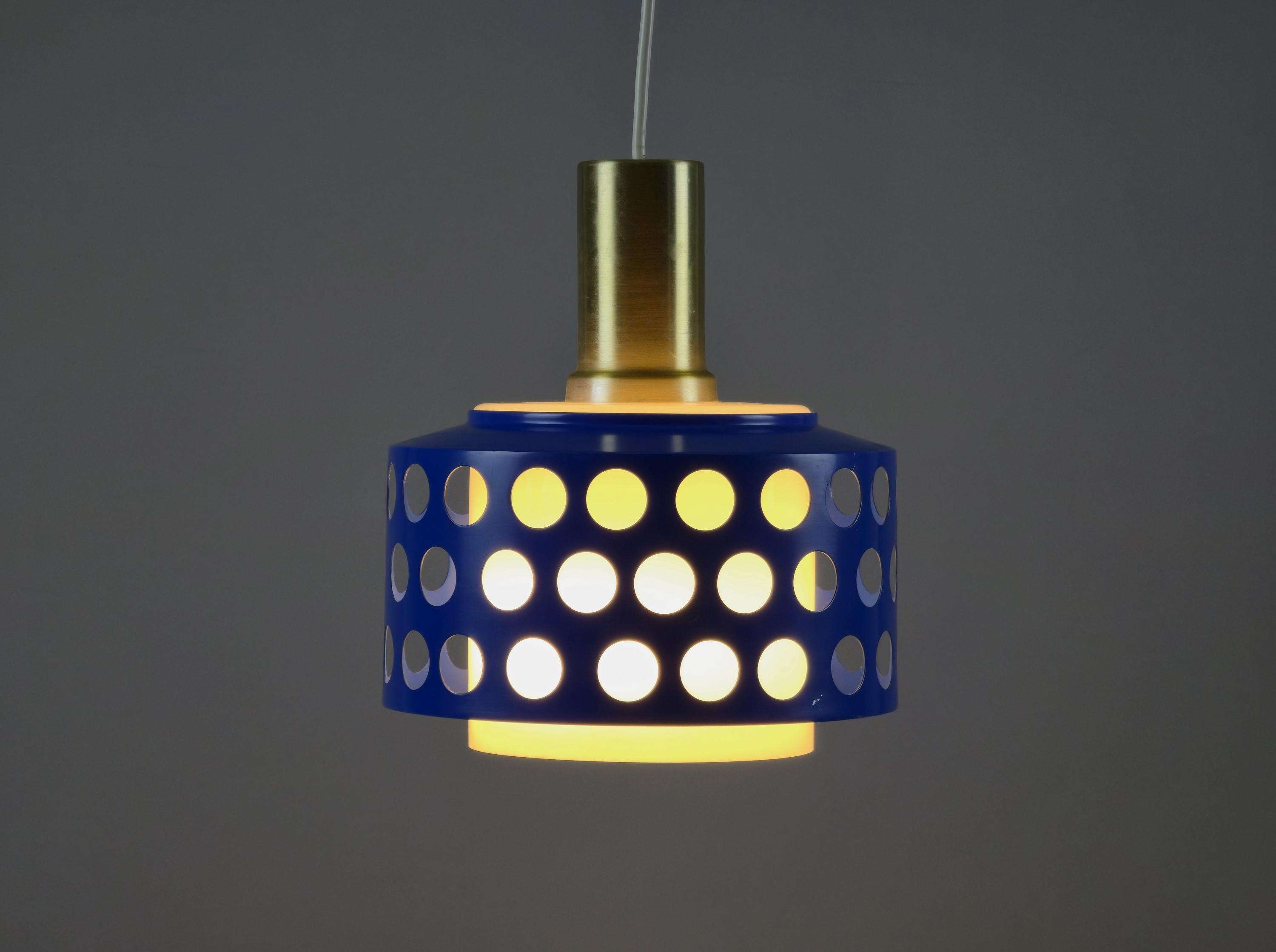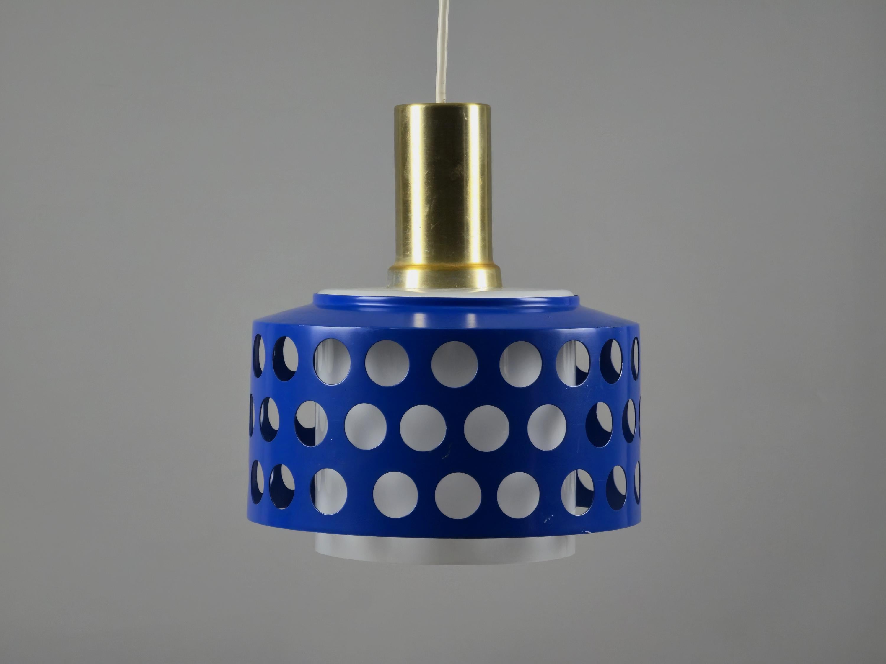 A true icon from Finland, vintage pendant lamp by Kai Finnmark (Kai Ruokonen) for Lynx, Finland. This iconic piece features a deep blue enameled metal shade with a geometric cut-out pattern, creating a dramatic interplay of light and shadow when illuminated.